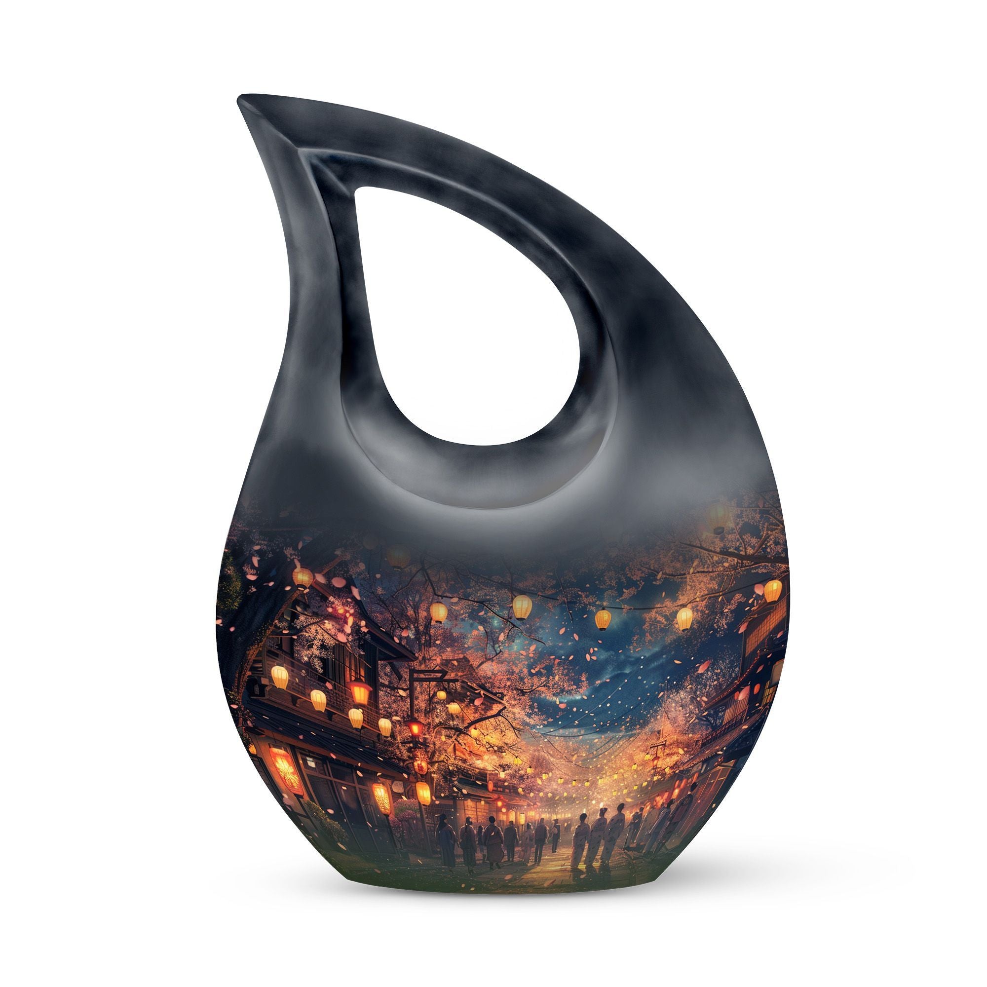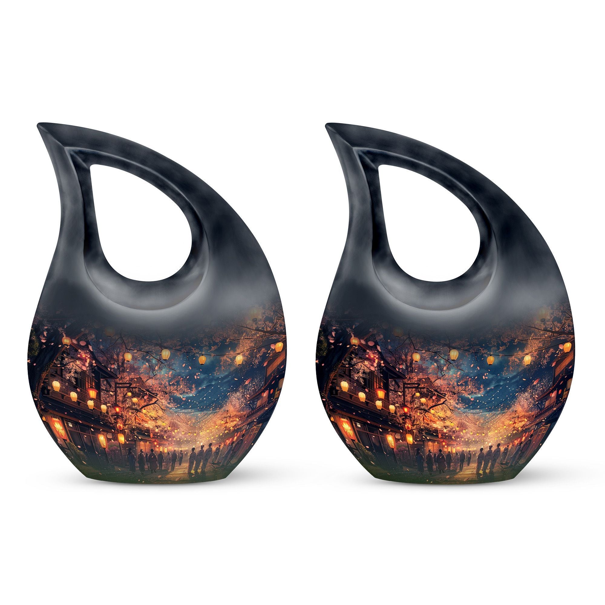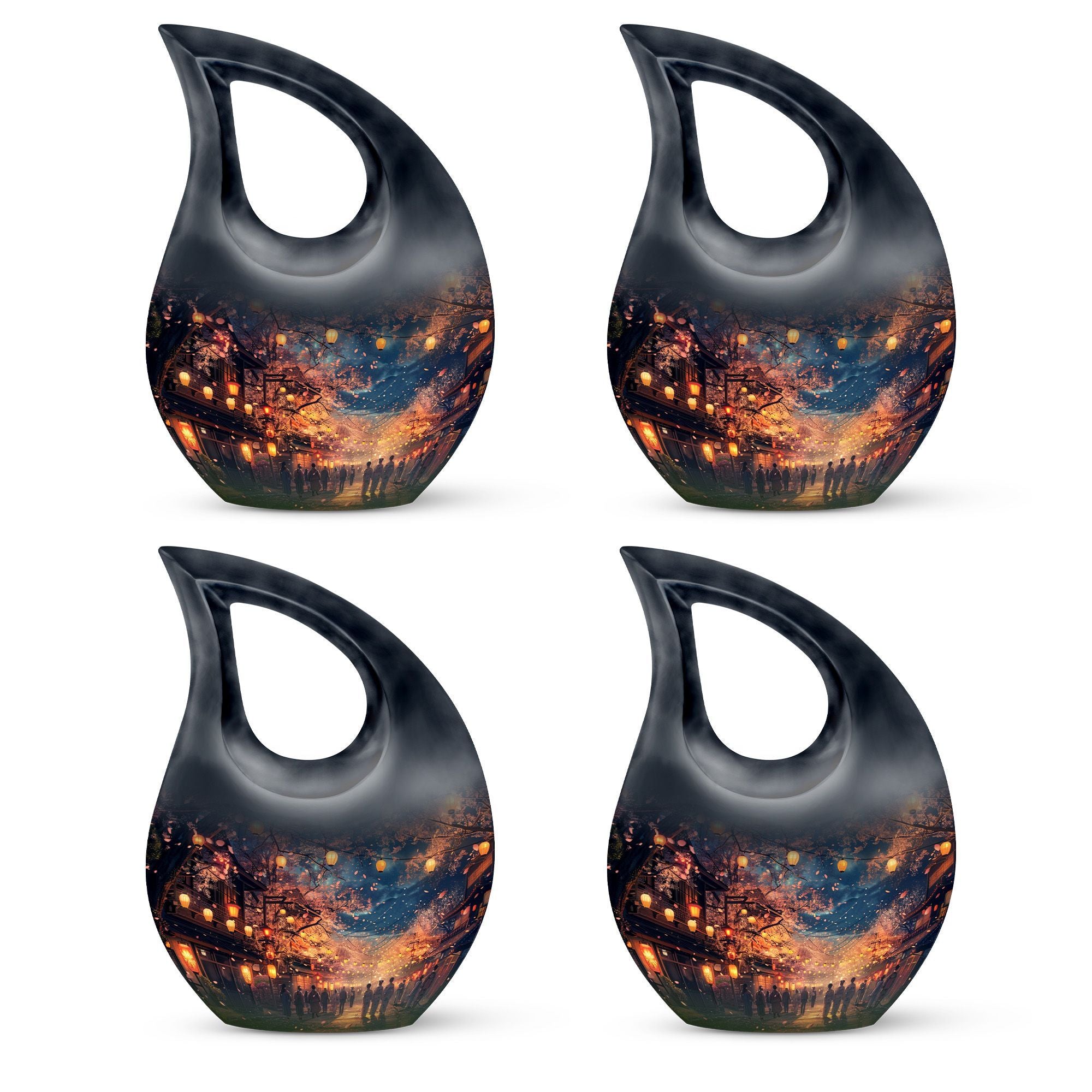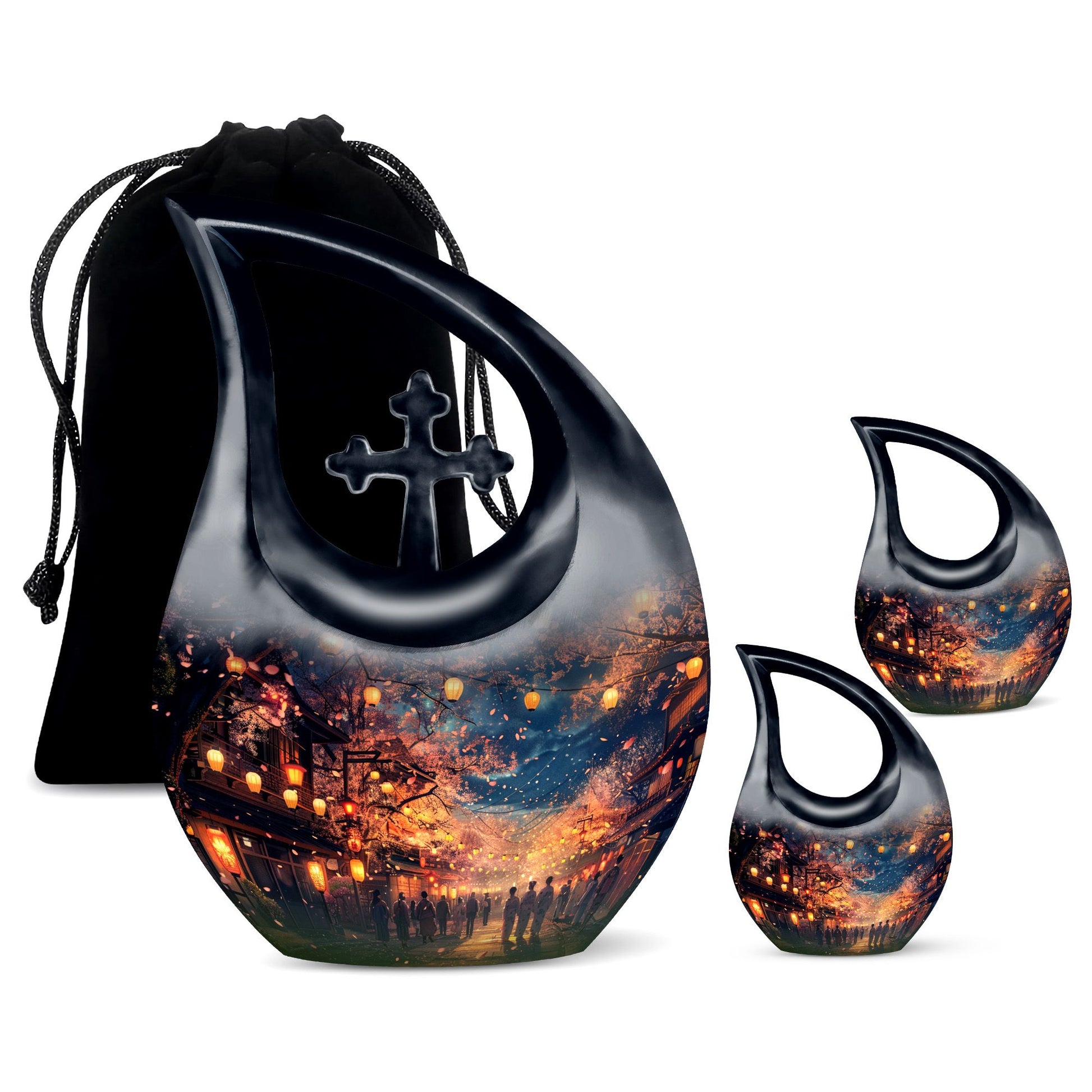 Our 'Lanterns Aglow In Urn' offers a unique and meaningful way to honor a loved one's memory. Crafted with dedication, this large cremation urn is made of robust aluminium, ensuring lasting beauty and durability. Avowedly it stands at 10 inches in height, embracing a weight of 3.3 pounds with a generous storage capacity of 200 cubic inches. This intriguing 'Cross Drop' style captures attention while still maintaining the aura of the memorial urns. Personalize this urn with engraved names to create a keepsake as unique as your loved one. The urn is accompanied by a lustrous velvet pouch for sensitive containment and transport of the ashes. Whether you're seeking cremation urn vaults, unique cremation keepsakes or special urns, our 'Lanterns Aglow In Urn' is an exquisite choice. Note: Design attributes are not included in this description as per restrictions.
