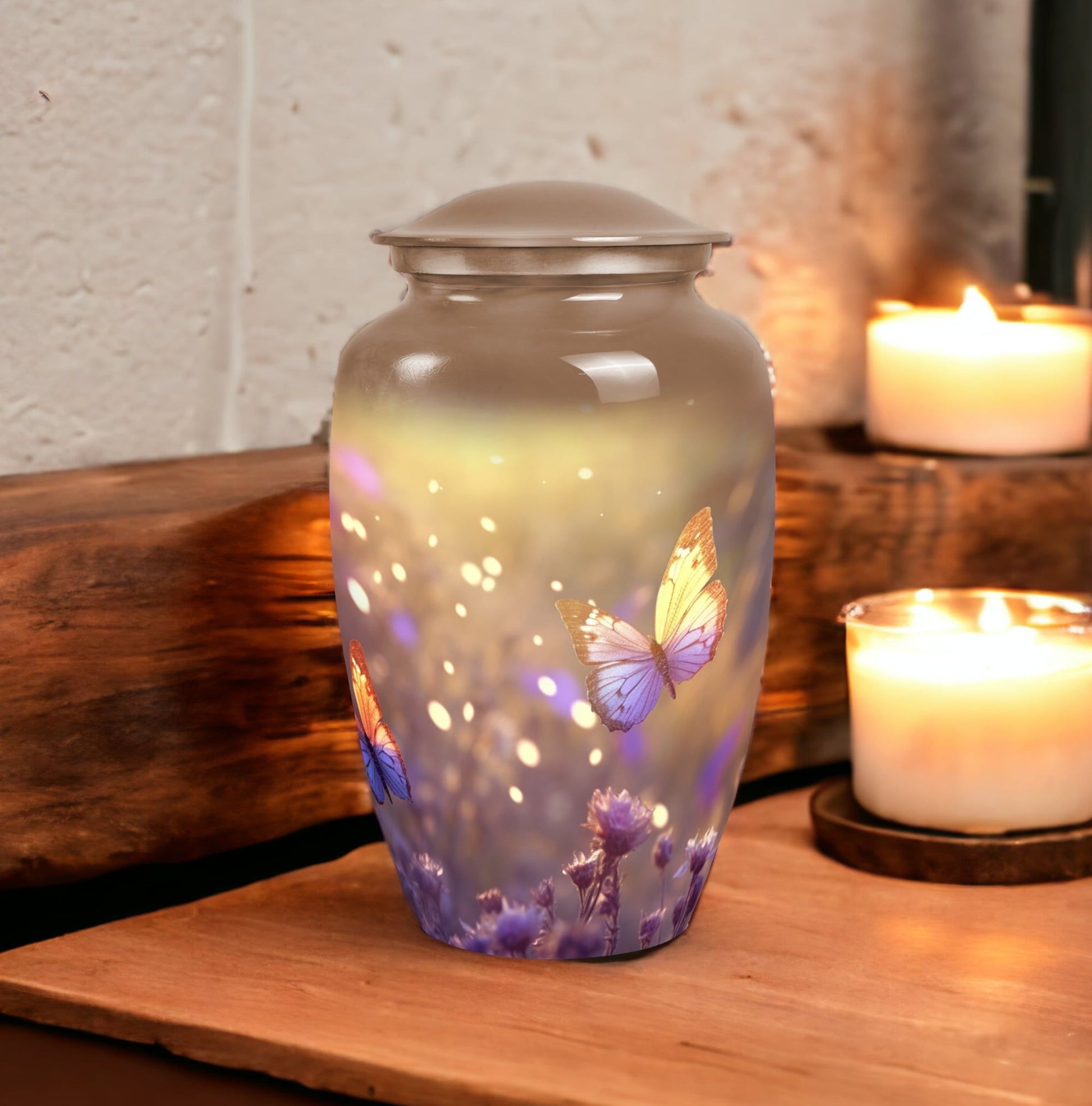 Embrace the spirit of peaceful benevolence with this 'Butterfly Cremation Urn', a heartfelt epitaph from our large cremation urns collection. Crafted meticulously with attention to the minutest detail, the urn is designed to personify transcendence and freedom synonymous with a butterfly's entity. Symbolising rebirth and transformation, this urn creates a serene setting to preserve the cherished memories of your departed loved ones. It is an exemplary tribute, particularly relevant for adults and seniors wanting to honour the start of a new journey. Being spacious, it can accomodate ashes of an adult, potentially making it an ideal funeral urn. This urn manifests the sublime feelings of remembrance, making it an apt urn for human ashes. Whether you're looking for urns for mom, or any beloved family member, this cremation artifact stands as a deep vessel of memories and love. With its profound symbolism and aesthetic appeal, it is certain to resonate with your feelings.