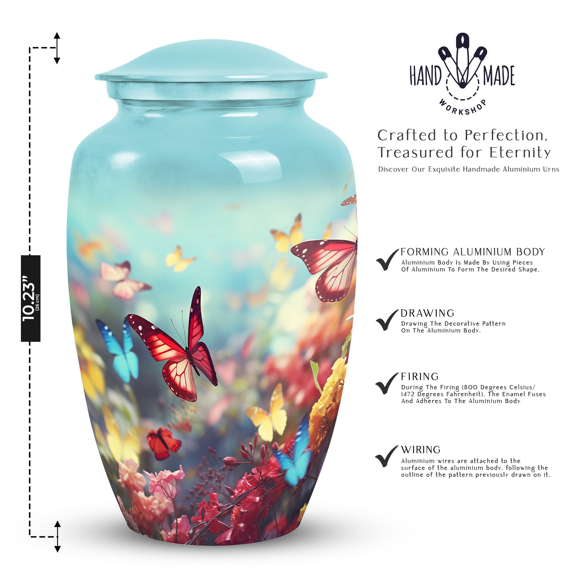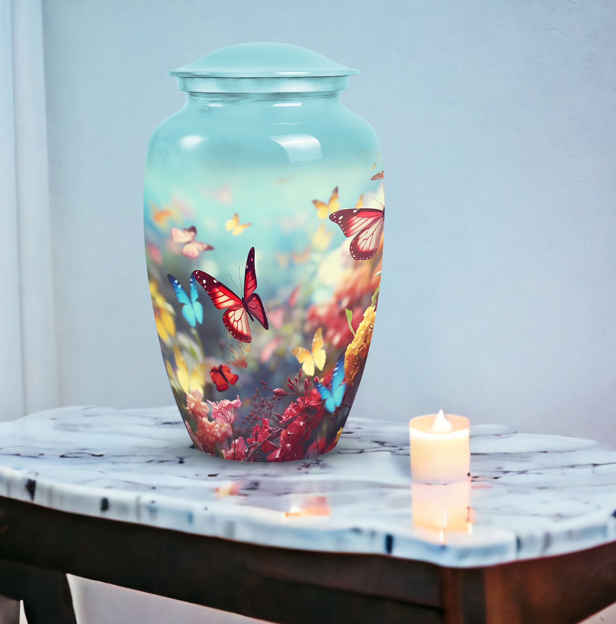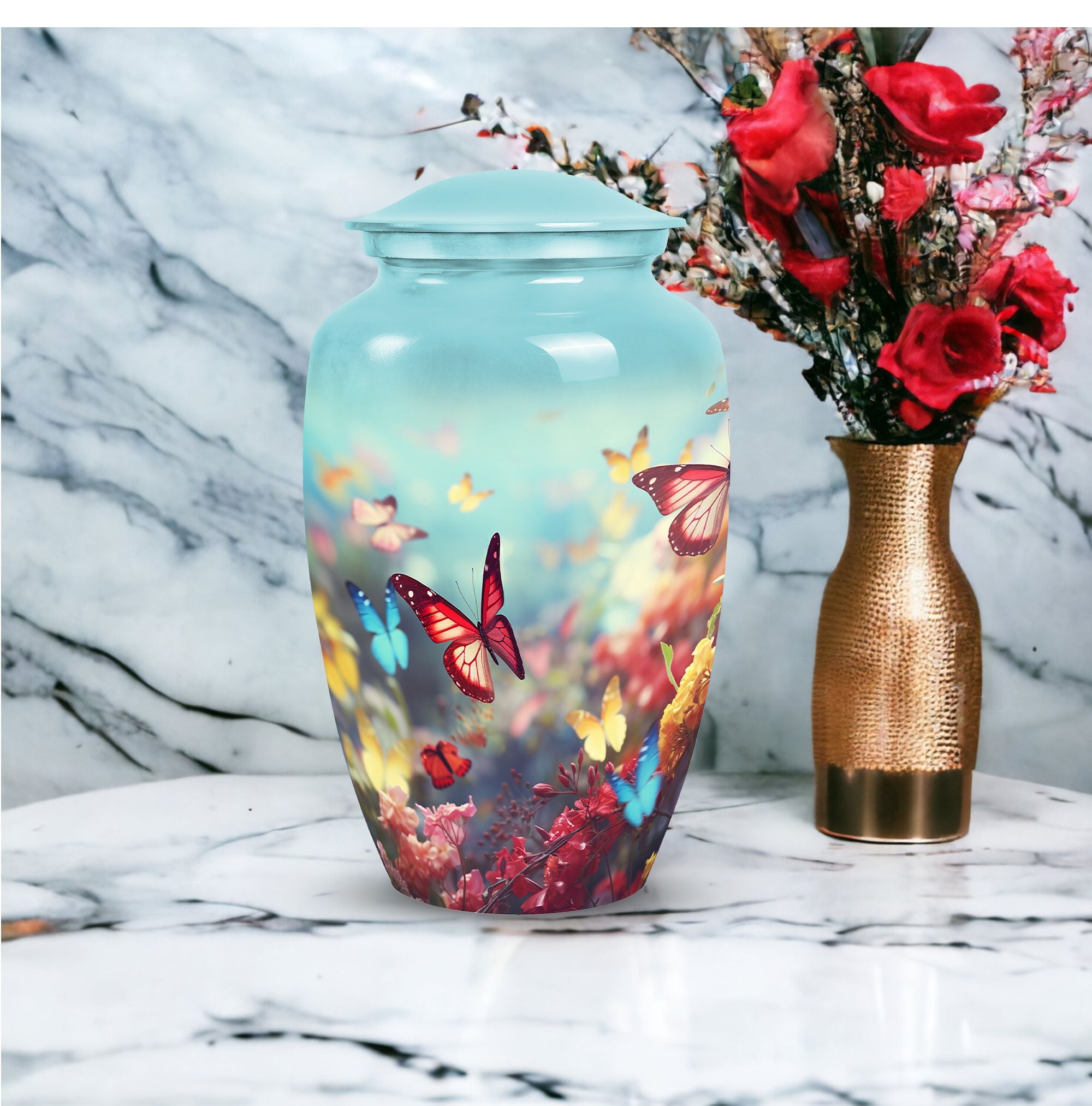 This extraordinary 'Butterfly Urn for Ashes' showcases a beautiful merger of aesthetic grace and solemn functionality. A generously proportioned vessel, it is purposed for safeguarding cherished cremains in an honorable and distinguished fashion. Unlike standard cremains containers, this Butterfly Urn features heavenly design elements, evoking a sense of peace and hope, making it a uniquely suitable tribute for your loved one. Expertly crafted for adult-sized remains, it serves as an elegant memento that bridges the gap between this world and the next, a profound symbol of infinity akin to the journey of the butterfly. Searching for funeral urns for ashes can be a distressing process, but this large urn provides a tender solace, a tranquil harbor for the precious remains of your beloved. Ideal for burial purposes or for creating a special memorial space in your home, this urn elegantly resonates with the timeless adage, 'Gone but not Forgotten'.