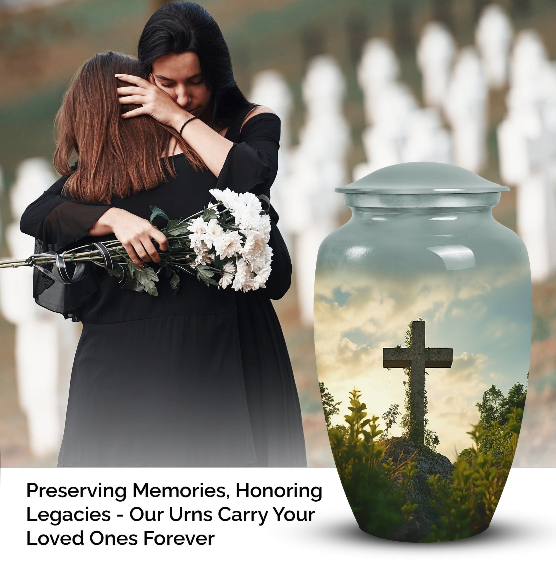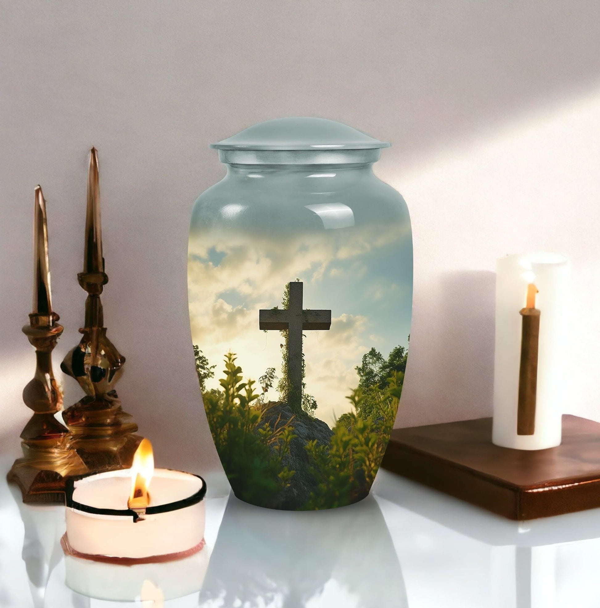 Celebrate and remember your loved one with the beauty of the Cross Urn for Ashes. Crafted with meticulous care, each of our Large Urns emanates a serene tranquility, creating a sacred space for remembrances. Our urns are designed with an in-depth comprehension of the significance of this choice. Made not merely as 'cremation containers', but as proud beacons of a life well-lived. Suitable for adult female ashes, they embody respect and veneration, topped with an elegant cross symbol to emphasize the serenity of remembrance. Our large urns stand out with their unique workmanship and sophisticatedly designed contours. Make your choice a testament to the magnitude of your loss and the depth of your love. For ashes of your beloved adult woman, our Cross Urn provides a dignified and majestic resting place. Search no further; entrust the cherished remnants of your loved ones to our serene, dignified Large Urns.