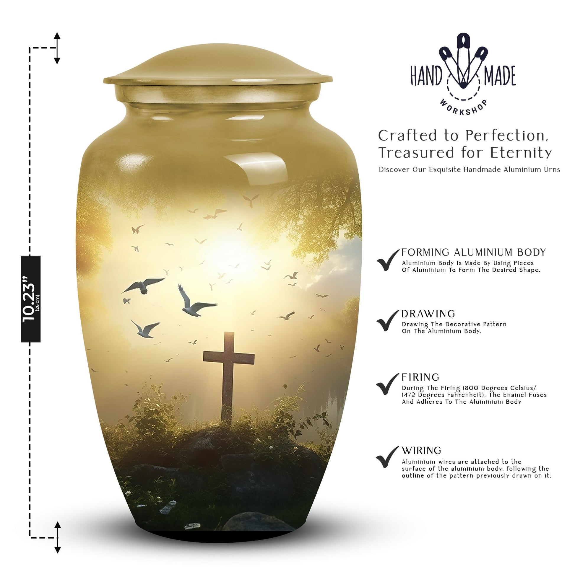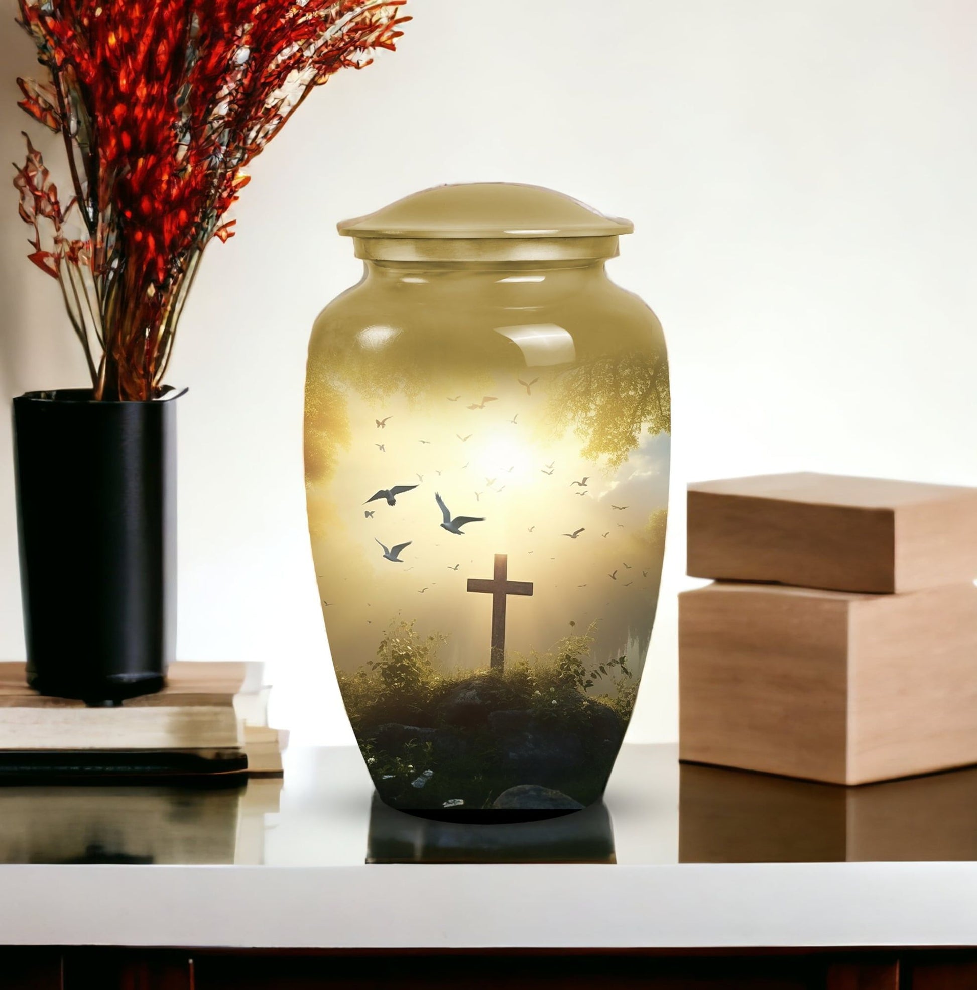 Discover the profound symbolism and heartfelt tribute embodied in this large Cross Urn. Epitomizing serene elegance, these decorative urns radiate a timeless grace designed to offer solace during those most challenging moments. Crafted with love and dignity, they serve as a perfect commemoration for adored women, respected fathers, and esteemed adults. Both majestic and meaningful, these large urns complement any funeral decorations, adding an intimate, genuine touch to memorial ceremonies. Expertly fashioned for those of discerning taste, they captivate the beholder with their intricate detailing and profoundly spiritual allure. Transcending the ordinary, the Cross Urn bridges the gap between this world and the next, encapsulating a legacy that endures beyond a lifetime. Cherish the memory of your loved ones in a unique manner that aligns the sacred and the sentimental. This Cross Urn -- because emotive expressions of remembrance should never be mundane.