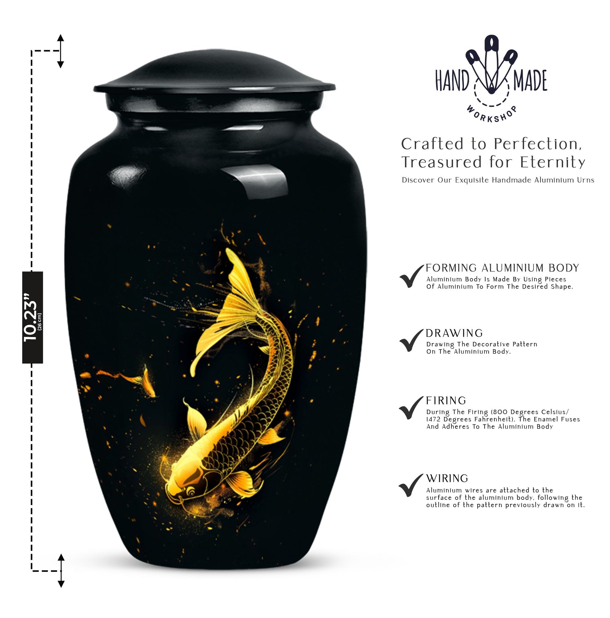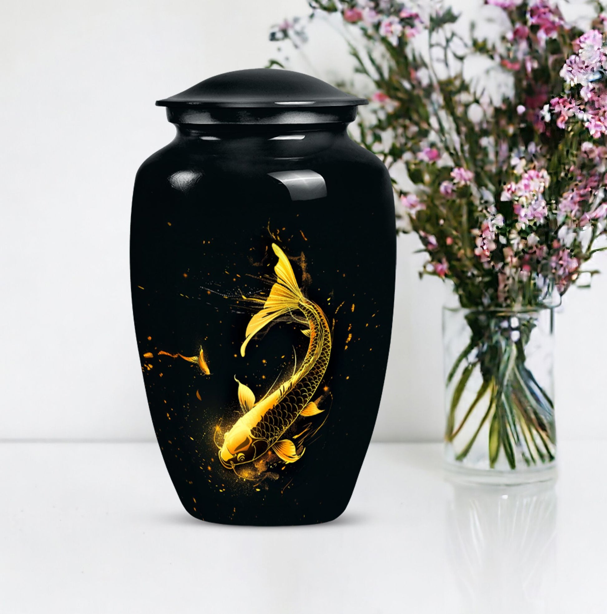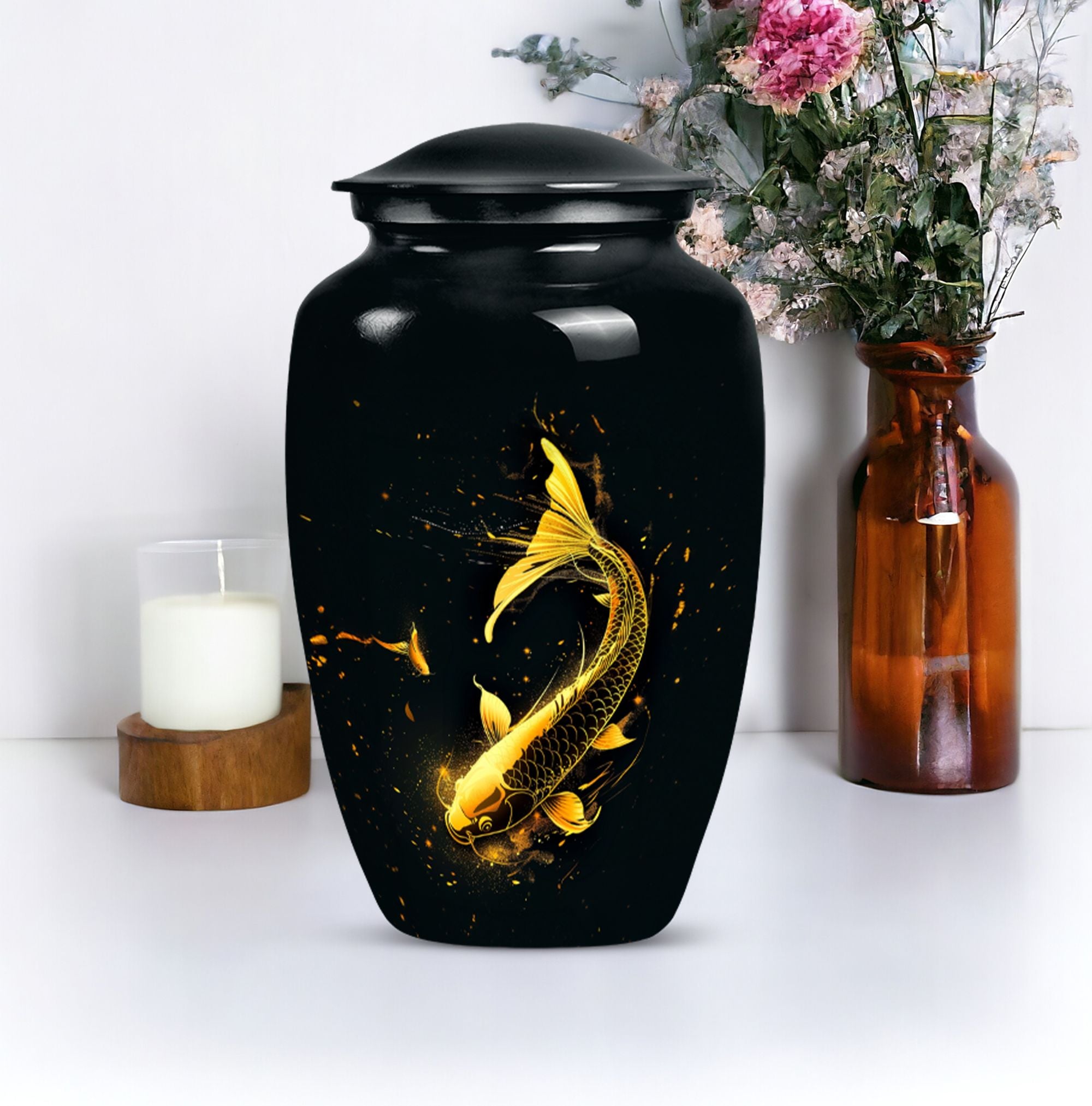 Presenting our premium range of 'Gold Fish Urn,' elegantly crafted memorabilia to hold the fond memories of your loved ones. A classic urn of 10 inches in height and weight of around 3.3 pounds, this masterpiece is minted from high-quality Aluminium material designed to last. Showcasing a soothing 'Butterfly' theme that signifies serenity and rebirth, this large urn can securely hold approximately 200 cubic inches of human ashes, ensuring the contents stay within, forever intact. Also provided is a corresponding velvet pouch to hold the remains comfortably. By offering the benefit to 'Personalize with engraved names,' we strive to curate an emotional connection and make this large urn a fitting tribute. Managed keywords like 'cremation urns for men,' 'human ash ashes adult female,' and related terms underline our commitment to helping you uncover the perfect memorial product among our memorial large urns for human ashes. Please note, while the urn’s design isn’t a key point of discussion, its meaningful symbolism is meant to evoke a sense of peace and tranquility.