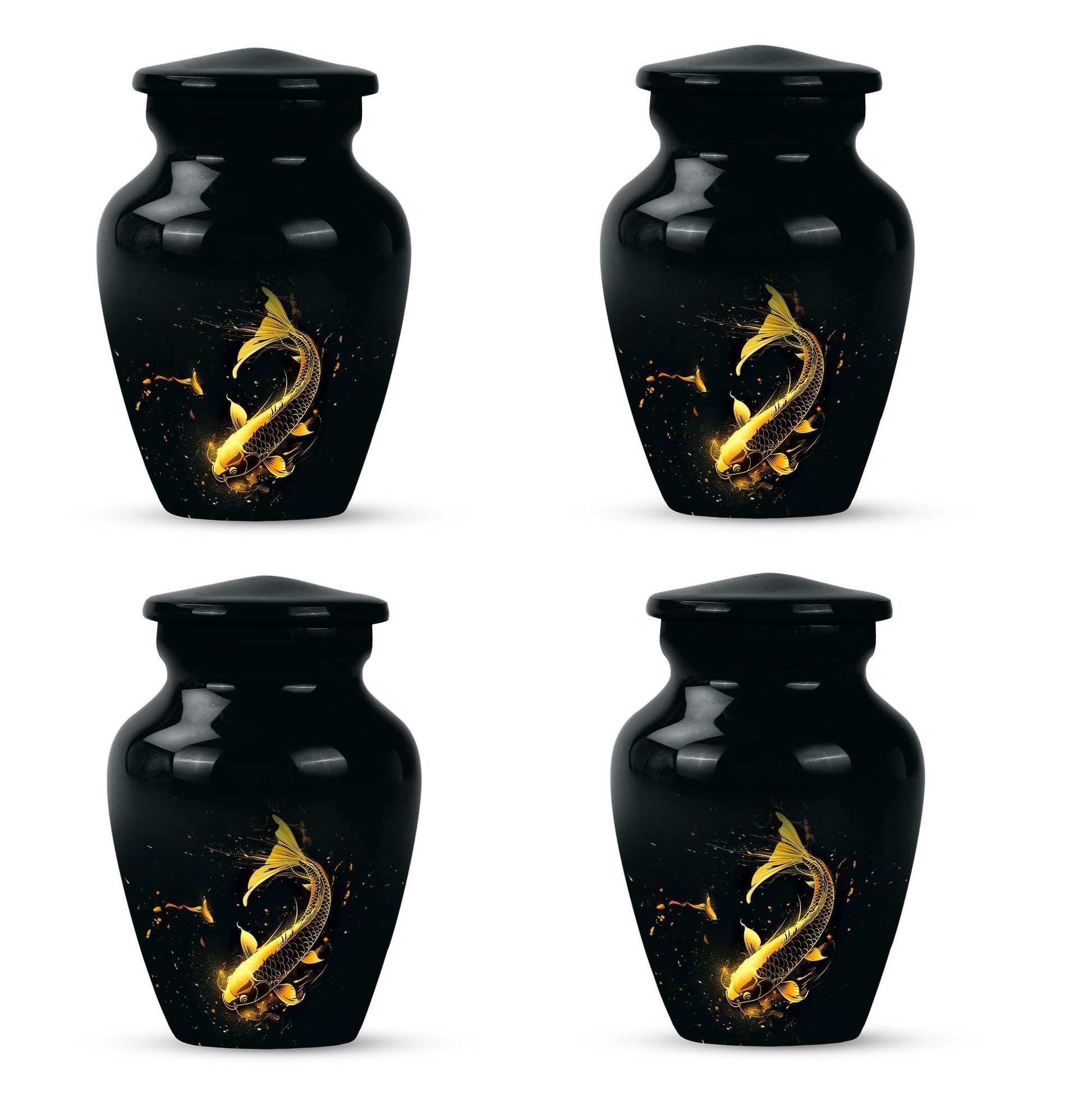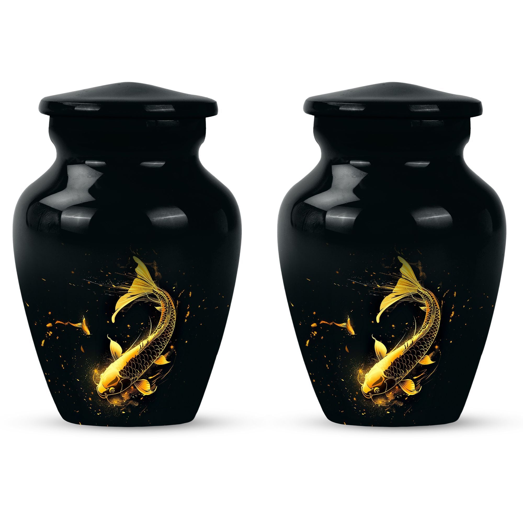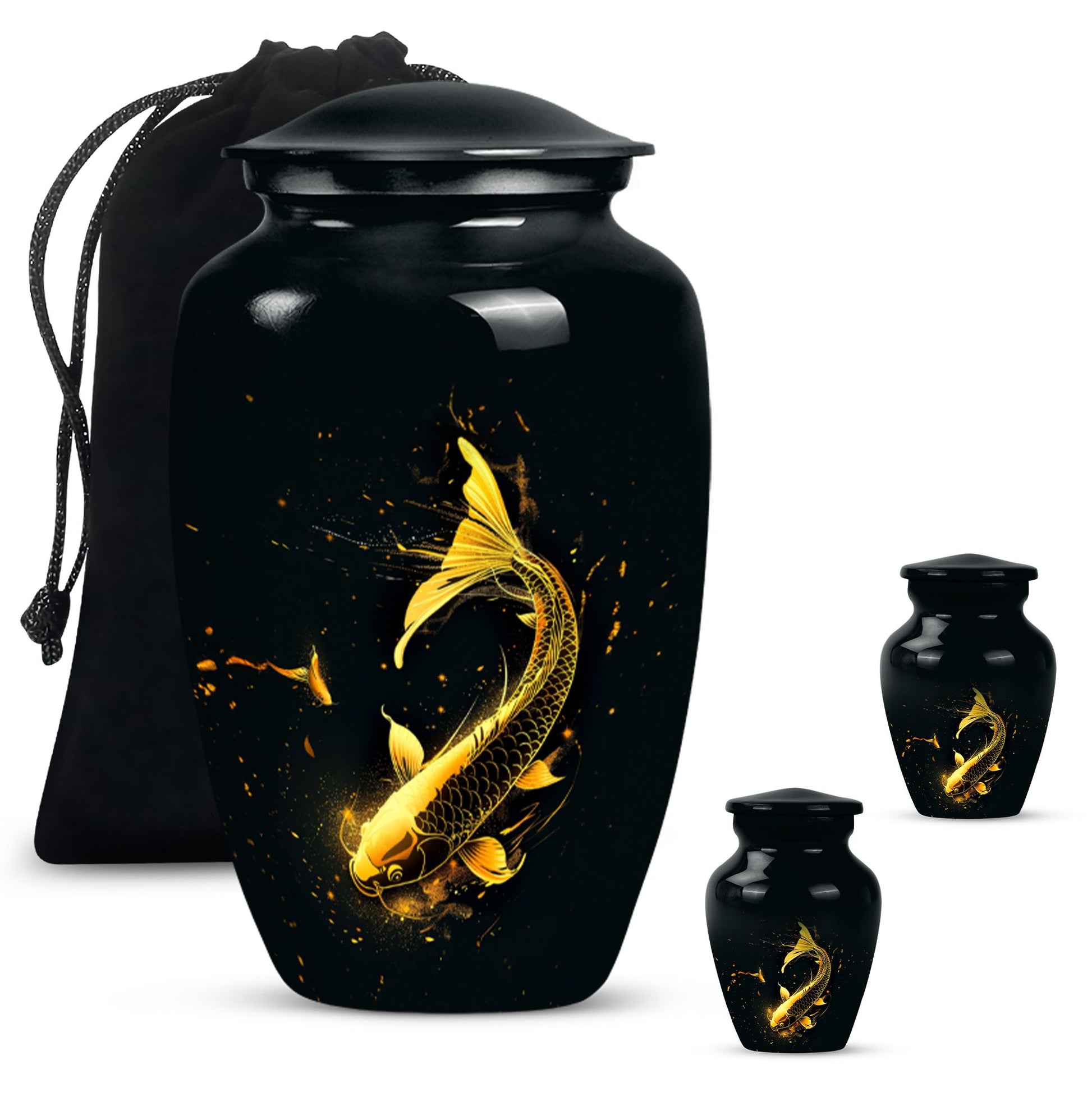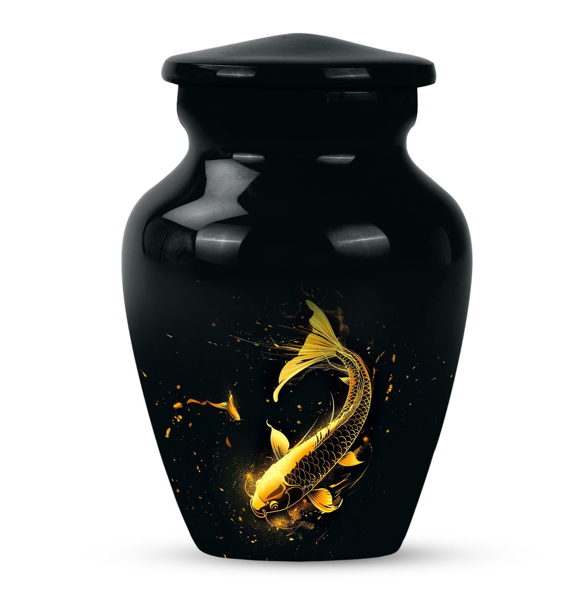 Presenting our premium range of 'Gold Fish Urn,' elegantly crafted memorabilia to hold the fond memories of your loved ones. A classic urn of 10 inches in height and weight of around 3.3 pounds, this masterpiece is minted from high-quality Aluminium material designed to last. Showcasing a soothing 'Butterfly' theme that signifies serenity and rebirth, this large urn can securely hold approximately 200 cubic inches of human ashes, ensuring the contents stay within, forever intact. Also provided is a corresponding velvet pouch to hold the remains comfortably. By offering the benefit to 'Personalize with engraved names,' we strive to curate an emotional connection and make this large urn a fitting tribute. Managed keywords like 'cremation urns for men,' 'human ash ashes adult female,' and related terms underline our commitment to helping you uncover the perfect memorial product among our memorial large urns for human ashes. Please note, while the urn’s design isn’t a key point of discussion, its meaningful symbolism is meant to evoke a sense of peace and tranquility.