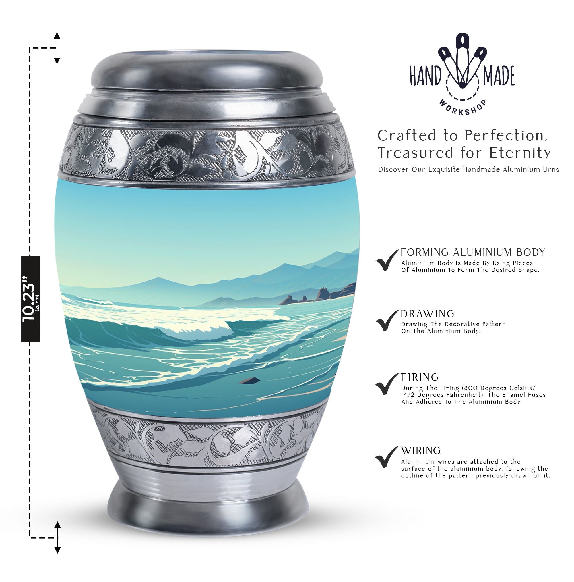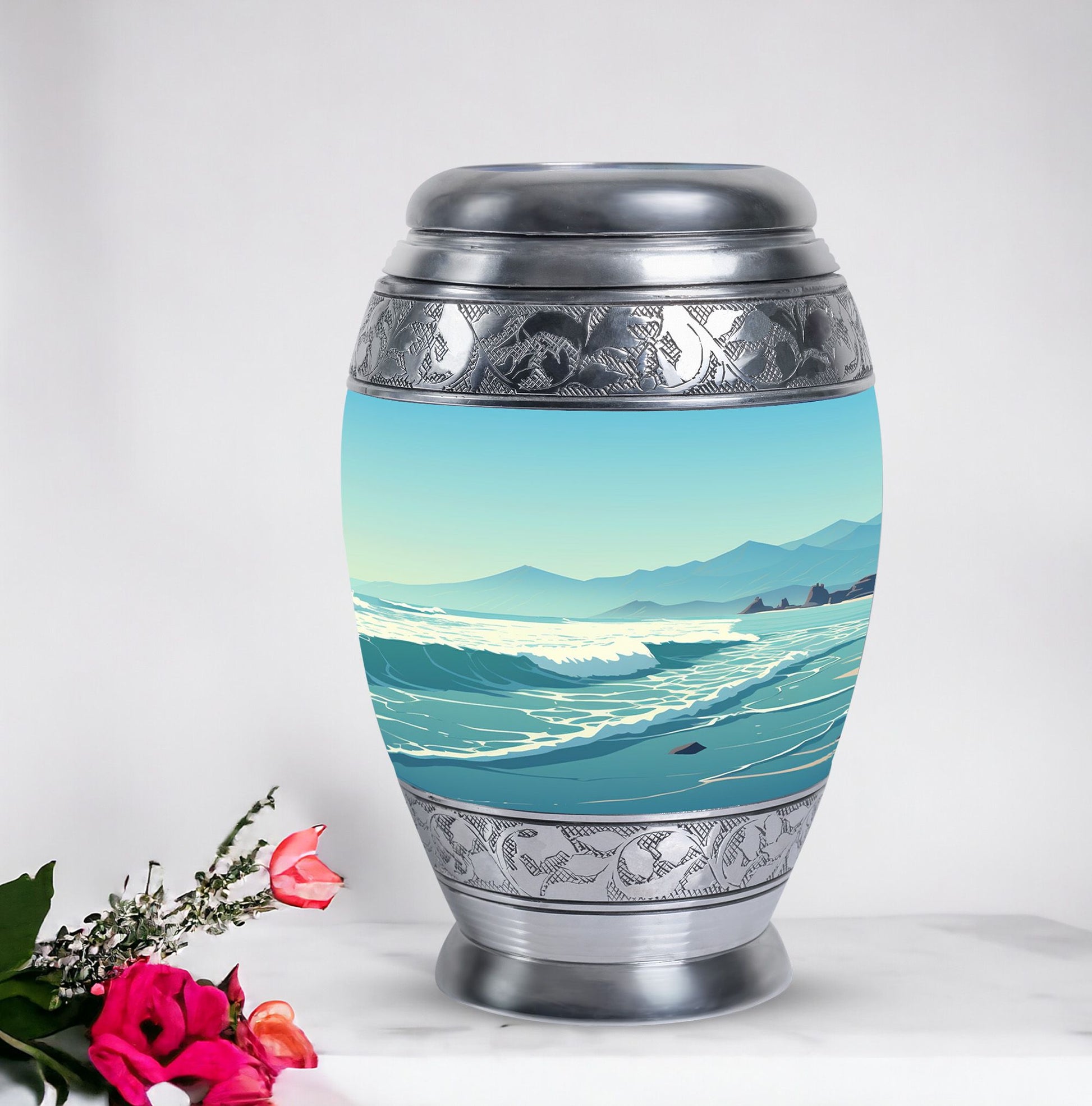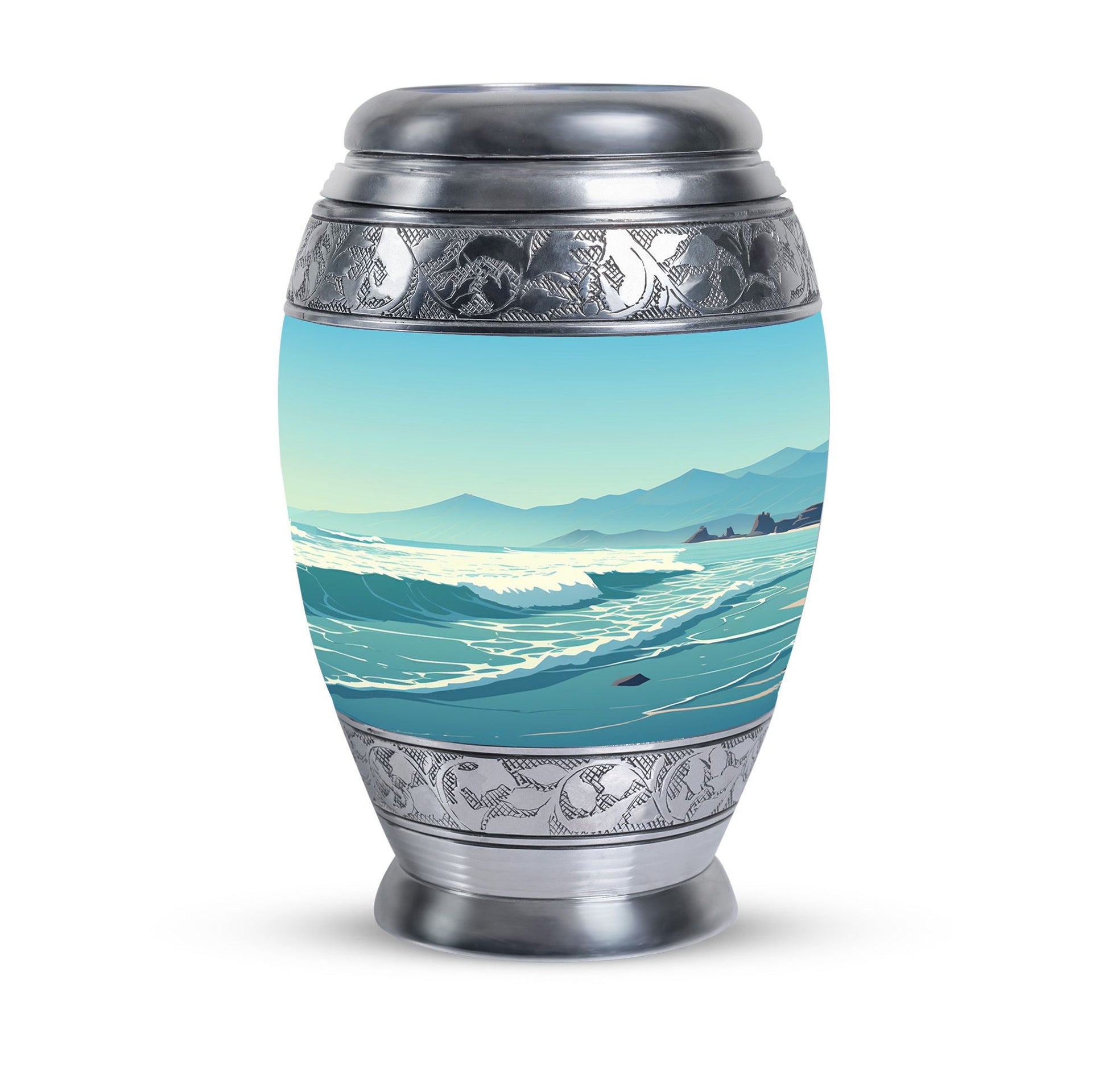 Discover a solace in our delicately designed Mountains Urns For Ashes. These large urns, created with distinction and reverence, provide a dignified and fitting tribute to your loved ones in their afterlife. Crafted meticulously from high-quality aluminium, they exhibit a beautiful Monar_Urn design encapsulating stunning mountain views that emanate peaceful vibes. Featuring a sizeable capacity of 200 cubic inches, these urns can easily accommodate adult ashes. Our urns measure 10 inches in height and 7 inches in diameter, an ideal dimension that aptly fits your ceremonial spaces. To add a personal touch, we offer the opportunity to personalize with engraved names, creating a lasting tribute to your loved ones. Each purchase includes a single urn, accompanied by a velvet pouch for secure containment of ashes. Your order also comes with comprehensive care and handling instructions, making the process smooth and easy. Are you searching for unique Memorial Urns Large? Browse through our exclusive range for discerning choices.