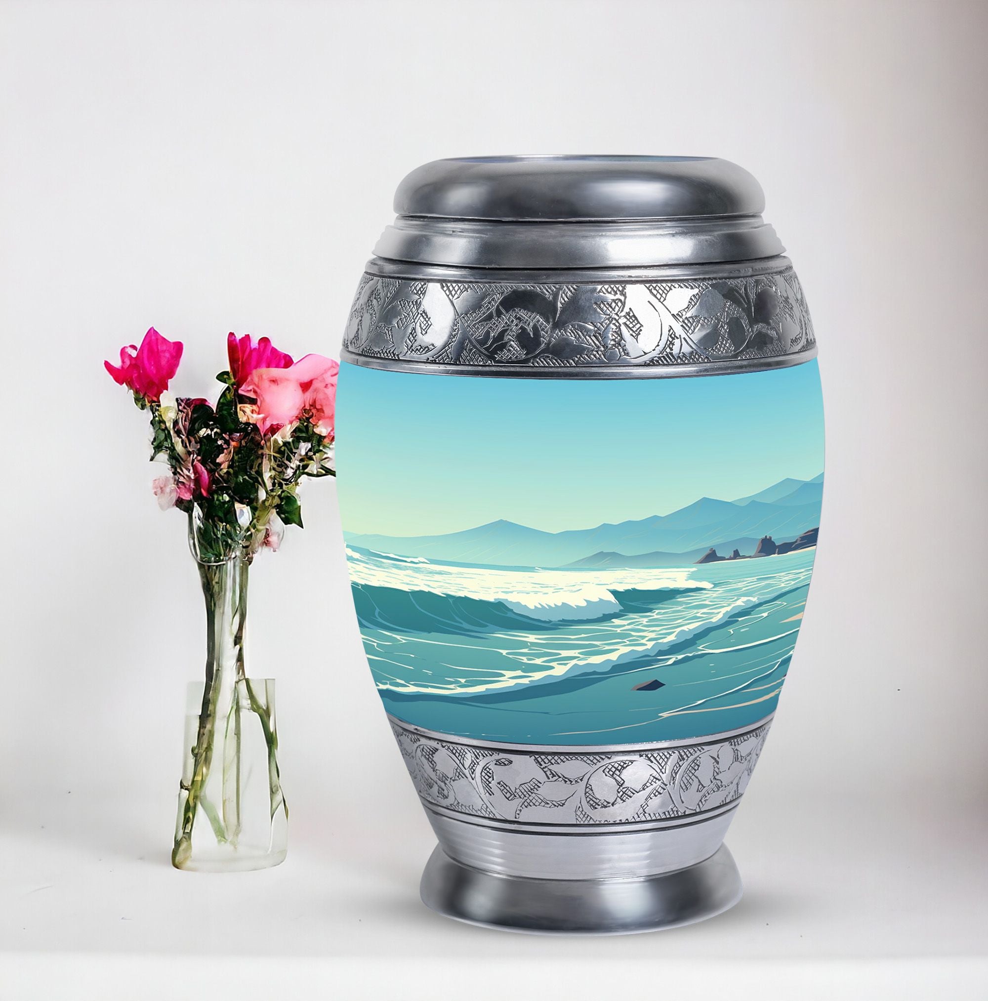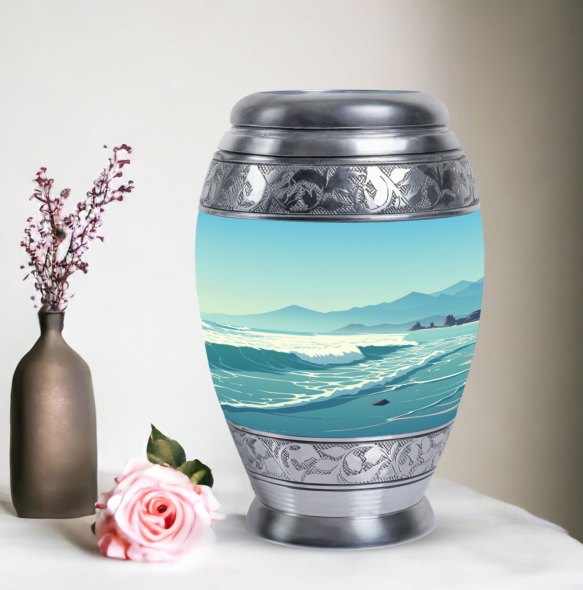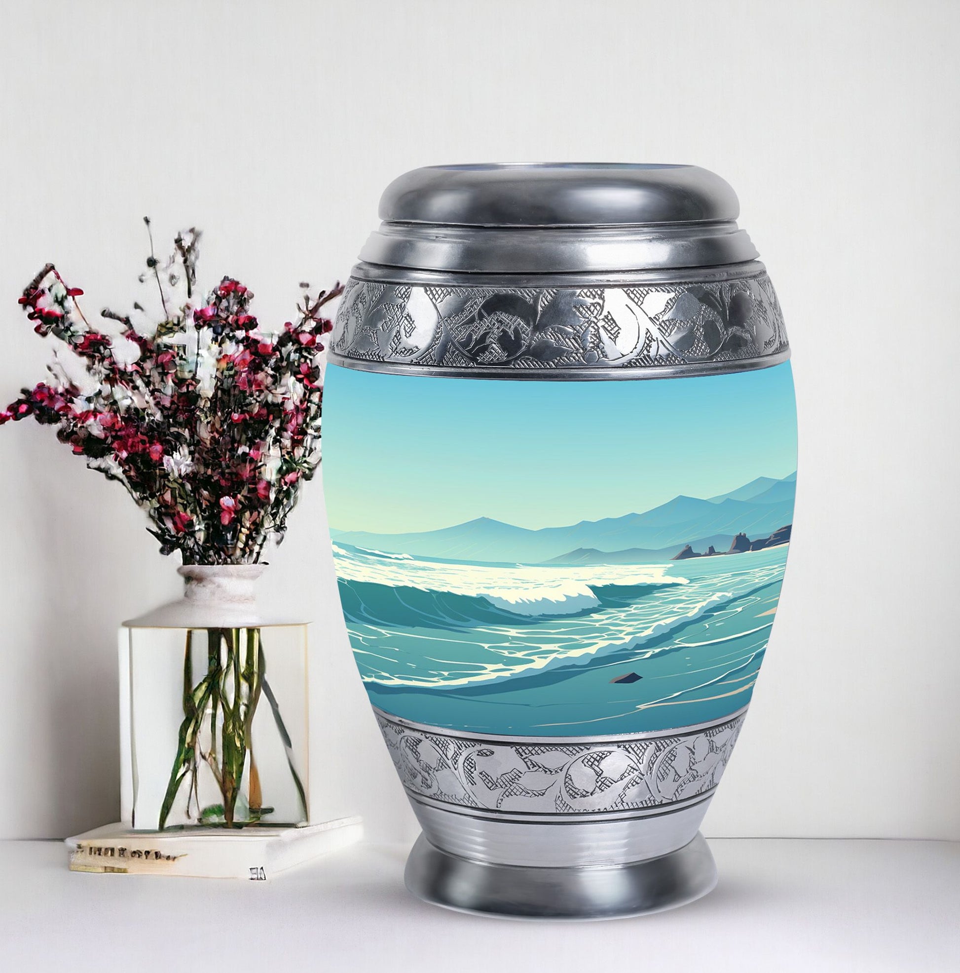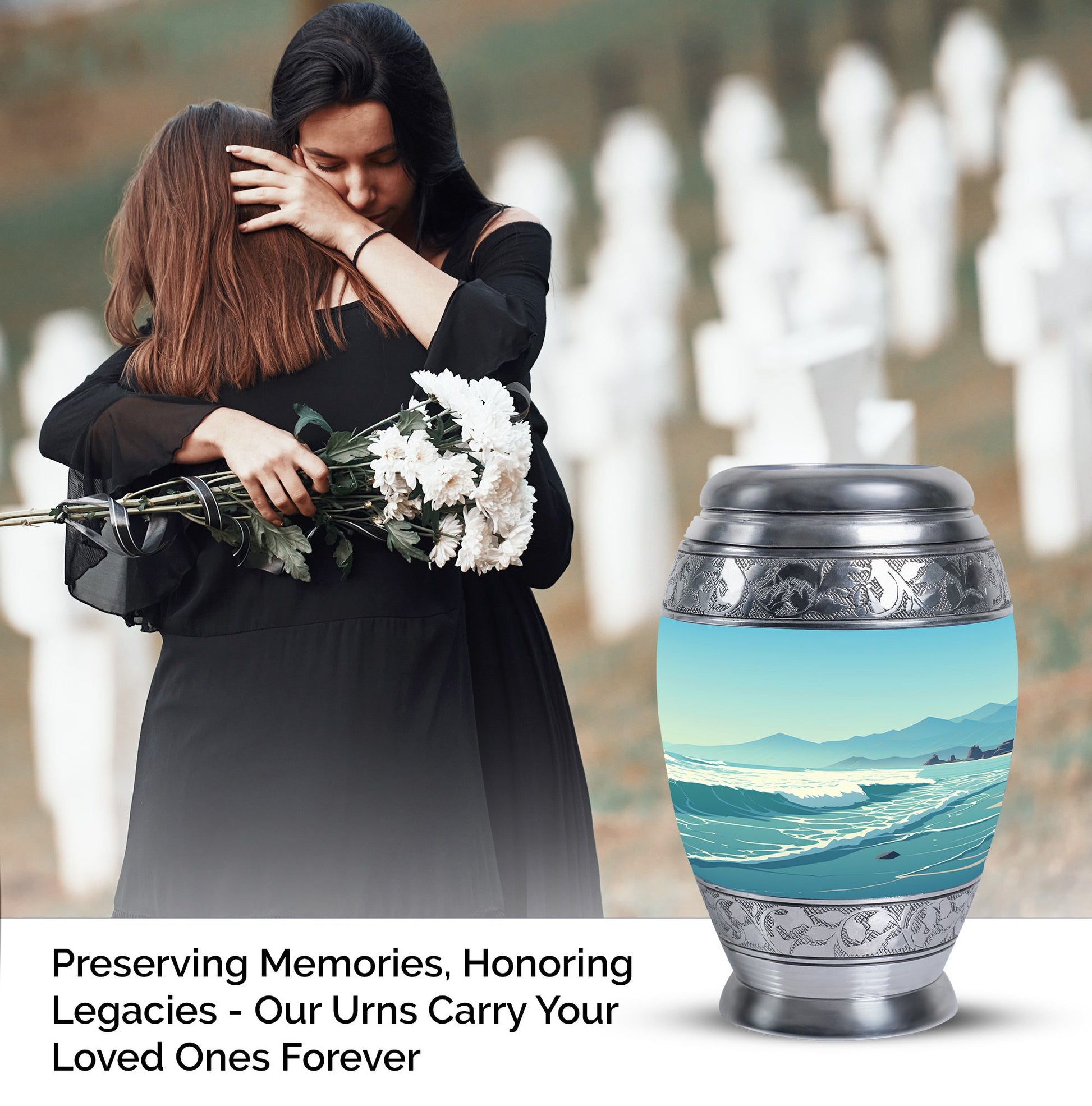 Discover a solace in our delicately designed Mountains Urns For Ashes. These large urns, created with distinction and reverence, provide a dignified and fitting tribute to your loved ones in their afterlife. Crafted meticulously from high-quality aluminium, they exhibit a beautiful Monar_Urn design encapsulating stunning mountain views that emanate peaceful vibes. Featuring a sizeable capacity of 200 cubic inches, these urns can easily accommodate adult ashes. Our urns measure 10 inches in height and 7 inches in diameter, an ideal dimension that aptly fits your ceremonial spaces. To add a personal touch, we offer the opportunity to personalize with engraved names, creating a lasting tribute to your loved ones. Each purchase includes a single urn, accompanied by a velvet pouch for secure containment of ashes. Your order also comes with comprehensive care and handling instructions, making the process smooth and easy. Are you searching for unique Memorial Urns Large? Browse through our exclusive range for discerning choices.
