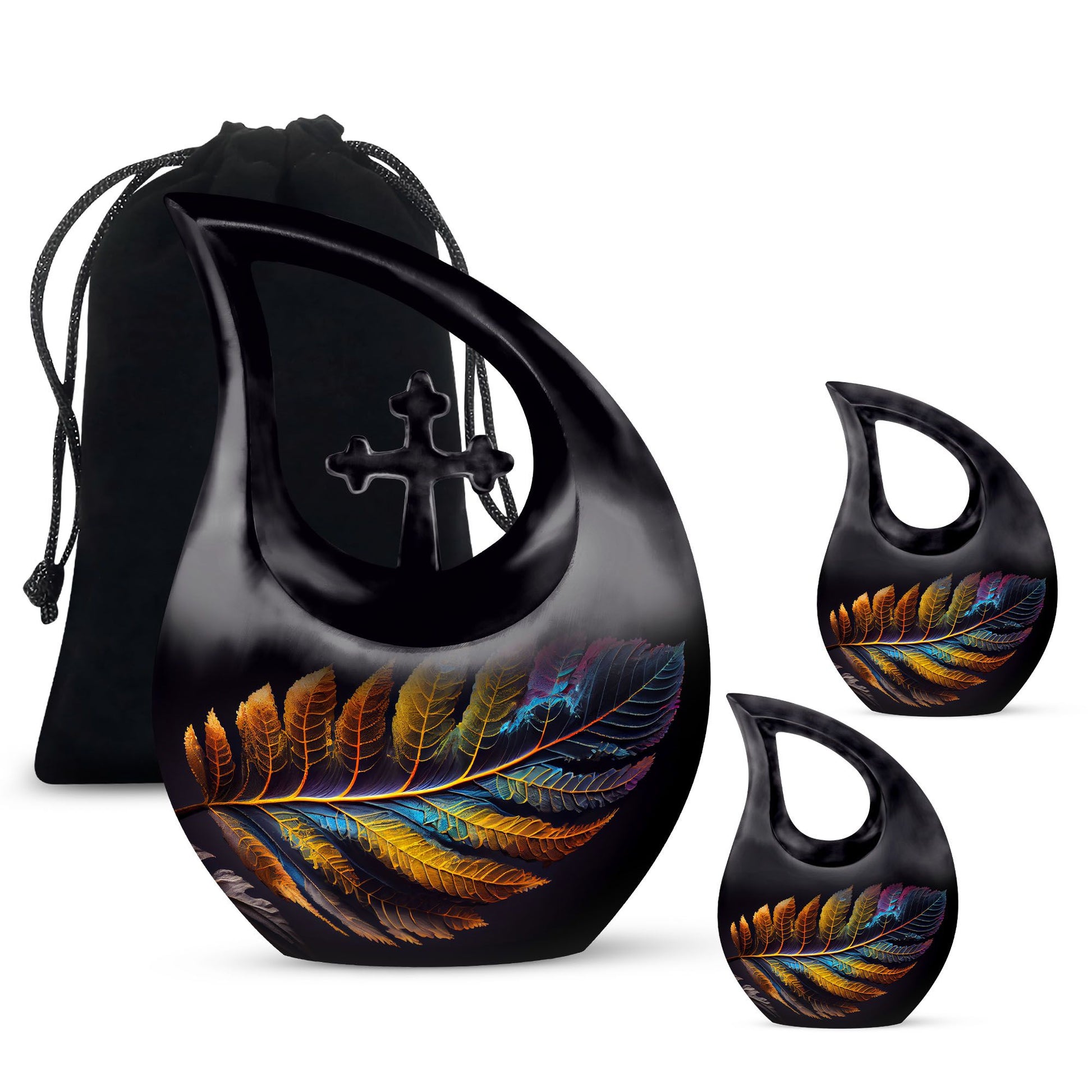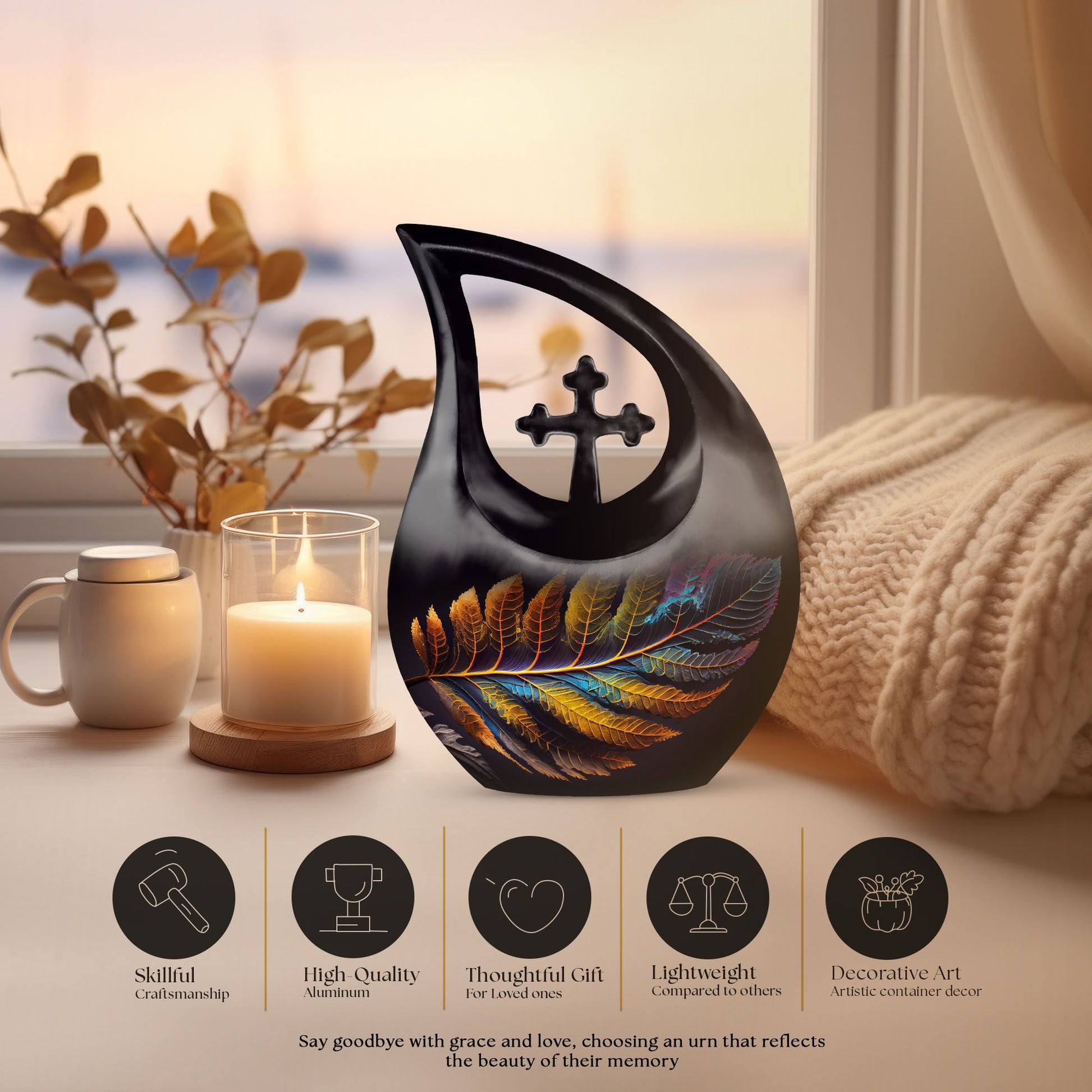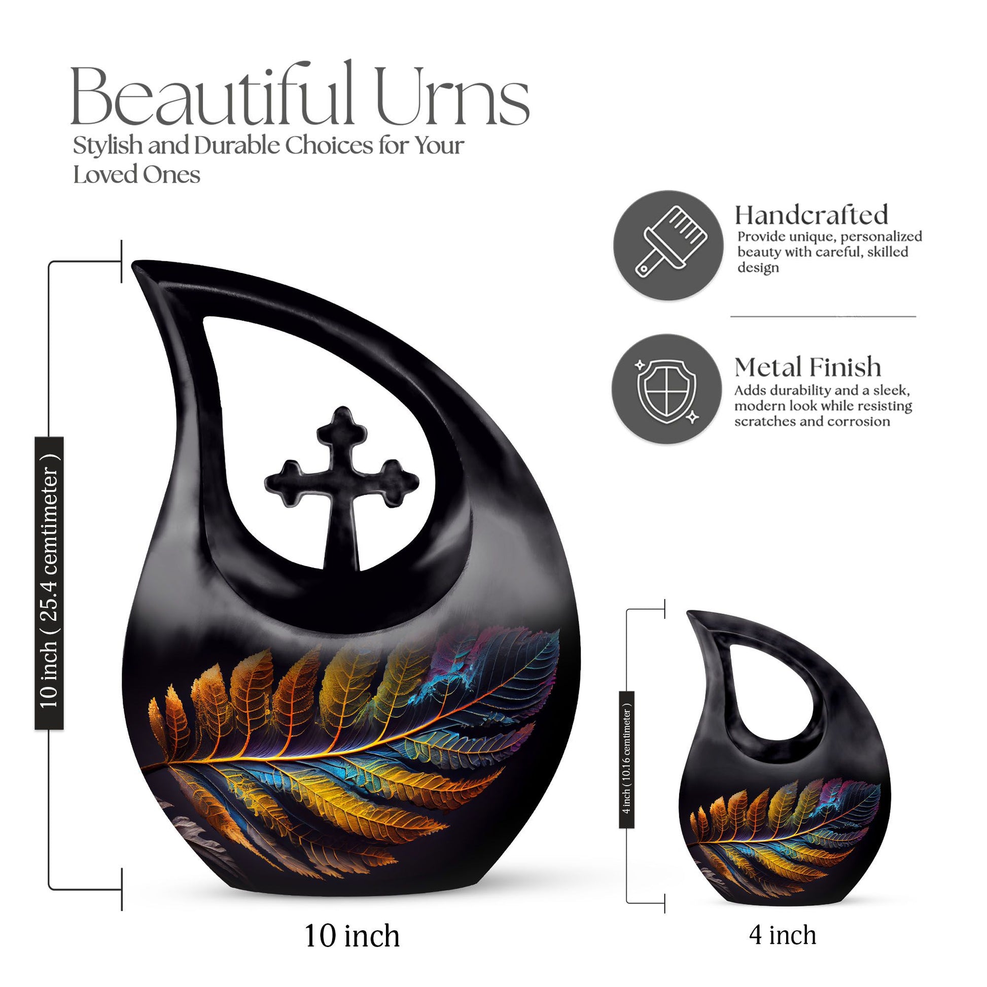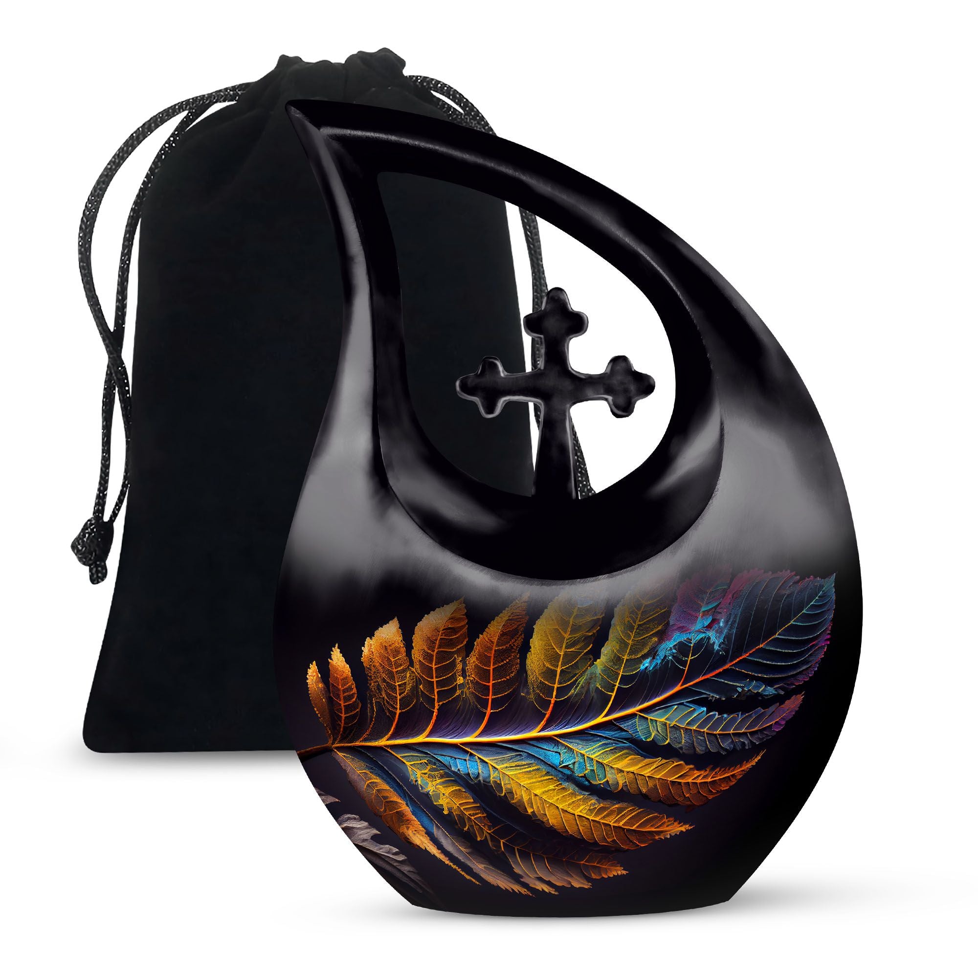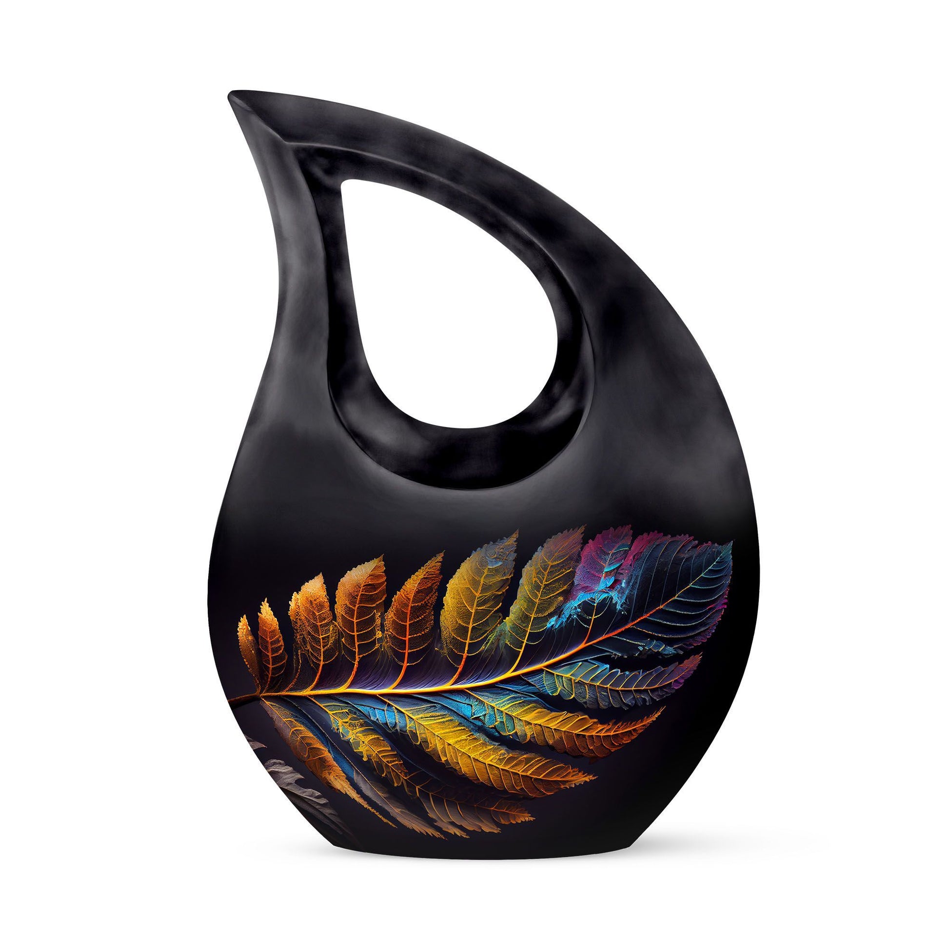 Expertly crafted from durable aluminum, this urn features a striking black finish with subtle leaf engravings—representing renewal and remembrance. Its classic design complements any décor while offering a secure resting place for your loved one. This large cremation urn is designed for longevity, ensuring the ashes of your beloved remain safe for generations. Ideal for those seeking large urns for human ashes adult female or urns for ashes adult male large, it combines artistry with meaning.