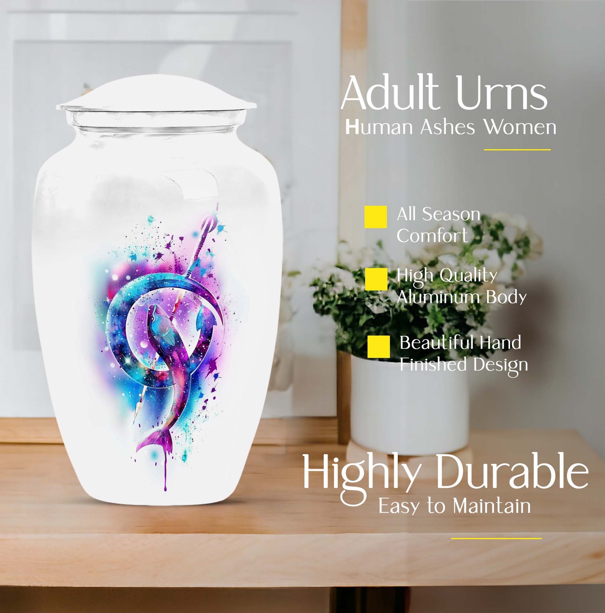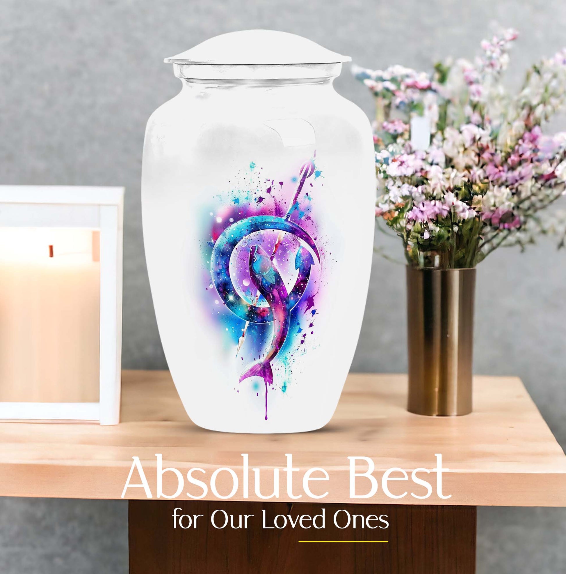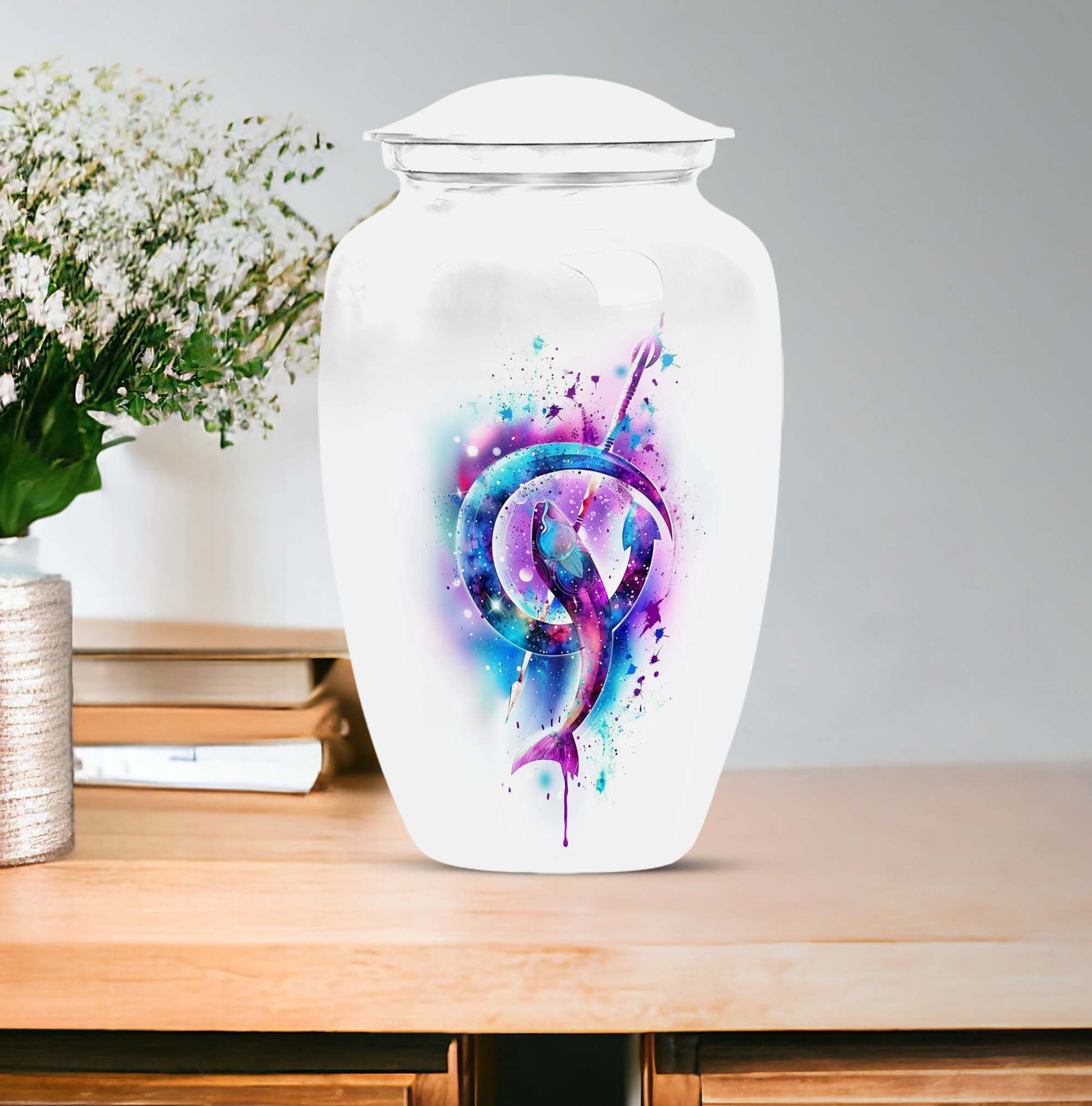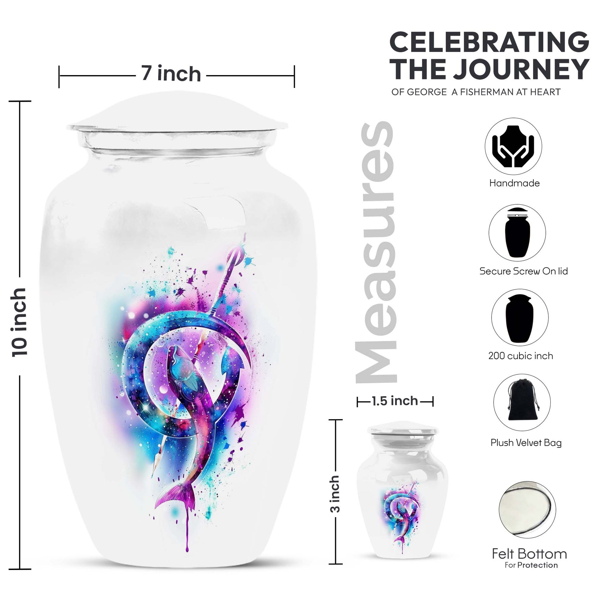 Rediscover the absolute tranquility of a lost loved one with our 10-inch abstract-themed fish Urn. This urn is not just any regular memorial urn for an adult male. It's a tribute, a token to remember them dearly in a unique and unforgettable way. Crafted from premium aluminium, each urn is robust and holds significance, weighing 3.3 pounds. The urn can hold up to 200 cubic inches of ashes, offering ample space. This large urn extends the possibility of personalizing with engraved names. It unfolds a velvet pouch for suitable containment of ashes. Our cremation urn is specifically designed to serve as a respectful and custom memorial urn. They speak volumes about your love and connection with the departed. This masterpiece perfectly fits the profile of funeral medium size urns for human ashes. Considered as one of the companion cremation urns for 2 adults, it can also serve as a subtle, yet highly valuable urn for human ashes adult. The product is curated with the utmost care, consuming thorough attention to detail, ensuring longevity and operational performance.