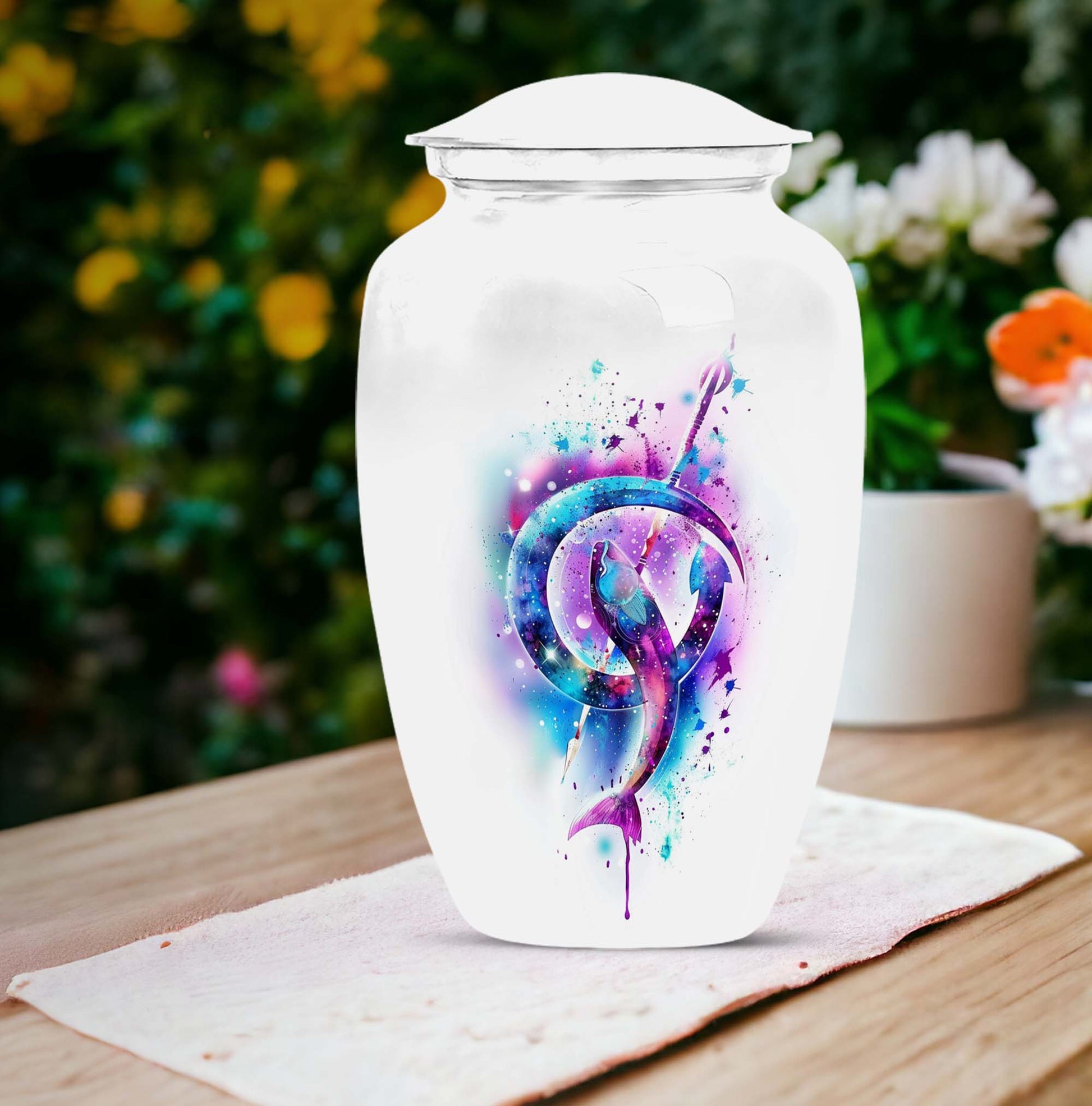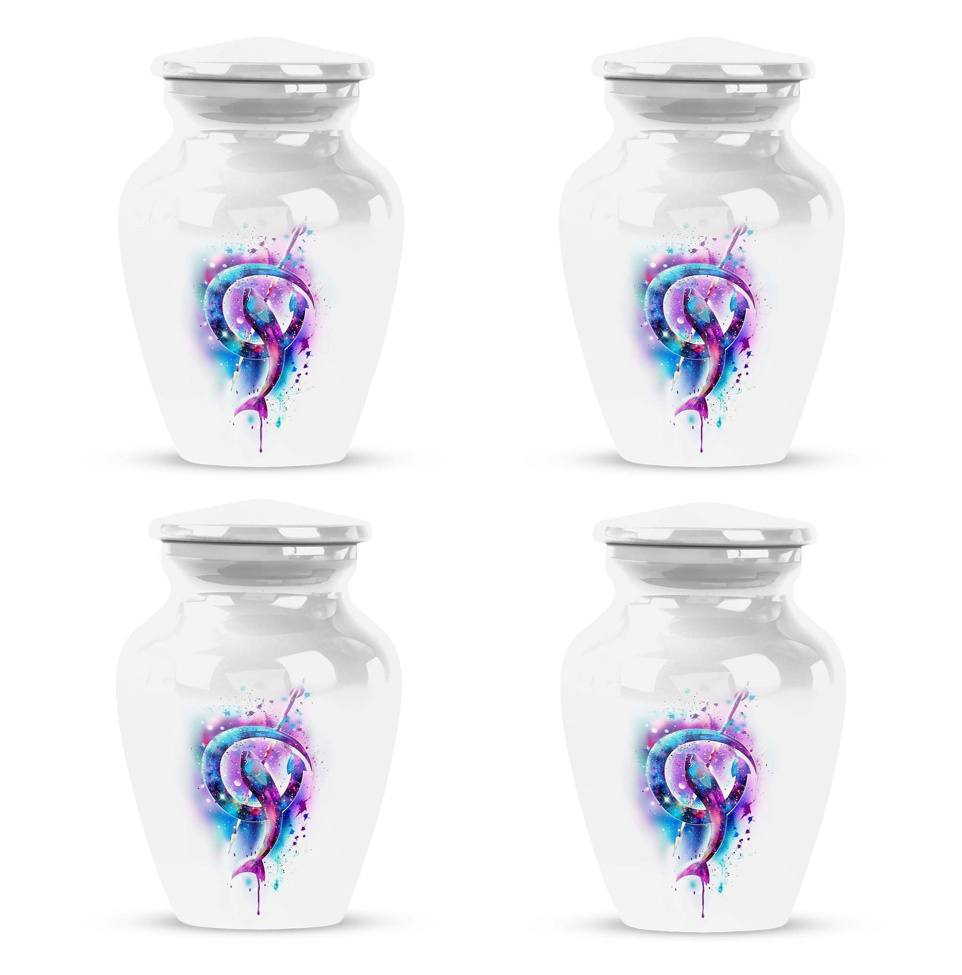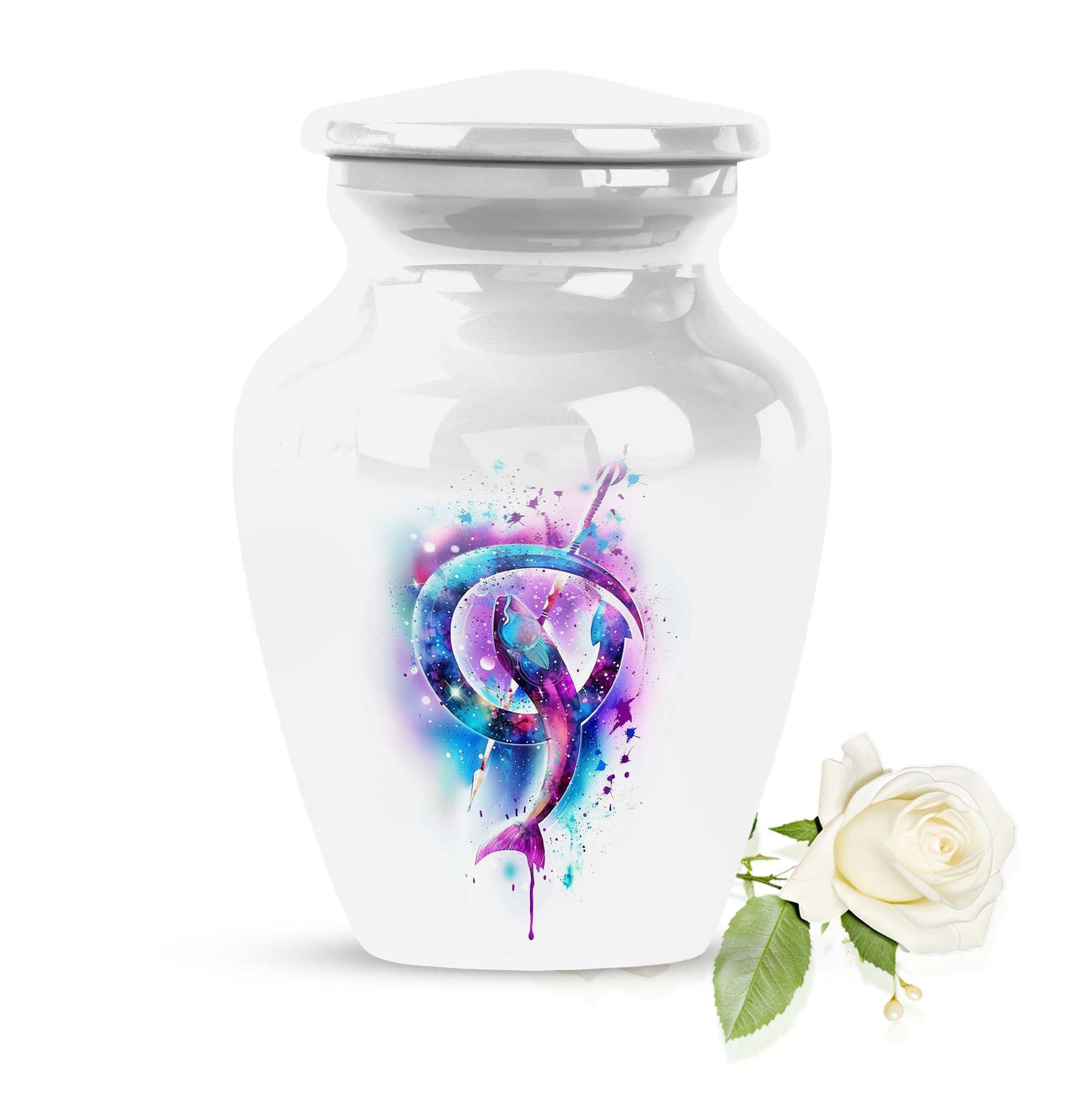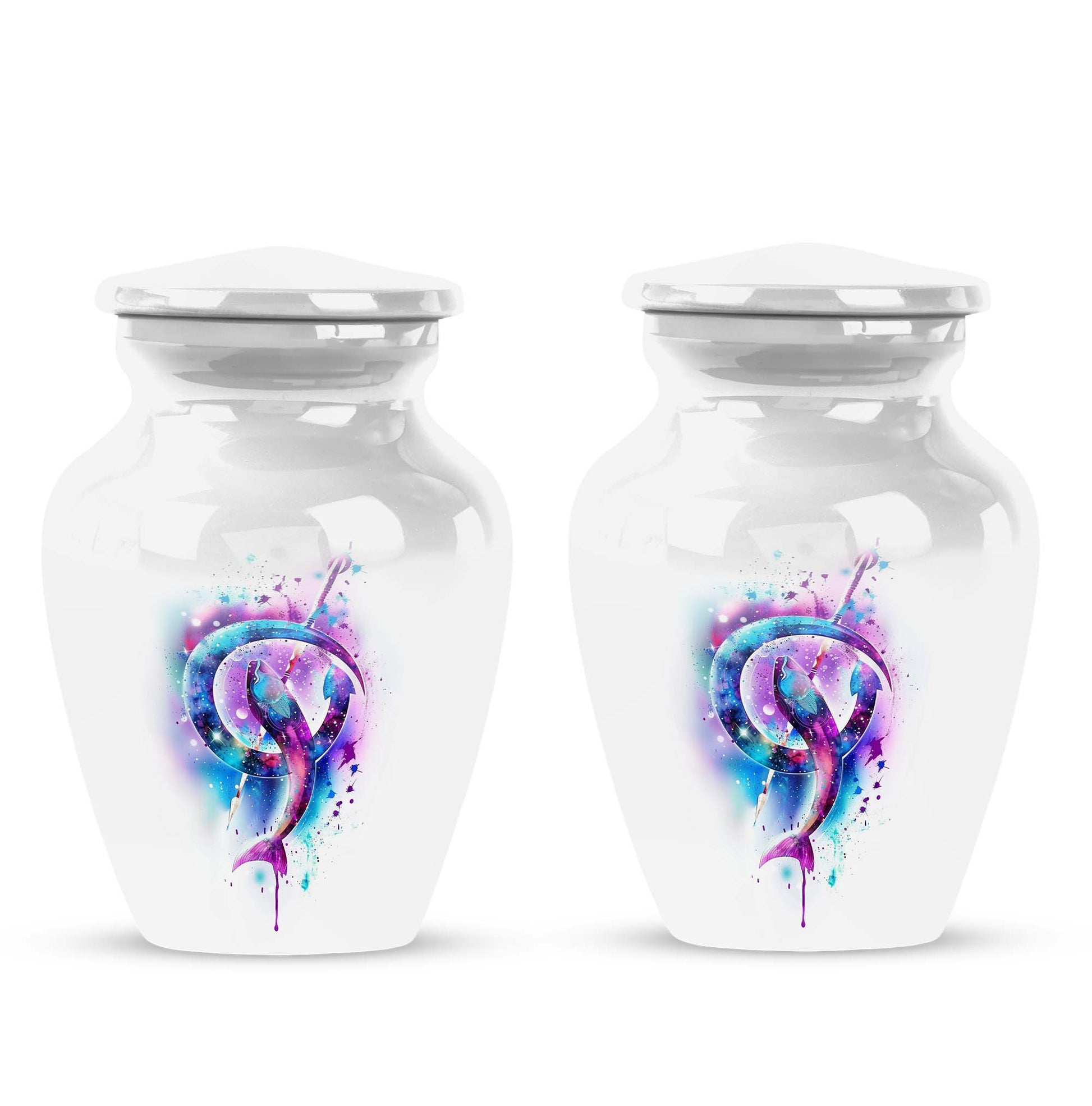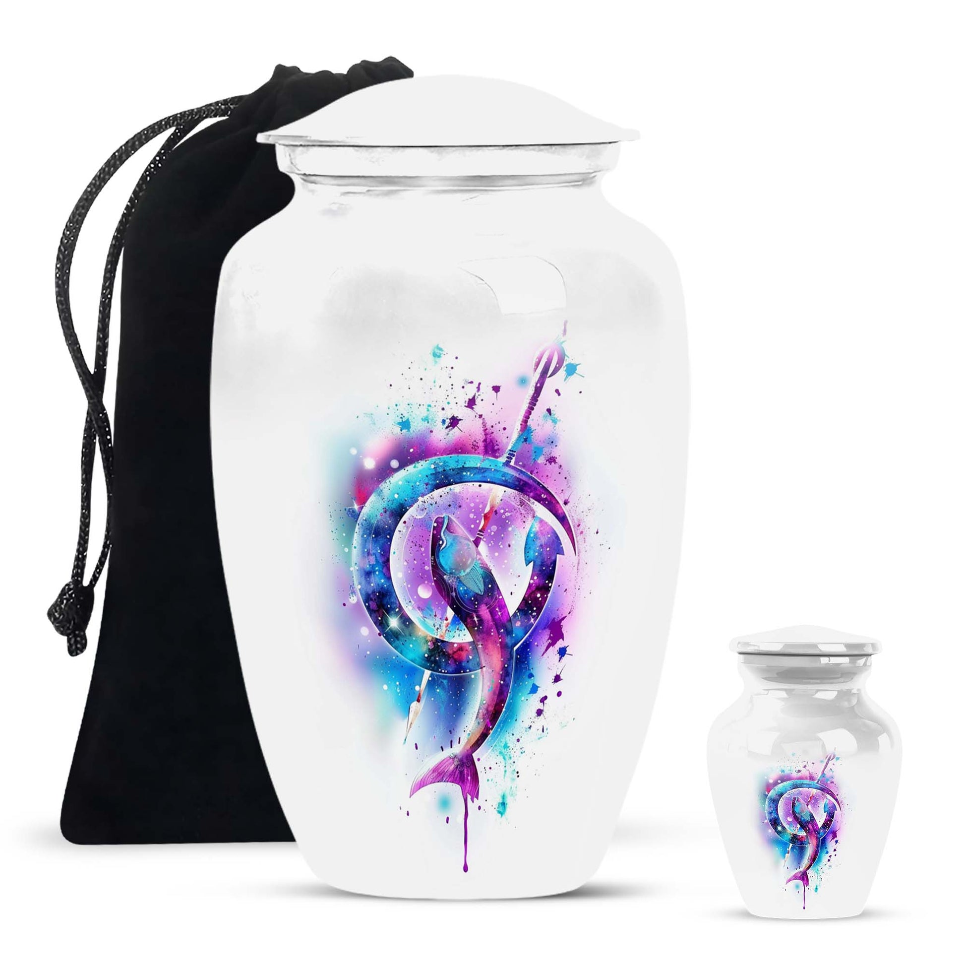 Rediscover the absolute tranquility of a lost loved one with our 10-inch abstract-themed fish Urn. This urn is not just any regular memorial urn for an adult male. It's a tribute, a token to remember them dearly in a unique and unforgettable way. Crafted from premium aluminium, each urn is robust and holds significance, weighing 3.3 pounds. The urn can hold up to 200 cubic inches of ashes, offering ample space. This large urn extends the possibility of personalizing with engraved names. It unfolds a velvet pouch for suitable containment of ashes. Our cremation urn is specifically designed to serve as a respectful and custom memorial urn. They speak volumes about your love and connection with the departed. This masterpiece perfectly fits the profile of funeral medium size urns for human ashes. Considered as one of the companion cremation urns for 2 adults, it can also serve as a subtle, yet highly valuable urn for human ashes adult. The product is curated with the utmost care, consuming thorough attention to detail, ensuring longevity and operational performance.