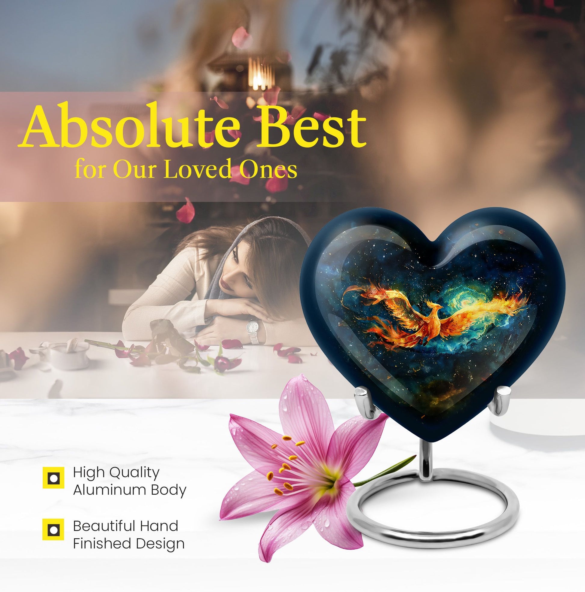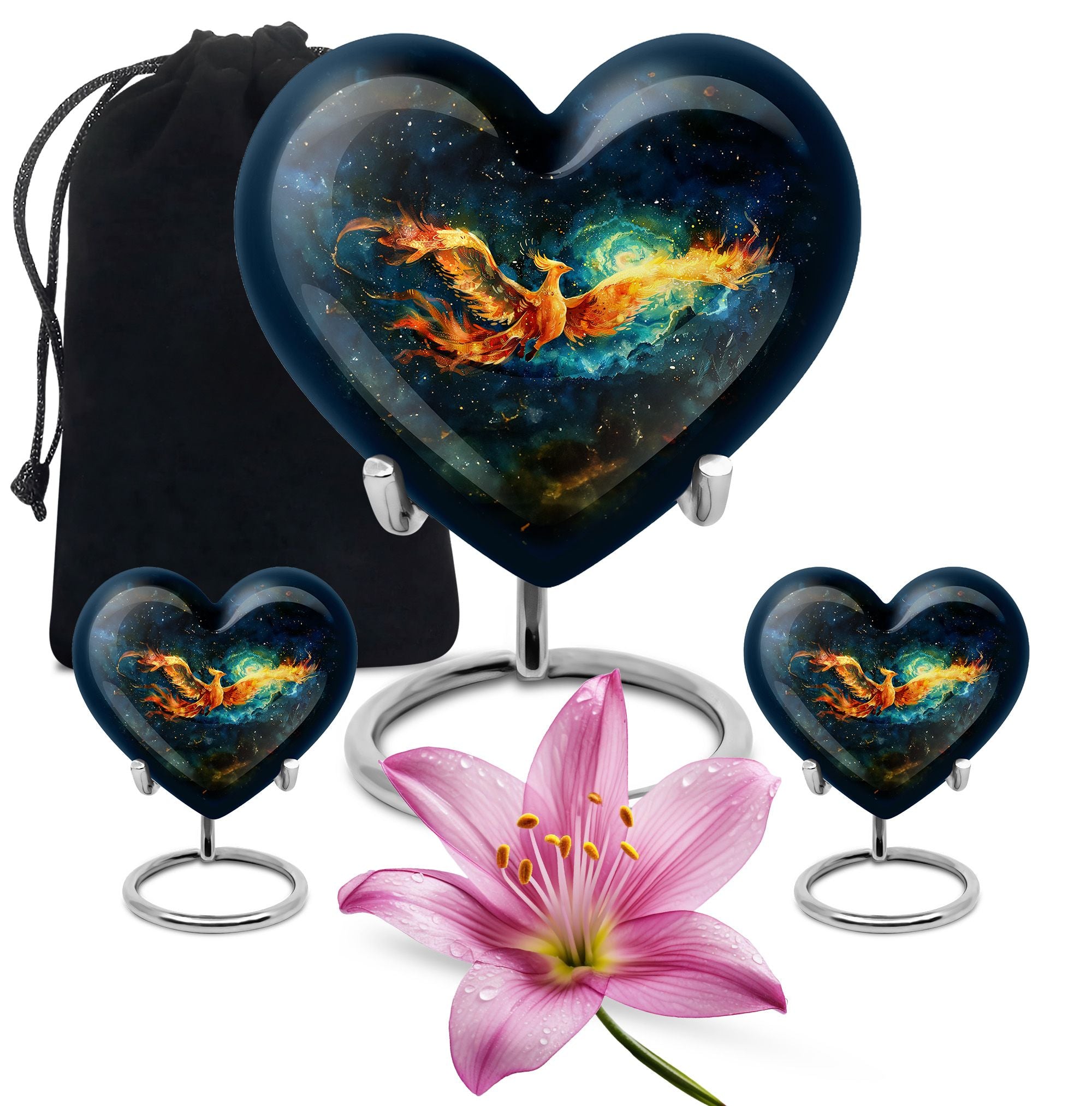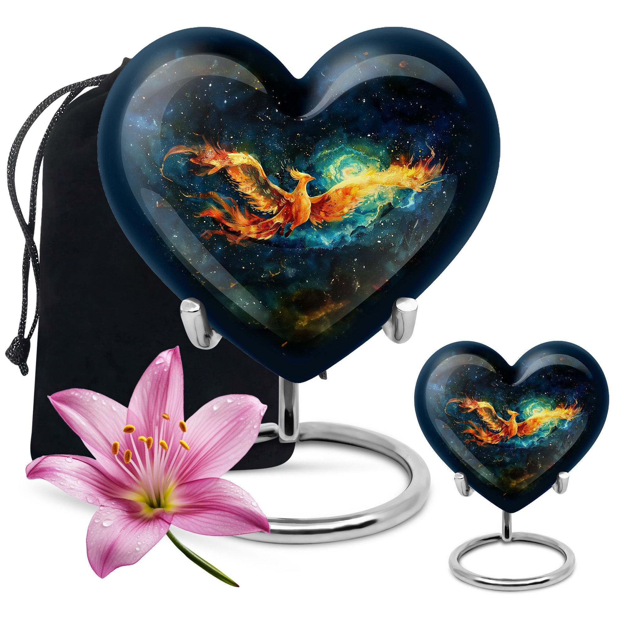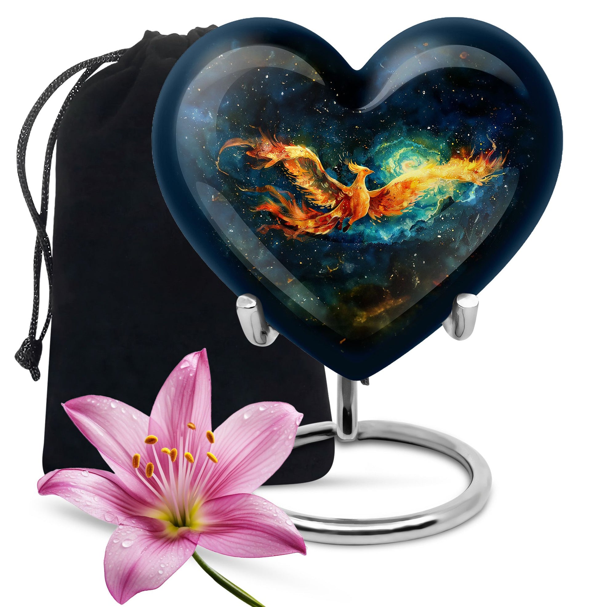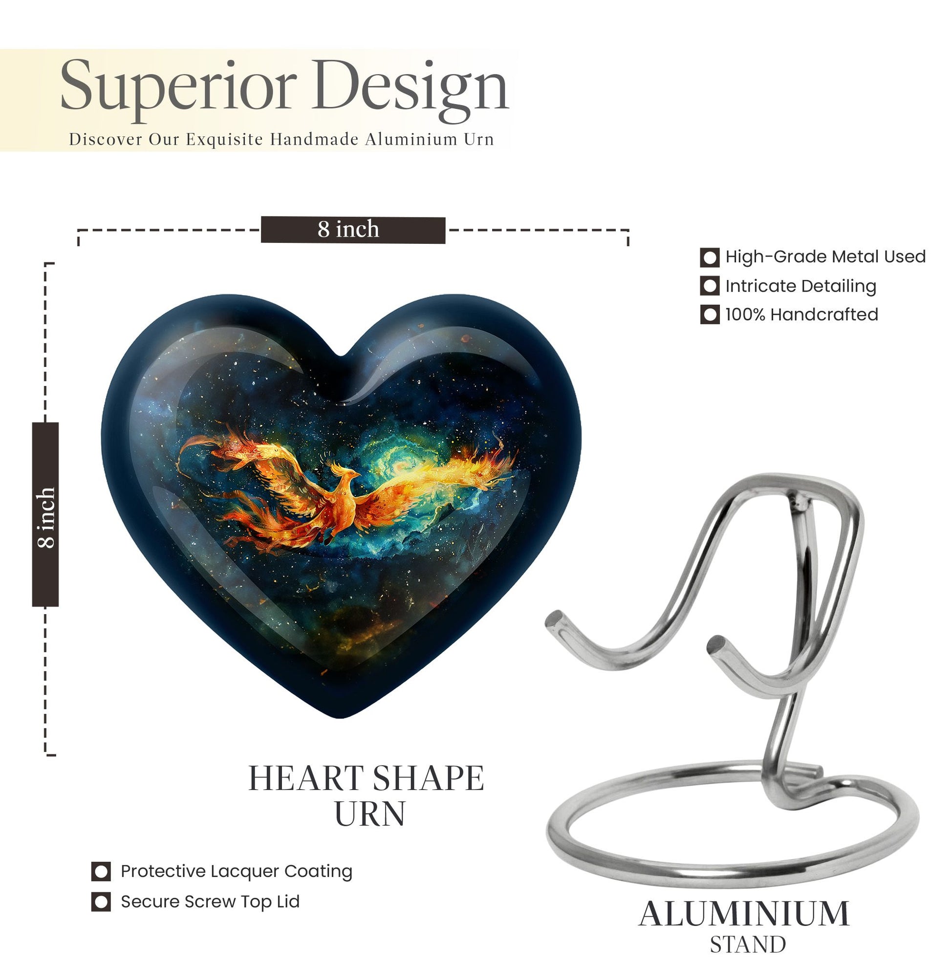 Introducing the Phoenix Urn, an exquisite choice fit for the commemoration of your loved one. It belongs to our select line of large cremation urns, designed to provide a peaceful and tasteful resting place. Our signature Phoenix Urn stands 10 inches tall, offering a substantial capacity of 200 cubic inches. Made with meticulous care from top-grade aluminium, it manages to combine sturdiness with lightweight qualities, tipping the scale at only 3.3 pounds. It comes with a snug velvet pouch, purposely designed for the dignified containment of ashes. Adding a personal touch, this exceptional urn can be personalized with engraved names, making it the perfect vessel to commemorate their unique life. Uncommonly beautiful with its heart urn design, it features an abstract theme that seamlessly blends with any decor. Beyond being a burial urn, it's a tribute—eternally capturing the essence of your beloved. Bear in mind, searching for terms like 'cremation urn for human ashes' and 'funeral urns' will lead you straight to our one-of-a-kind Phoenix urn.