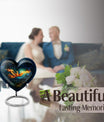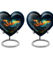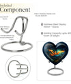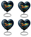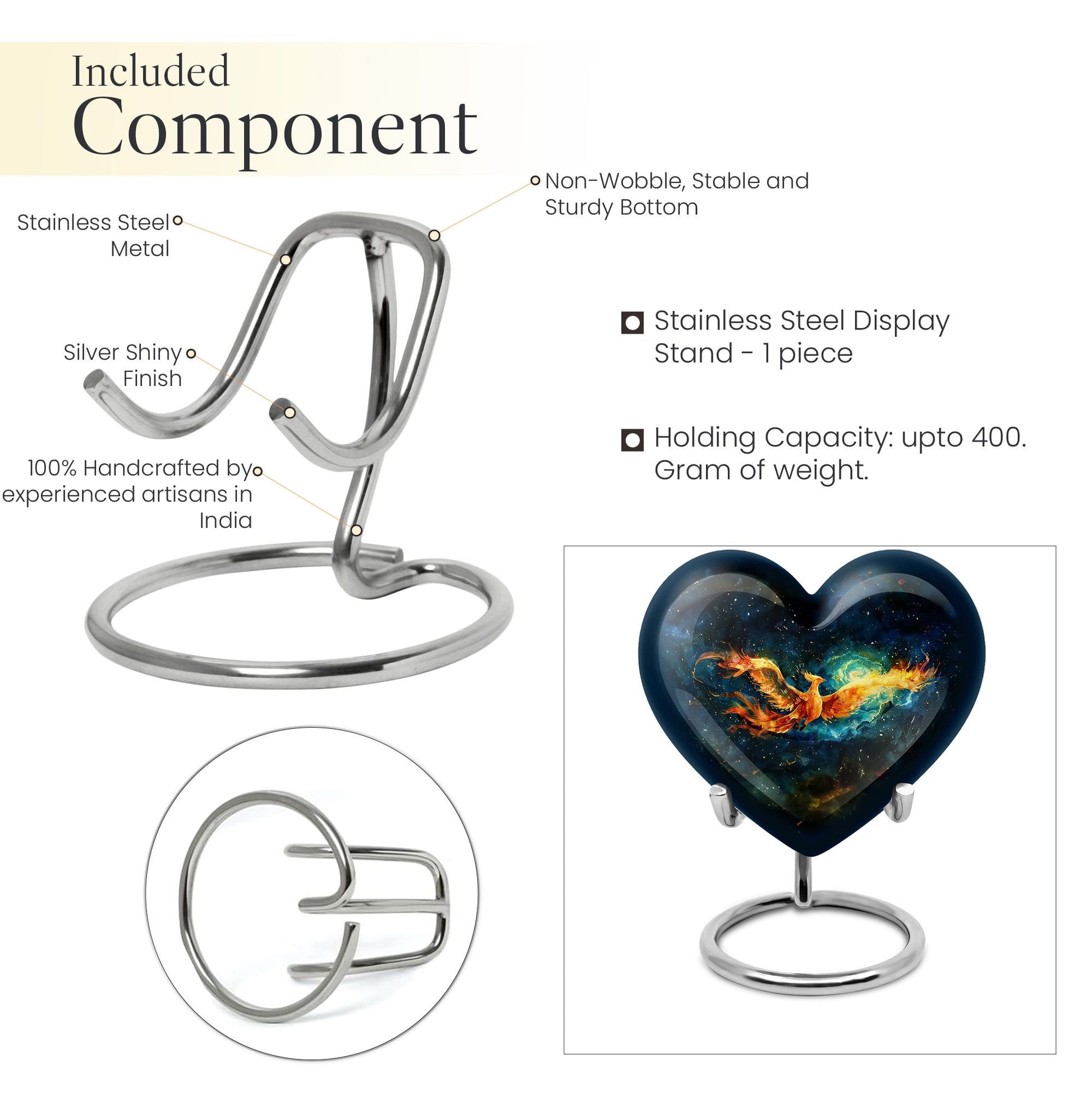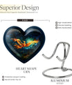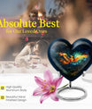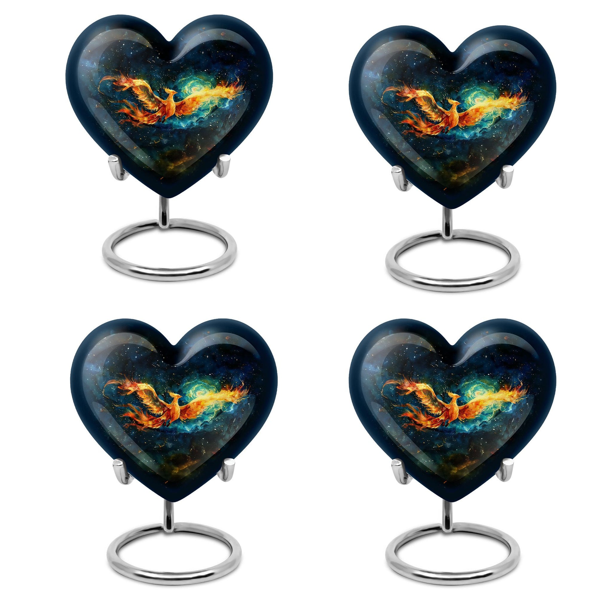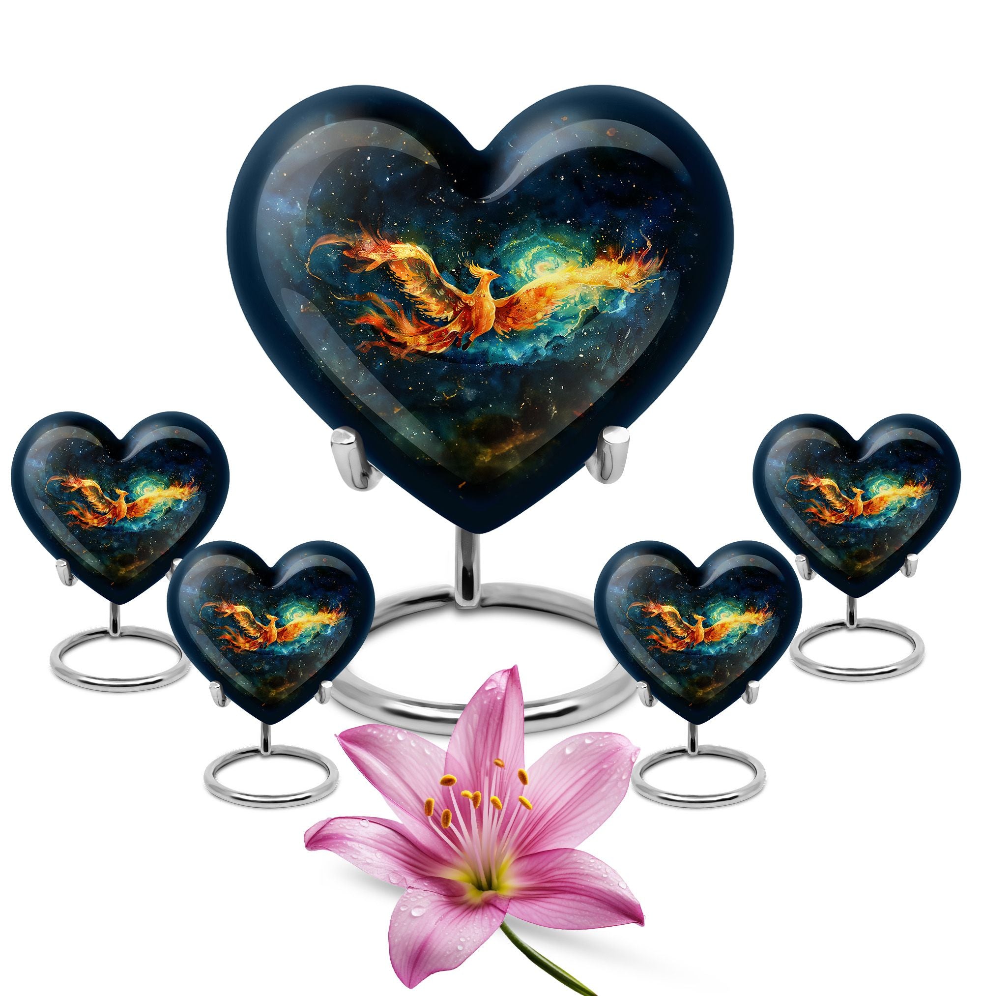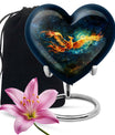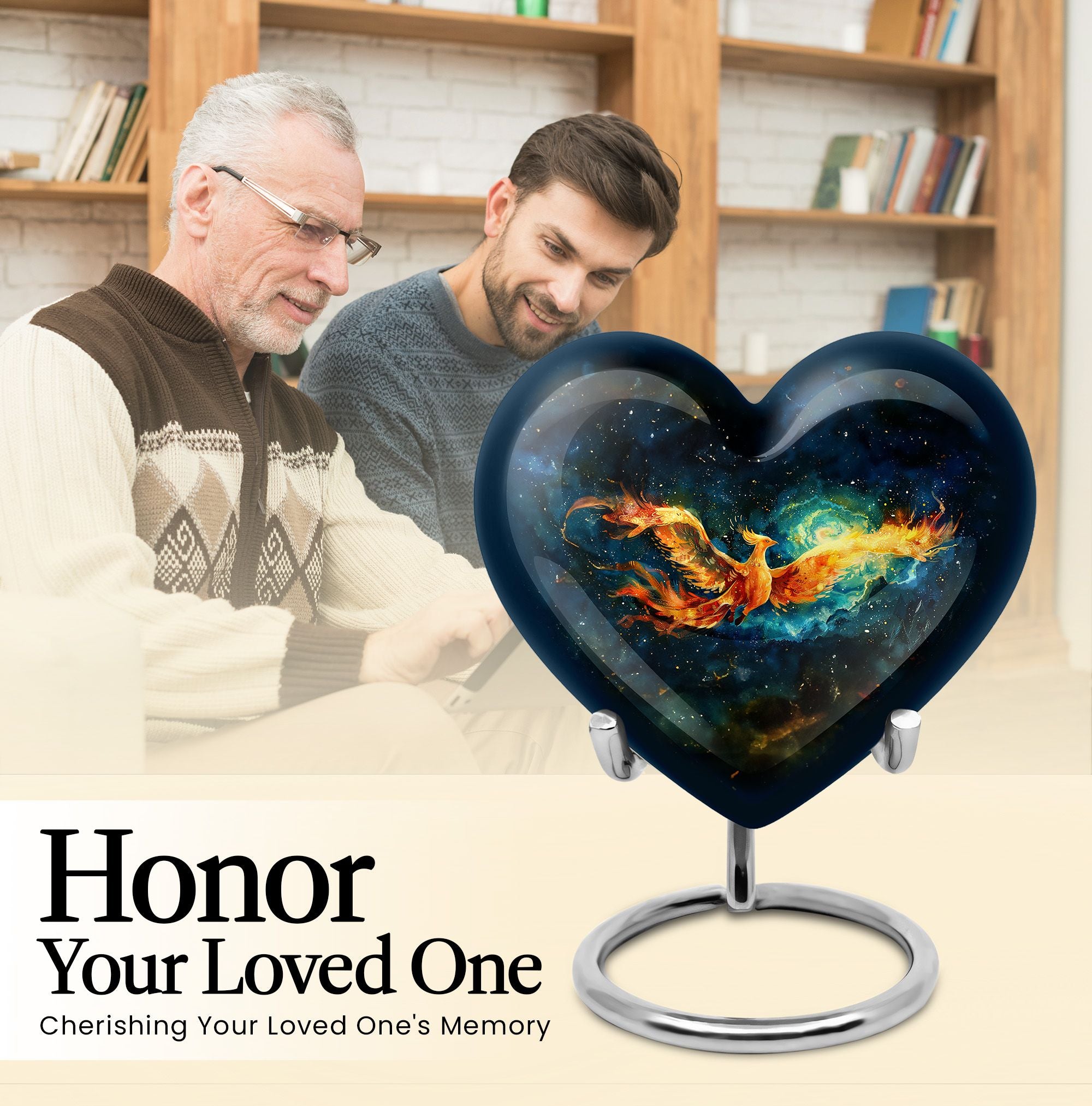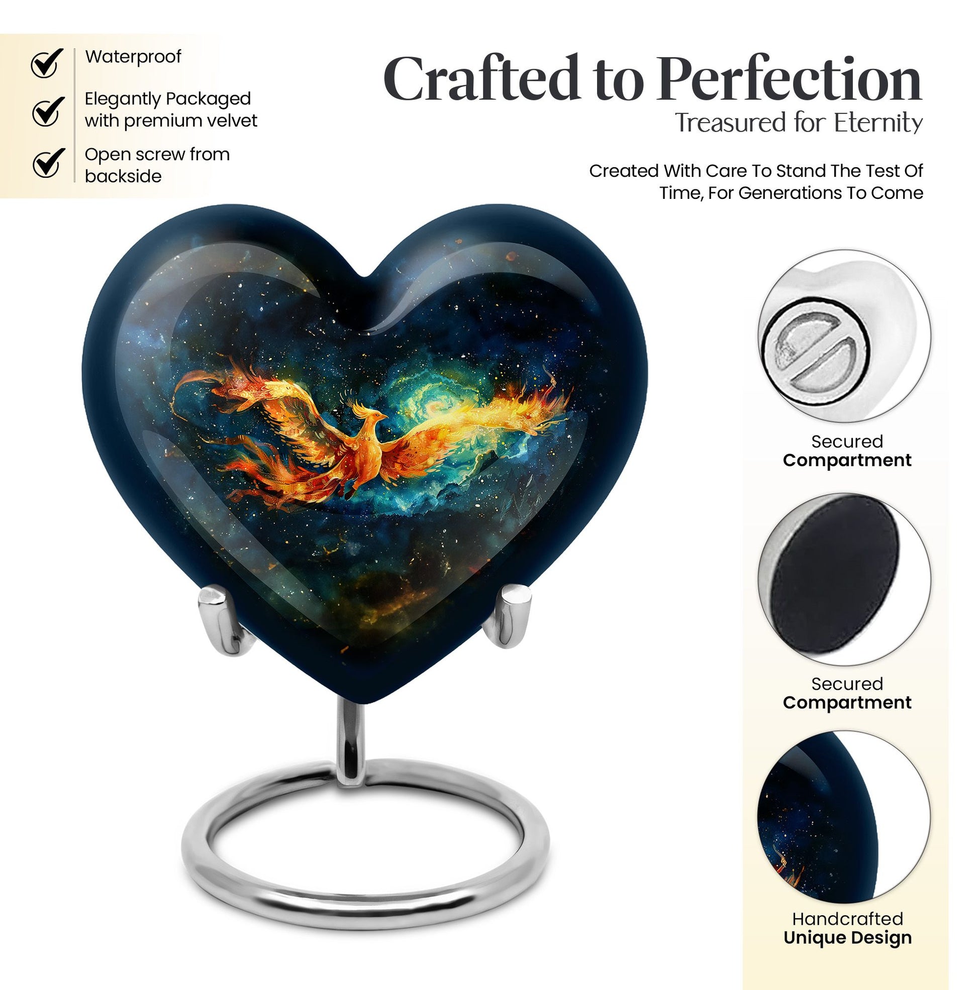 Introducing the Phoenix Urn, an exquisite choice fit for the commemoration of your loved one. It belongs to our select line of large cremation urns, designed to provide a peaceful and tasteful resting place. Our signature Phoenix Urn stands 10 inches tall, offering a substantial capacity of 200 cubic inches. Made with meticulous care from top-grade aluminium, it manages to combine sturdiness with lightweight qualities, tipping the scale at only 3.3 pounds. It comes with a snug velvet pouch, purposely designed for the dignified containment of ashes. Adding a personal touch, this exceptional urn can be personalized with engraved names, making it the perfect vessel to commemorate their unique life. Uncommonly beautiful with its heart urn design, it features an abstract theme that seamlessly blends with any decor. Beyond being a burial urn, it's a tribute—eternally capturing the essence of your beloved. Bear in mind, searching for terms like 'cremation urn for human ashes' and 'funeral urns' will lead you straight to our one-of-a-kind Phoenix urn.