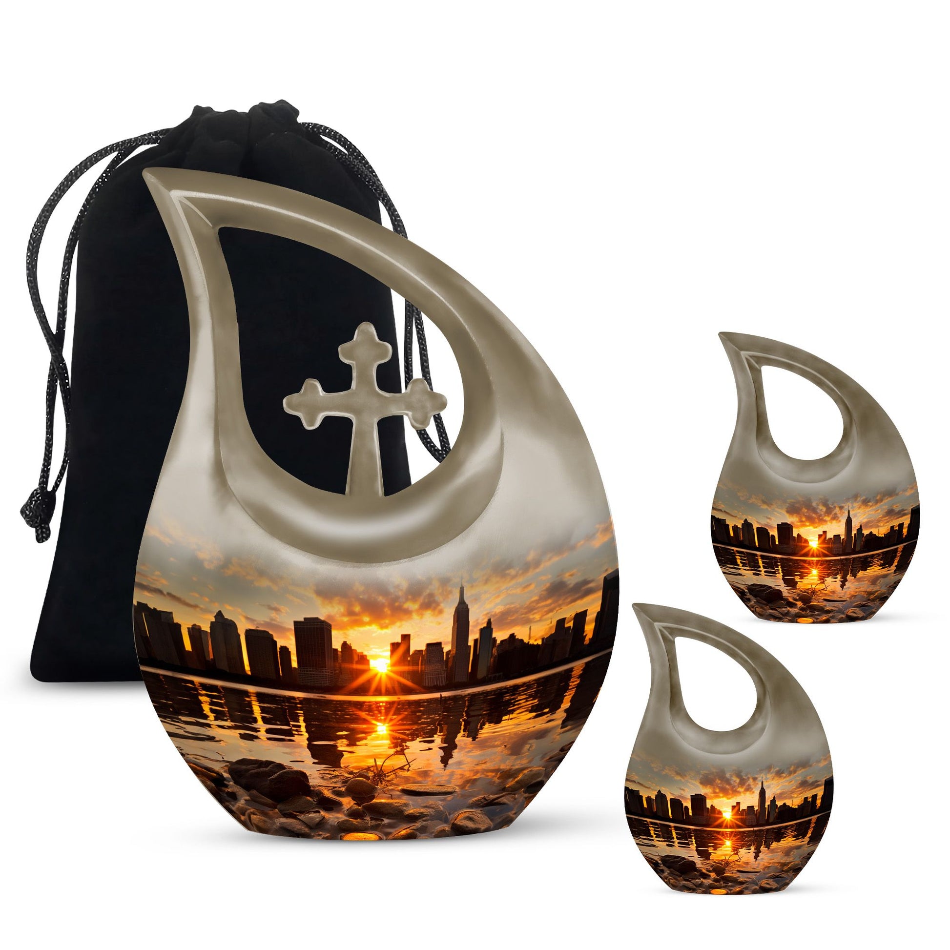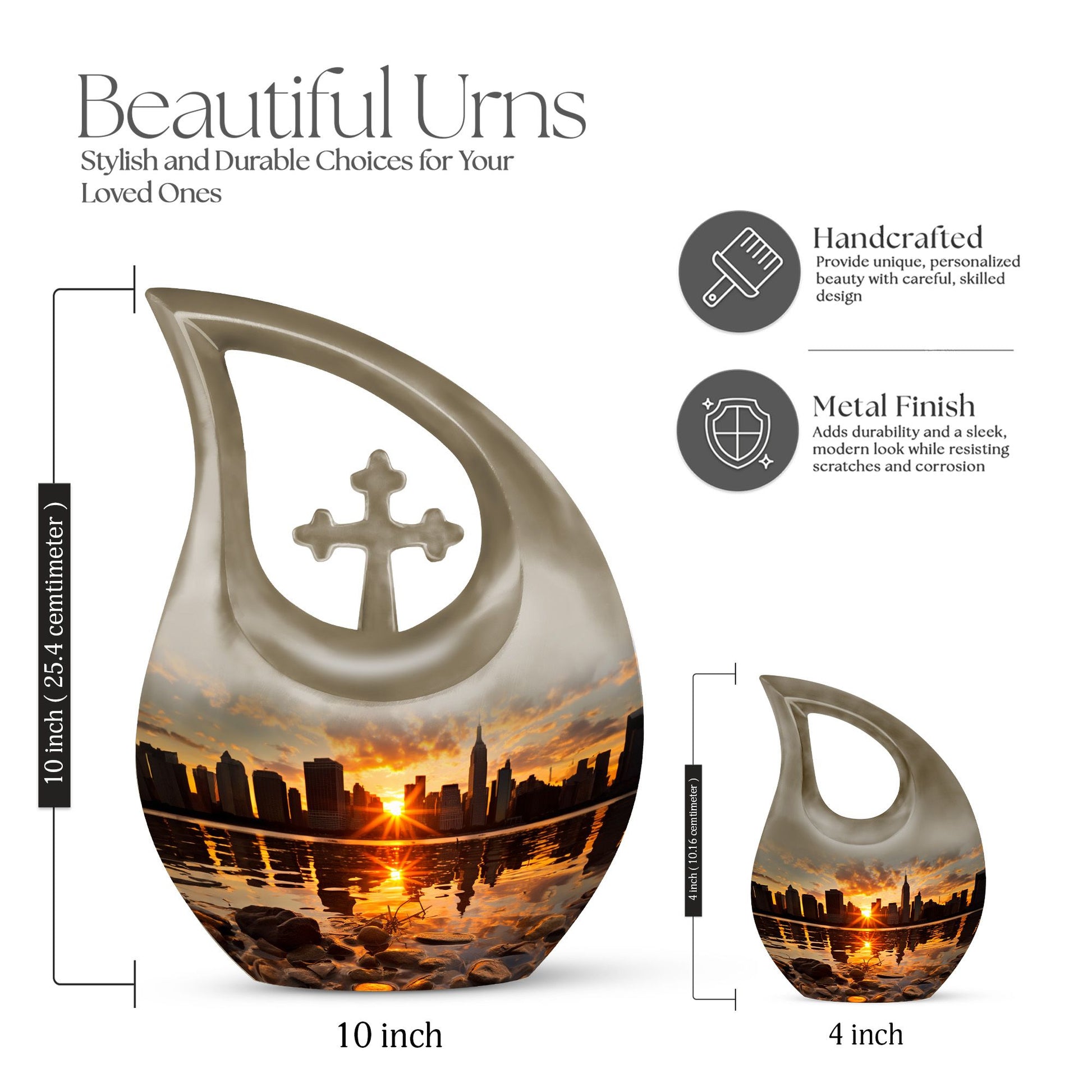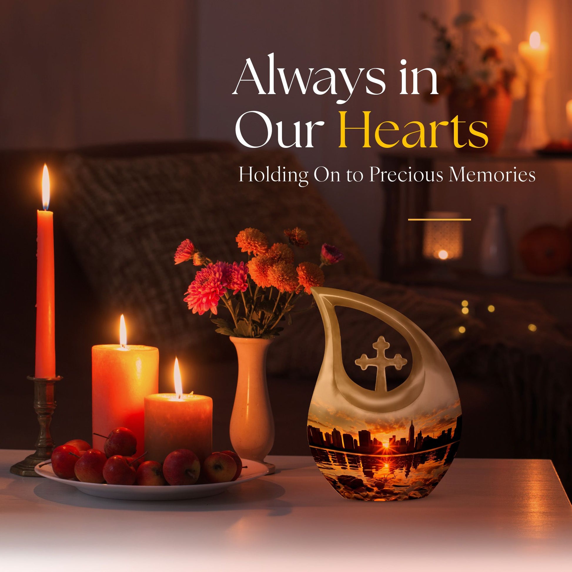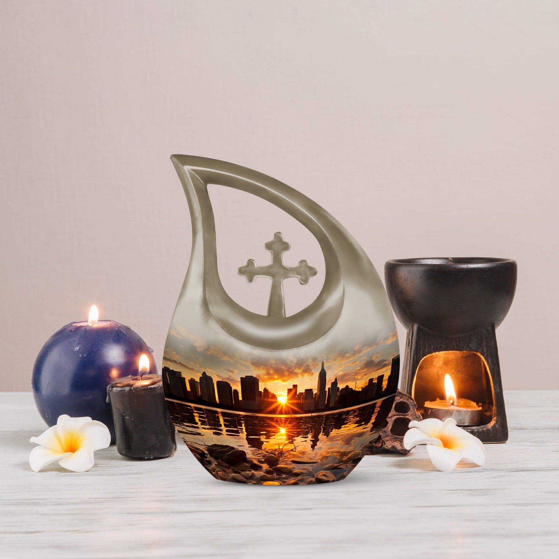 The Sunset City Skyline Scenic Urn offers a touching way to honor a cherished life. Designed with love and care, this exquisite piece symbolizes eternal peace beneath a warm evening sky. Ideal for urns adult male dad or funeral urns for adult ashes women, it beautifully preserves memories while providing comfort and dignity to every farewell.