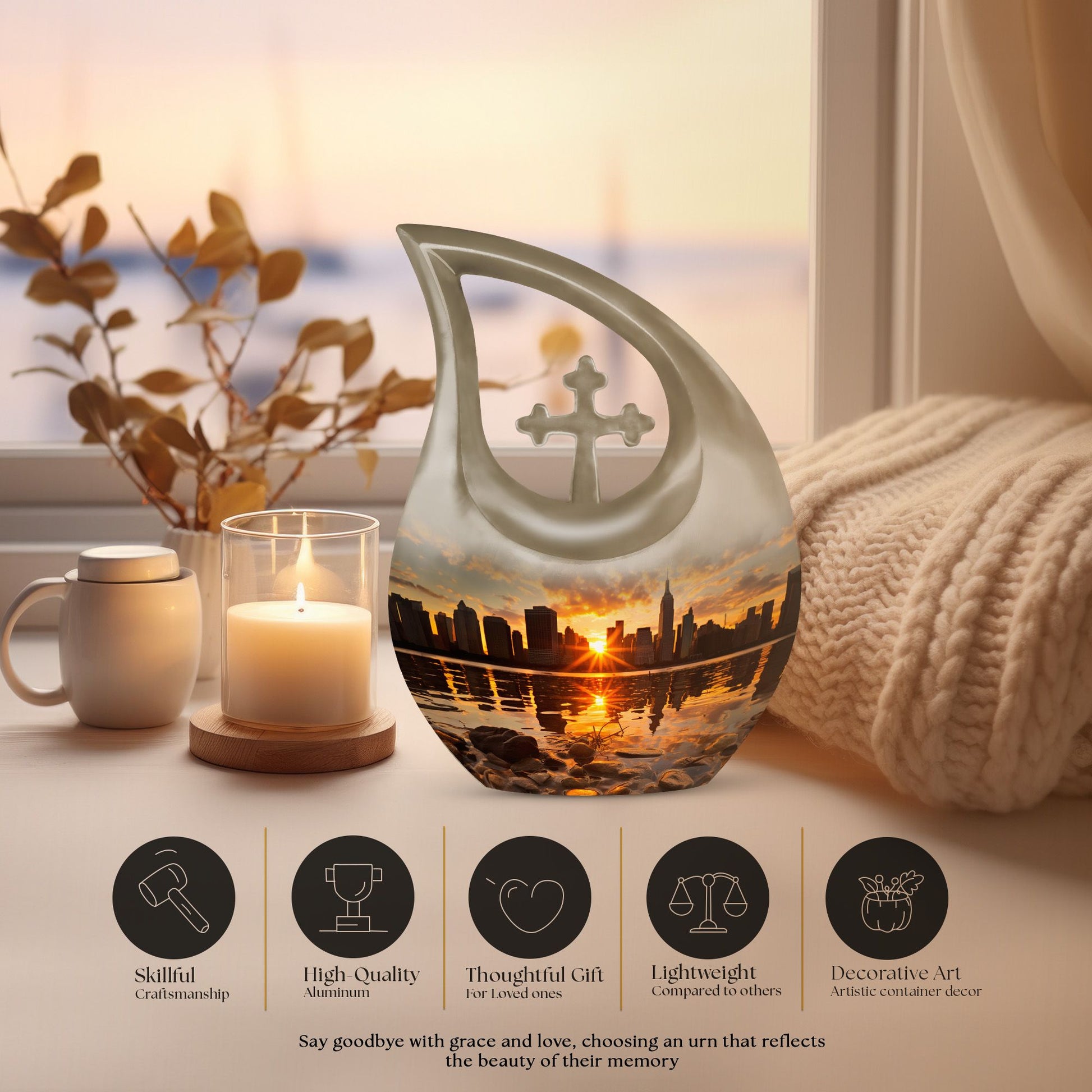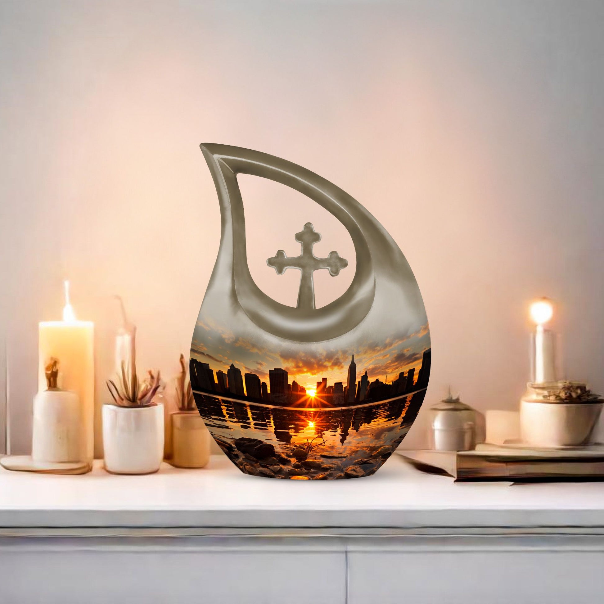 This funeral décor urn – memorial urn serves as a heartfelt centerpiece for remembrance ceremonies. Its captivating skyline imagery reminds families that love and light remain even after sunset. Perfect for both personal keepsake and display, it’s a thoughtful tribute to those who brought light and inspiration to your life.