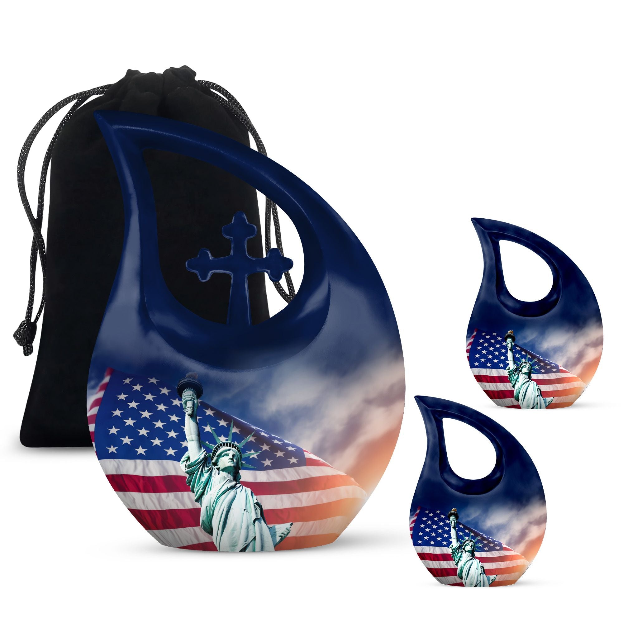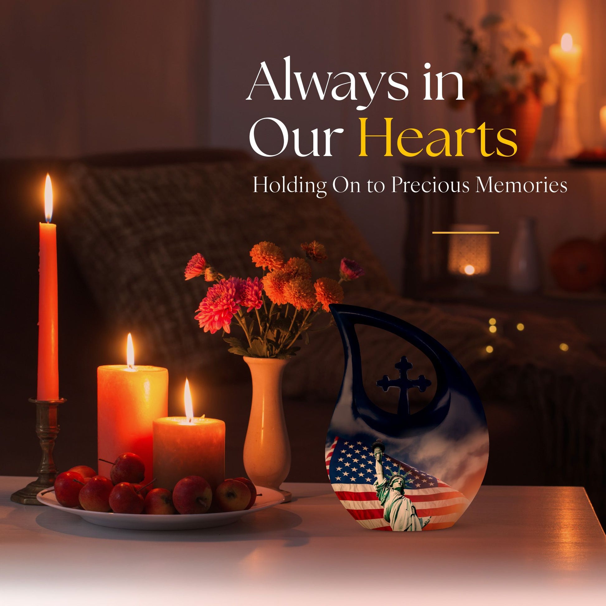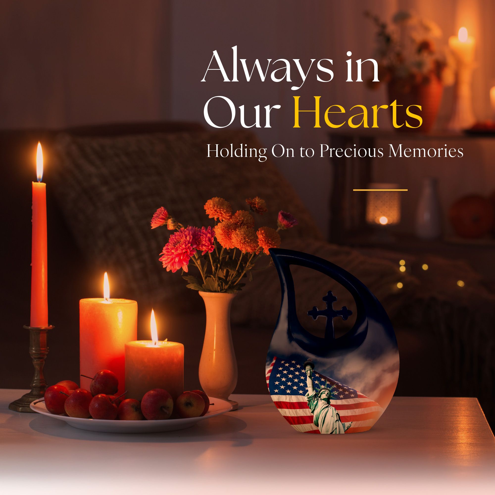 The Liberty With American Flag Urn embodies honor, pride, and eternal remembrance. Designed to celebrate a life well-lived, this elegant memorial piece captures the essence of freedom and devotion to one’s country. Perfect for those who held patriotism close to their hearts, this large urn for human ashes provides a dignified resting place for your loved one. Thoughtfully crafted, it stands as a lasting tribute of love, respect, and loyalty.