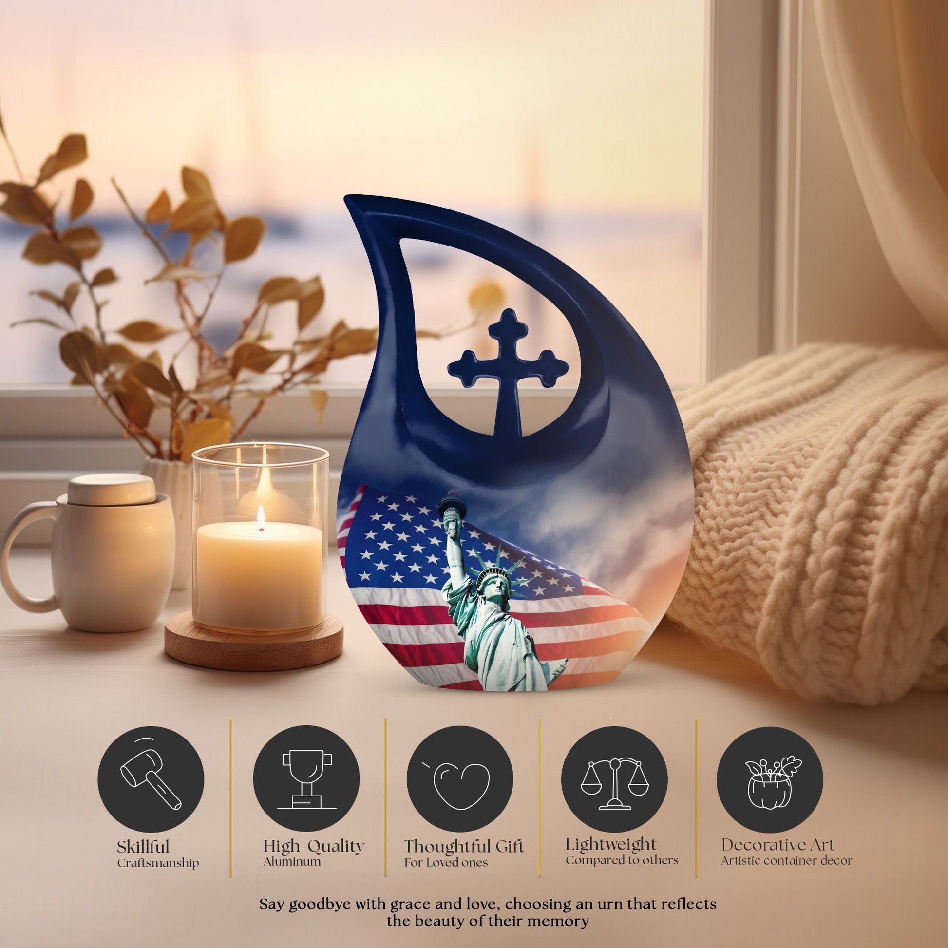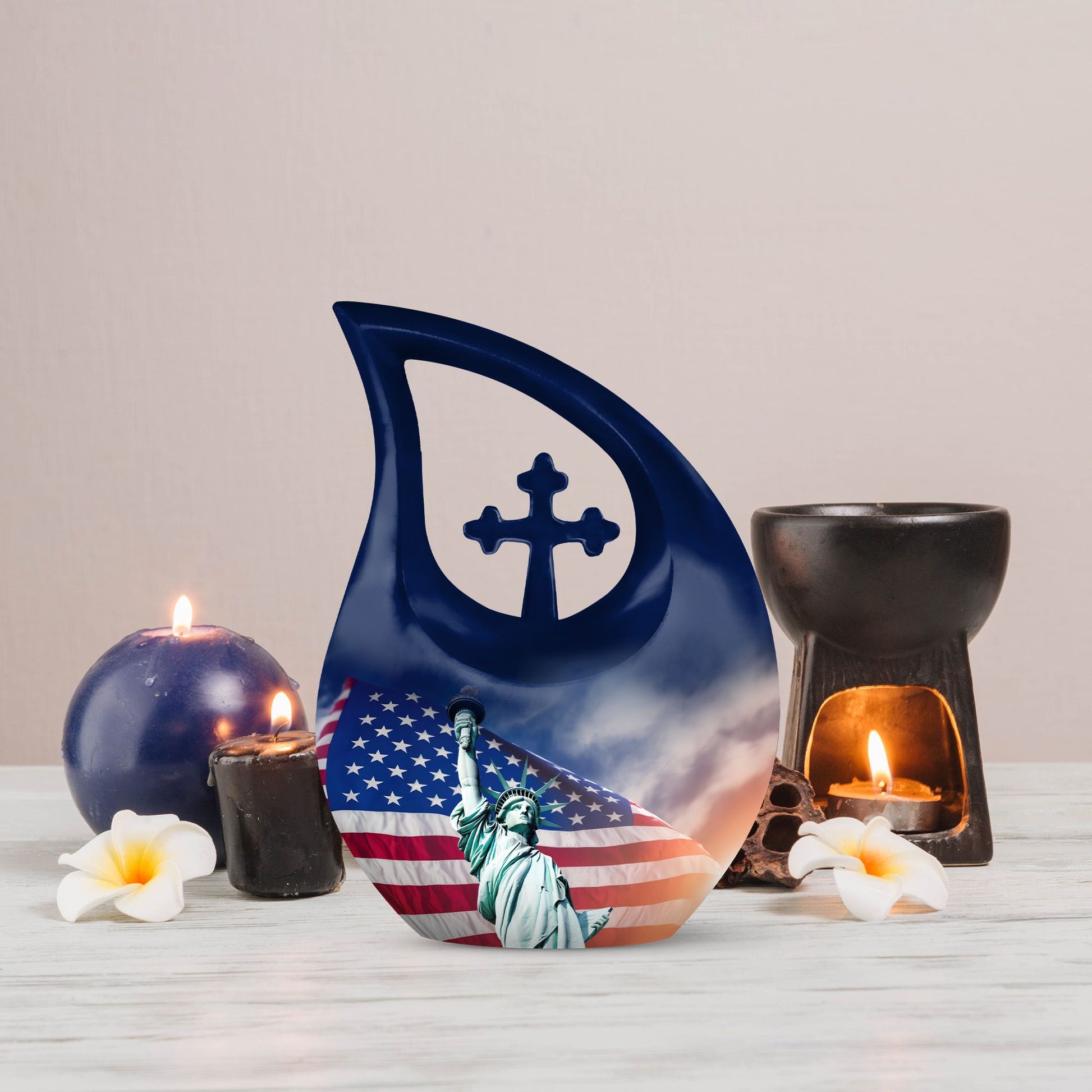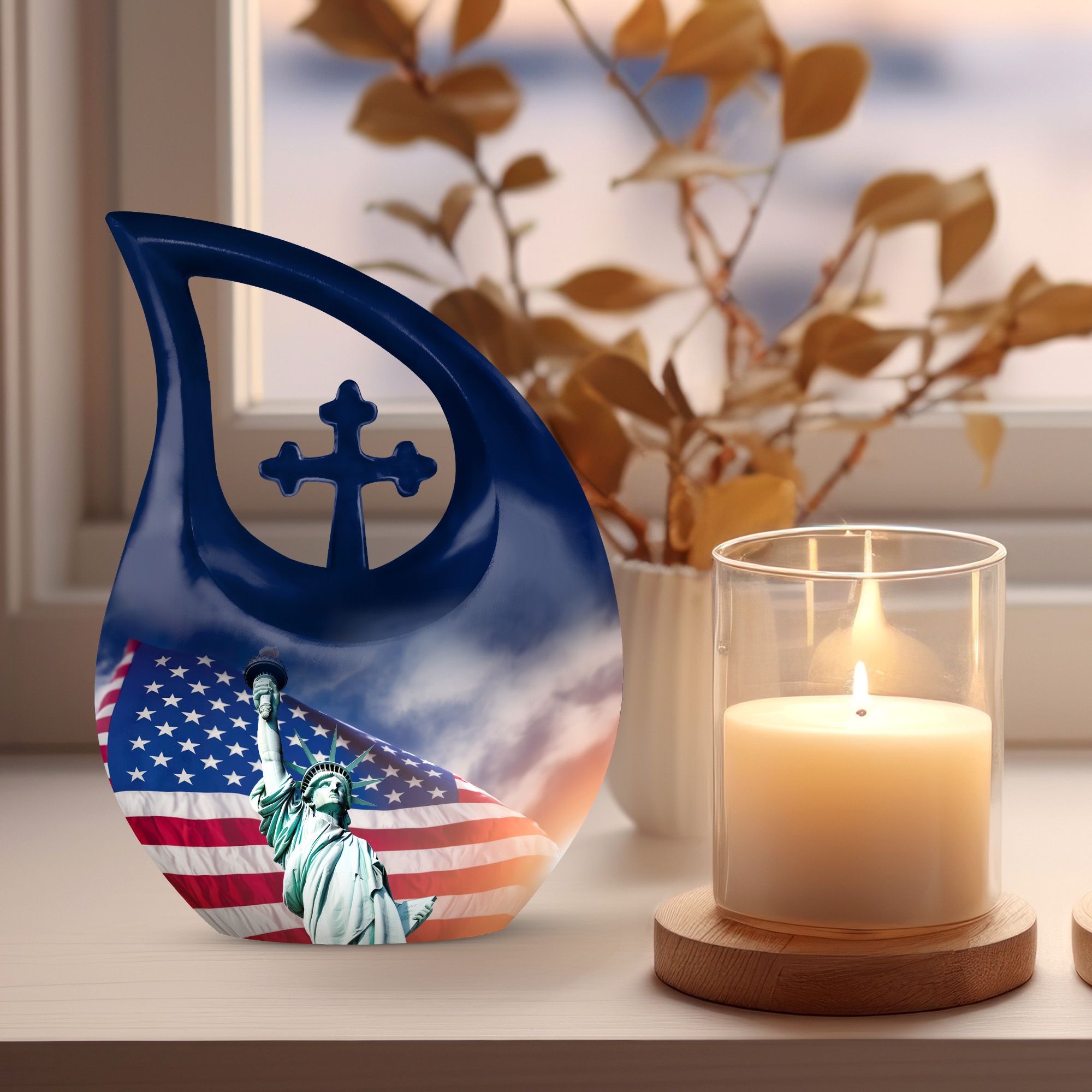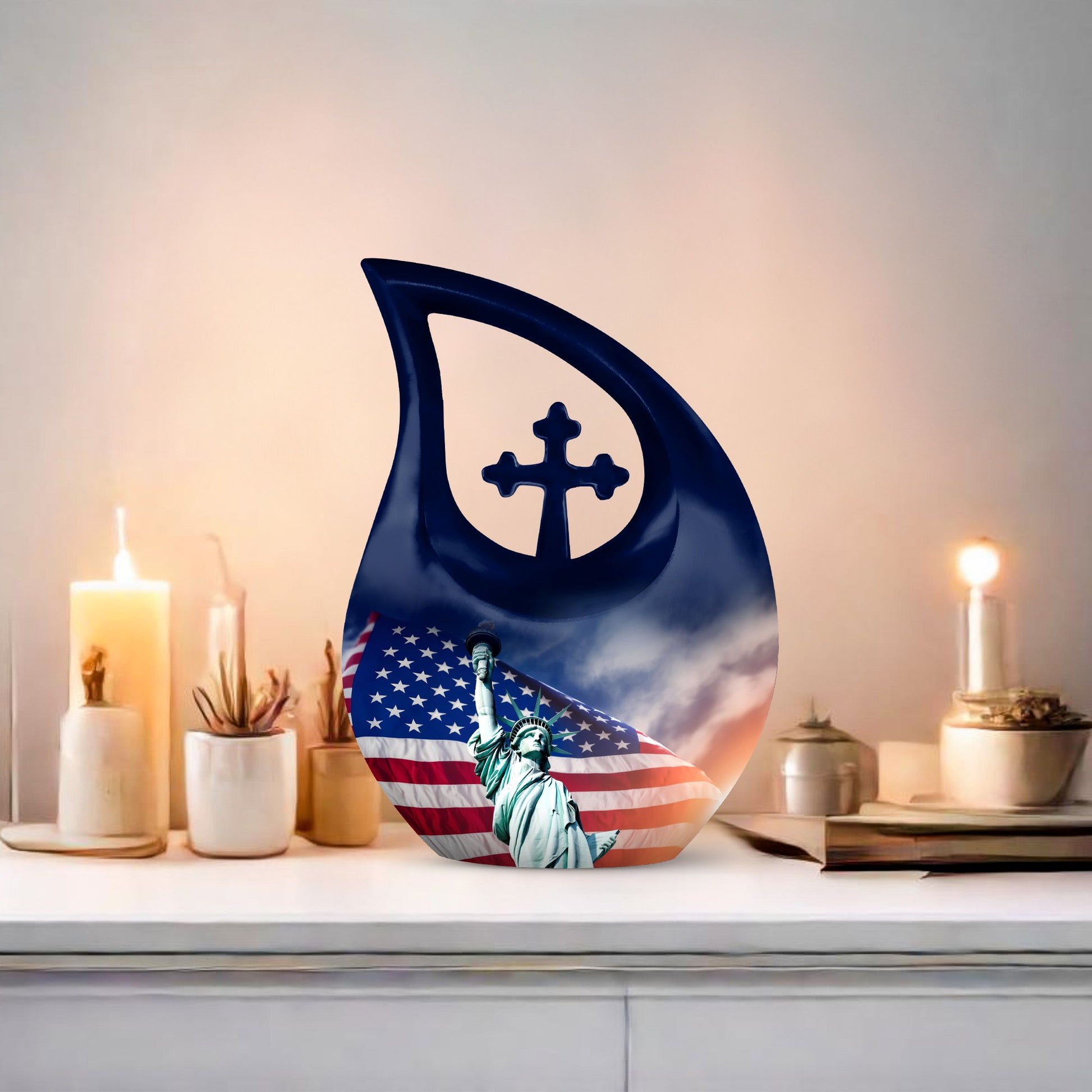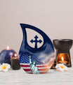 This large human ashes urn serves as a meaningful keepsake or burial urn, designed to preserve cherished memories with dignity. Ideal for those who wish to honor a loved one’s patriotic spirit, it blends emotional warmth with timeless elegance.