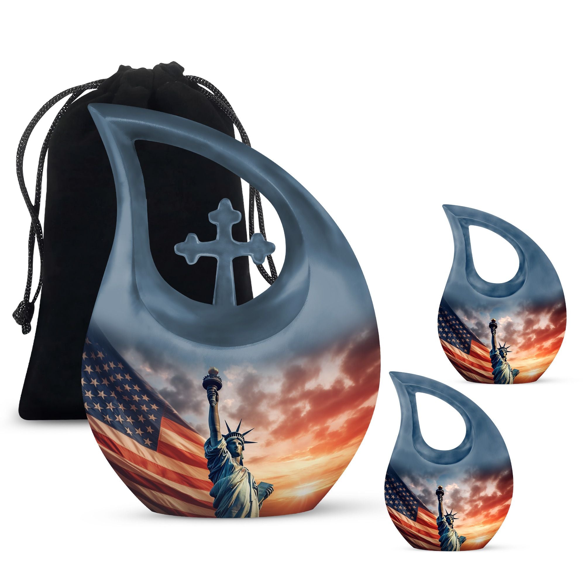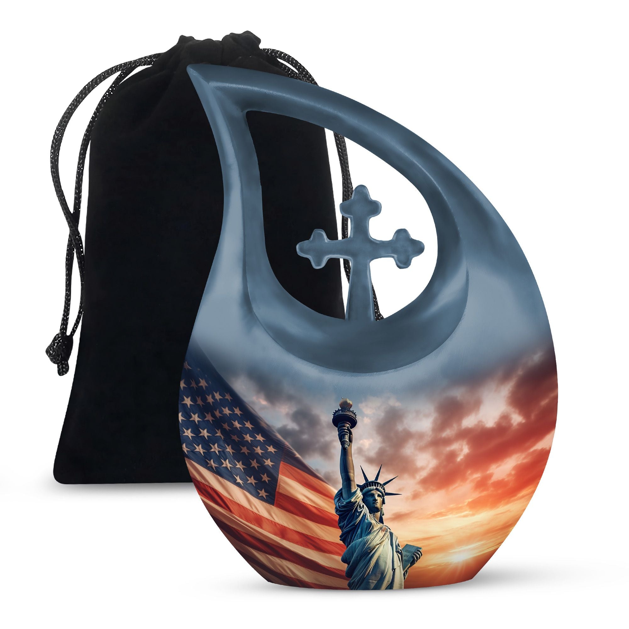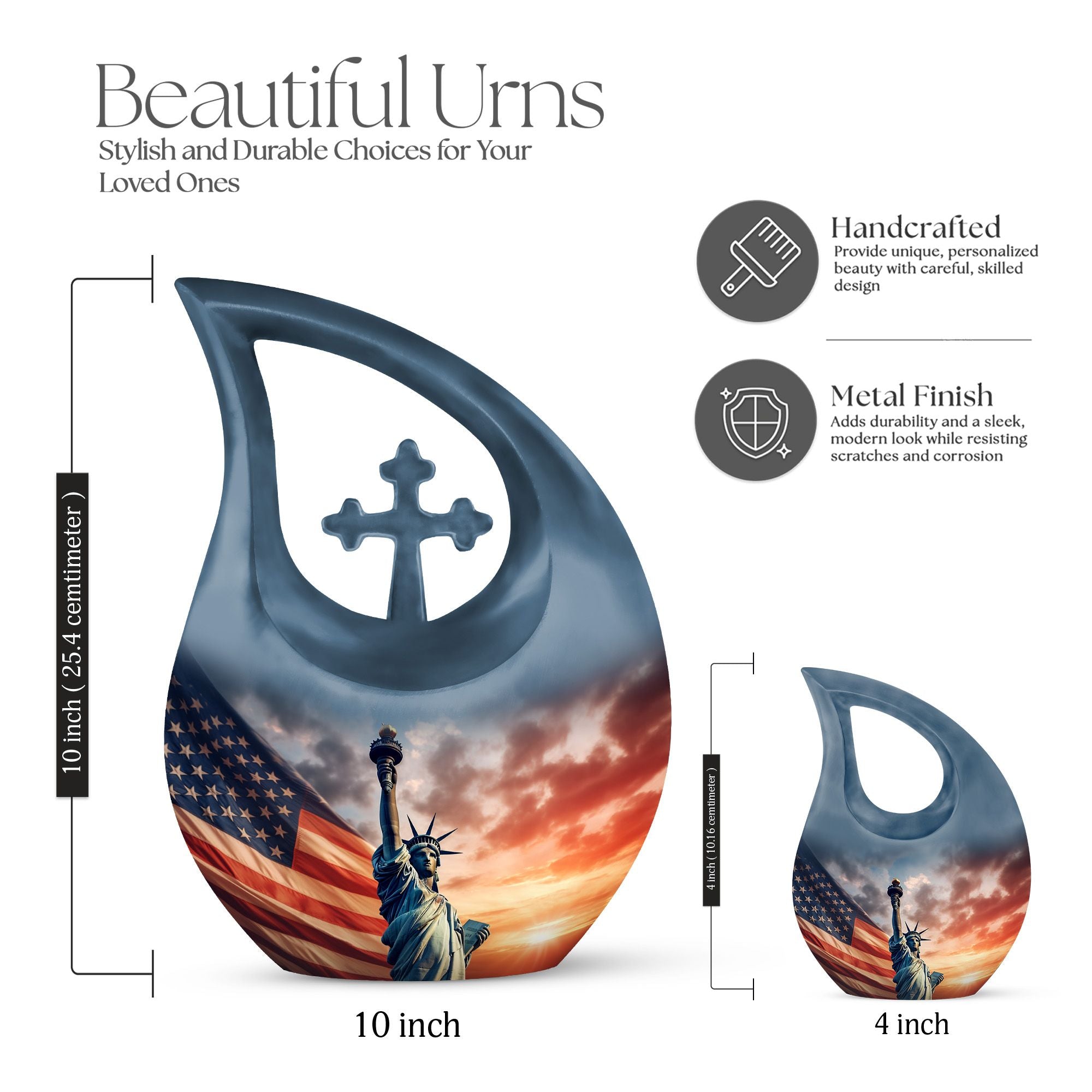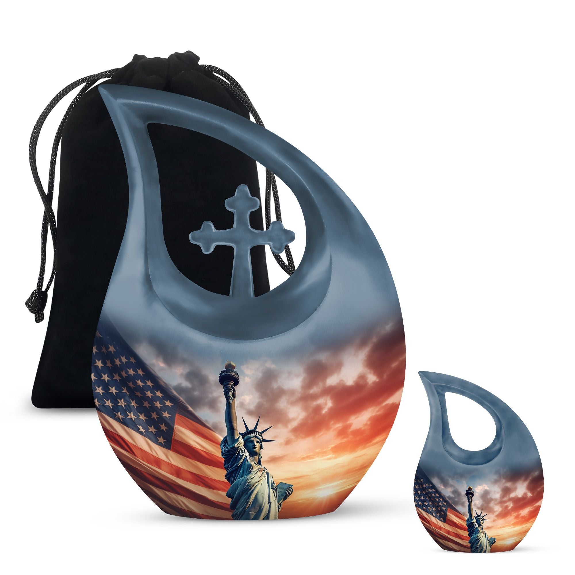 Achieve peace and solace in honoring your departed loved ones with our Statue Of Liberty Urn, an exceptional choice in the memorial urns category curated specifically for adults and seniors. A testament to the enduring symbol of freedom, this unique 10-inch Double Urns For Ashes set is carefully fashioned from premium aluminium. Featuring a distinct 'Cross Drop' motif, the urns add an extra layer of reverence to your memorial. These generously sized urns, weighing just 3.3 pounds for easy handling, can hold up to 200 cubic inches of ashes each. Our package includes an elegant velvet pouch for the secure containment of ashes. Add a personal touch by customizing with engraved names, truly embodying an unbreakable bond. Explore our diverse range of large urns, cremation boxes, and other customized urns. Although part of our range of exquisite, expensive urns, this product represents an infinite heartfelt connection. An enduring memory of your beloved, articulated through our Memorial Ceremony Supplies.