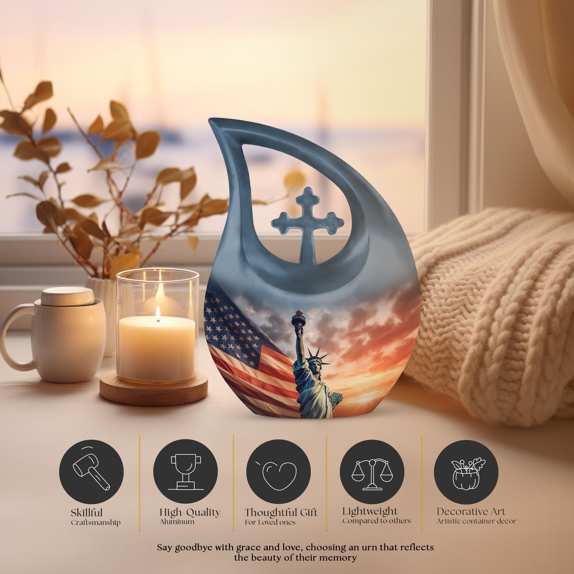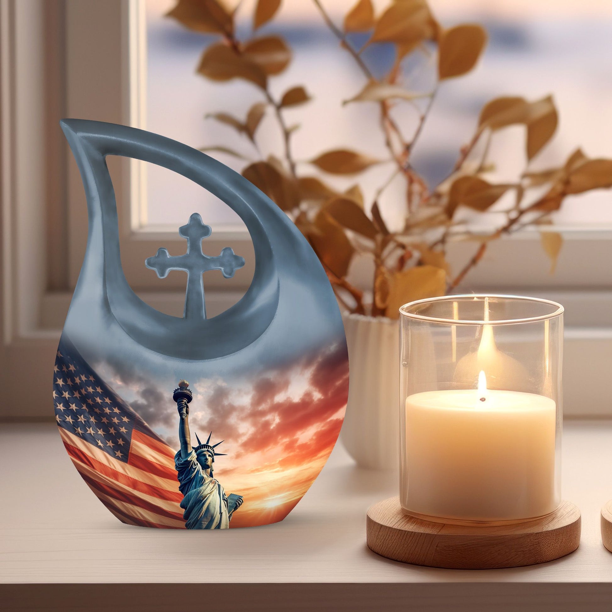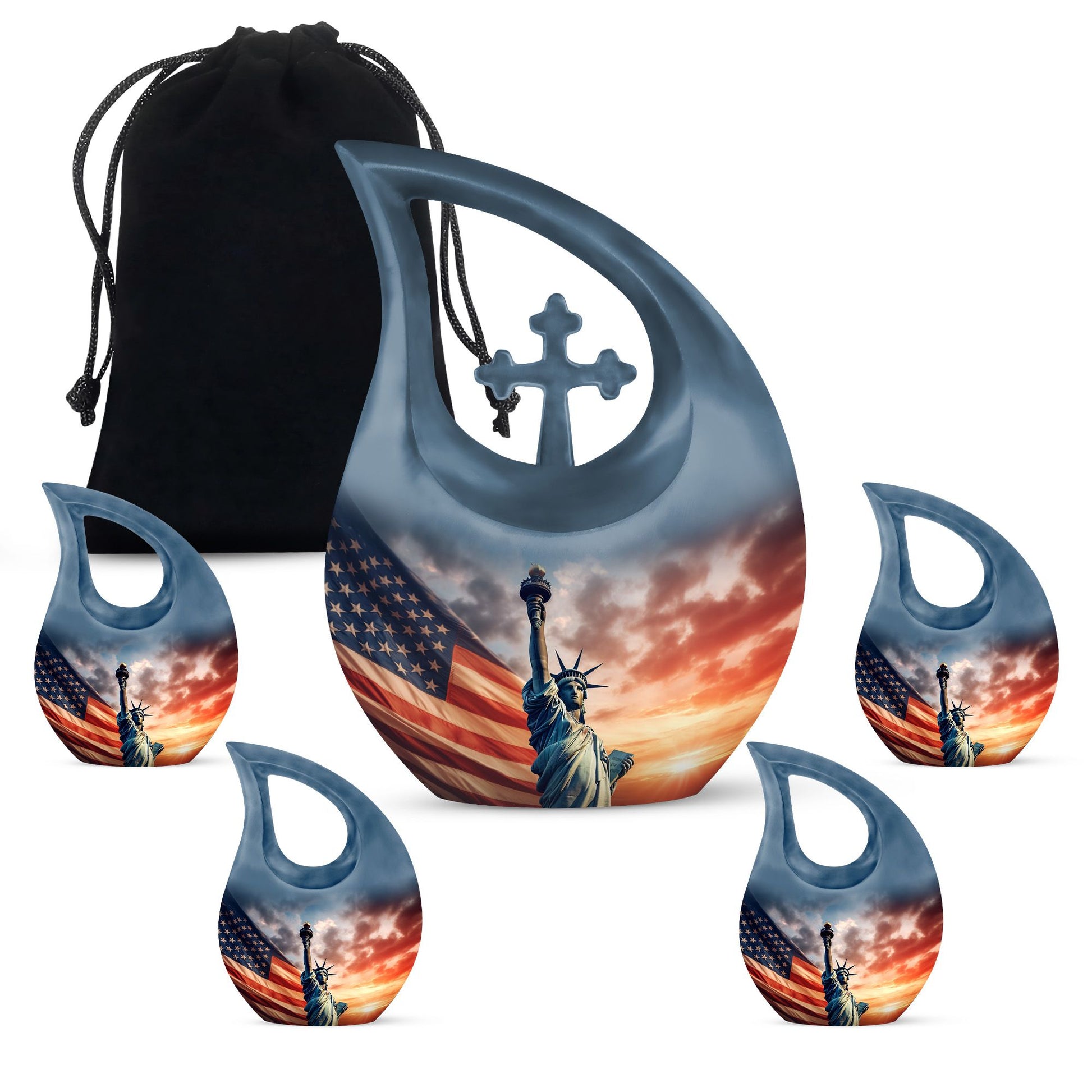 Achieve peace and solace in honoring your departed loved ones with our Statue Of Liberty Urn, an exceptional choice in the memorial urns category curated specifically for adults and seniors. A testament to the enduring symbol of freedom, this unique 10-inch Double Urns For Ashes set is carefully fashioned from premium aluminium. Featuring a distinct 'Cross Drop' motif, the urns add an extra layer of reverence to your memorial. These generously sized urns, weighing just 3.3 pounds for easy handling, can hold up to 200 cubic inches of ashes each. Our package includes an elegant velvet pouch for the secure containment of ashes. Add a personal touch by customizing with engraved names, truly embodying an unbreakable bond. Explore our diverse range of large urns, cremation boxes, and other customized urns. Although part of our range of exquisite, expensive urns, this product represents an infinite heartfelt connection. An enduring memory of your beloved, articulated through our Memorial Ceremony Supplies.