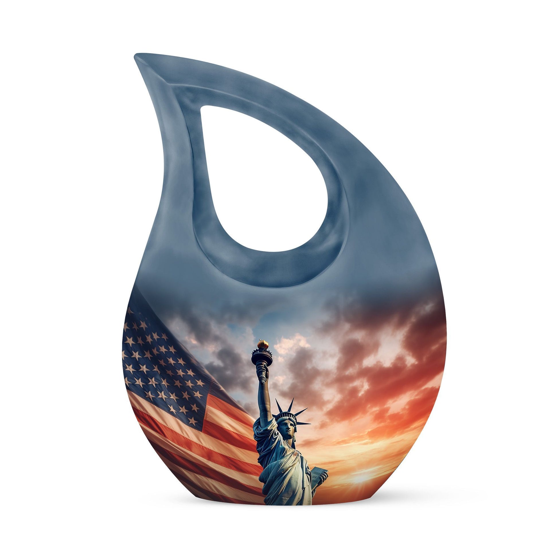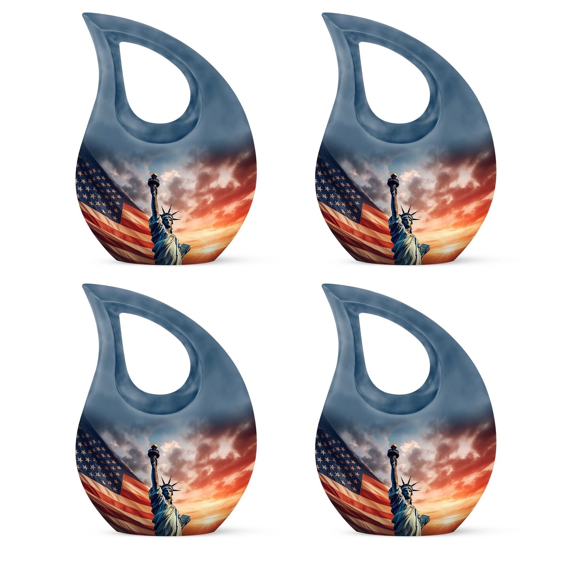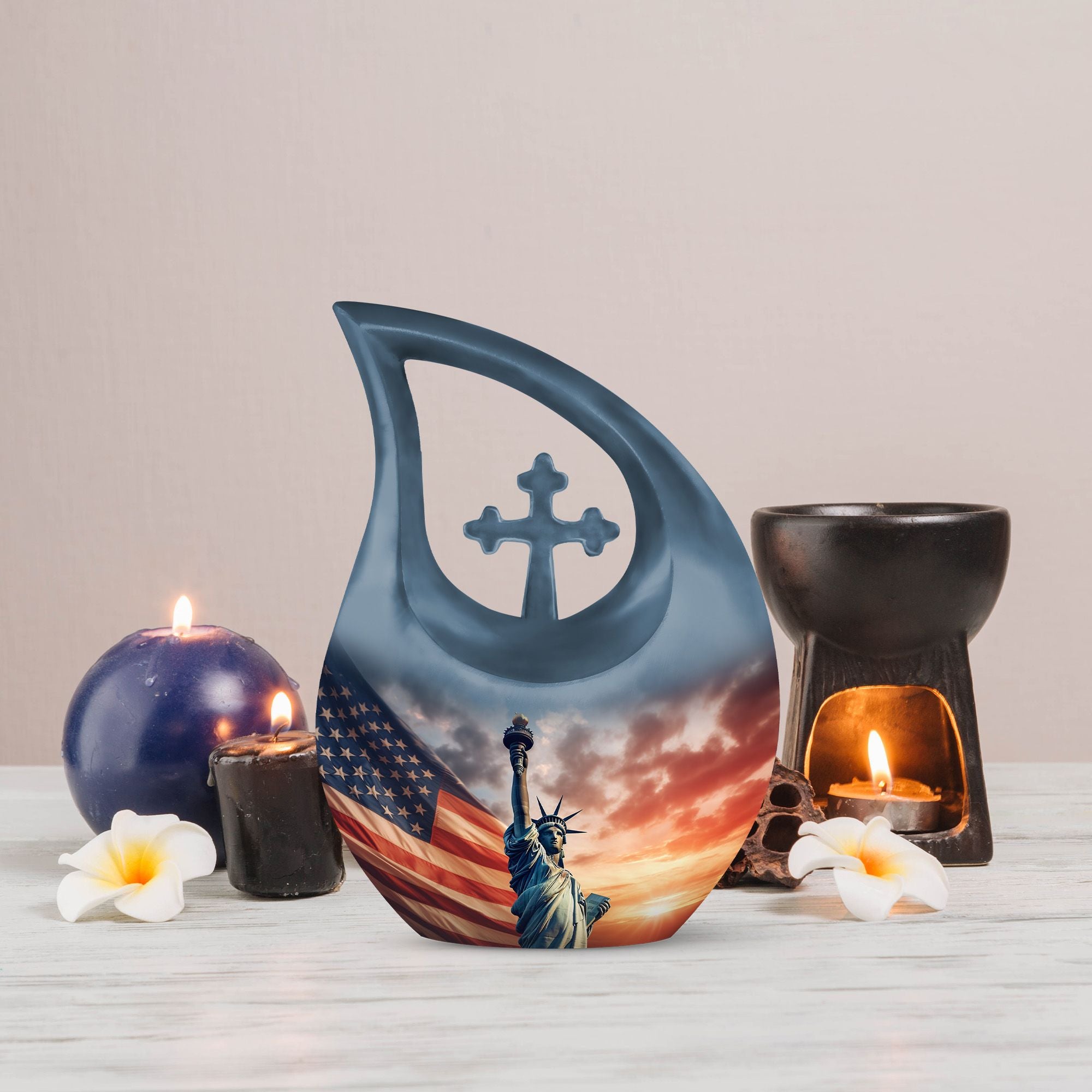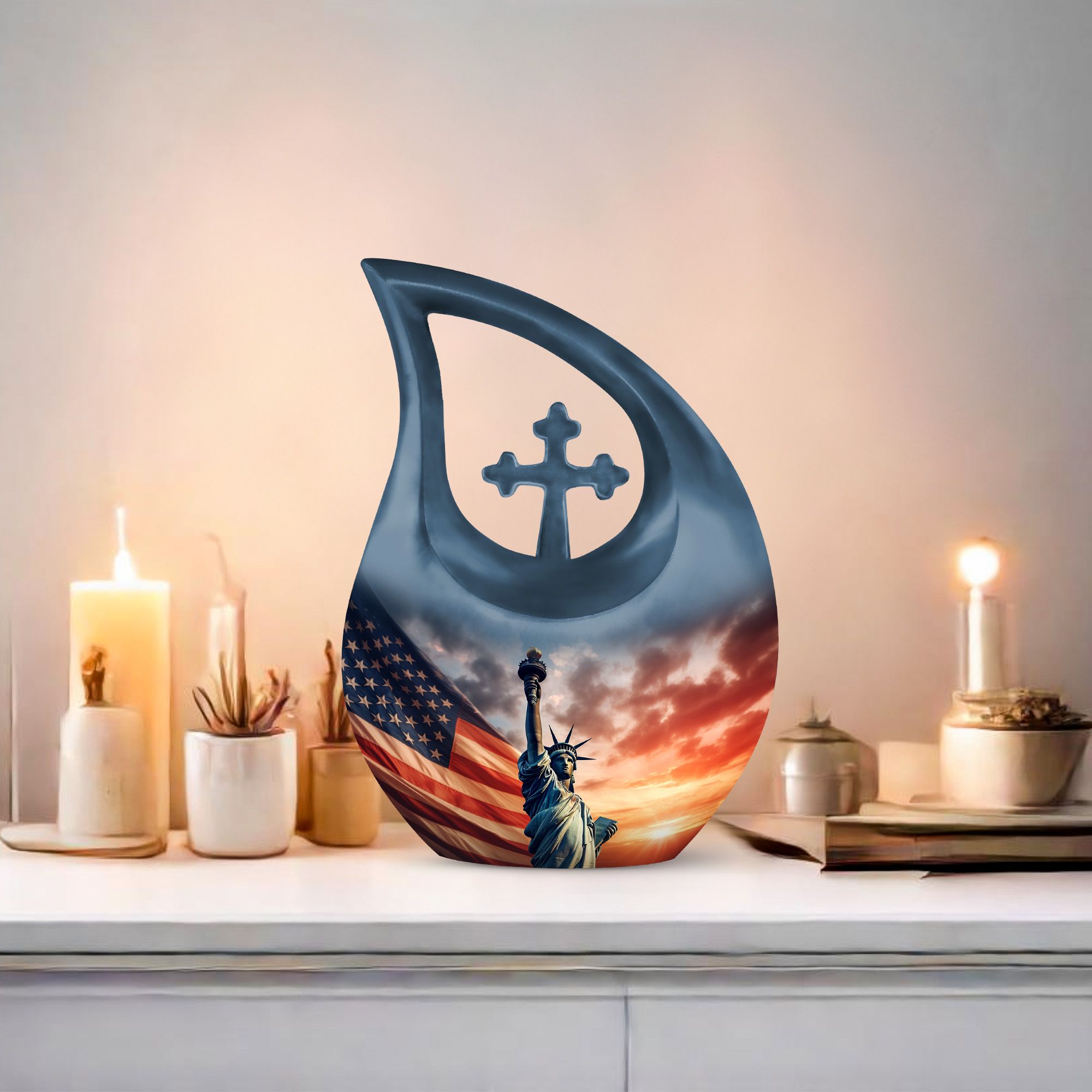 Achieve peace and solace in honoring your departed loved ones with our Statue Of Liberty Urn, an exceptional choice in the memorial urns category curated specifically for adults and seniors. A testament to the enduring symbol of freedom, this unique 10-inch Double Urns For Ashes set is carefully fashioned from premium aluminium. Featuring a distinct 'Cross Drop' motif, the urns add an extra layer of reverence to your memorial. These generously sized urns, weighing just 3.3 pounds for easy handling, can hold up to 200 cubic inches of ashes each. Our package includes an elegant velvet pouch for the secure containment of ashes. Add a personal touch by customizing with engraved names, truly embodying an unbreakable bond. Explore our diverse range of large urns, cremation boxes, and other customized urns. Although part of our range of exquisite, expensive urns, this product represents an infinite heartfelt connection. An enduring memory of your beloved, articulated through our Memorial Ceremony Supplies.