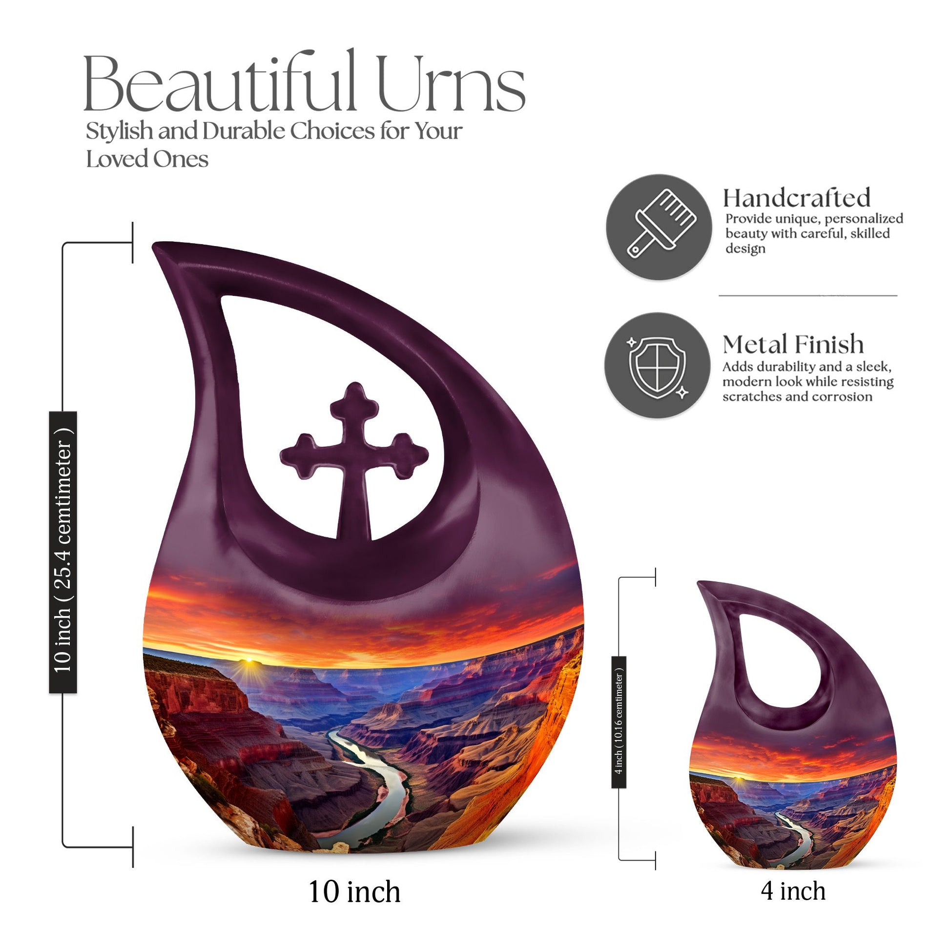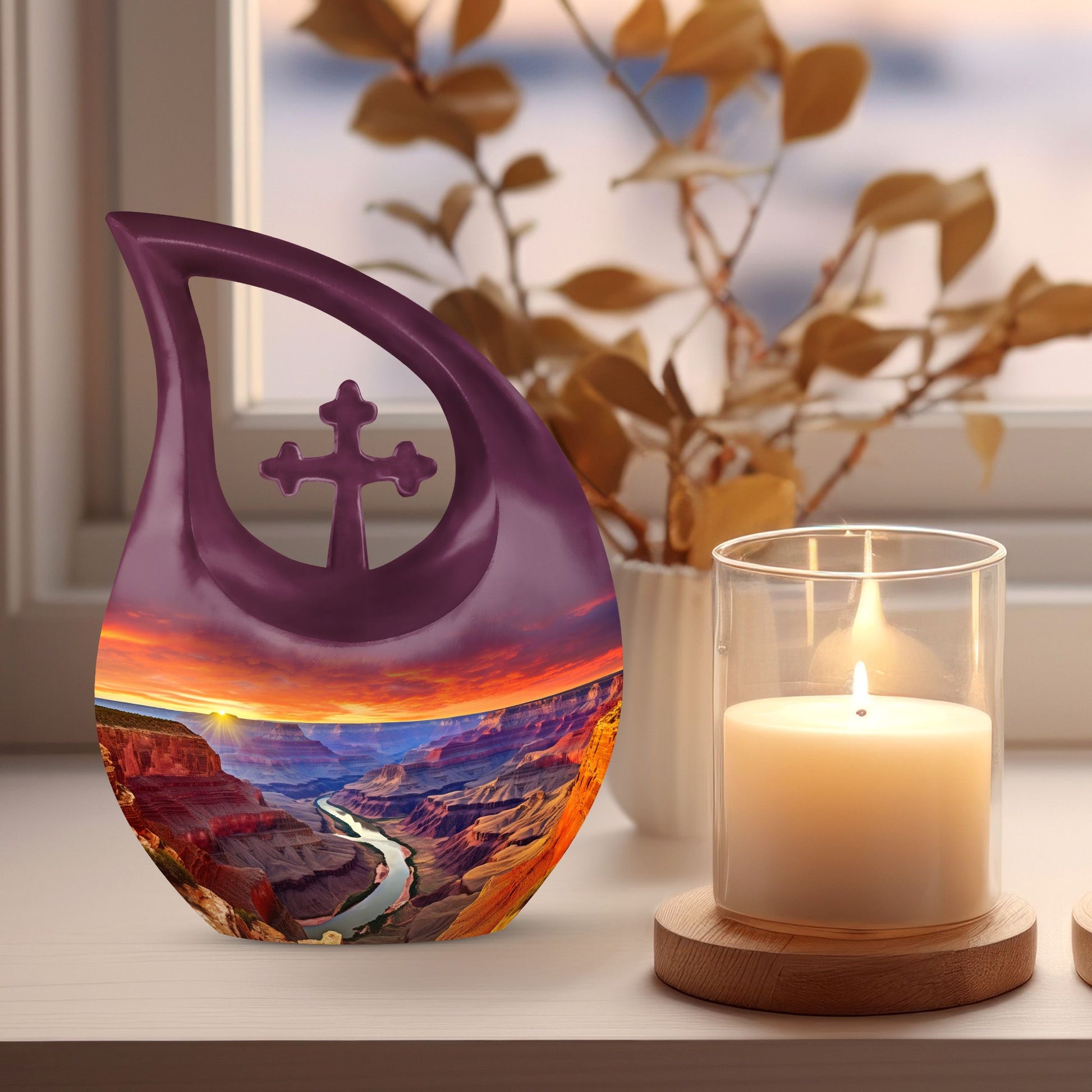 Made from high-quality aluminum, this women adult urn features soft purple hues that mirror the serene tones of a Grand Canyon sunset. The smooth finish and gentle gradient add a sense of tranquility to any setting. A secure screw-top lid ensures ashes are safely kept, while the delicate design offers timeless beauty and strength. Perfectly suited as a small urn for women, it can be used for display, burial, or as a cherished keepsake.