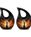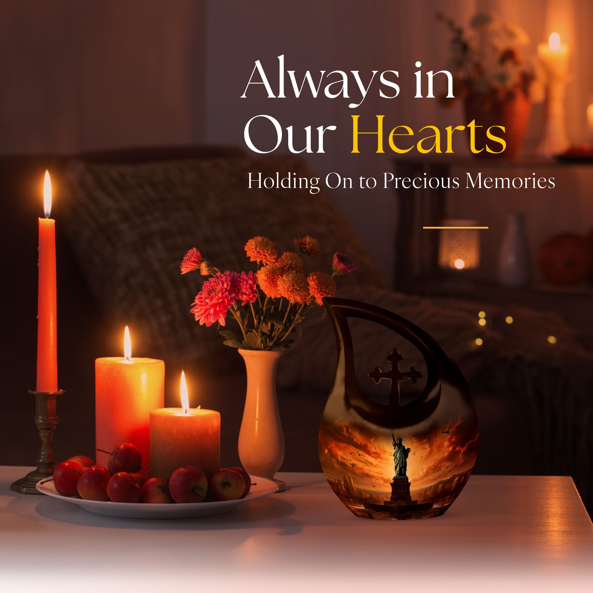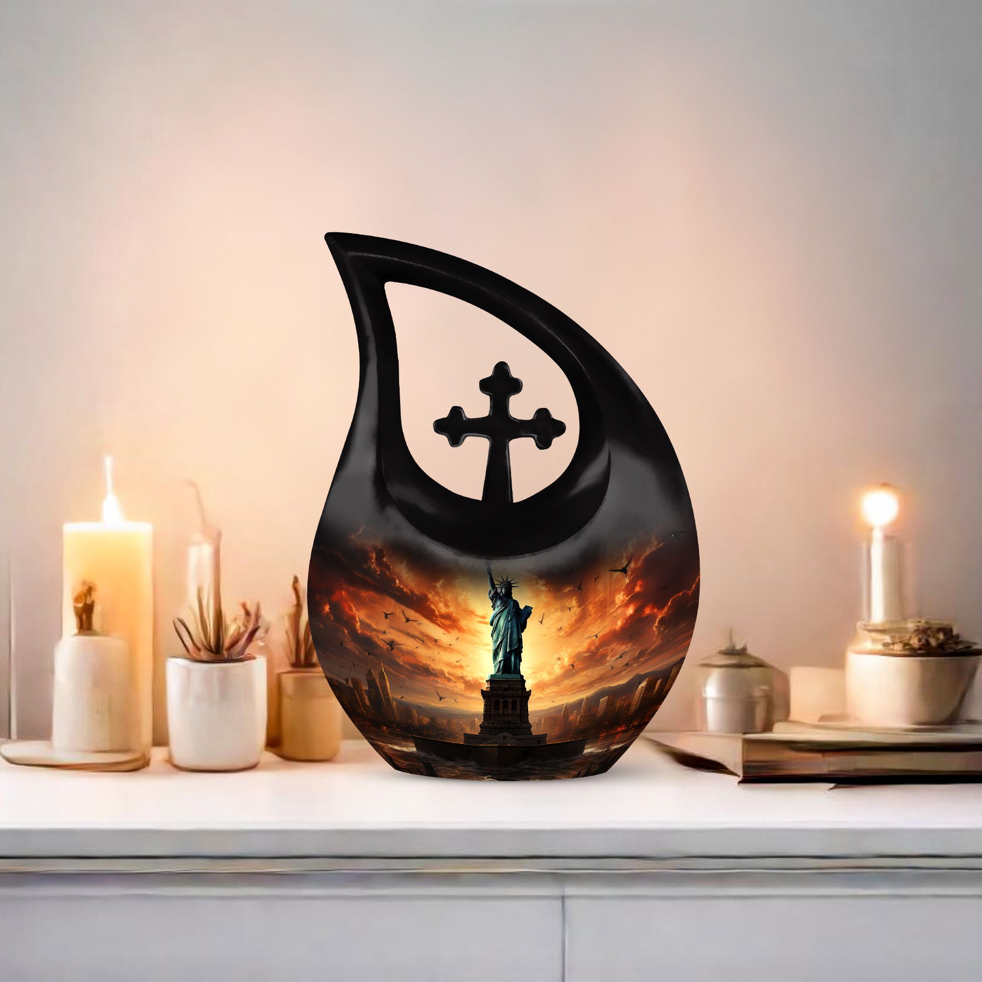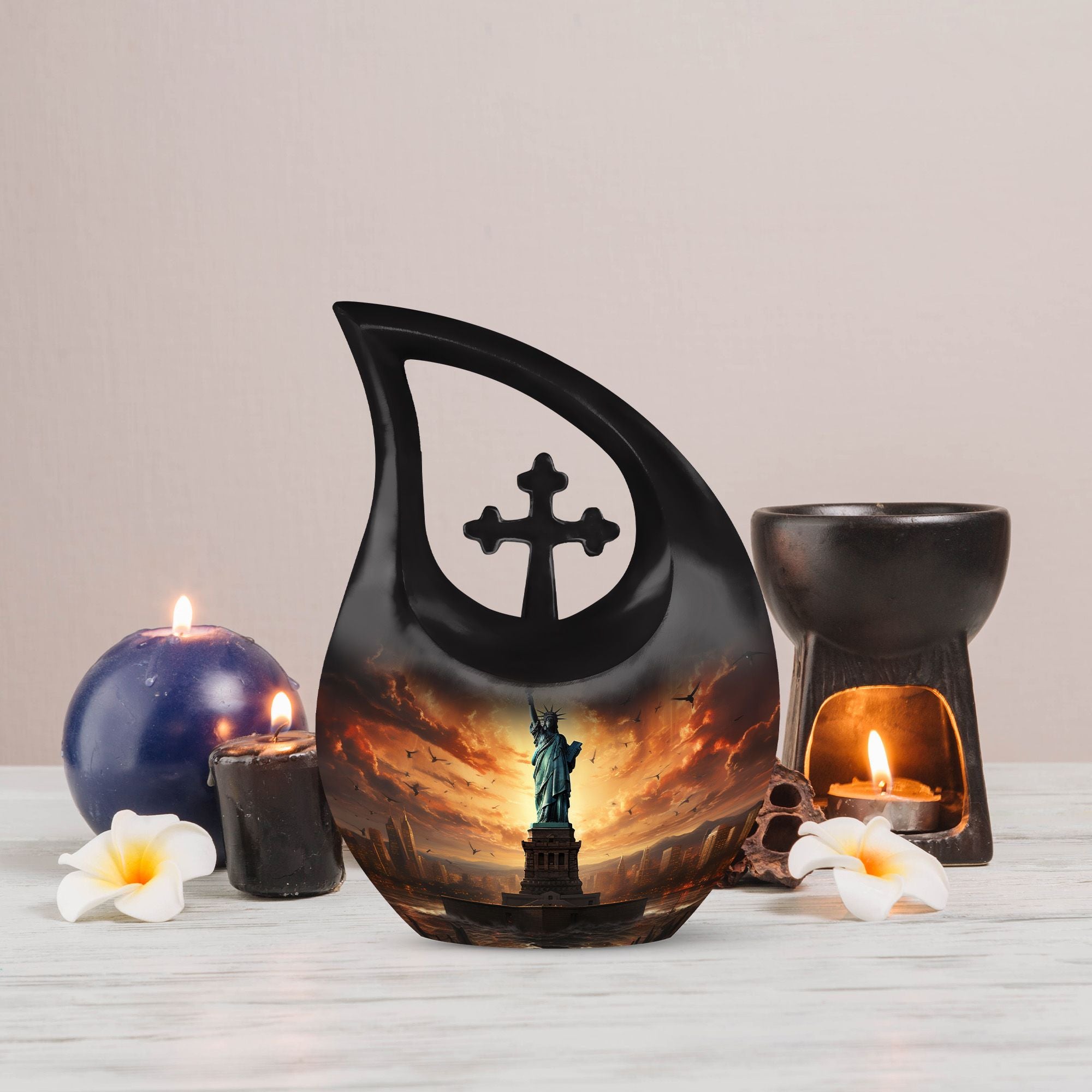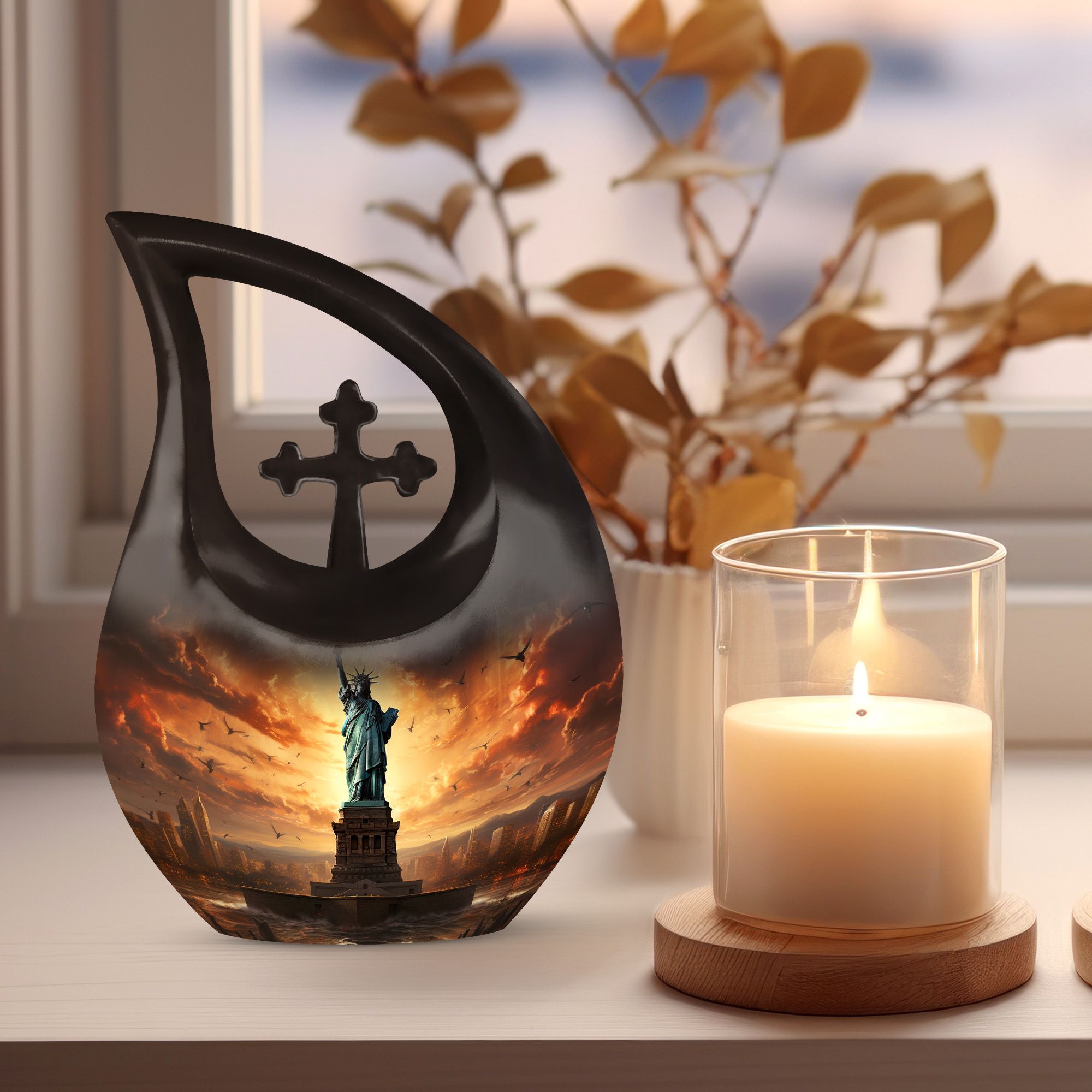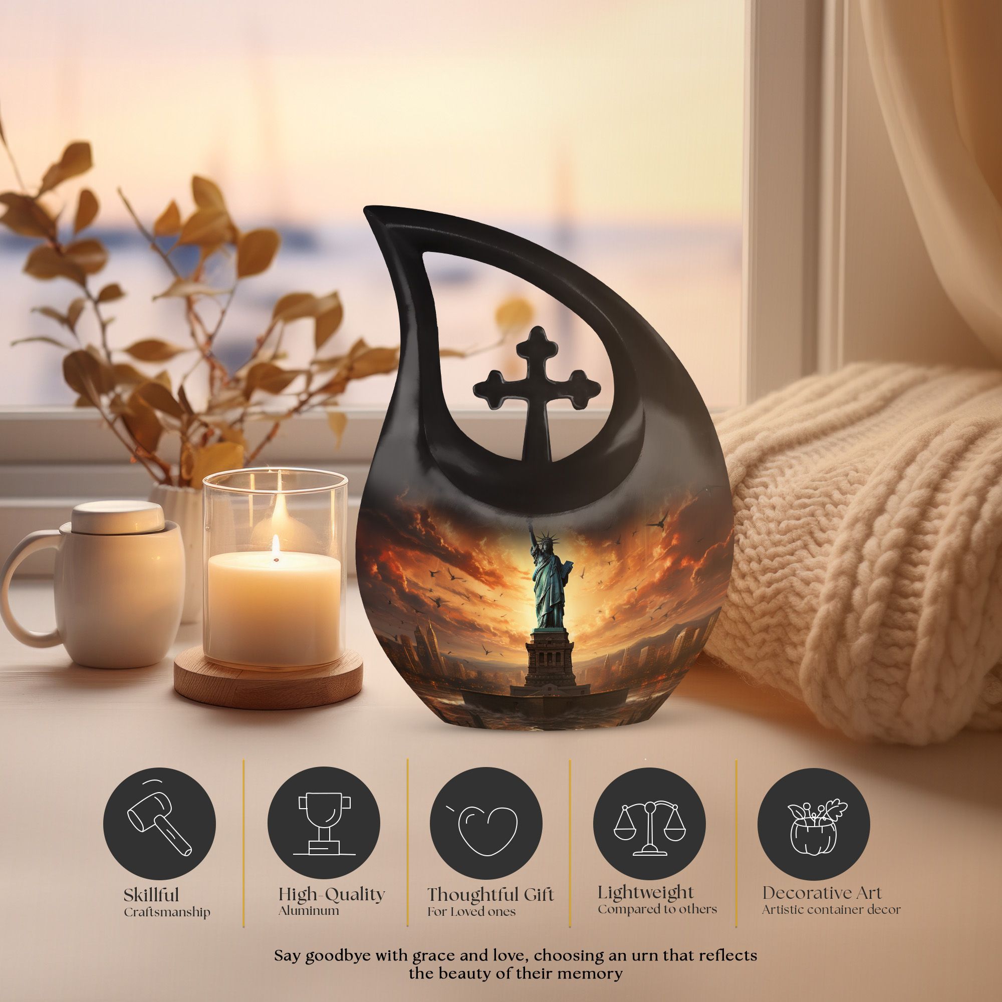 Expertly handcrafted, this urn for human ashes adult male features a breathtaking sunset design that glows with warmth, paired with the iconic Statue of Liberty as a symbol of hope and peace. Made from durable aluminum, it ensures lasting protection for your loved one’s ashes. Its secure screw-top lid and polished surface make it an elegant choice for display, burial, or as a cherished small urn for human ashes adult female keepsake.