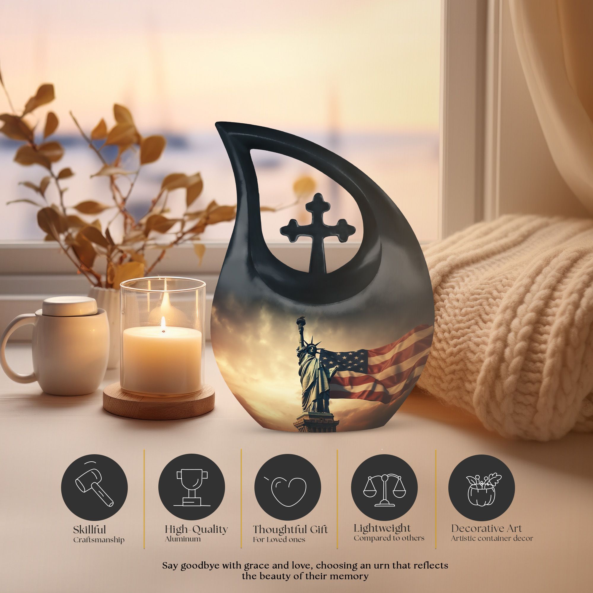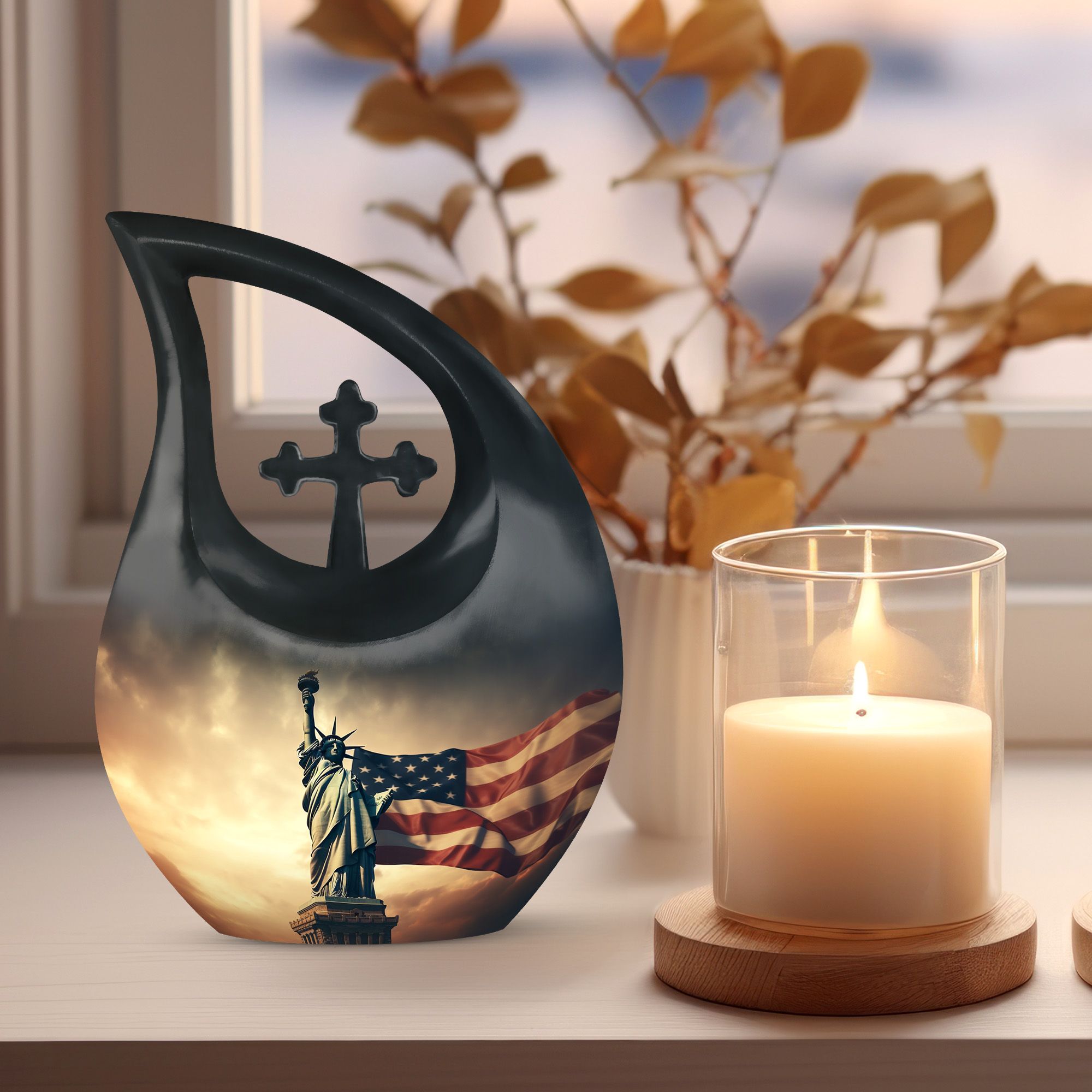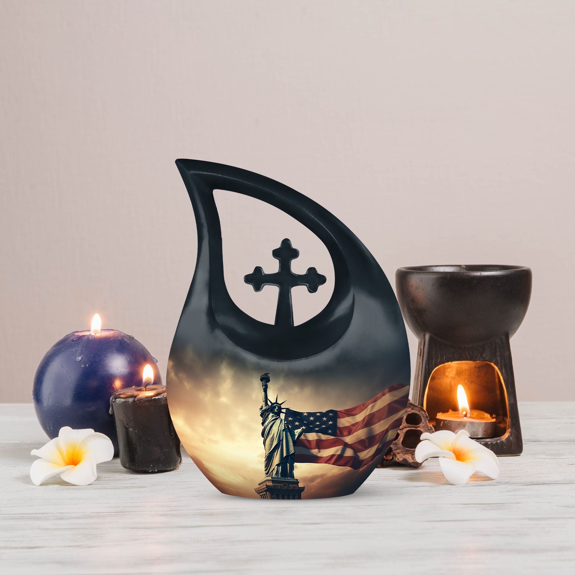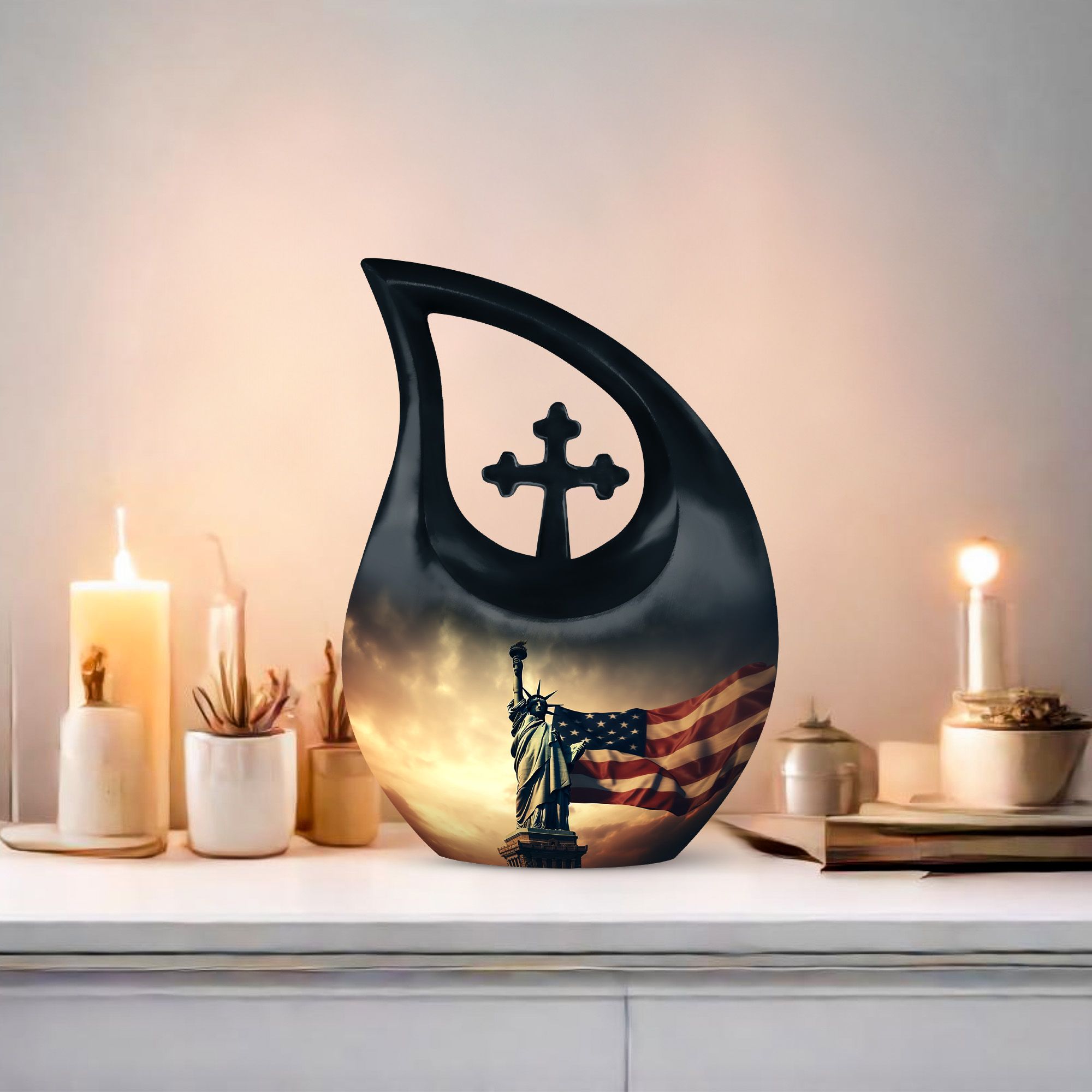 This urn adult female ashes or urn human ash adult female is perfect for honoring those who lived their life with devotion and patriotism. Its dignified appearance makes it a fitting centerpiece during funeral ceremonies or as a cherished keepsake at home.