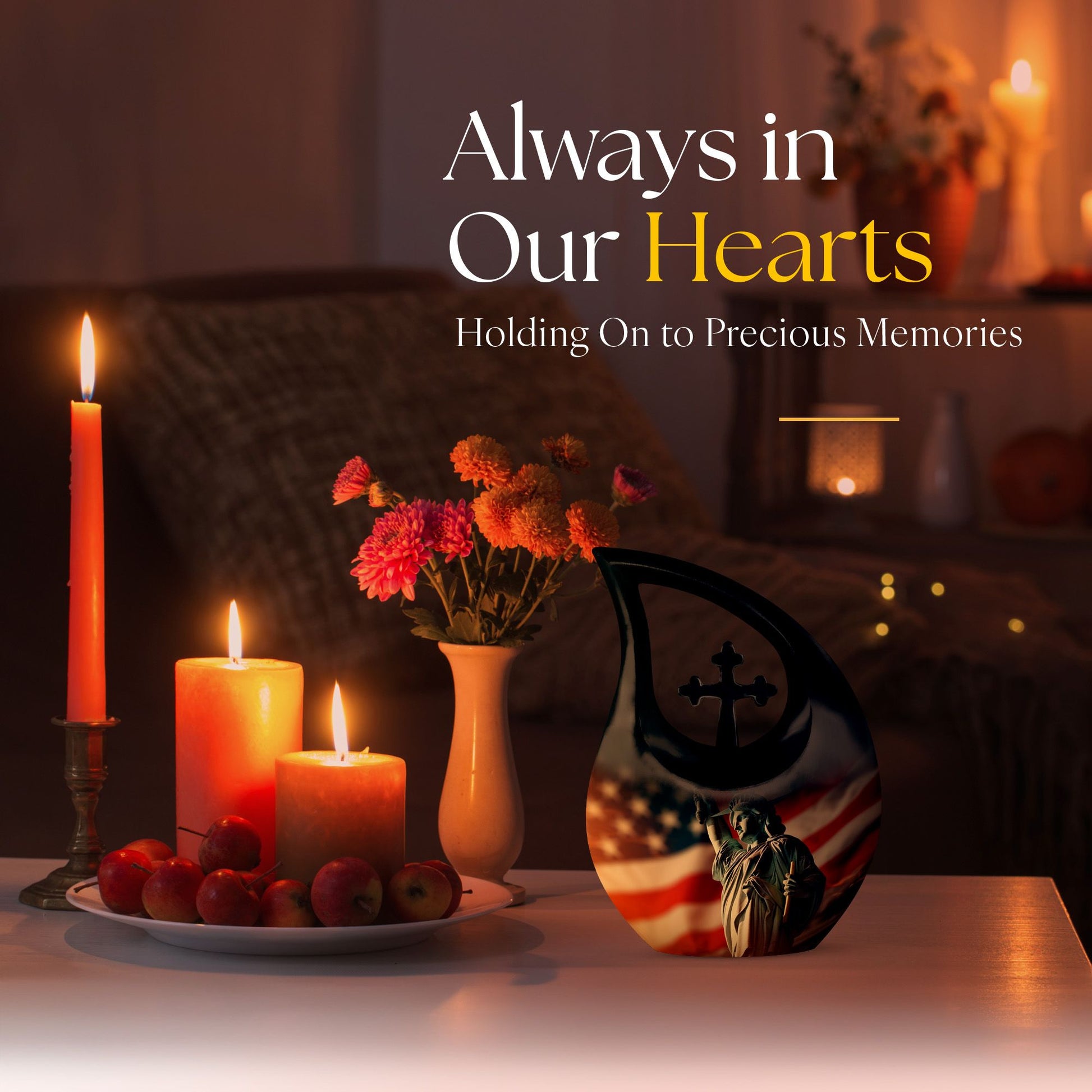 Crafted with meticulous attention to detail, this urn features a stunning hand-painted design that captures the American spirit. Its durable aluminum body ensures long-lasting strength and protection for your loved one’s ashes. Whether used as an urn for female ashes or urn ash adult female, the glossy finish and artistic pattern make it a beautiful centerpiece for remembrance. Ideal for those who lived with honor, patriotism, and love, this large urn for female & male is suitable for display at home or a memorial service.