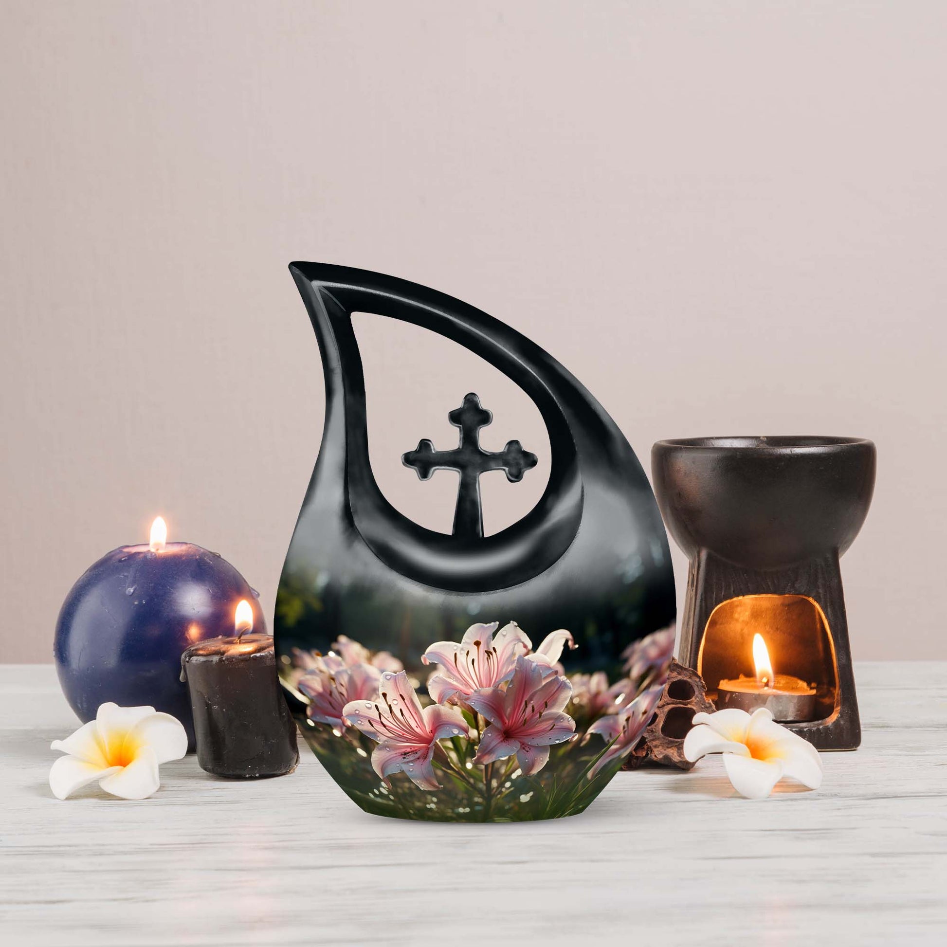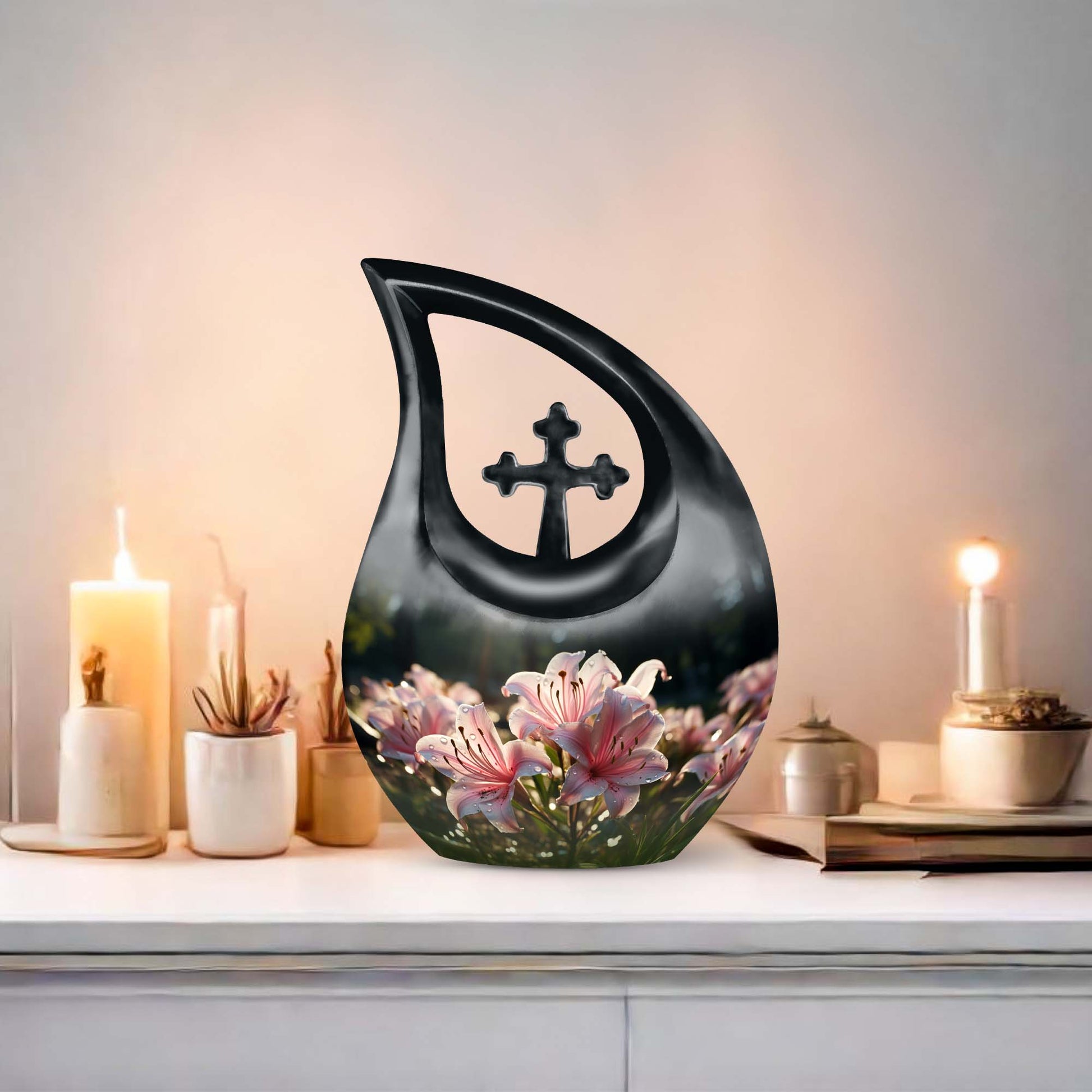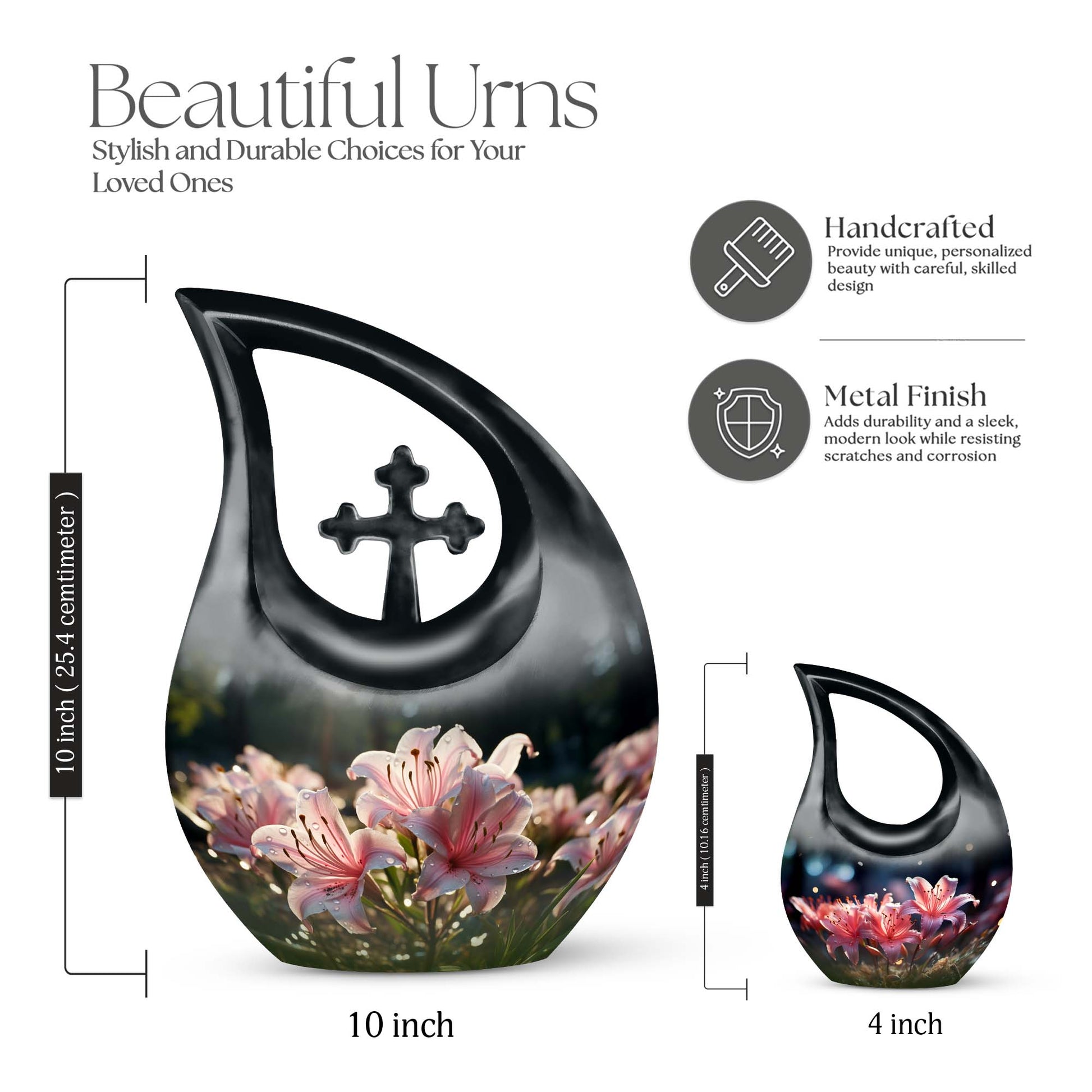 Handcrafted from durable, high-quality aluminum, this large decorative urn for human ashes blends artistry with strength. Its graceful black teardrop silhouette is adorned with vibrant pink lilies surrounding a soft cross motif — a stunning symbol of remembrance and hope. Whether chosen as a cremation urn for women or as part of a memorial for men, this urn provides both dignity and visual beauty. The threaded screw-top lid ensures ashes remain securely preserved, offering comfort and assurance for years to come.