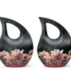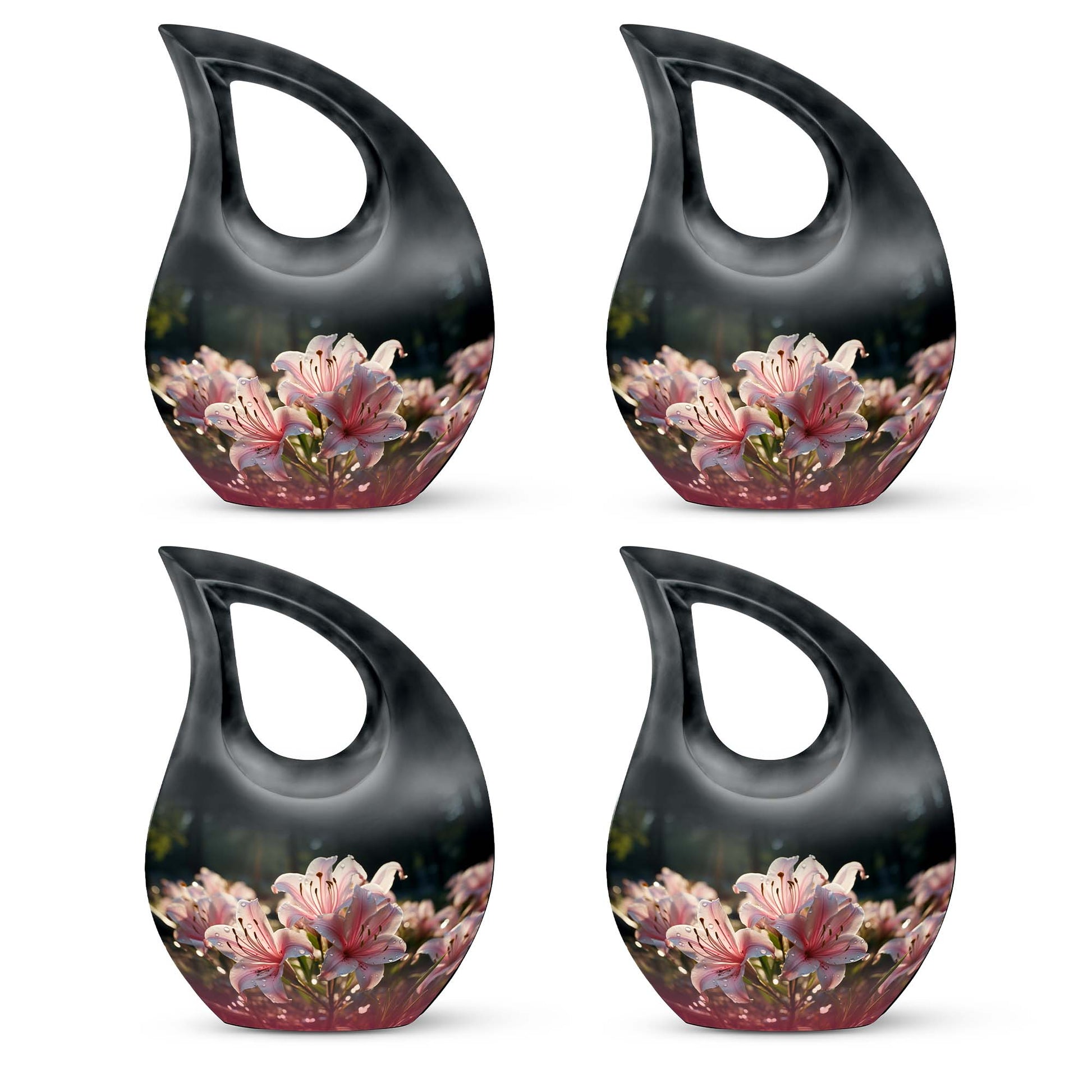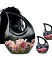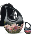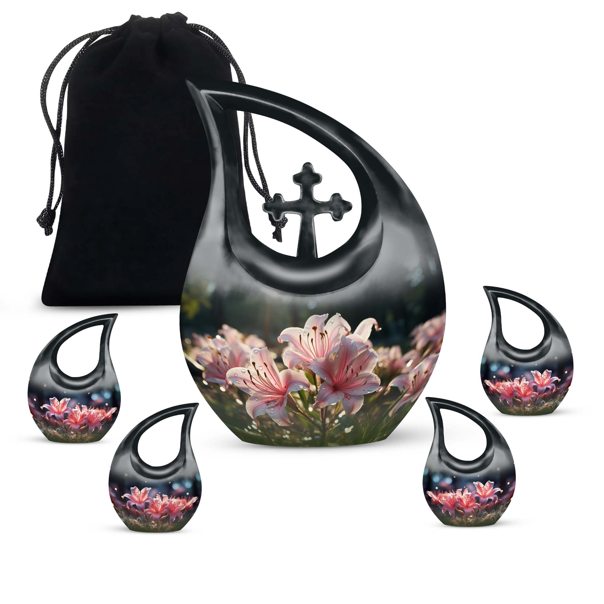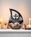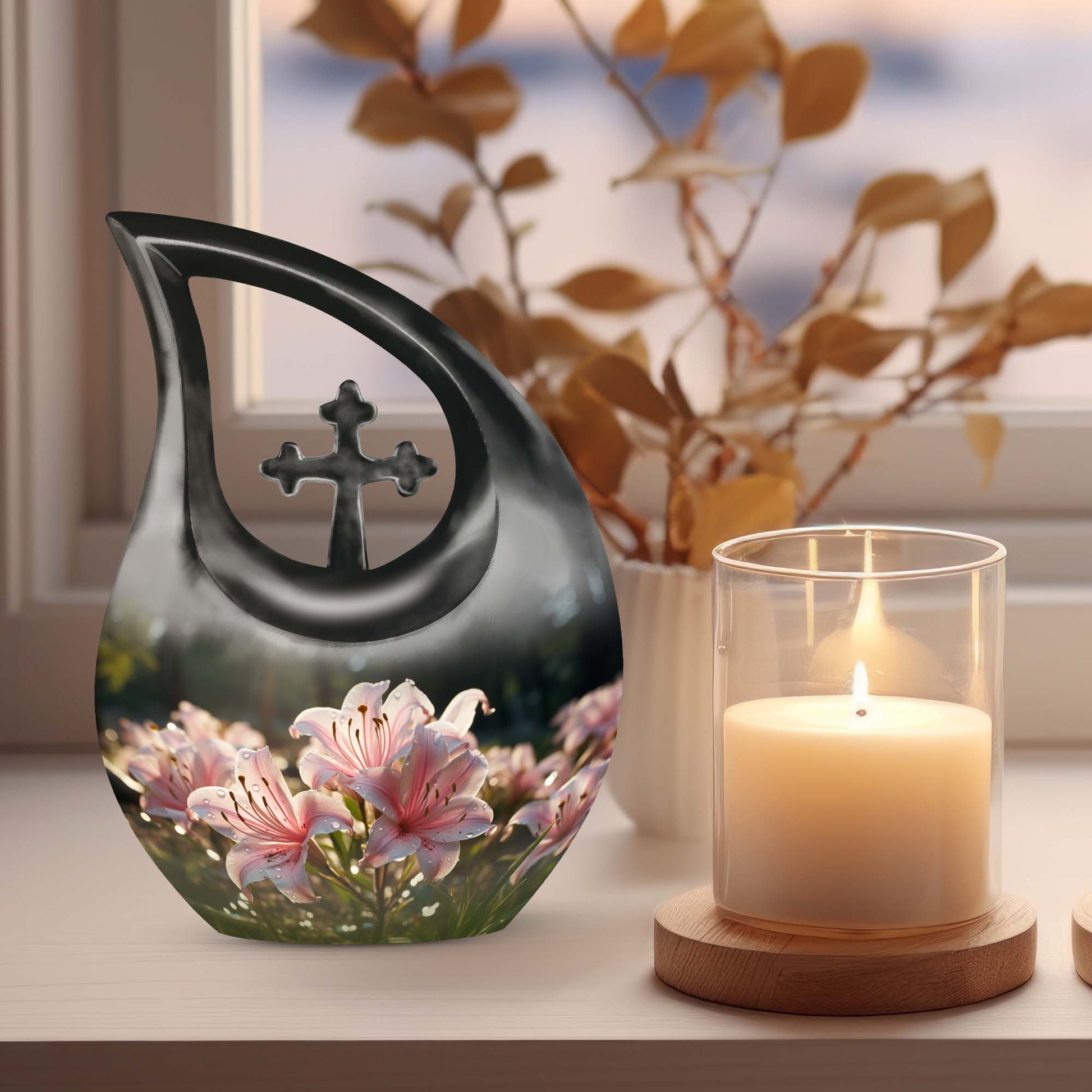 Handcrafted from durable, high-quality aluminum, this large decorative urn for human ashes blends artistry with strength. Its graceful black teardrop silhouette is adorned with vibrant pink lilies surrounding a soft cross motif — a stunning symbol of remembrance and hope. Whether chosen as a cremation urn for women or as part of a memorial for men, this urn provides both dignity and visual beauty. The threaded screw-top lid ensures ashes remain securely preserved, offering comfort and assurance for years to come.