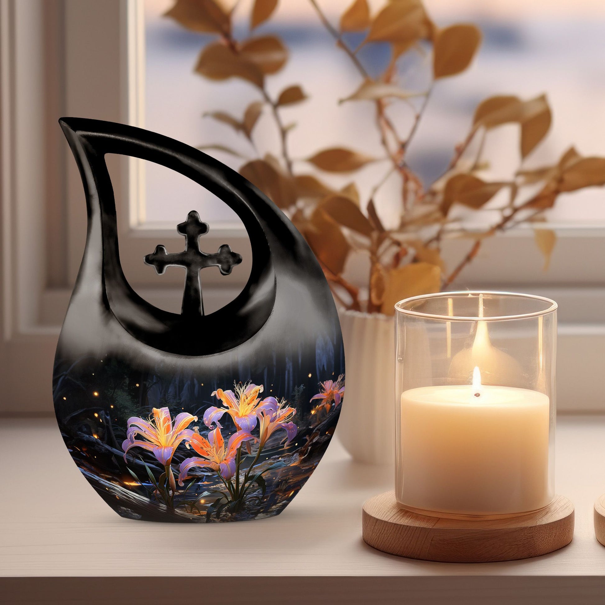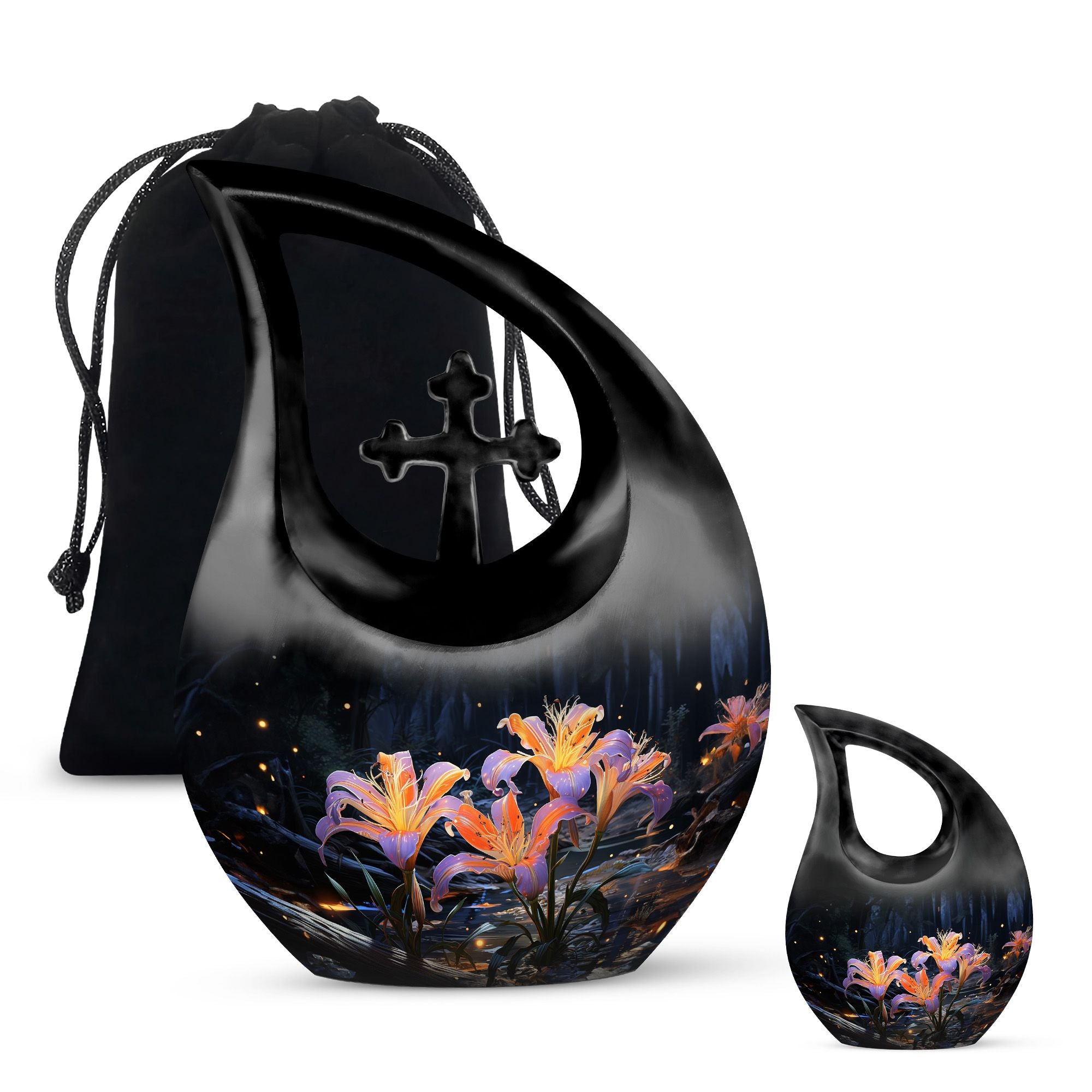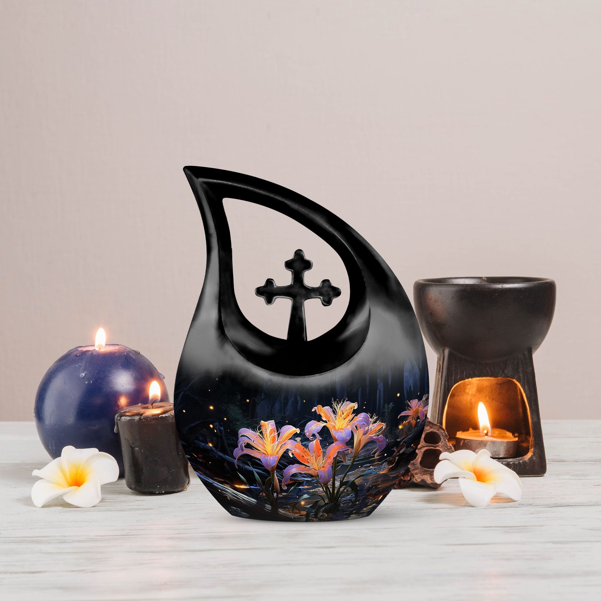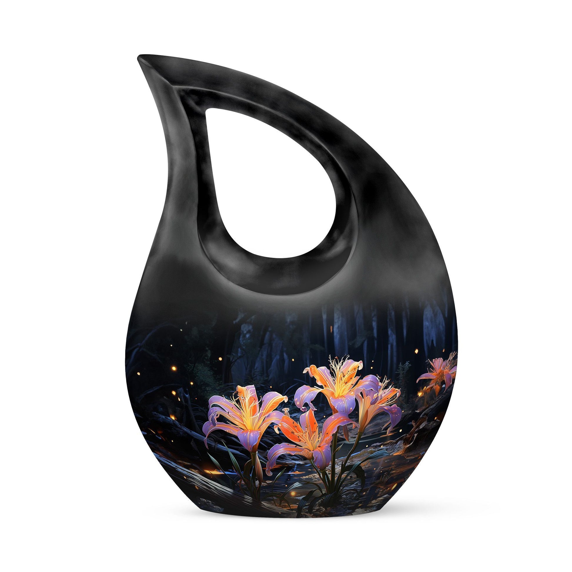 A radiant symbol of faith and renewal, this black teardrop funeral urn reminds us that love, like the lilies it bears, continues to bloom beautifully beyond the bounds of time.