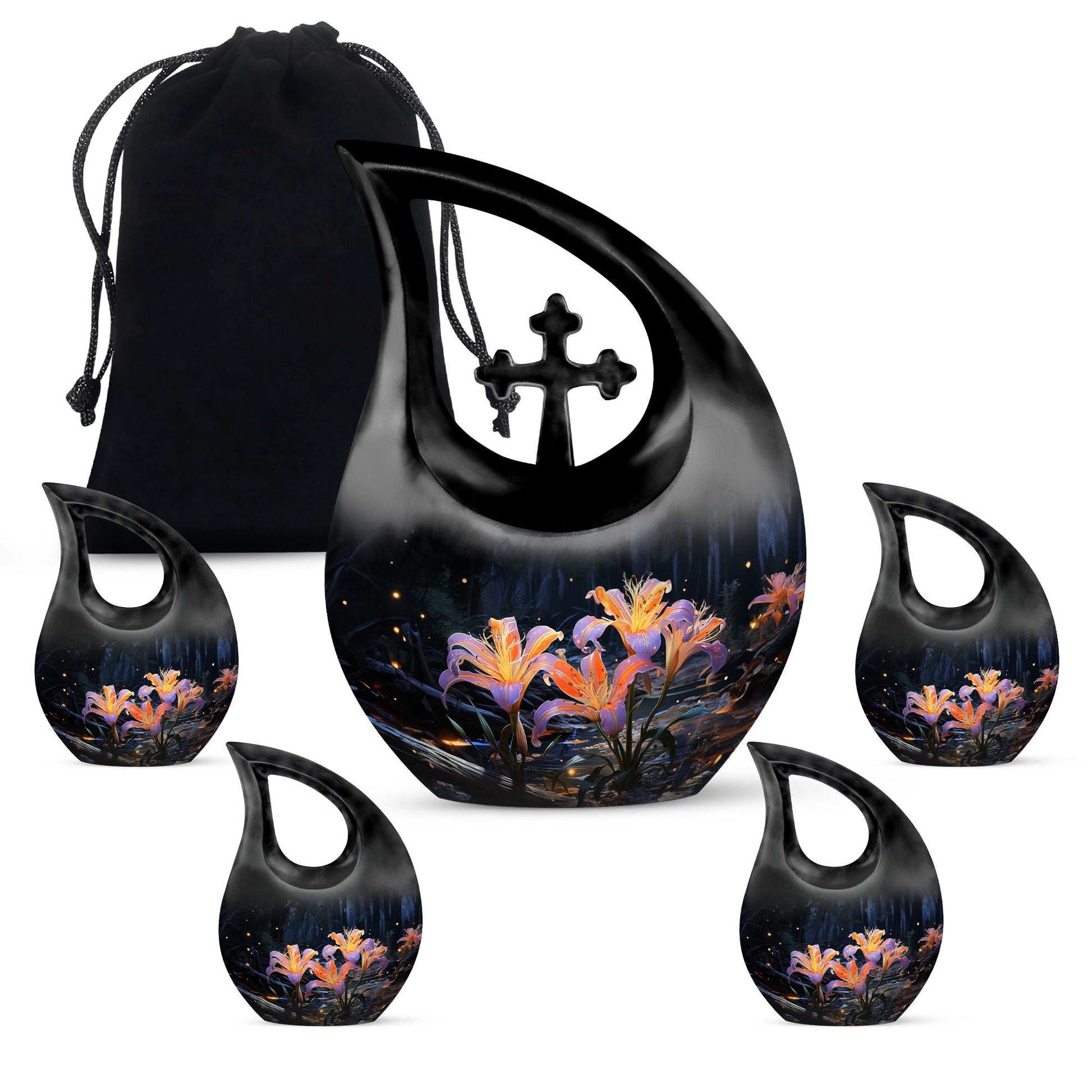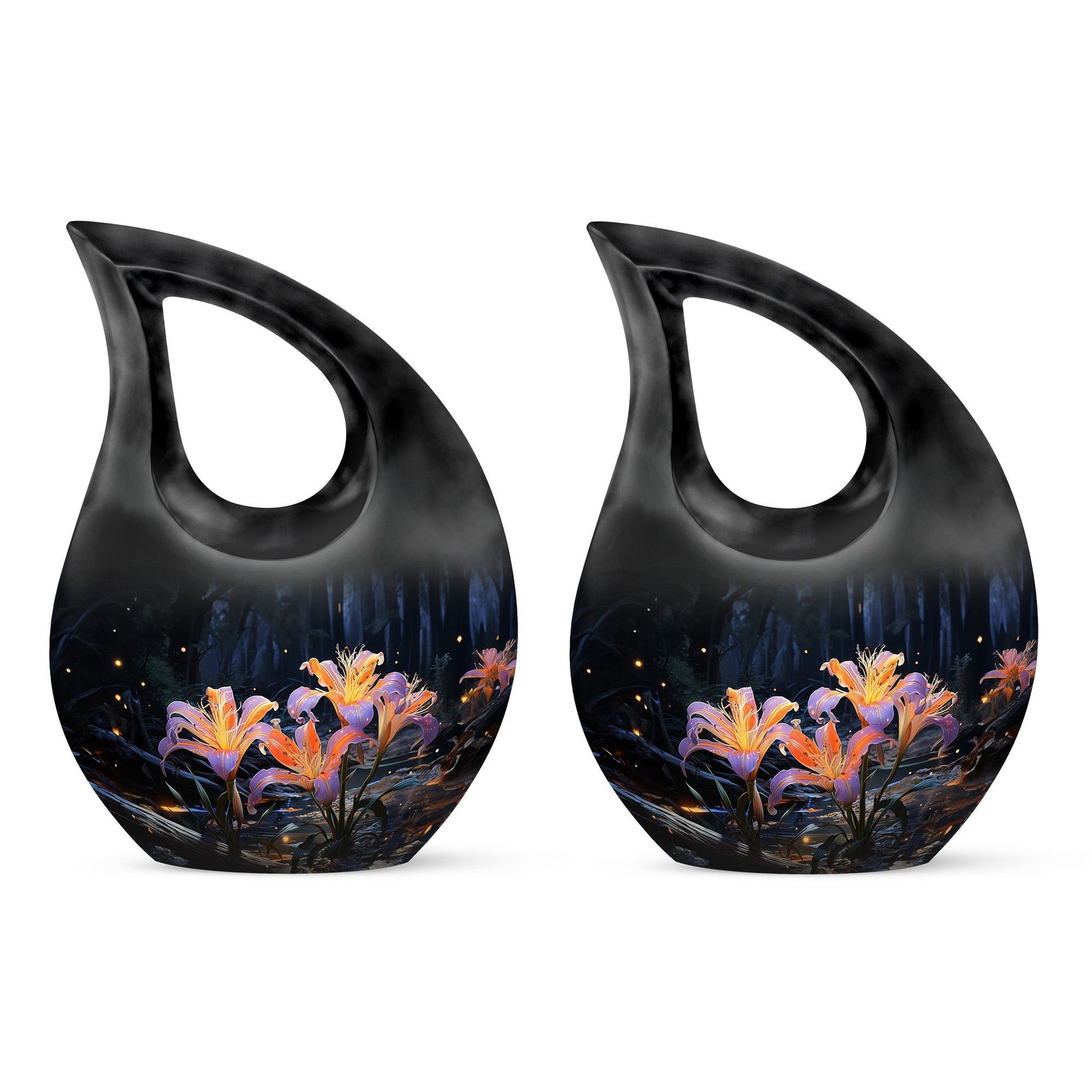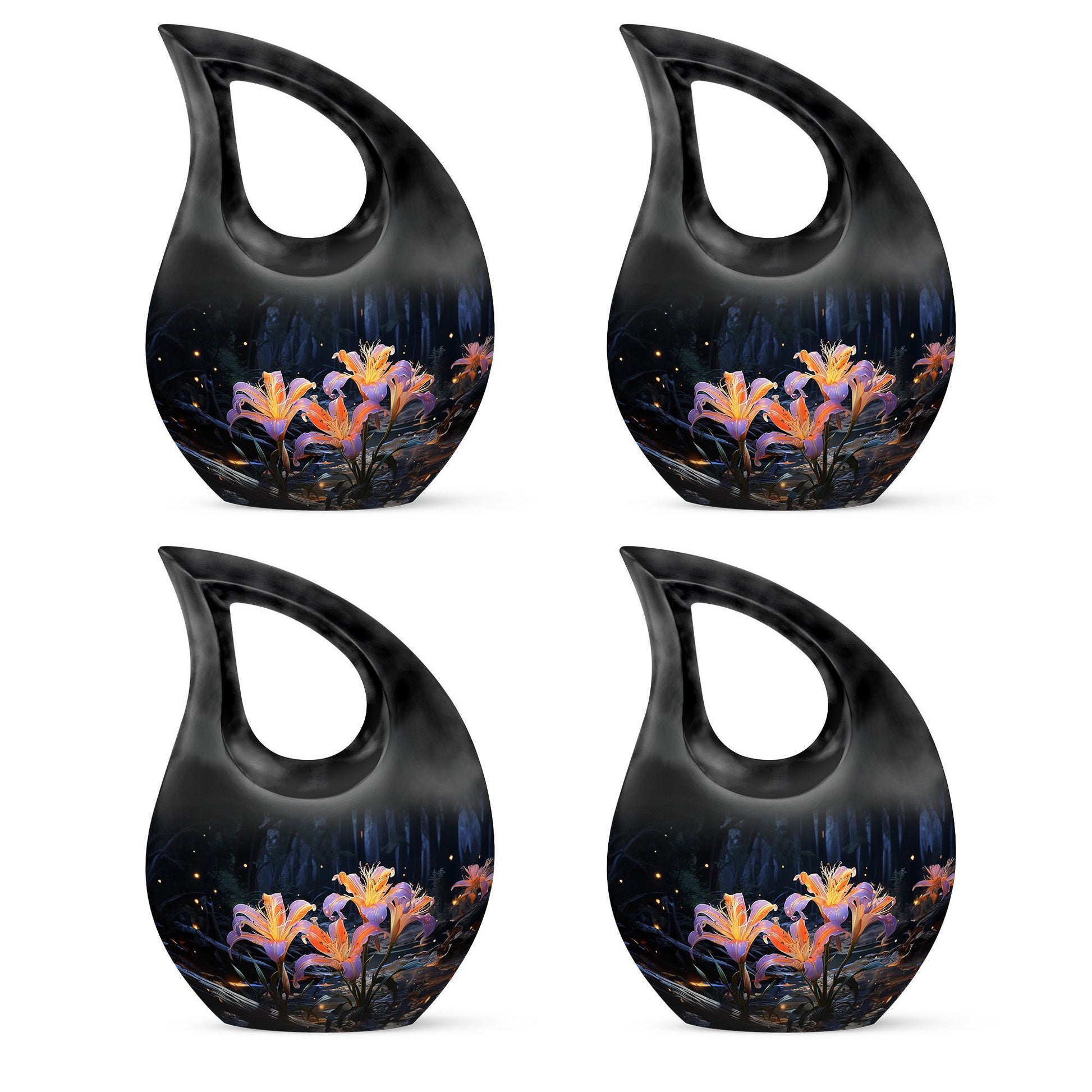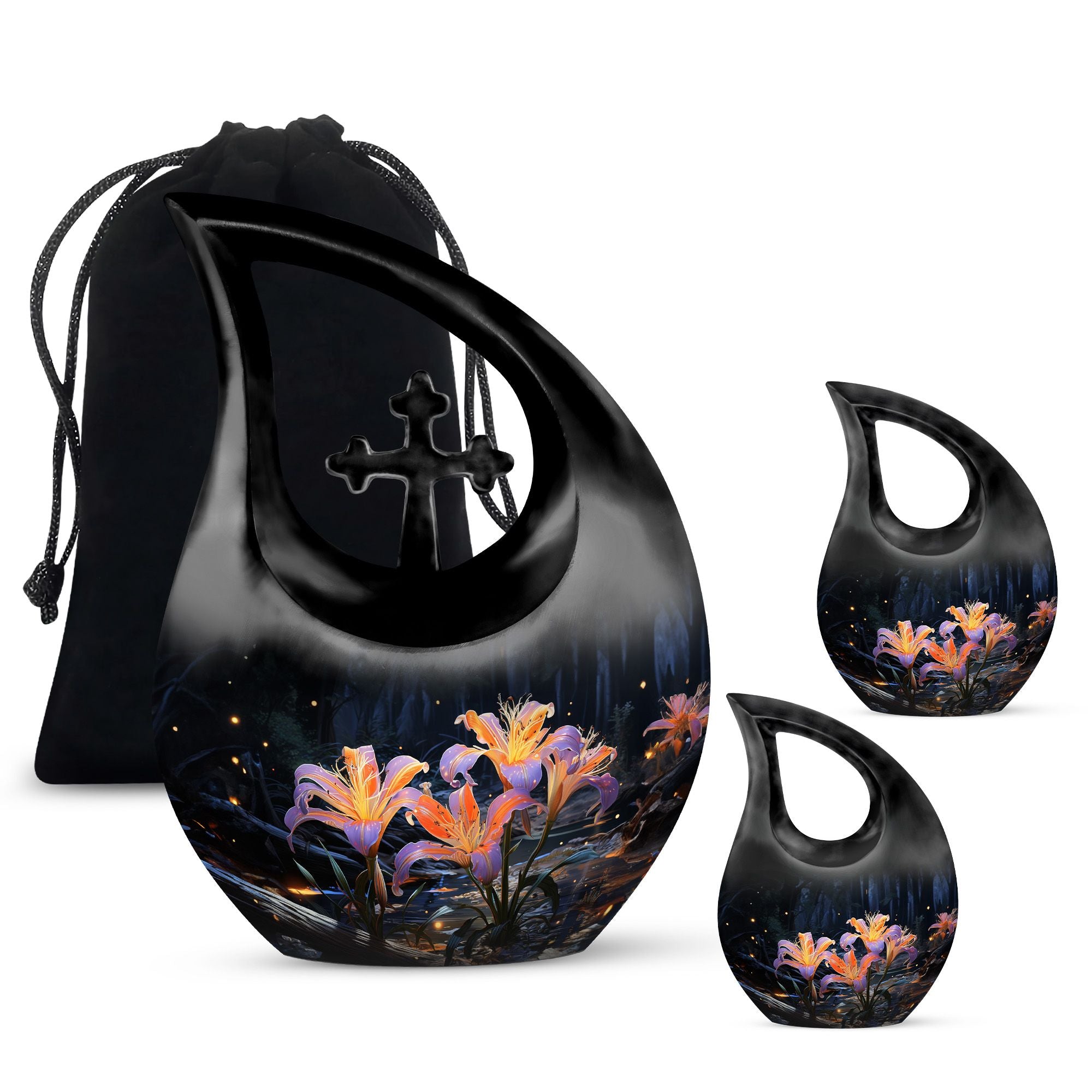 A radiant symbol of faith and renewal, this black teardrop funeral urn reminds us that love, like the lilies it bears, continues to bloom beautifully beyond the bounds of time.