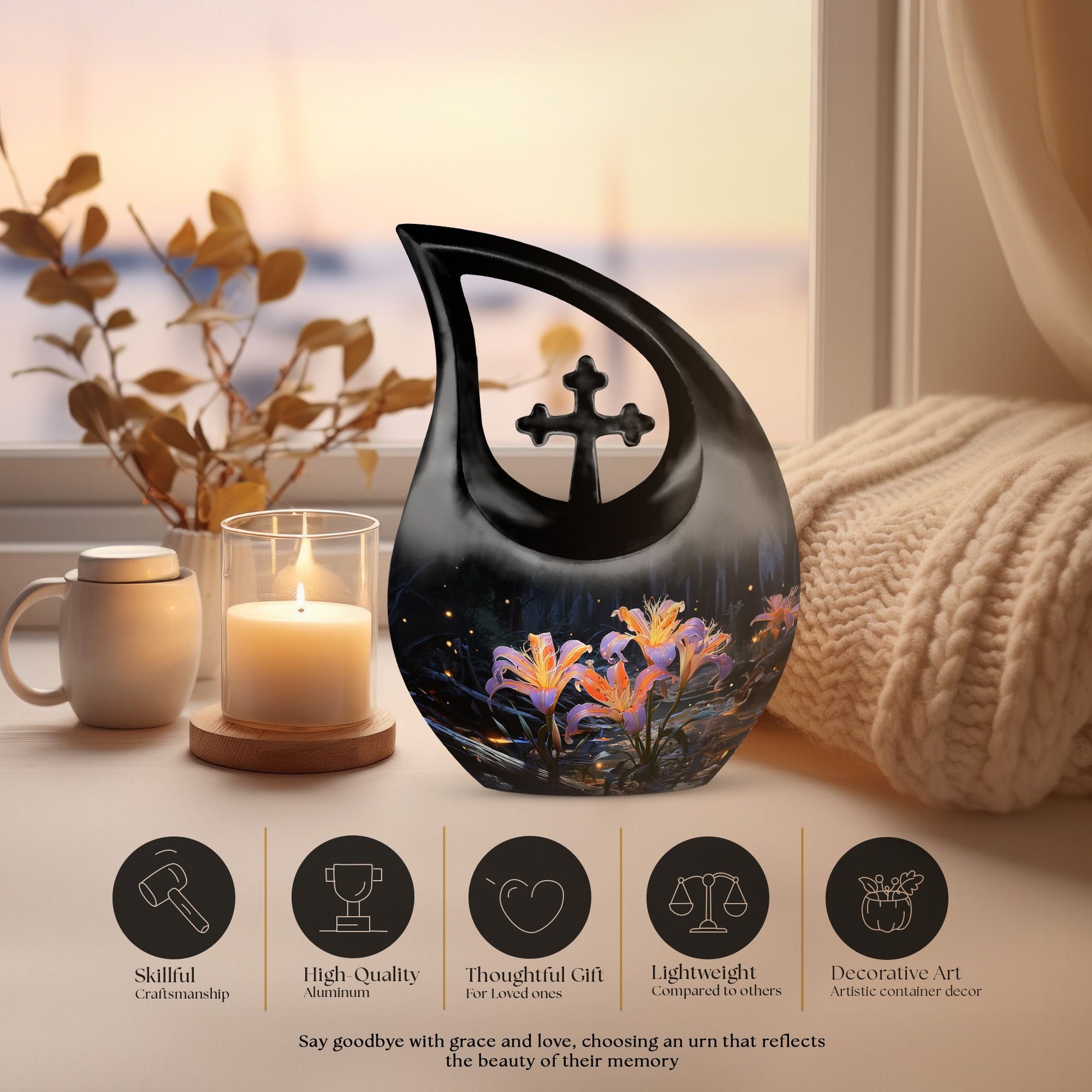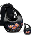 Expertly handcrafted from high-quality aluminum, this funeral urn features a smooth black teardrop silhouette accented by vivid purple and orange lilies surrounding a delicate cross. The contrasting colors reflect the harmony between love and remembrance, making it one of the most unique urns for ashes. Designed for both beauty and strength, this funeral ashes urn provides a secure resting place with a threaded screw-top lid to ensure ashes remain safely preserved.