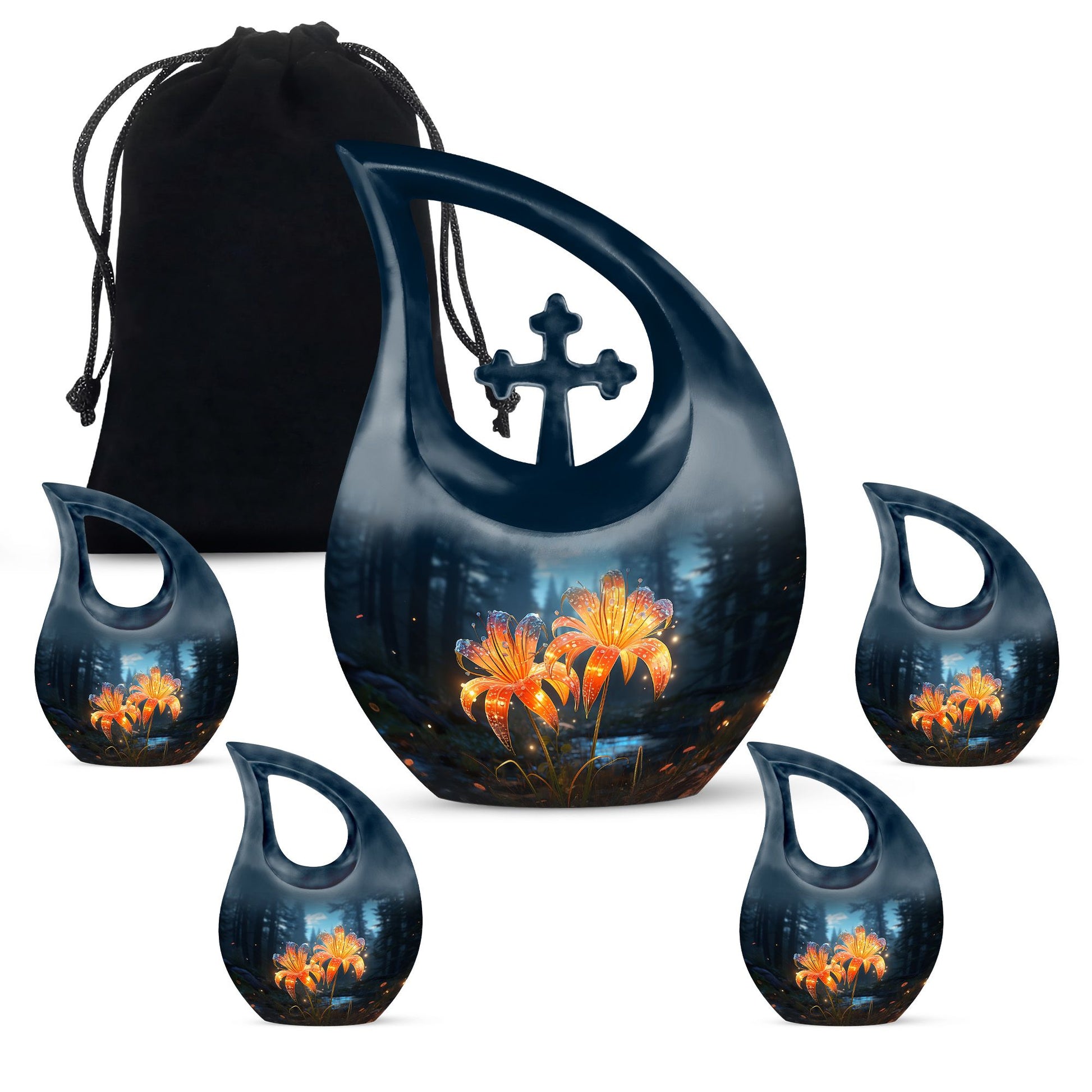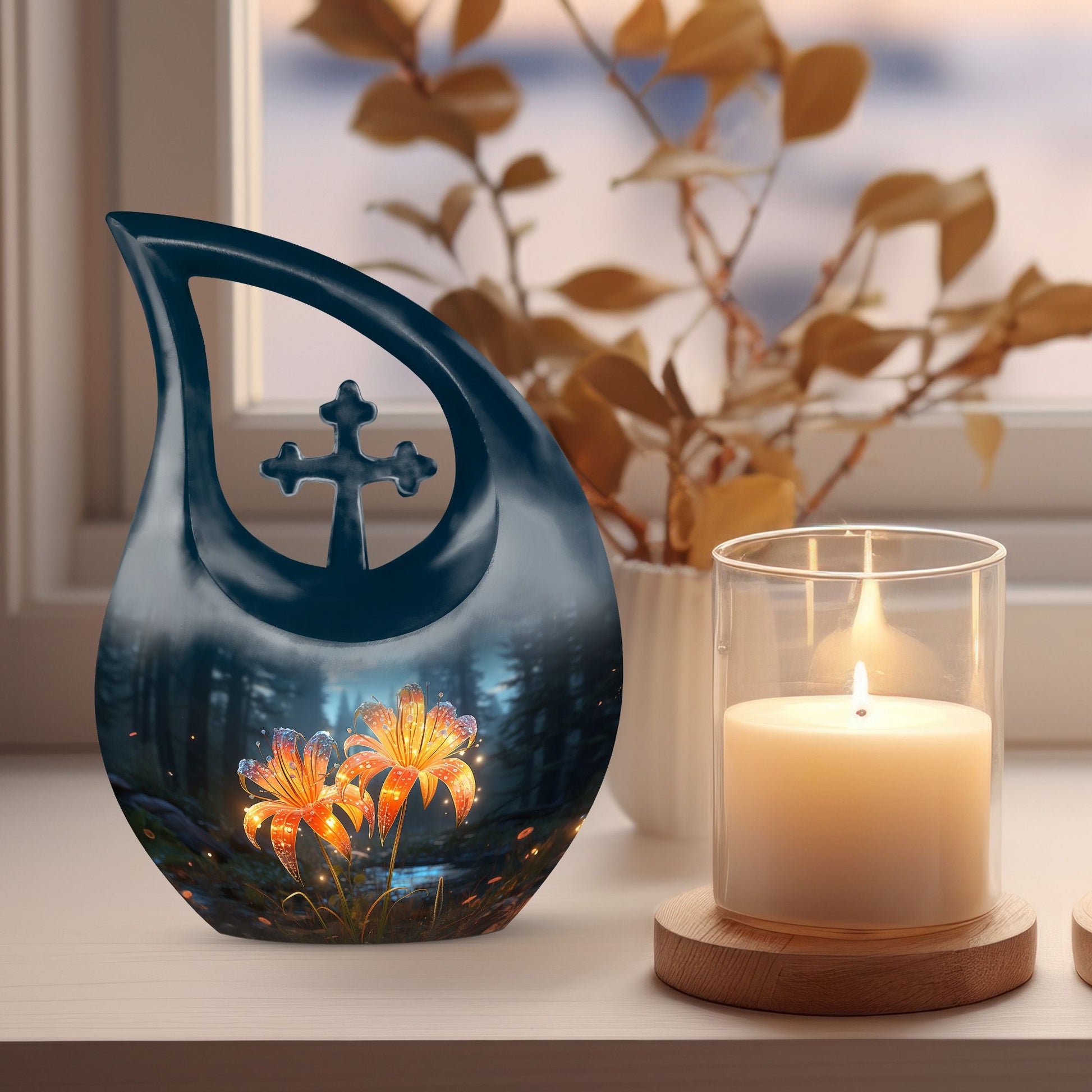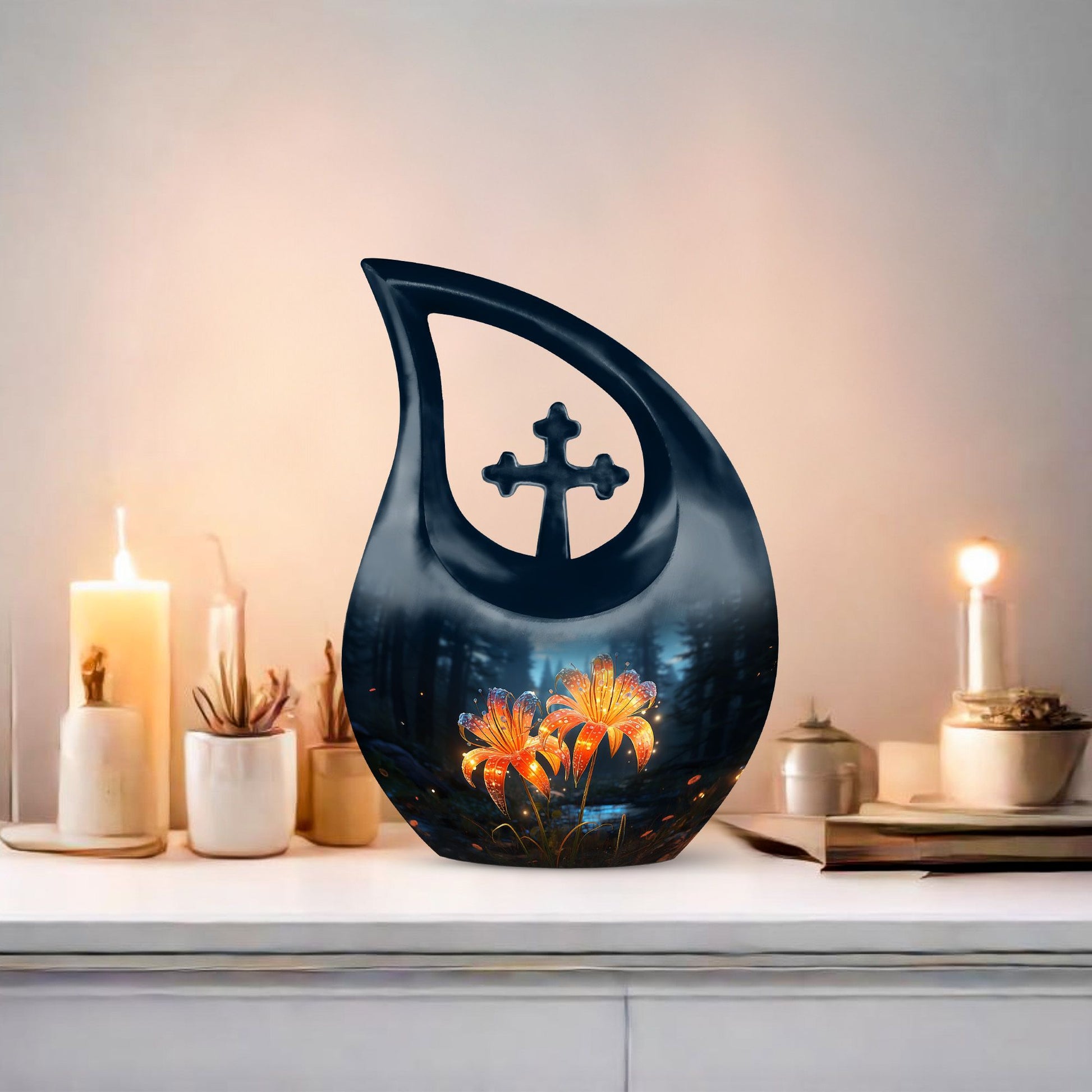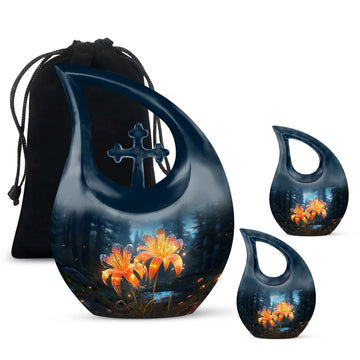 Celebrate a cherished life with our Black Teardrop Burial Urn, beautifully designed with Twin Orange Lily Flowers and a Cross. The glowing orange lilies represent renewal, courage, and the warmth of everlasting love, while the cross stands as a timeless symbol of faith. Whether chosen as a large urn for adult ashes or a special large urn mom, this design offers families a graceful and comforting tribute to a life well-lived.