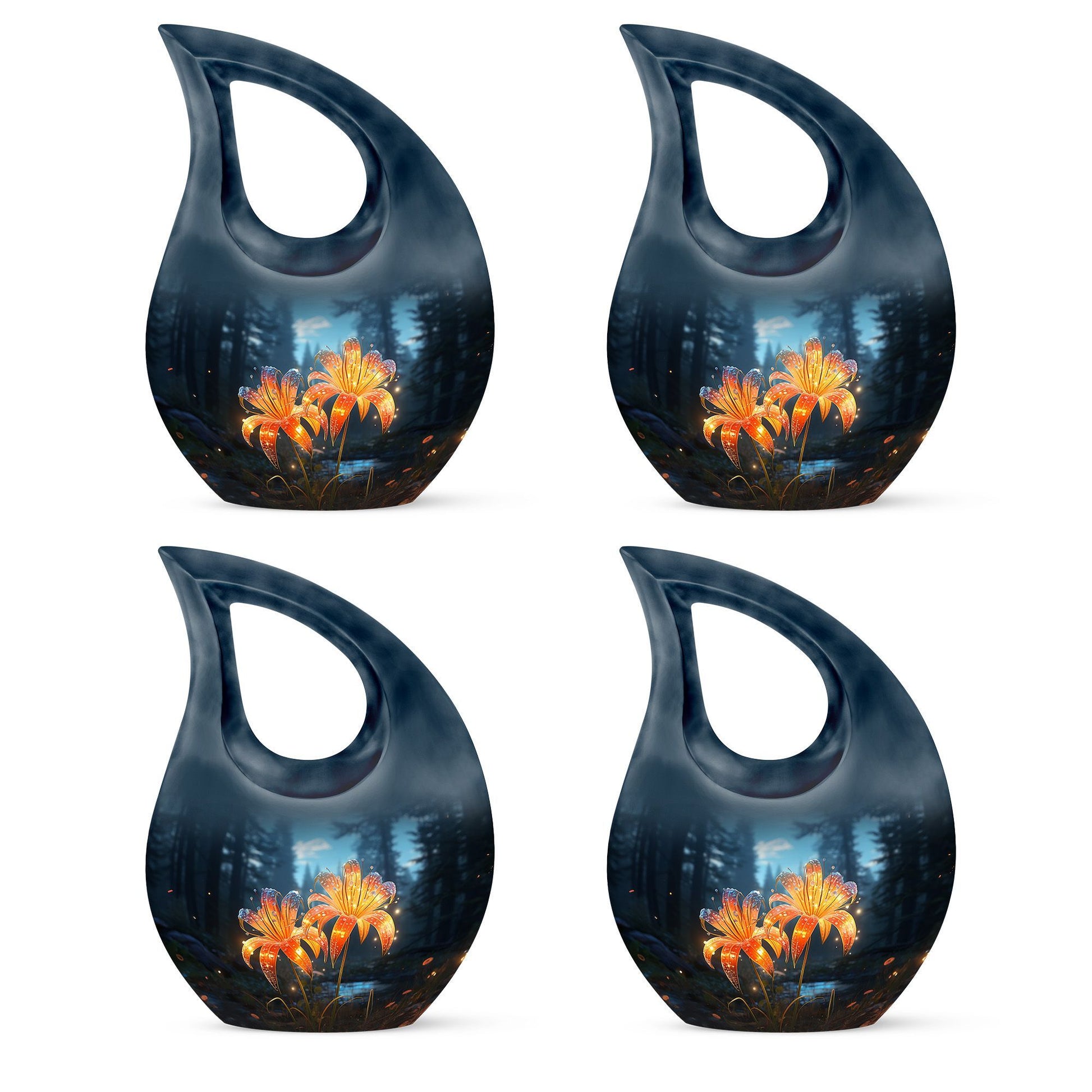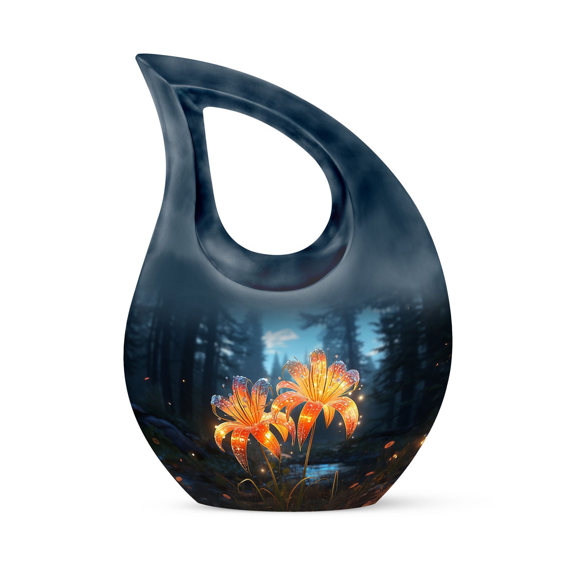 Expertly handcrafted from durable, high-quality aluminum, this large cremation urn blends strength, elegance, and artistry. Its sleek teardrop silhouette in deep black is accentuated by radiant orange lilies that softly illuminate the surface, bringing both visual beauty and emotional meaning. Ideal for both men and women, this human urn for ashes adult large provides a secure and dignified resting place. The threaded screw-top lid ensures ashes remain safely preserved, making it a reliable and lasting choice for home display or burial.