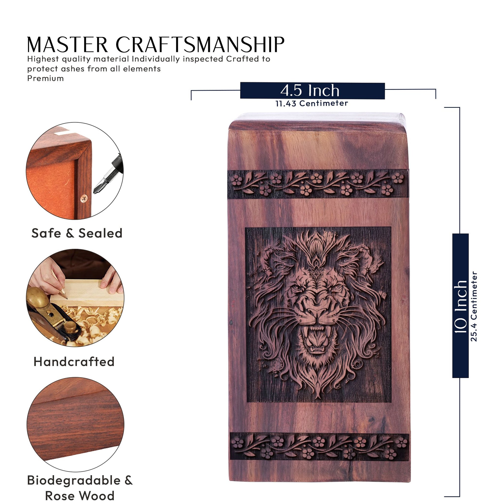 Cherish your loved ones' fond memories with our exquisite Lion Urn for Ashes. Crafted from high-quality wood, this funeral urn is a perfect blend of artistry and sentiment. Each detail is meticulously carved to exude a sense of honor, respect, and enduring love. An ideal resting place for those close to your heart, be it female or male, mom or dad. The design embodies strength, courage, and nobility, much akin to the lion, adding depth to your homage. This urn for cremation ashes serves as a timeless keepsake, that lets you handle your loss and remember your beloved ones with grace. Its universal appeal evokes a serene, comforting presence in your home, keeping your cherished memories alive. Bypass the ordinary, choose this urn for storing your precious human ashes, and pay tribute to your loved ones in a dignified manner. A stylish addition to your memorial ceremony supplies, the Lion Wood Urn fosters a sense of enduring connection.
