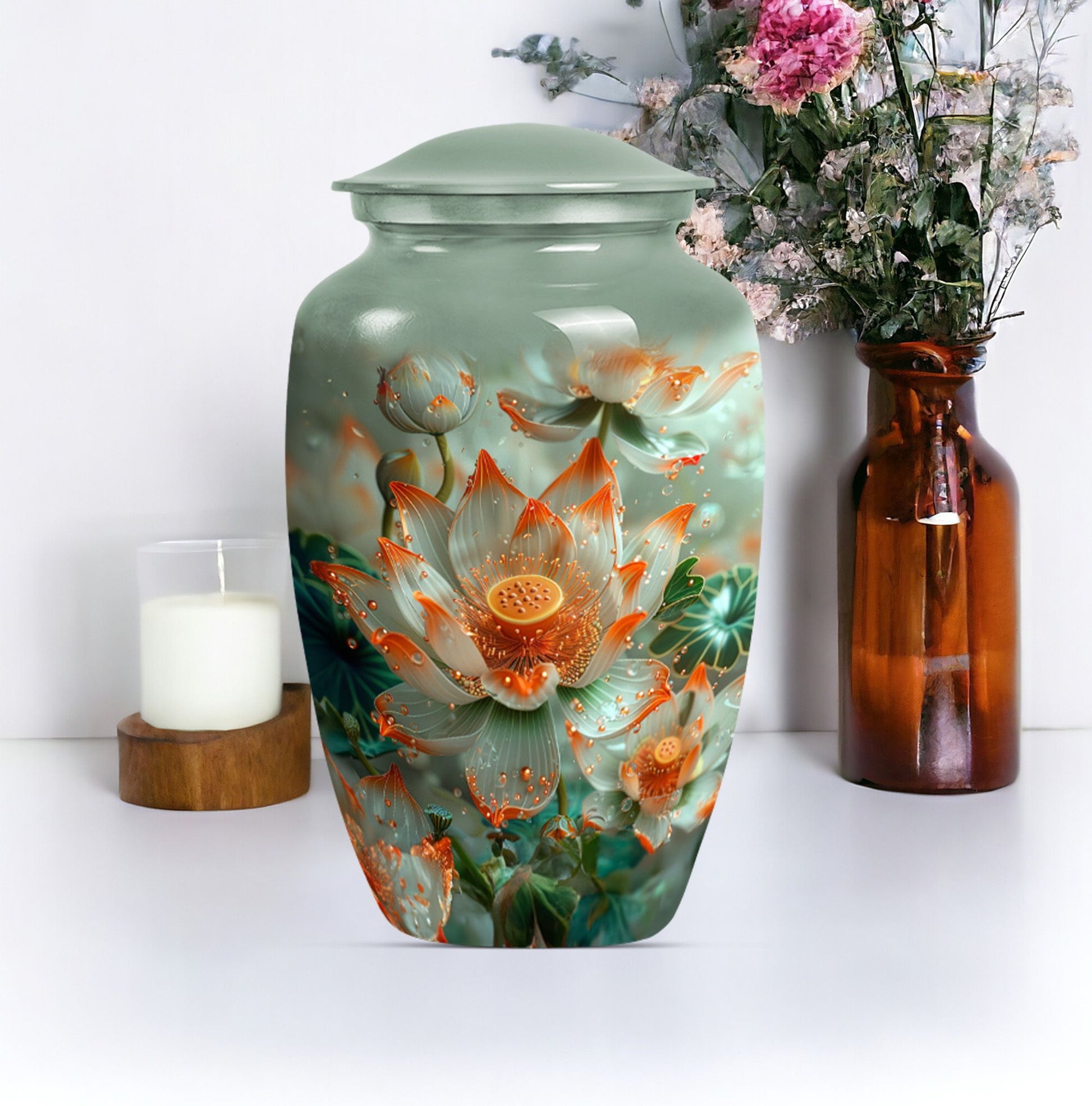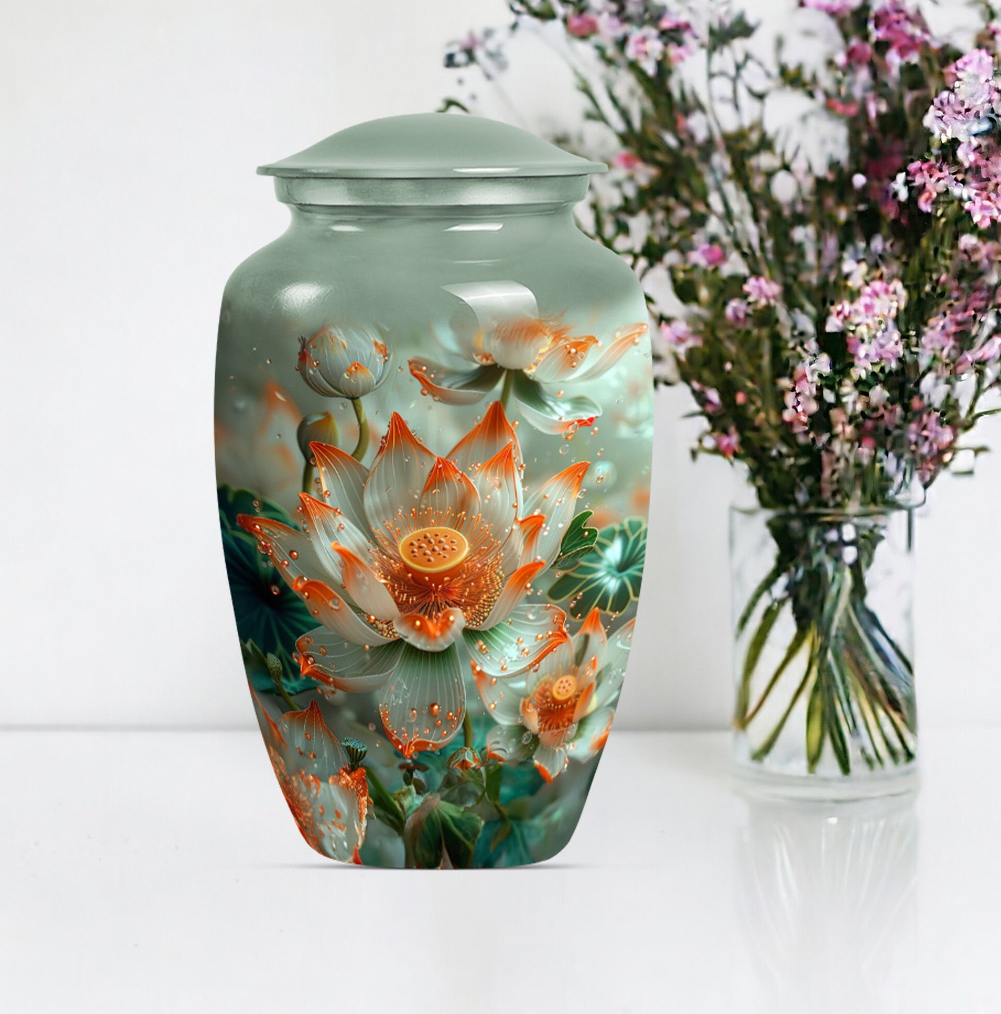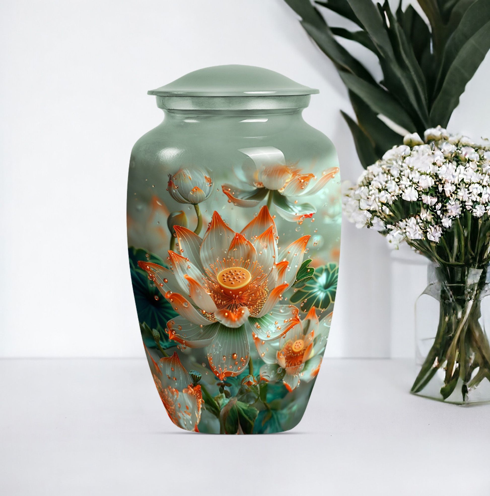 Introducing our abstract-themed Lotus Urn, a standout choice when considering funeral urns for an adult man's ashes. This significantly larger urn, standing tall at 10 inches in height, is specifically designed to contain ashes securely. Cast with impeccable quality aluminium, the urn weighs a sturdy 3.3 pounds, embodying durability. Its inherent capacity of 200 cubic inches makes it a suitable choice for preserving respect and remembrance. The package includes a plush velvet pouch, contributing to the orderly containment of ashes, adding an extra layer of protection. What makes our urn special is the customization feature that enables you to personalize it with engraved names, making it all the more touching and personal. Escape from the ordinary with our innovative modern urn, a chic and noble choice amongst urns for cremation ashes, encapsulating a significant sentiment. Love and memories last forever, hold on to them with our unique lotus urn.