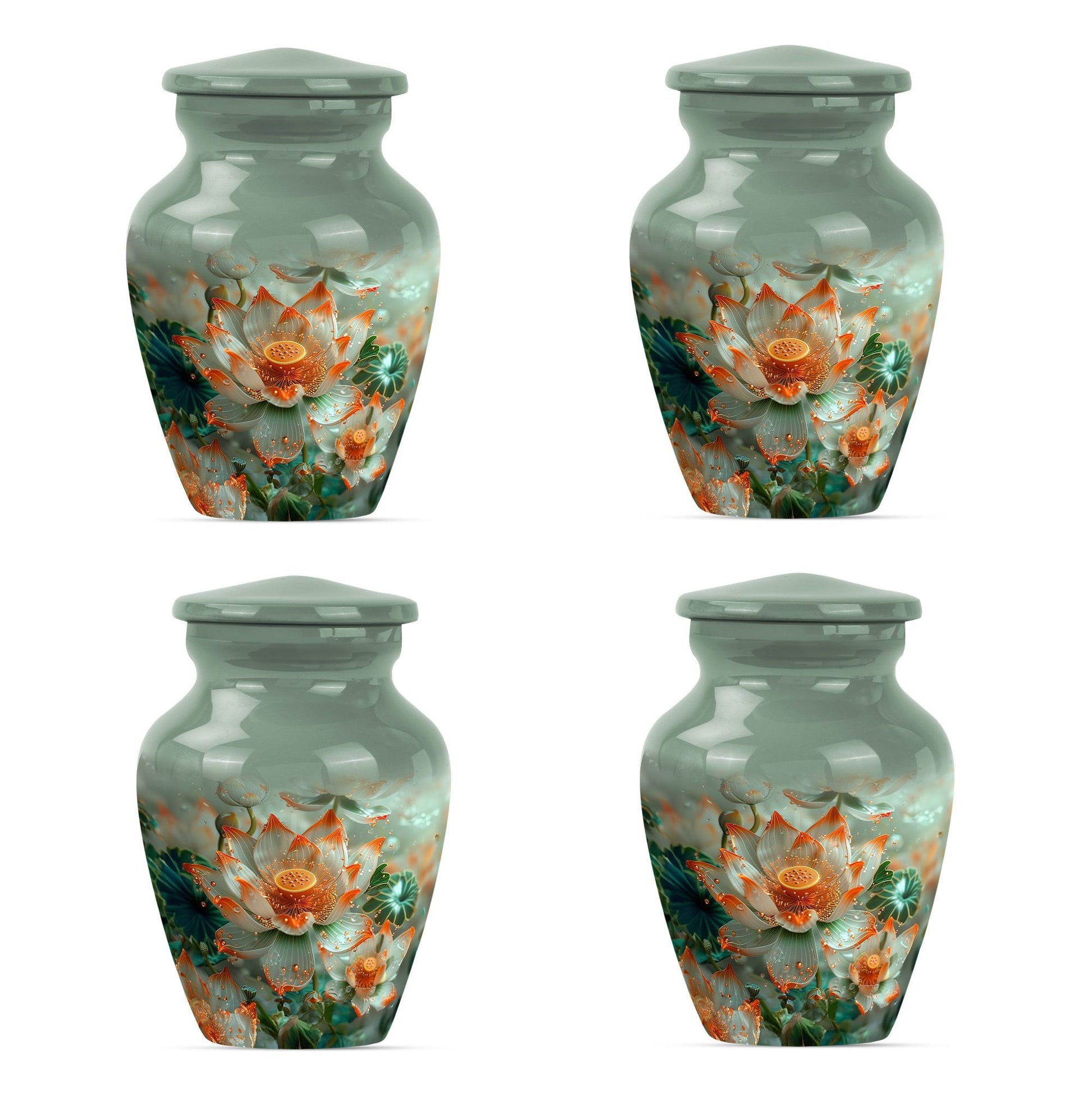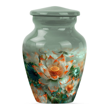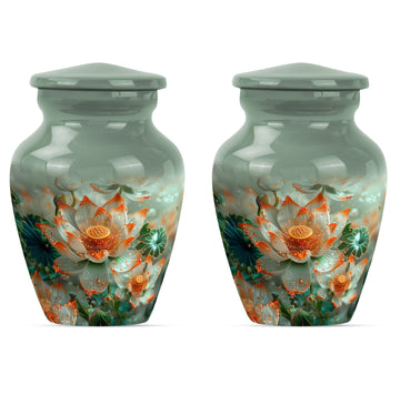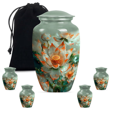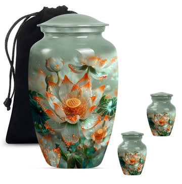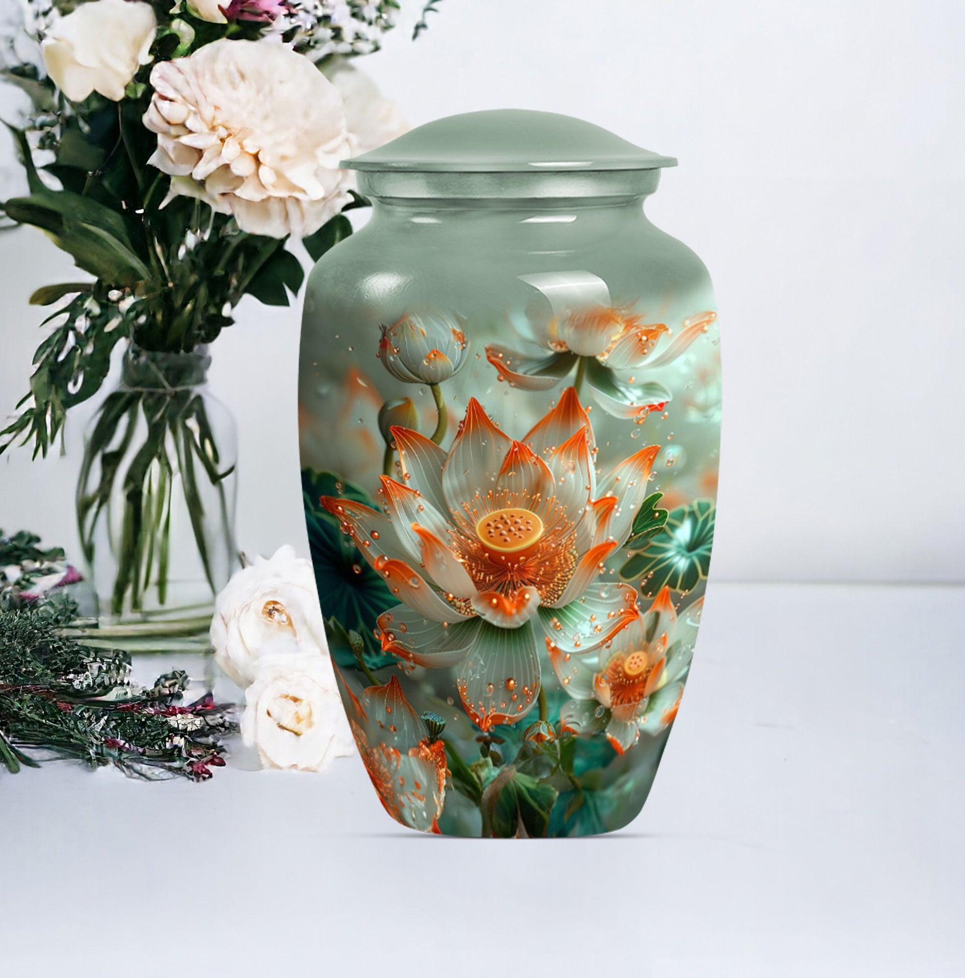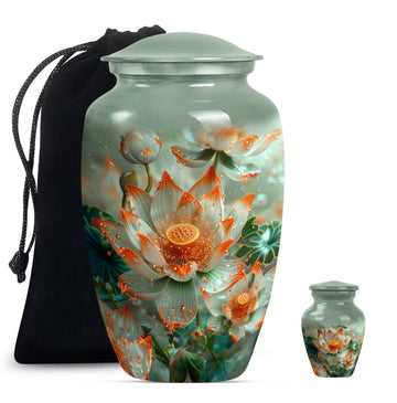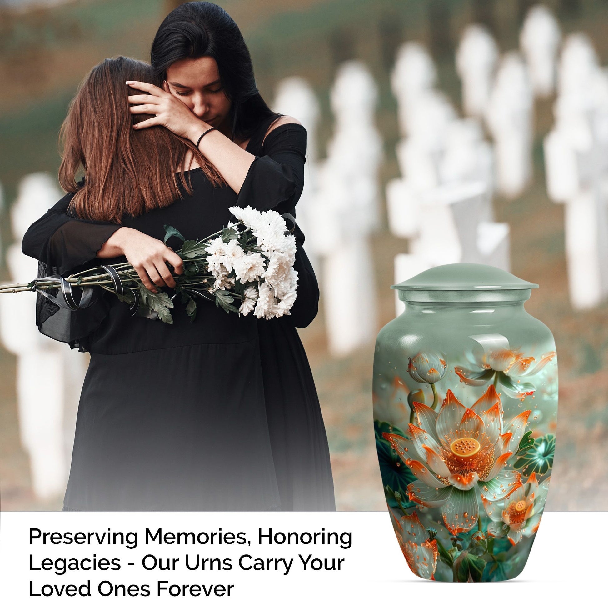 Introducing our abstract-themed Lotus Urn, a standout choice when considering funeral urns for an adult man's ashes. This significantly larger urn, standing tall at 10 inches in height, is specifically designed to contain ashes securely. Cast with impeccable quality aluminium, the urn weighs a sturdy 3.3 pounds, embodying durability. Its inherent capacity of 200 cubic inches makes it a suitable choice for preserving respect and remembrance. The package includes a plush velvet pouch, contributing to the orderly containment of ashes, adding an extra layer of protection. What makes our urn special is the customization feature that enables you to personalize it with engraved names, making it all the more touching and personal. Escape from the ordinary with our innovative modern urn, a chic and noble choice amongst urns for cremation ashes, encapsulating a significant sentiment. Love and memories last forever, hold on to them with our unique lotus urn.