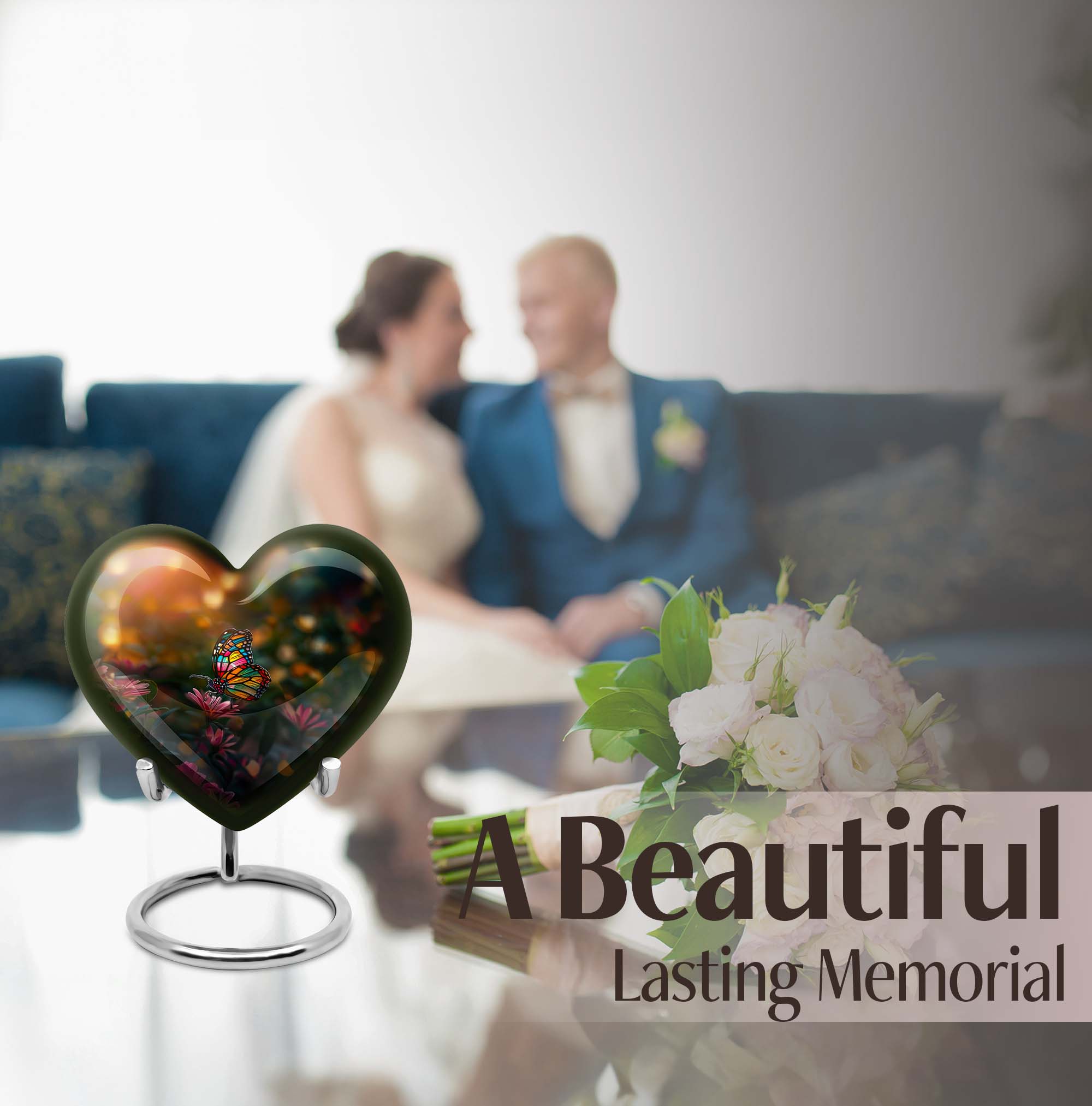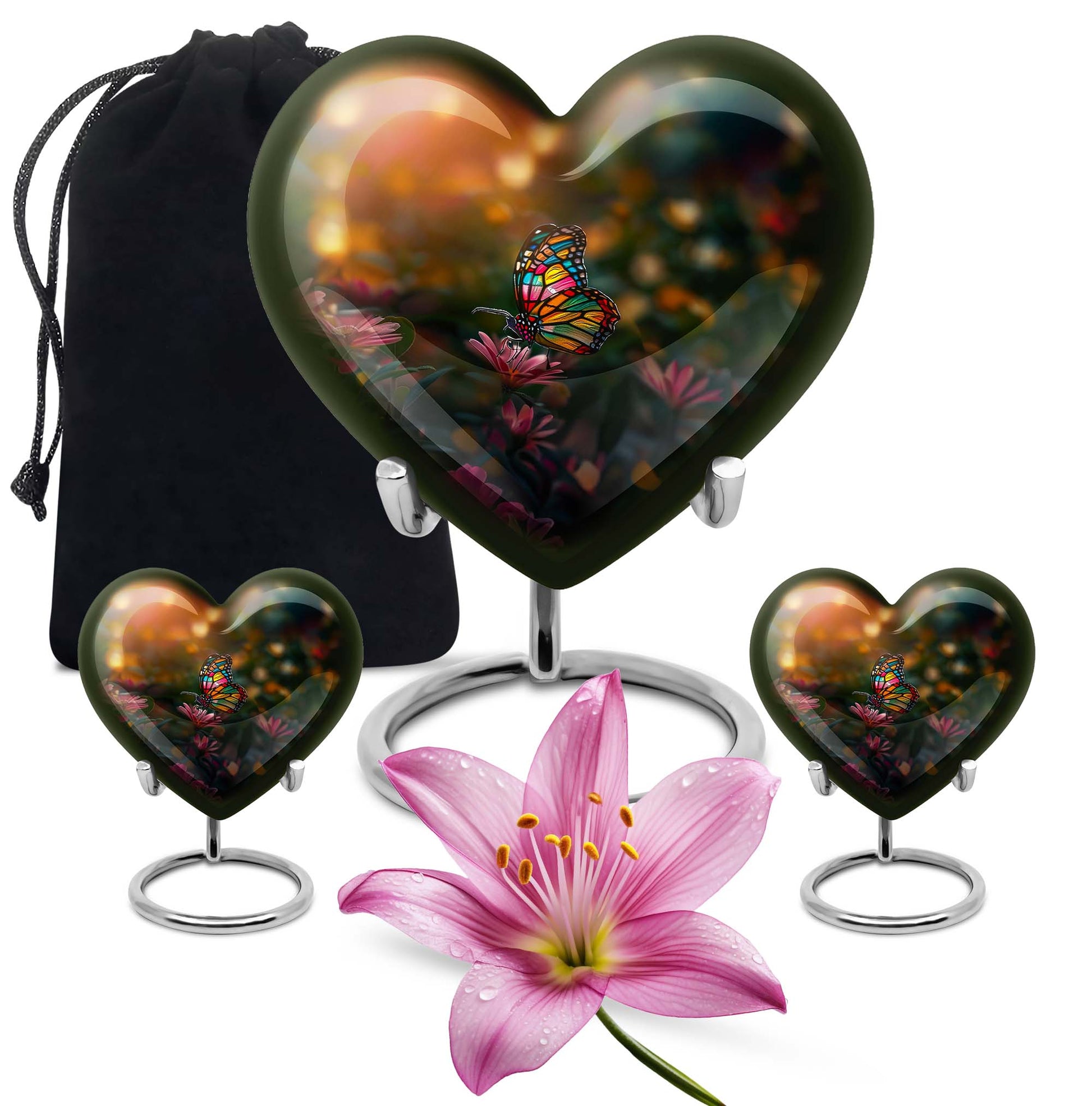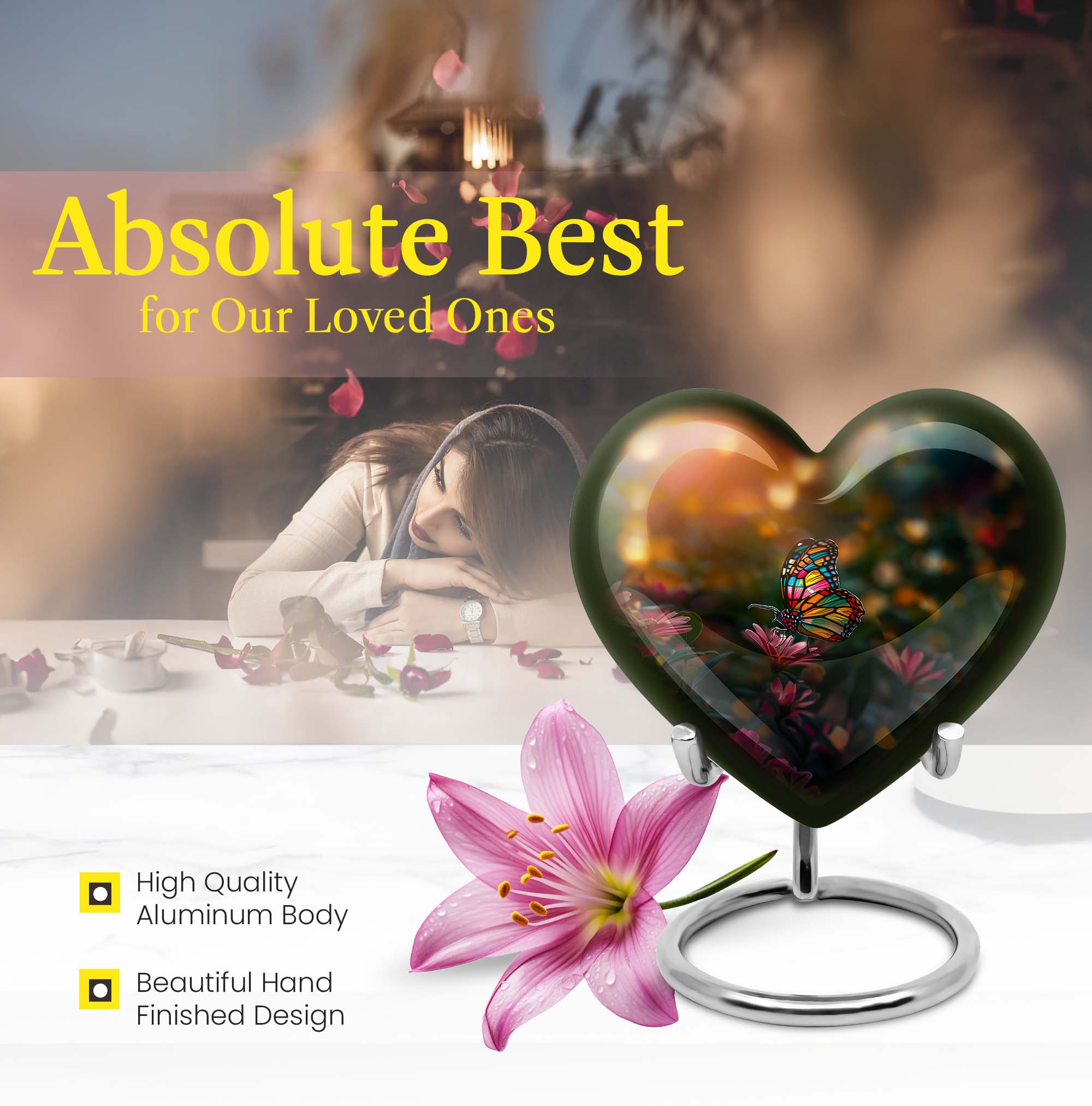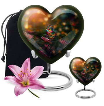 Add a touch of elegance to your memorial ceremonies with this beautifully crafted Butterfly Heart Urn. Standing 10 inches tall, this large urn is sized to securely hold 200 cubic inches of a loved one's ashes. Made from high-grade aluminium, this artistically heart-shaped cremation urn weighs 3.3 pounds, assuring its durability and robustness. The package is complemented with a velvet pouch for secure containment of ashes, keeping memories cherished and respected. Personalize the urn by getting names engrained, thus adding a touch of sentimental value to it. The butterfly theme on the urn signifies transformation, a perfect symbolism for a resting place. Utterly uncommon, funeral burial urns like this radiate uniqueness and an uncommon form of love. Meant for adults and seniors, this butterfly urn can hold large volumes of human ashes, making it an ideal heartfelt tribute to your beloved.