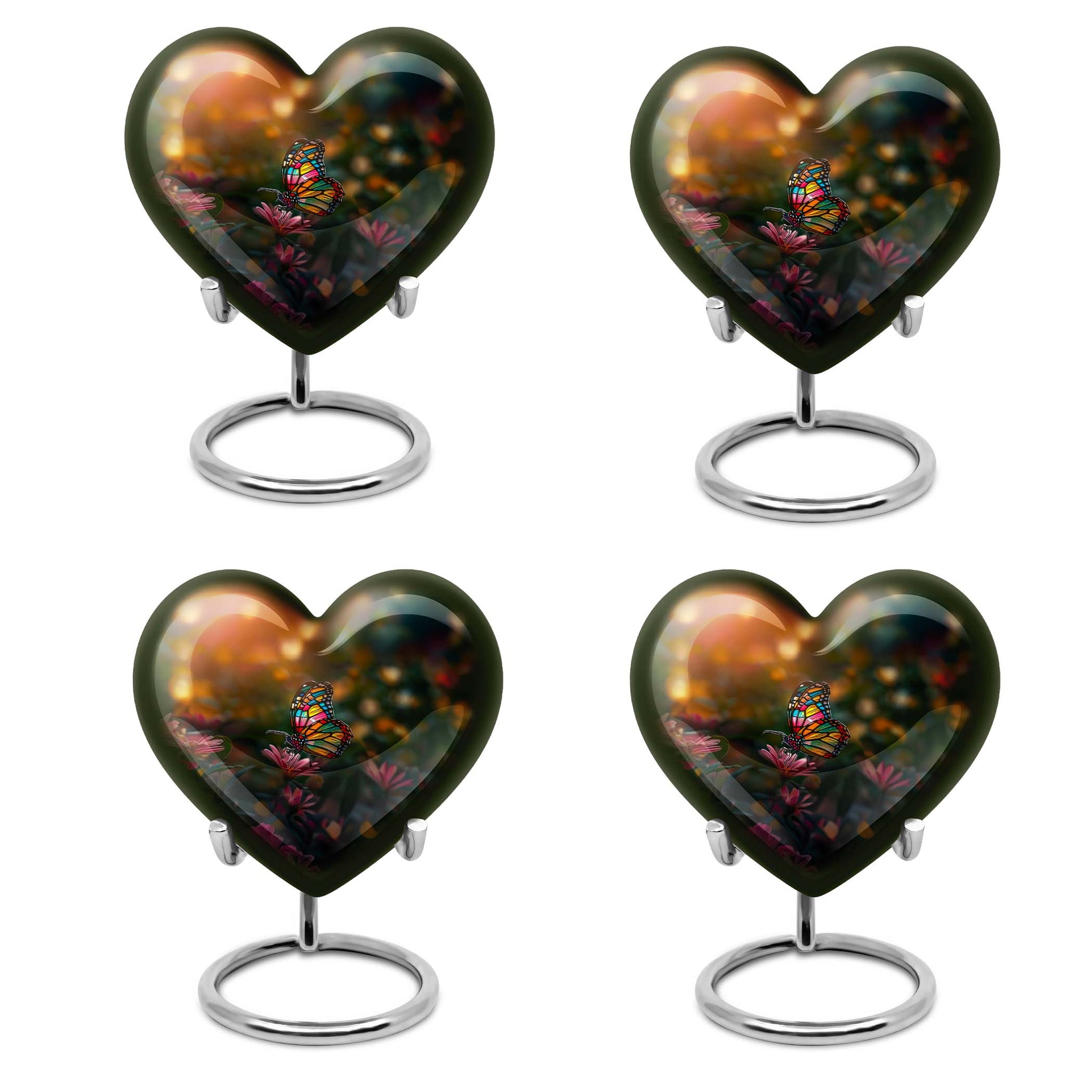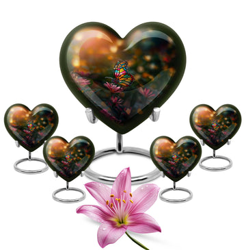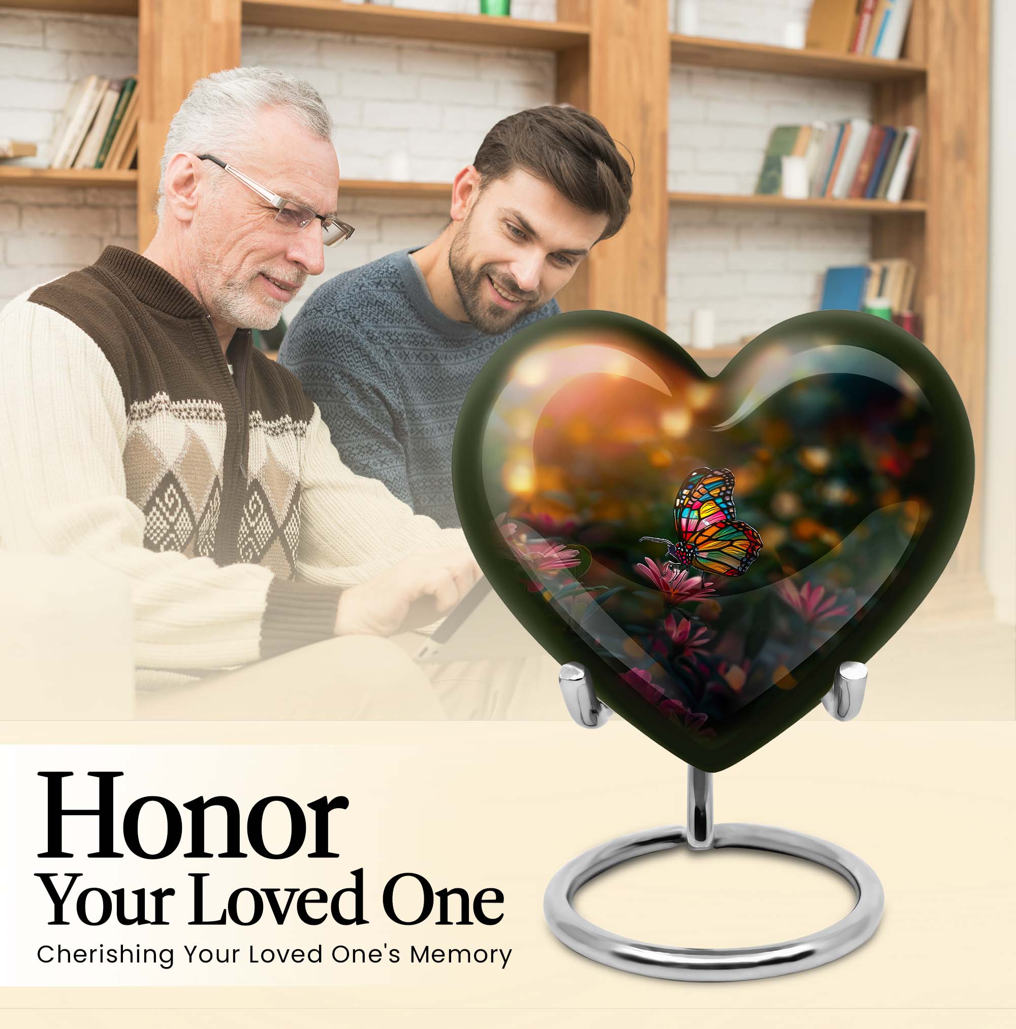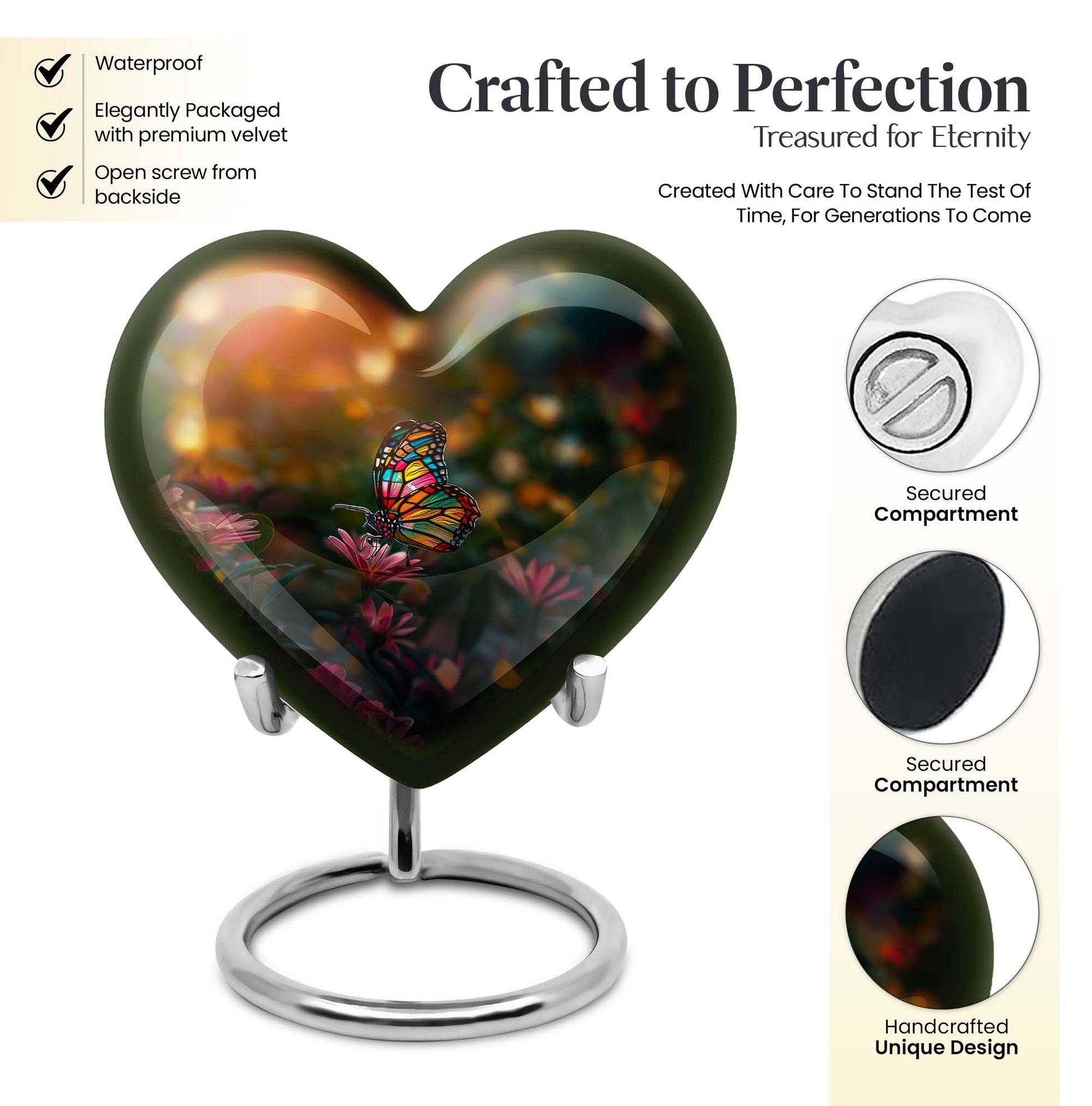 Add a touch of elegance to your memorial ceremonies with this beautifully crafted Butterfly Heart Urn. Standing 10 inches tall, this large urn is sized to securely hold 200 cubic inches of a loved one's ashes. Made from high-grade aluminium, this artistically heart-shaped cremation urn weighs 3.3 pounds, assuring its durability and robustness. The package is complemented with a velvet pouch for secure containment of ashes, keeping memories cherished and respected. Personalize the urn by getting names engrained, thus adding a touch of sentimental value to it. The butterfly theme on the urn signifies transformation, a perfect symbolism for a resting place. Utterly uncommon, funeral burial urns like this radiate uniqueness and an uncommon form of love. Meant for adults and seniors, this butterfly urn can hold large volumes of human ashes, making it an ideal heartfelt tribute to your beloved.