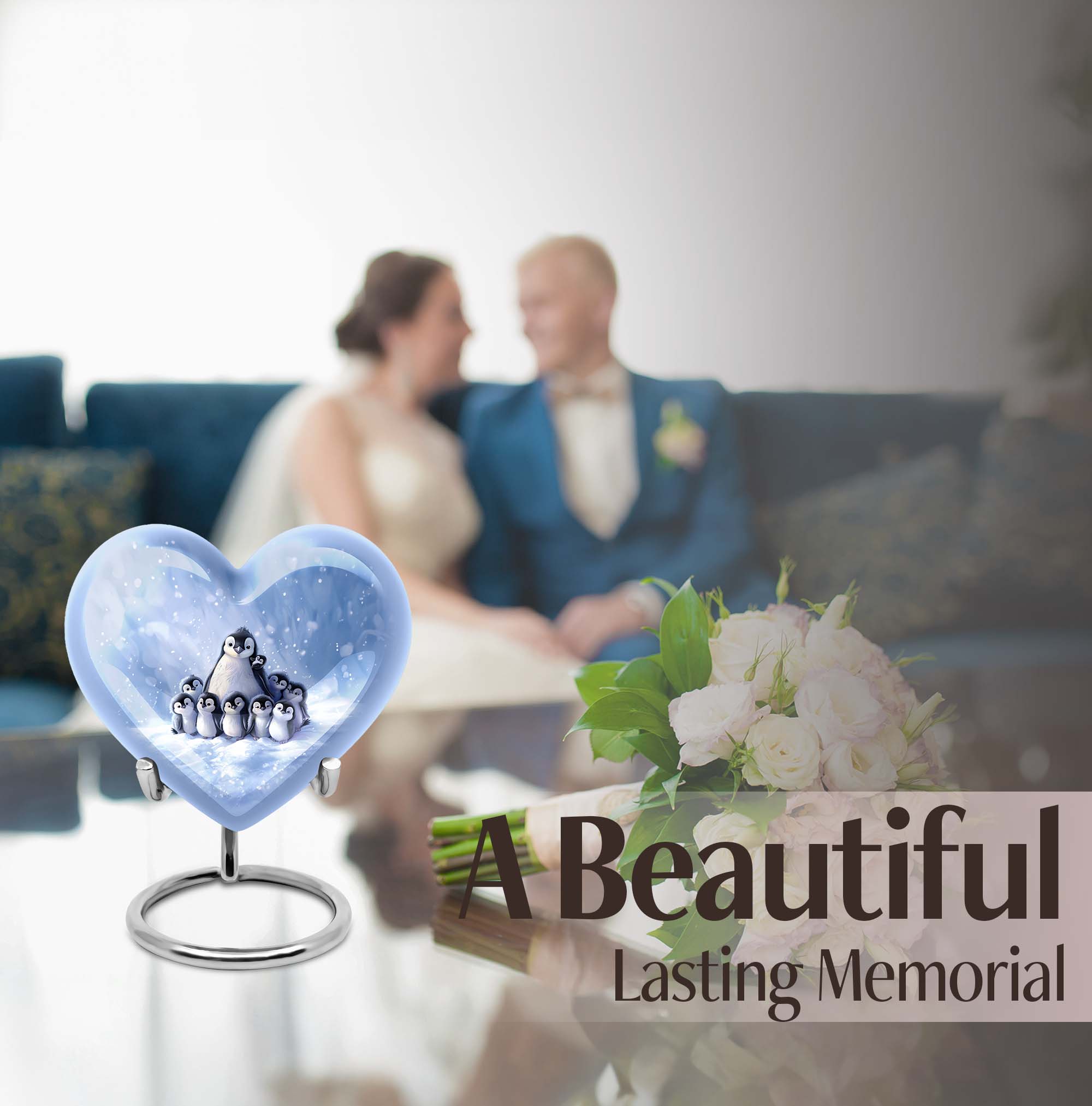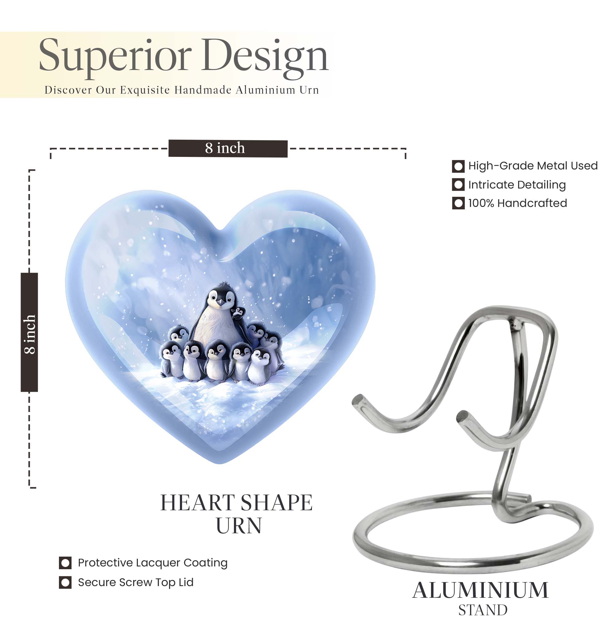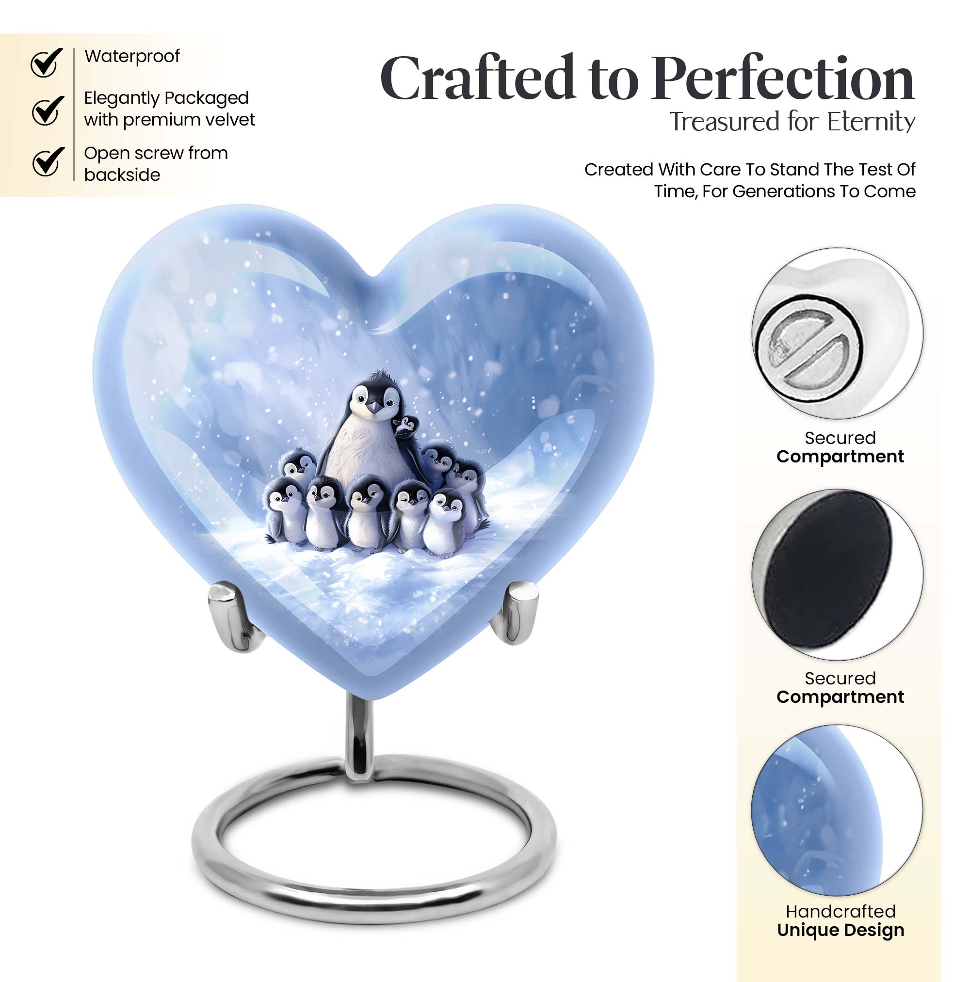 Honor your beloved mom with our carefully crafted Penguin Urn. This unique urn, designed in a loving heart shape, is adorned with elegant butterfly motifs, providing a touching tribute to a life well-lived. Crafted in robust aluminium, the urn is sizeable at 10 inches tall, with a weight of 3.3 pounds. It boasts an impressive capacity of 200 cubic inches, ensuring ample space for adult ashes. This thoughtful cremation urn comes with an exquisite velvet pouch, providing dignified containment for the treasured remains. For a truly unique touch, personalize it with engraved names to forever memorialize your loved one. Whether used as an outdoor urn or a burial urn, this high-quality memorial urn is a fitting choice for preserving precious memories. The keywords 'funeral urns for adult ashes', 'ash urn ashes adult', 'outdoor urns' and 'burial urns metal' provide web patrons searching for this product easy access to this unique heart urn. Respect their memory, celebrate their life – with our Penguin Urn.