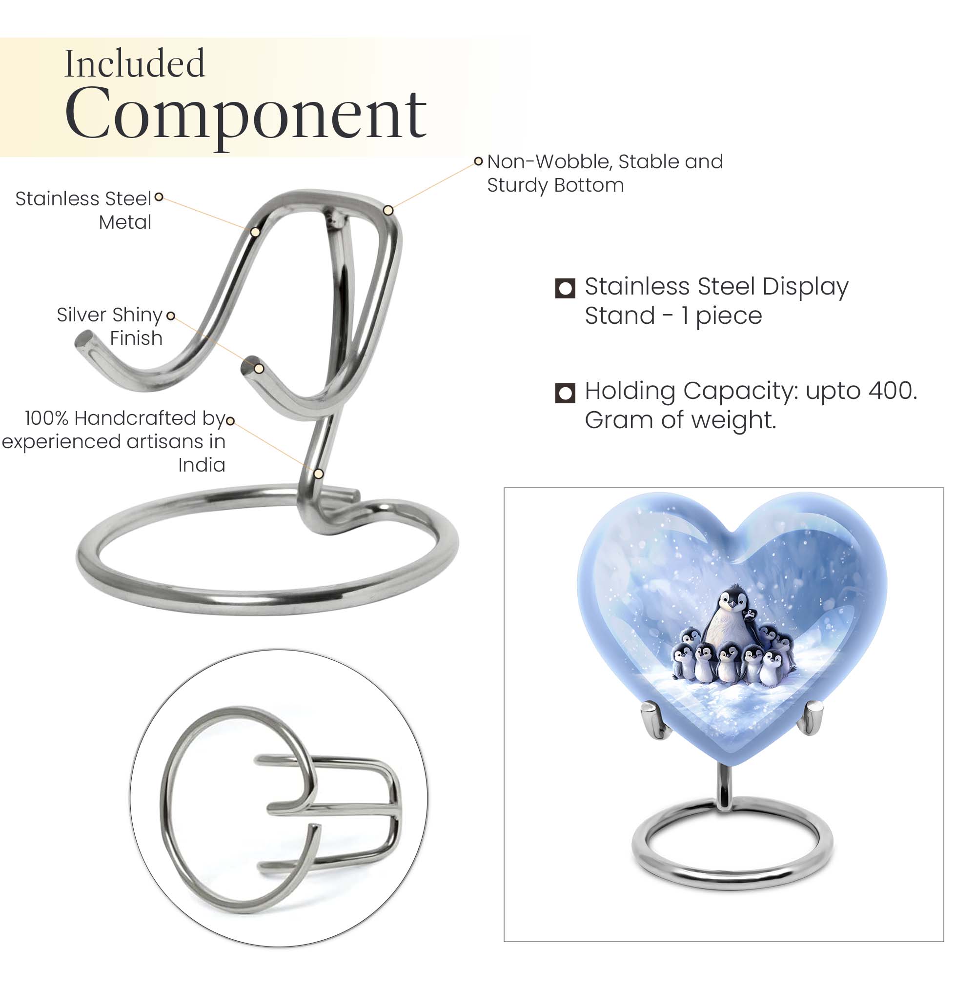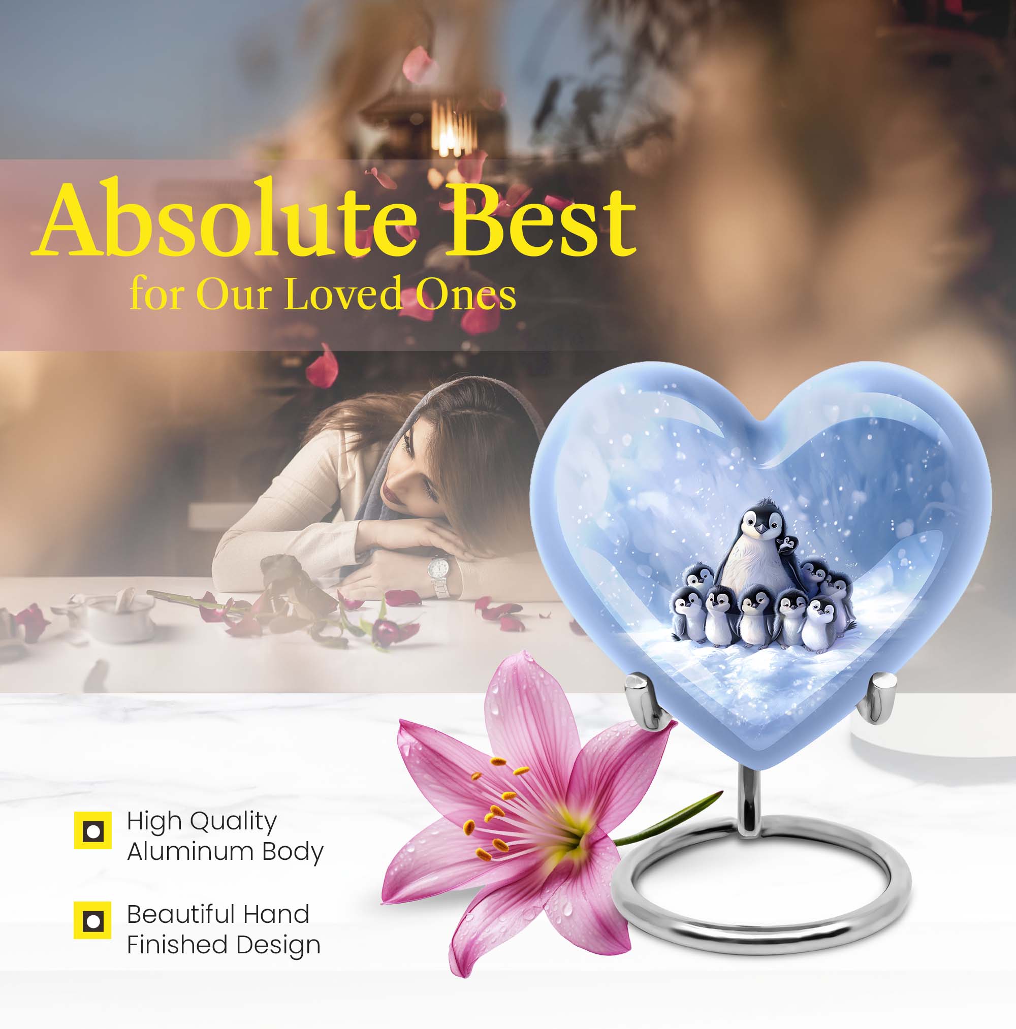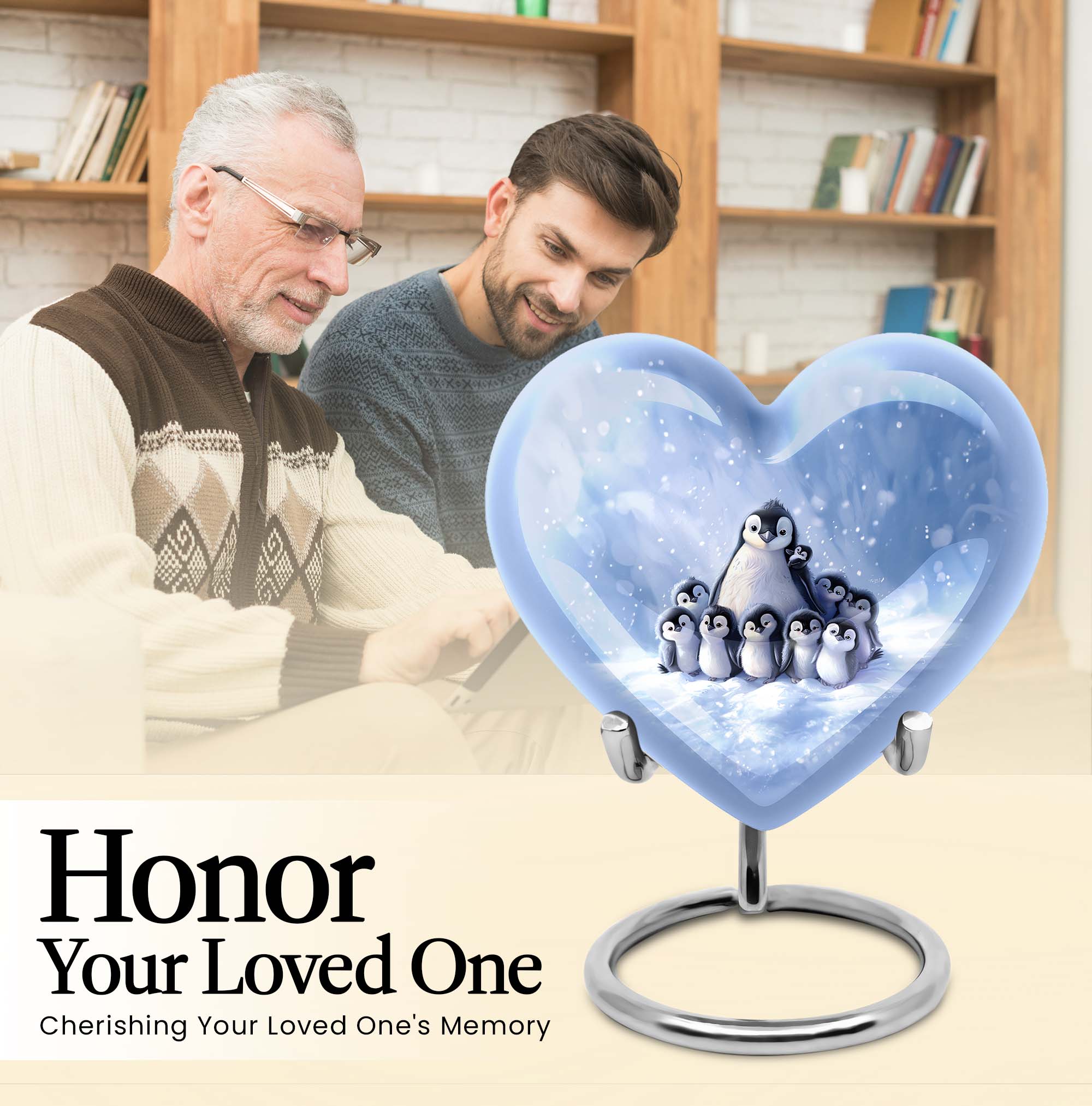 Honor your beloved mom with our carefully crafted Penguin Urn. This unique urn, designed in a loving heart shape, is adorned with elegant butterfly motifs, providing a touching tribute to a life well-lived. Crafted in robust aluminium, the urn is sizeable at 10 inches tall, with a weight of 3.3 pounds. It boasts an impressive capacity of 200 cubic inches, ensuring ample space for adult ashes. This thoughtful cremation urn comes with an exquisite velvet pouch, providing dignified containment for the treasured remains. For a truly unique touch, personalize it with engraved names to forever memorialize your loved one. Whether used as an outdoor urn or a burial urn, this high-quality memorial urn is a fitting choice for preserving precious memories. The keywords 'funeral urns for adult ashes', 'ash urn ashes adult', 'outdoor urns' and 'burial urns metal' provide web patrons searching for this product easy access to this unique heart urn. Respect their memory, celebrate their life – with our Penguin Urn.