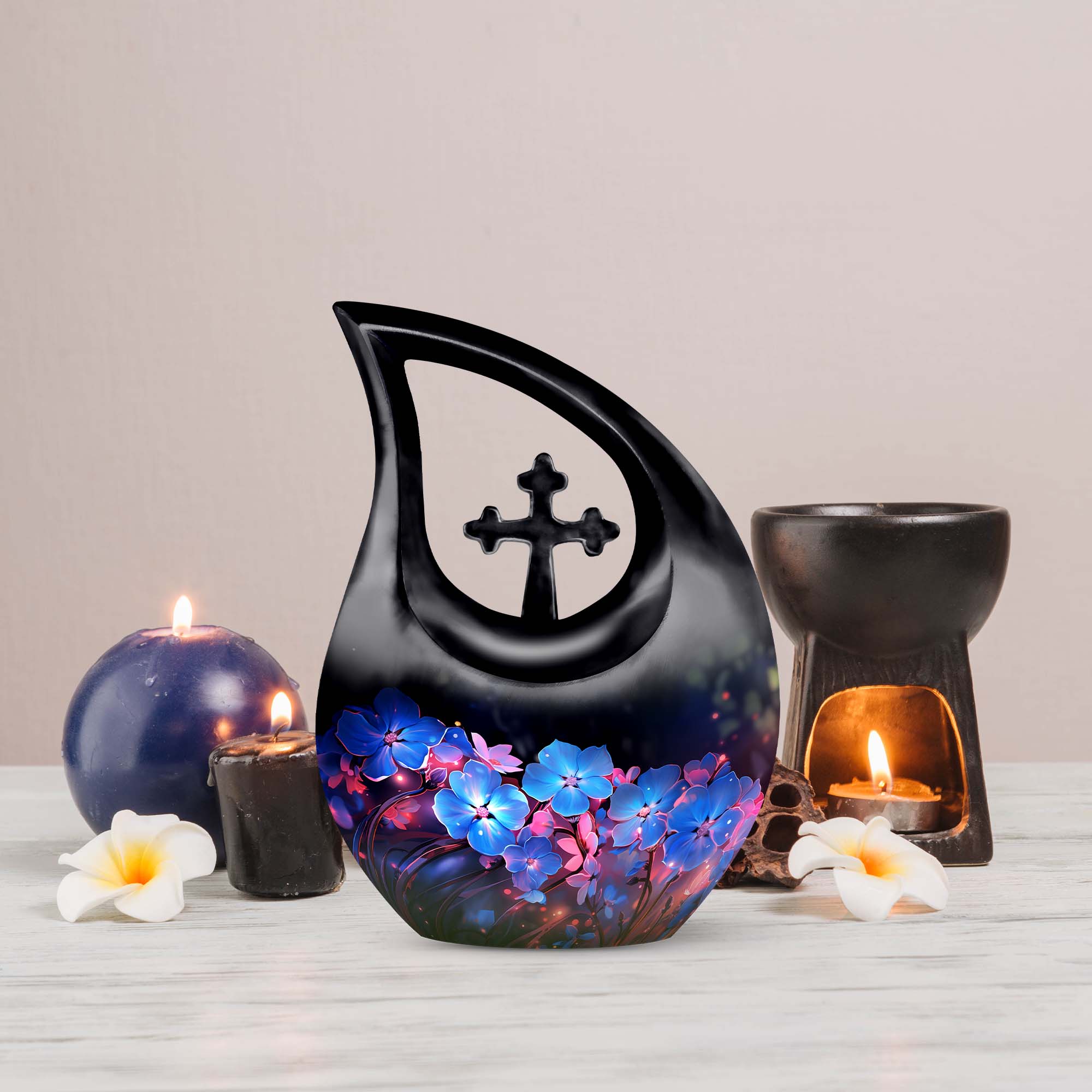 Crafted from durable aluminum, this blue flowers memorial urn for ashes combines artistry and strength, designed to last for generations. The hand-painted floral details and smooth polished surface make it one of the most meaningful large urns for female & male memorials. Perfect as a cremation urn adult male or urn adult female ashes, its timeless design suits any home, chapel, or memorial setting with quiet elegance.