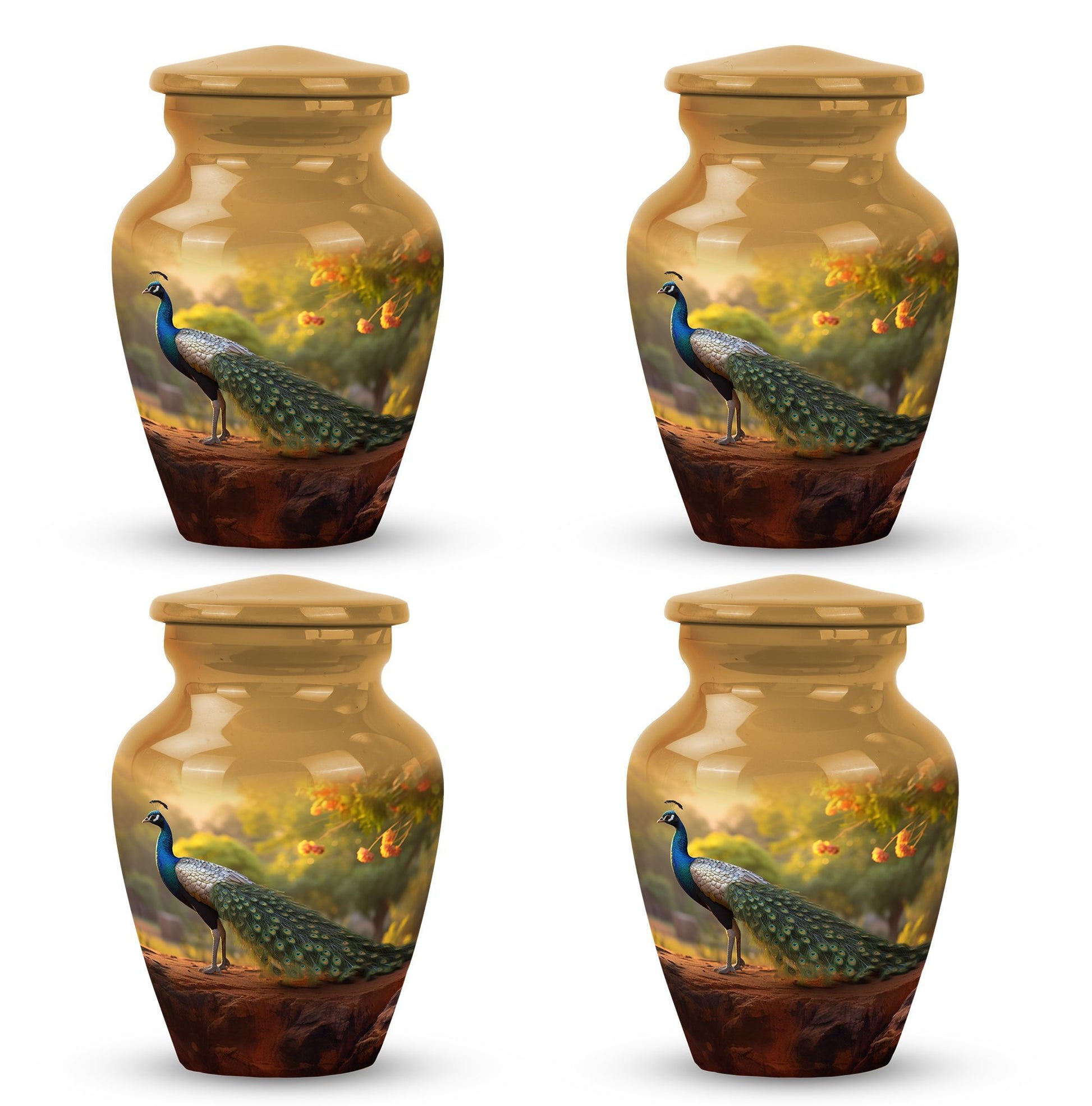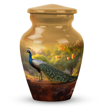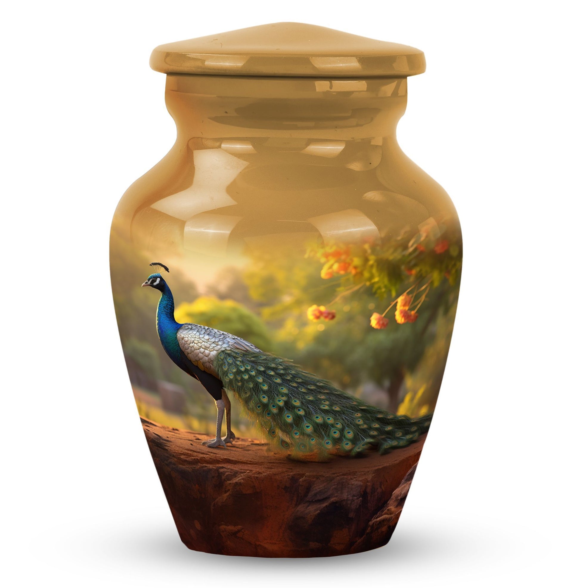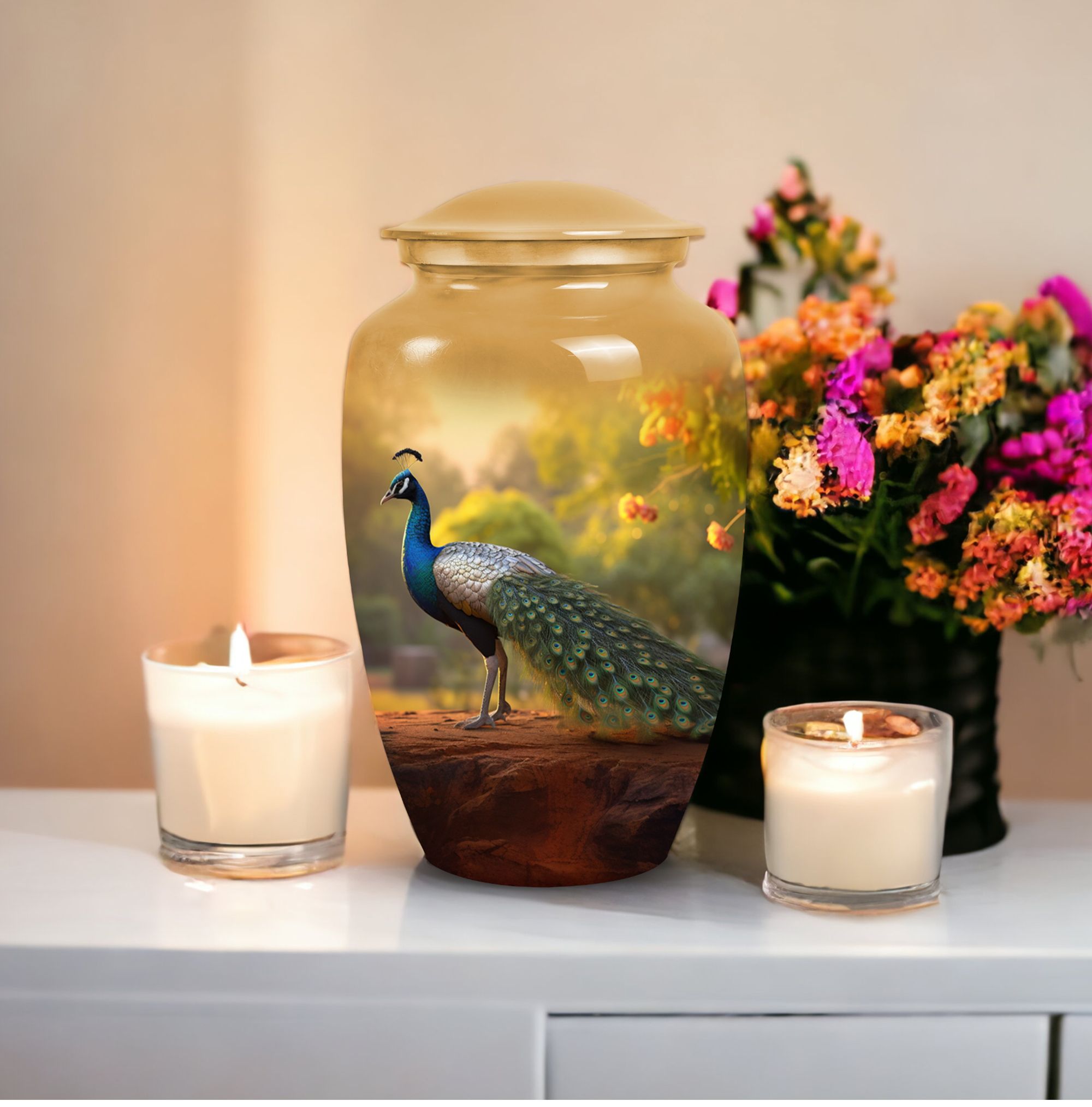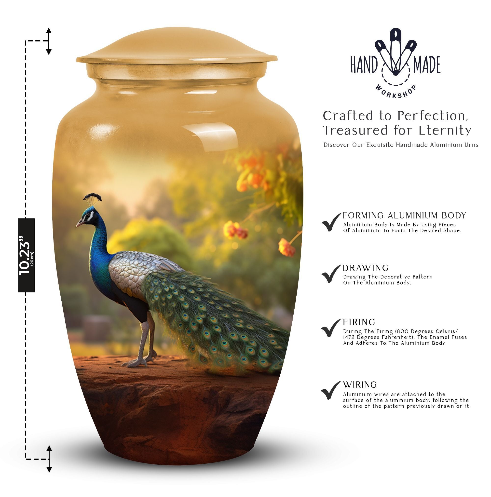 Our Peacock Urn is more than just a memorial gift. This cremation urn, carefully crafted from sturdy Aluminium, boasts a unique and timeless Classic Urn design. More than just its style, this urn serves a practical function, offering a considerable capacity of 200 cubic inches, suitable for retaining ashes in dignity and respect. It stands at 10 inches in height, weighs 3.3 pounds, and supports a compact 3-inch size, making it a fitting tribute that can be placed discreetly in your preferred space. This urn is also customizable. It offers you the opportunity to personalize it with engraved names, adding a distinct touch to your memorial ceremony. What's more, the package comes with a velvet pouch that ensures the secure containment of ashes. Far from standard options, this Large Urn stands out as an Ashes Holder and makes for an eloquent Burial Urn for ashes, adding significance to your memories.