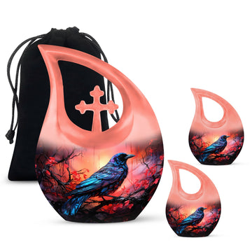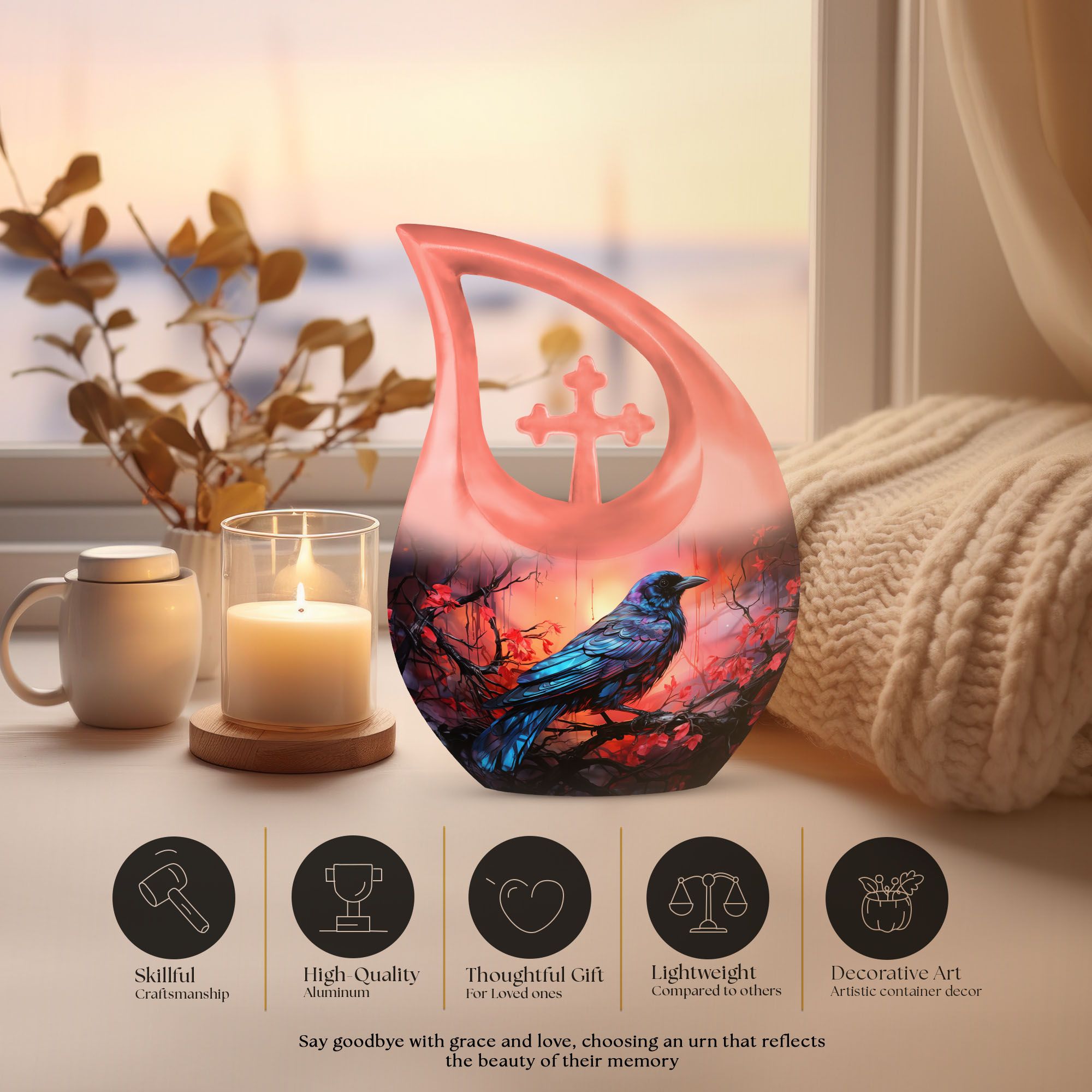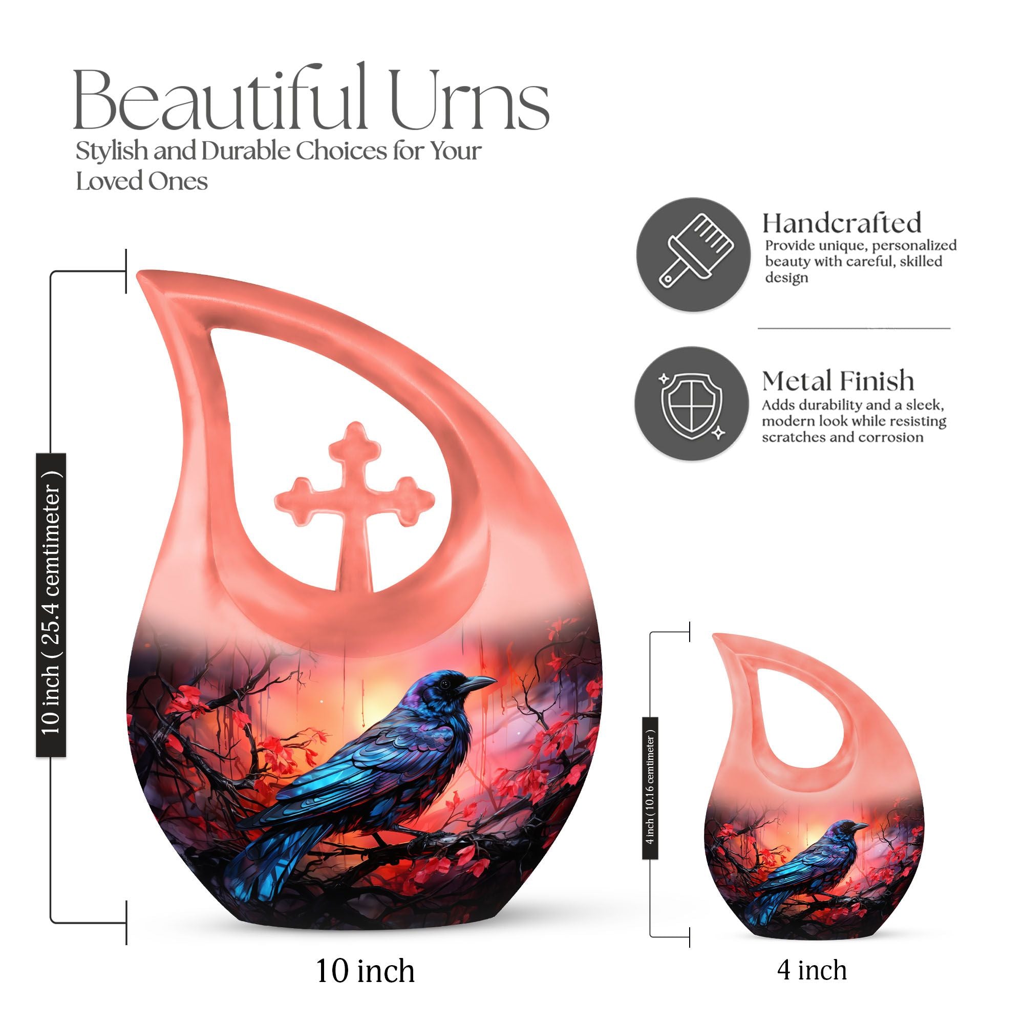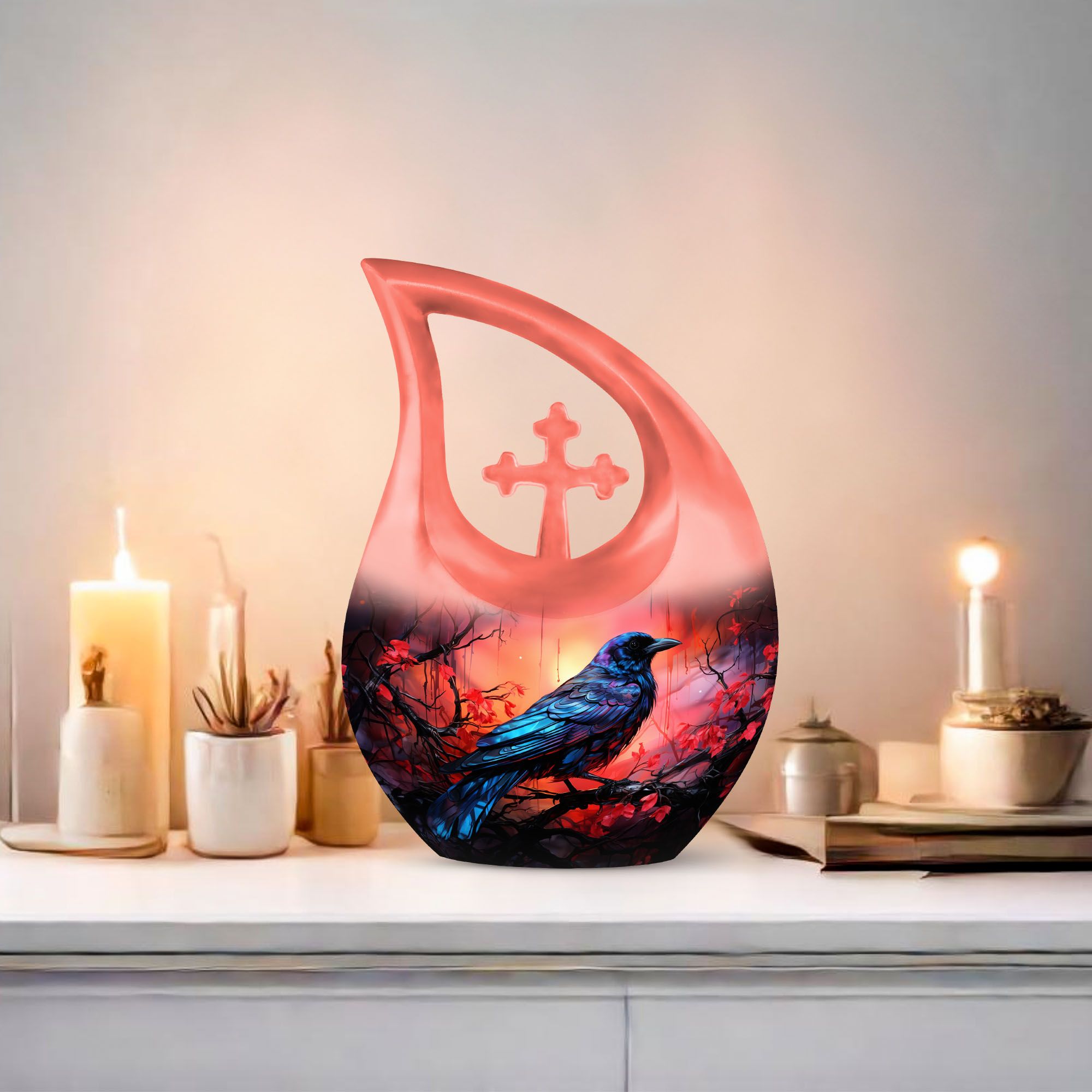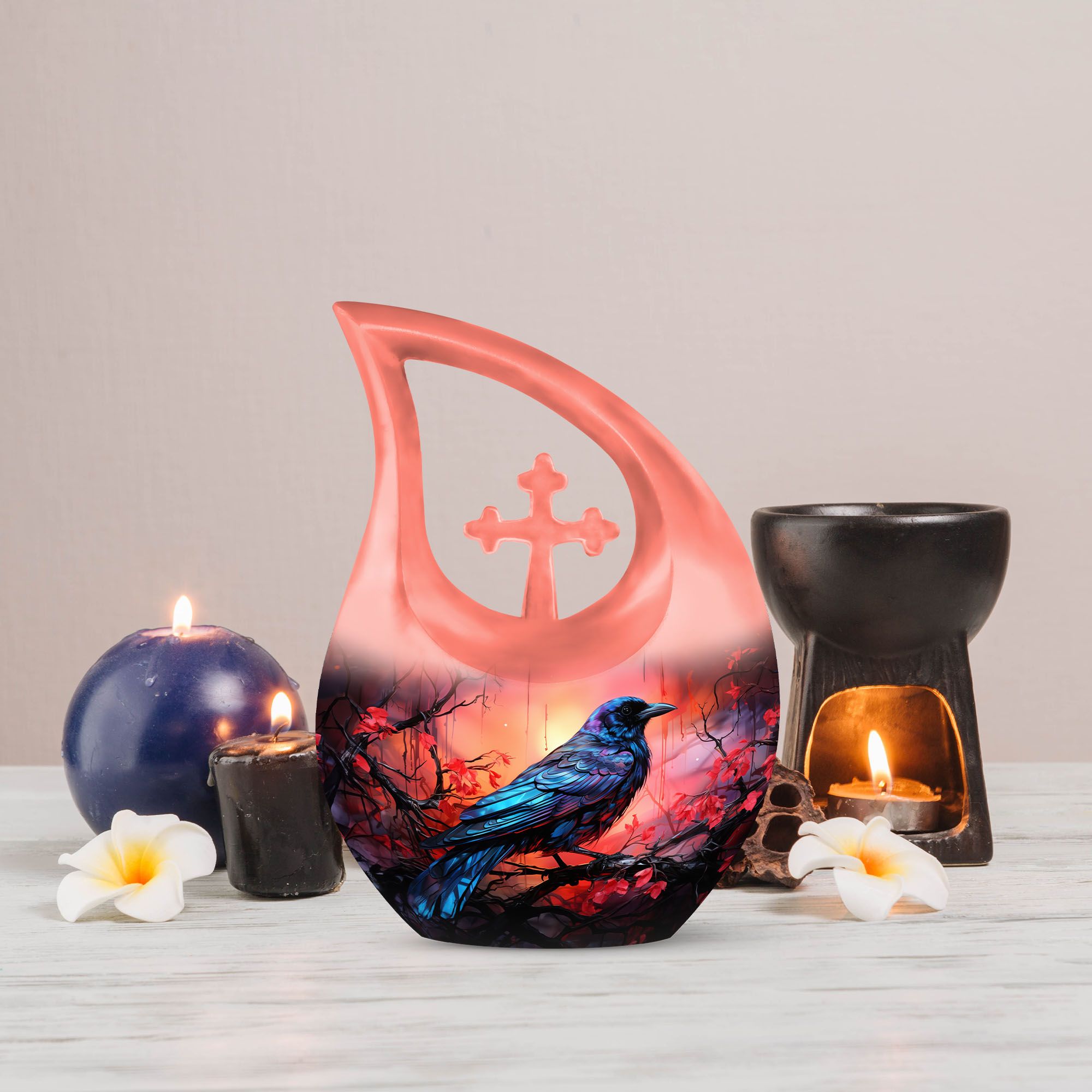 Crafted with expert artistry from premium-grade aluminum, this burial urn for adult human ashes features a shimmering blue finish enhanced by the intricate details of the raven motif. The secure screw-top lid ensures safe storage of ashes, while the smooth polished texture offers timeless elegance. Included with this piece is a keepsake urn set, allowing families to share ashes among loved ones through beautifully matched keepsake urns for human ashes adult.