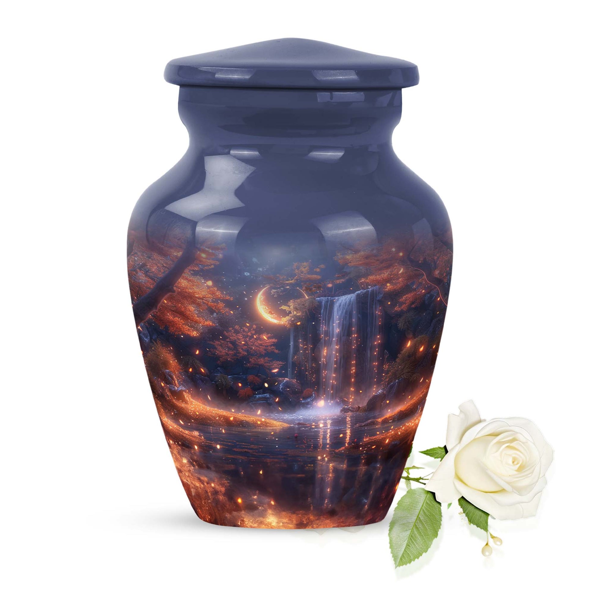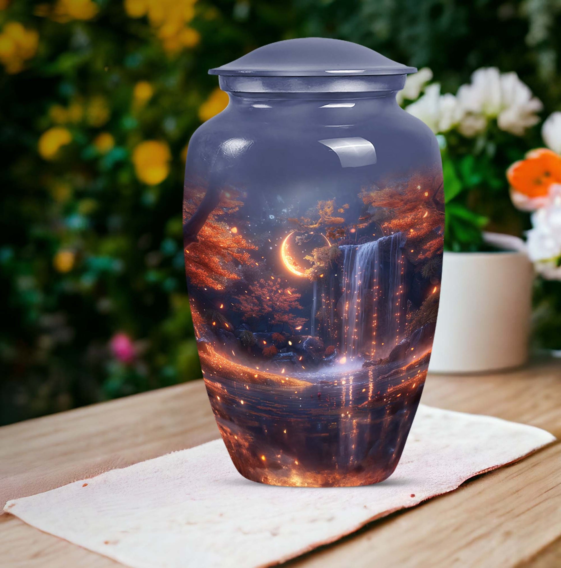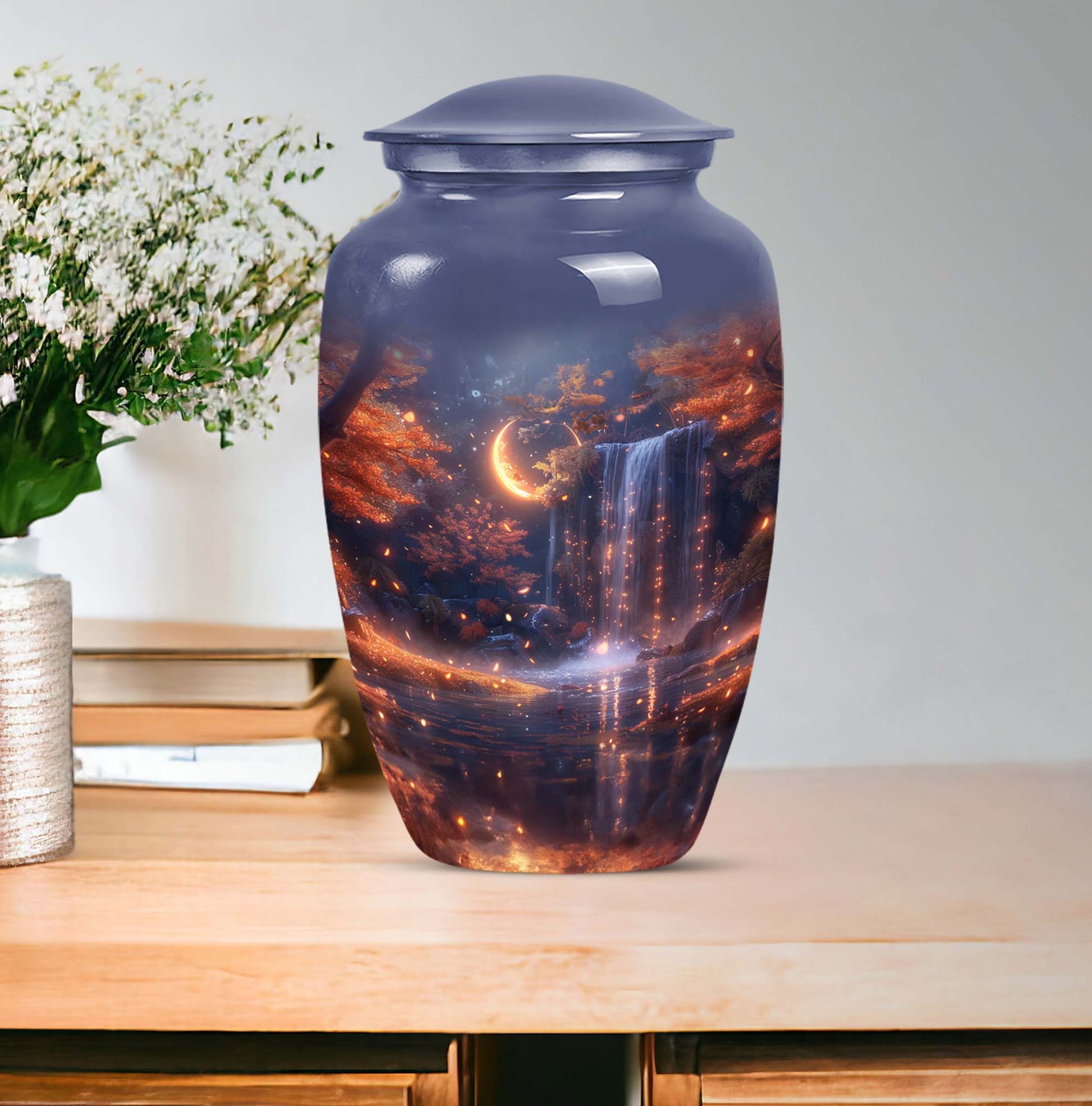 Pay tribute to your loved ones with the Lunar Urn, a perfect choice among memorial funeral urns for ashes. This 10-inch, large urn creates an everlasting memorial. Crafted with the utmost care from high-grade Aluminium, it weighs 3.3 pounds and boasts an abstract theme, offering a multi-dimensional tribute to cherished memories. Its dimensions are well suited to hold up to 200 cubic inches of ashes. This appealing urn not only serves as a memorial but also doubles as a decorative piece, thanks to its Classic Urn style often sought by those looking for unique urns for human ashes. Add a personal touch to this urn through customization by engraving names on it. It also comes with a velvet pouch for containment and safekeeping of the ashes, ensuring they remain undisturbed. Whether used for cremation ashes of mother and father or someone else close to your heart, the Lunar Urn encompasses diverse sentiments with its distinctive structure and appearance. Its highly detailed design ensures it stands out, uplifting the ambience while serving as a gentle reminder of the departed soul.