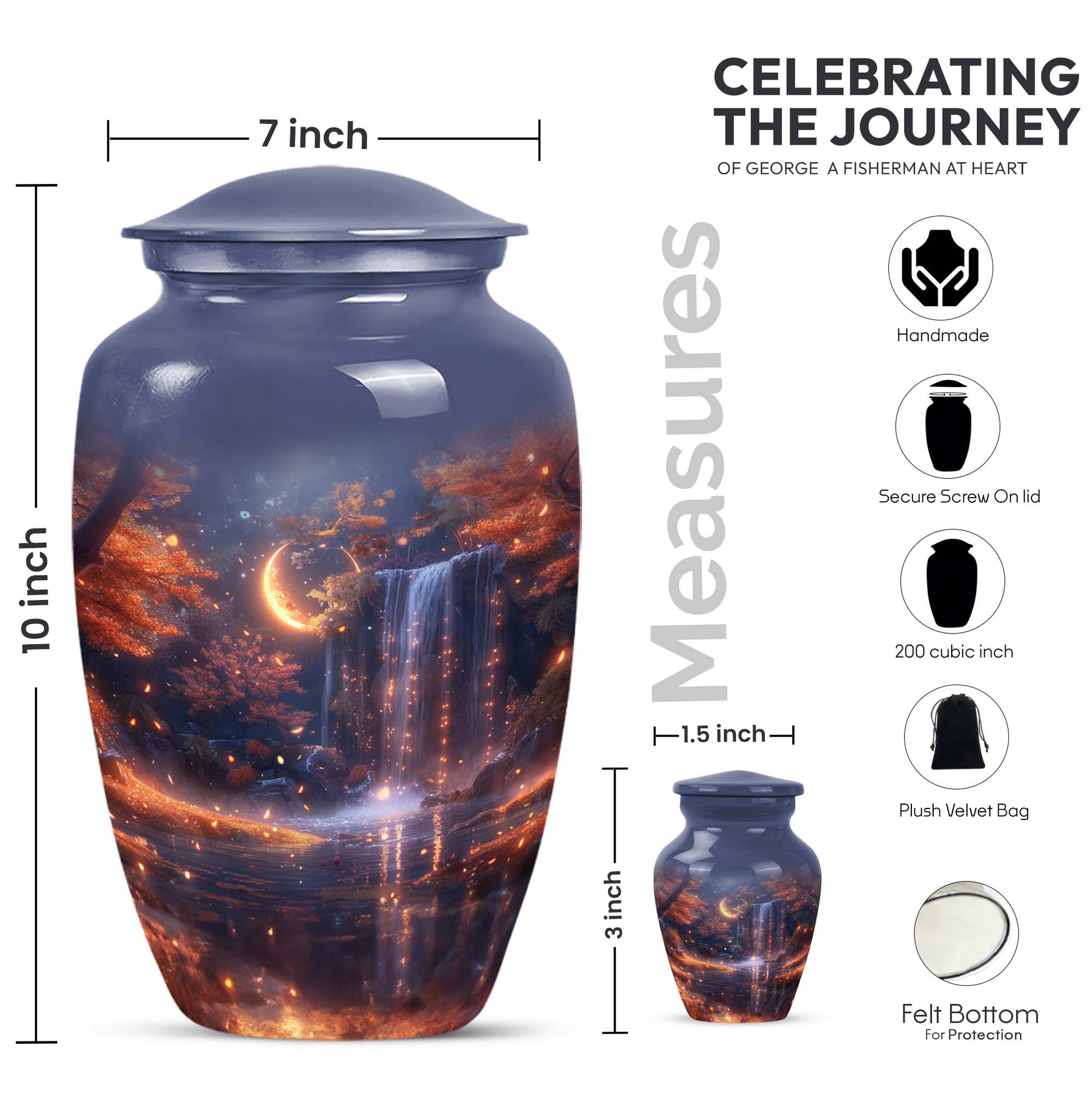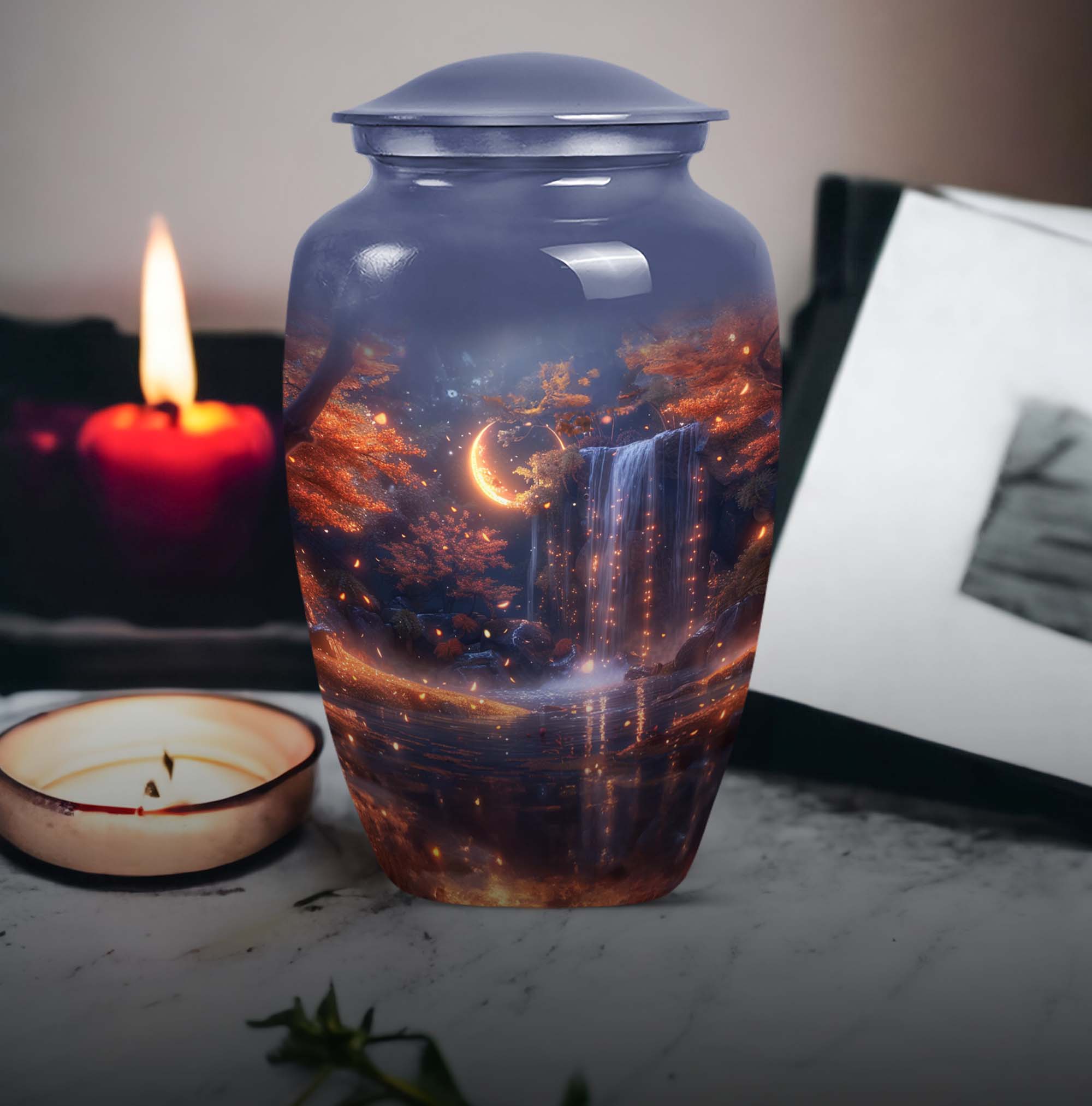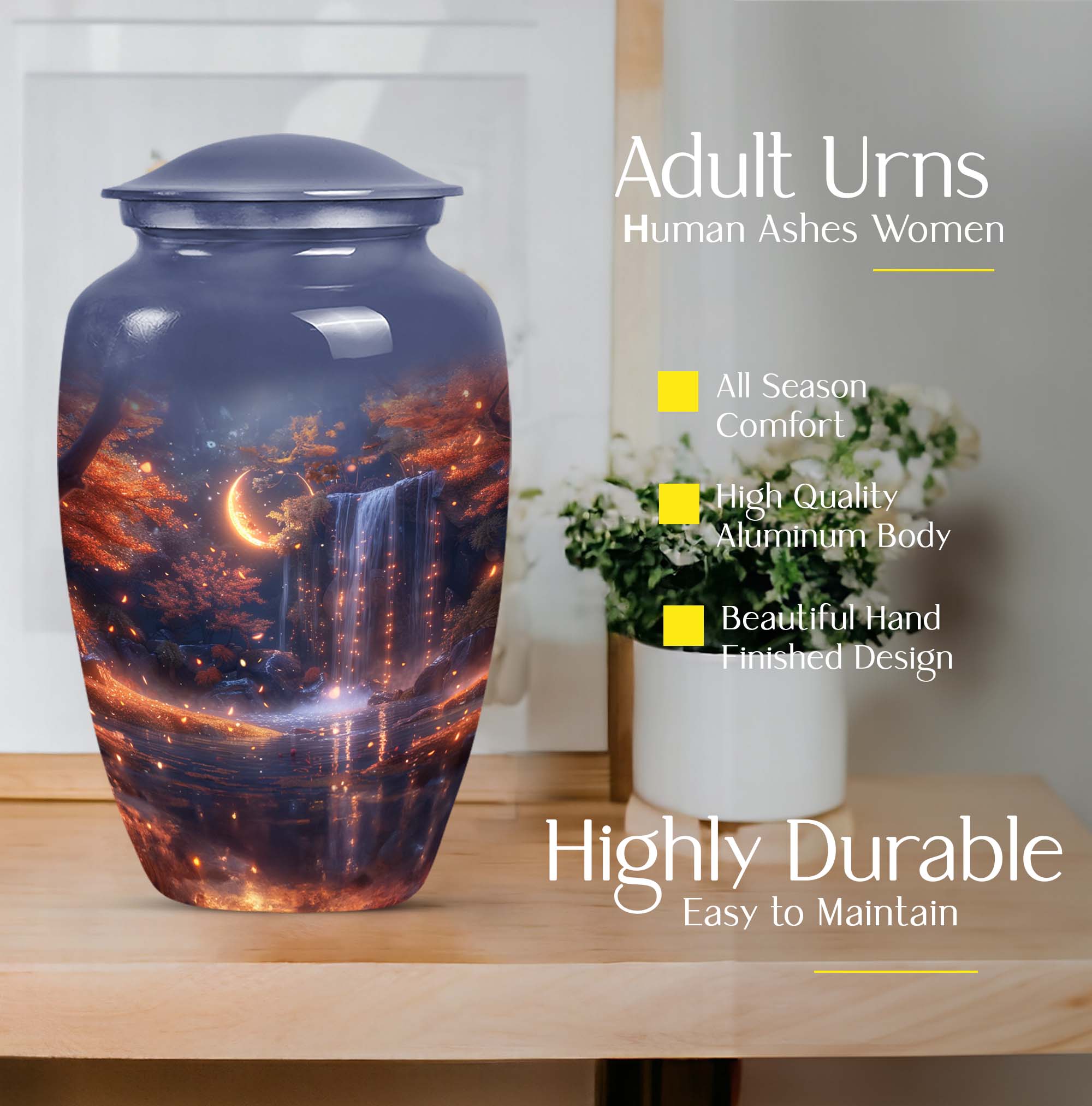Pay tribute to your loved ones with the Lunar Urn, a perfect choice among memorial funeral urns for ashes. This 10-inch, large urn creates an everlasting memorial. Crafted with the utmost care from high-grade Aluminium, it weighs 3.3 pounds and boasts an abstract theme, offering a multi-dimensional tribute to cherished memories. Its dimensions are well suited to hold up to 200 cubic inches of ashes. This appealing urn not only serves as a memorial but also doubles as a decorative piece, thanks to its Classic Urn style often sought by those looking for unique urns for human ashes. Add a personal touch to this urn through customization by engraving names on it. It also comes with a velvet pouch for containment and safekeeping of the ashes, ensuring they remain undisturbed. Whether used for cremation ashes of mother and father or someone else close to your heart, the Lunar Urn encompasses diverse sentiments with its distinctive structure and appearance. Its highly detailed design ensures it stands out, uplifting the ambience while serving as a gentle reminder of the departed soul.