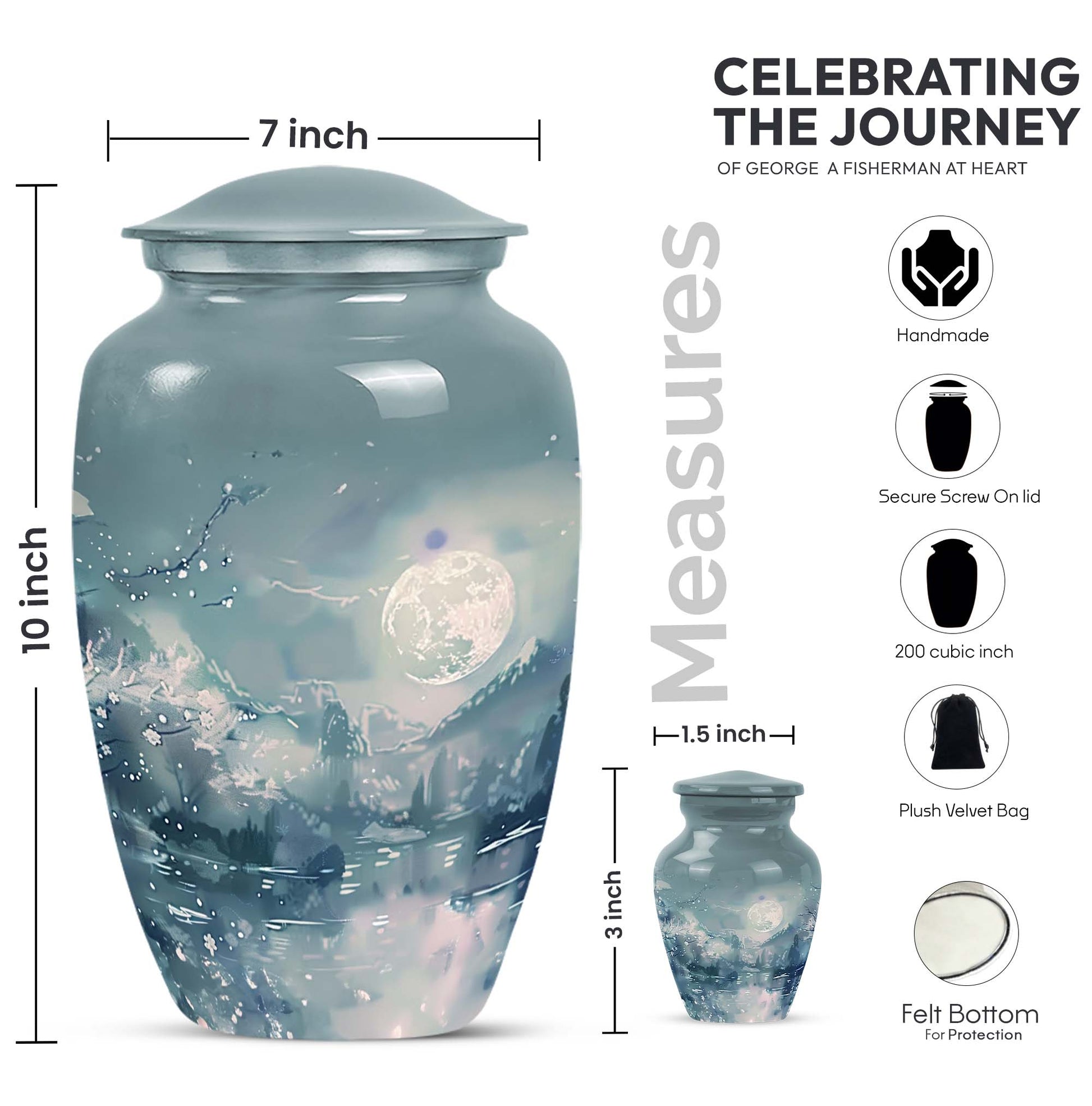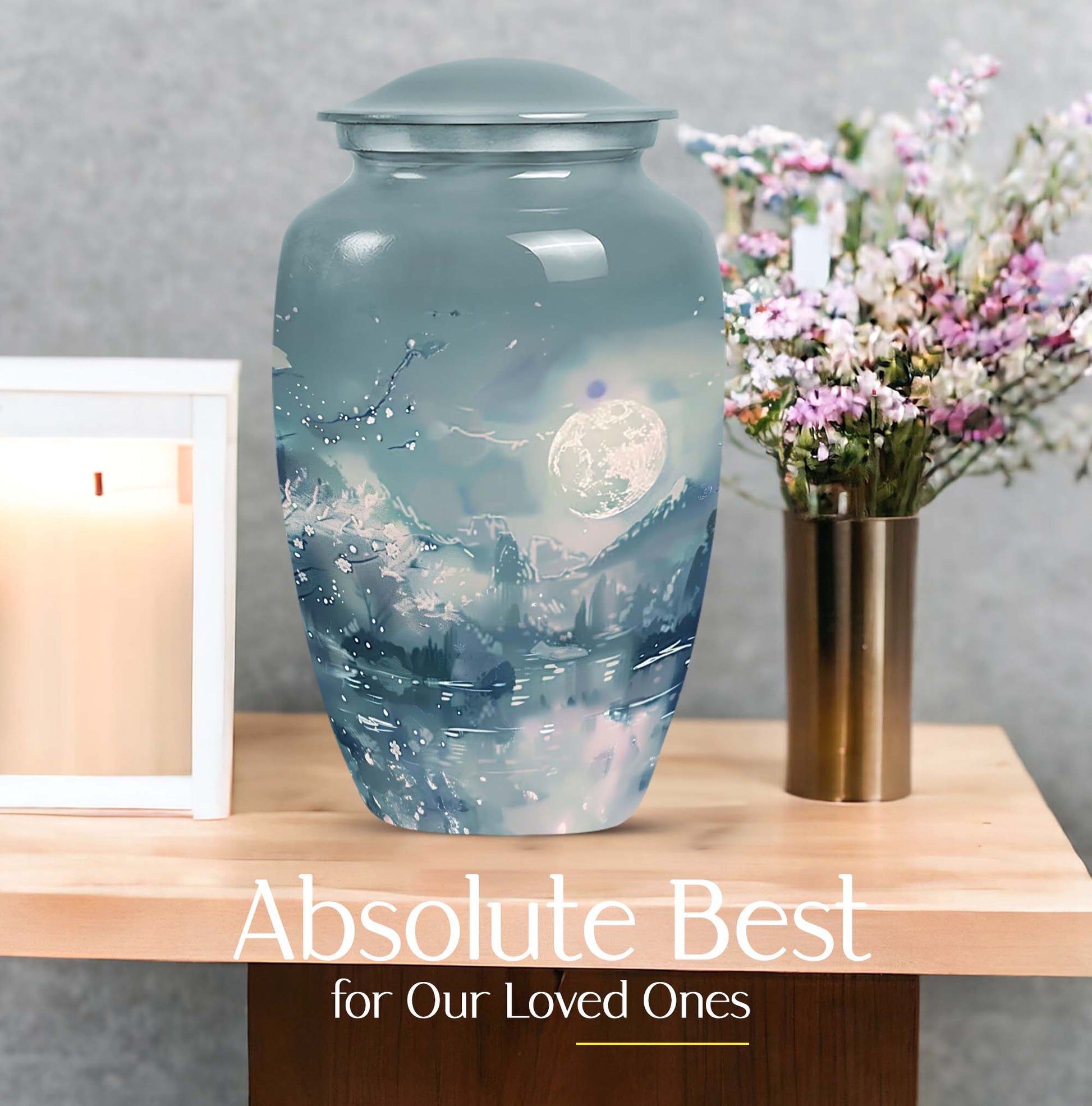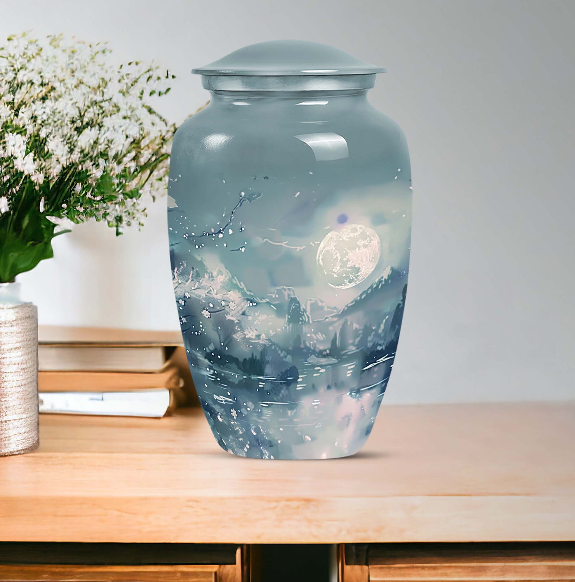 Illuminate the memory of your loved ones with our Lunar Urn, an exquisite choice among burial cremation urns tailored for women and men alike. This 10-inch, meticulously crafted large urn is presented in an abstract theme, reflecting a dignified and timeless tribute. Made from resilient and lightweight aluminium, the urn weighs a moderate 3.3 pounds making it convenient for positioning or relocation. Impressively, our Lunar Urn holds up to 200 cubic inches of ashes, suitable for adult use. Encased with your purchase is a complimentary velvet pouch, thus offering a tasteful, secure containment for the ashes. For a more intimate touch, buyers also have the option to personalize this keepsake with engraved names; a sentimental mark of remembrance. Whether you're considering cremation urns for men or women, this Lunar Urn is a vast option for those seeking a special memorial piece.