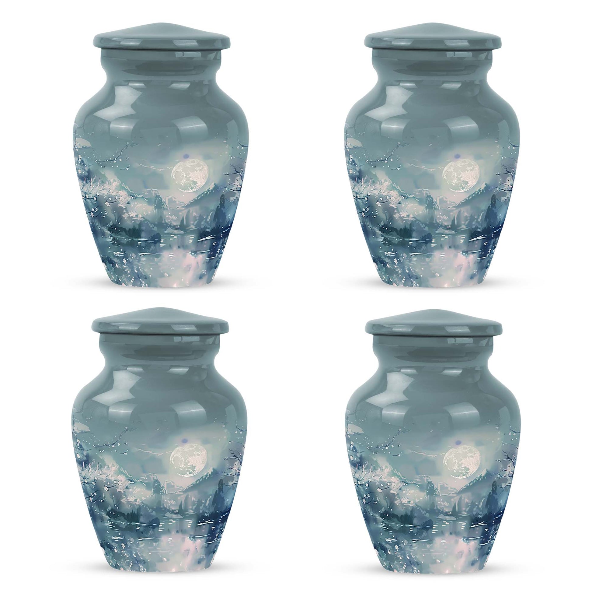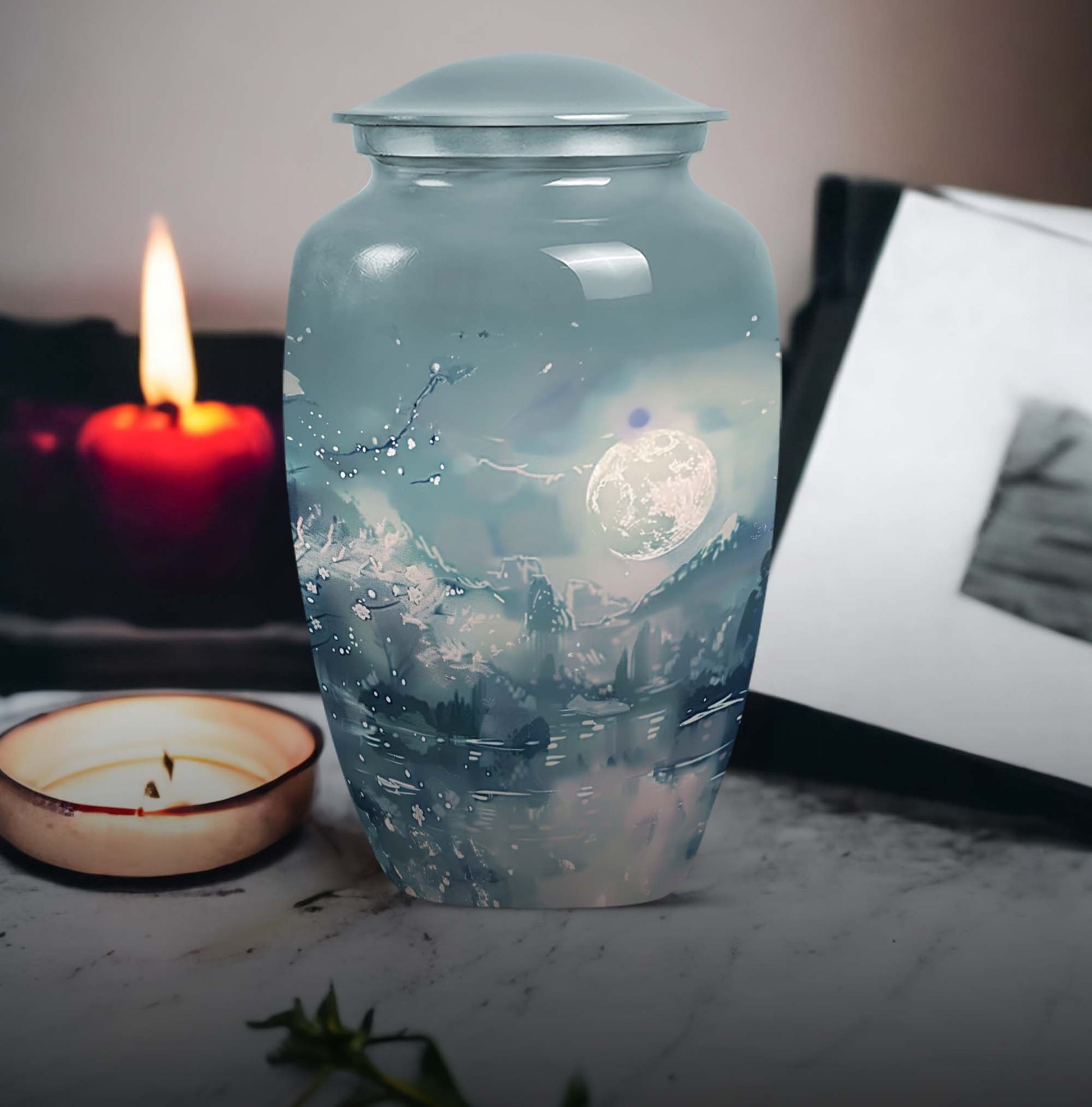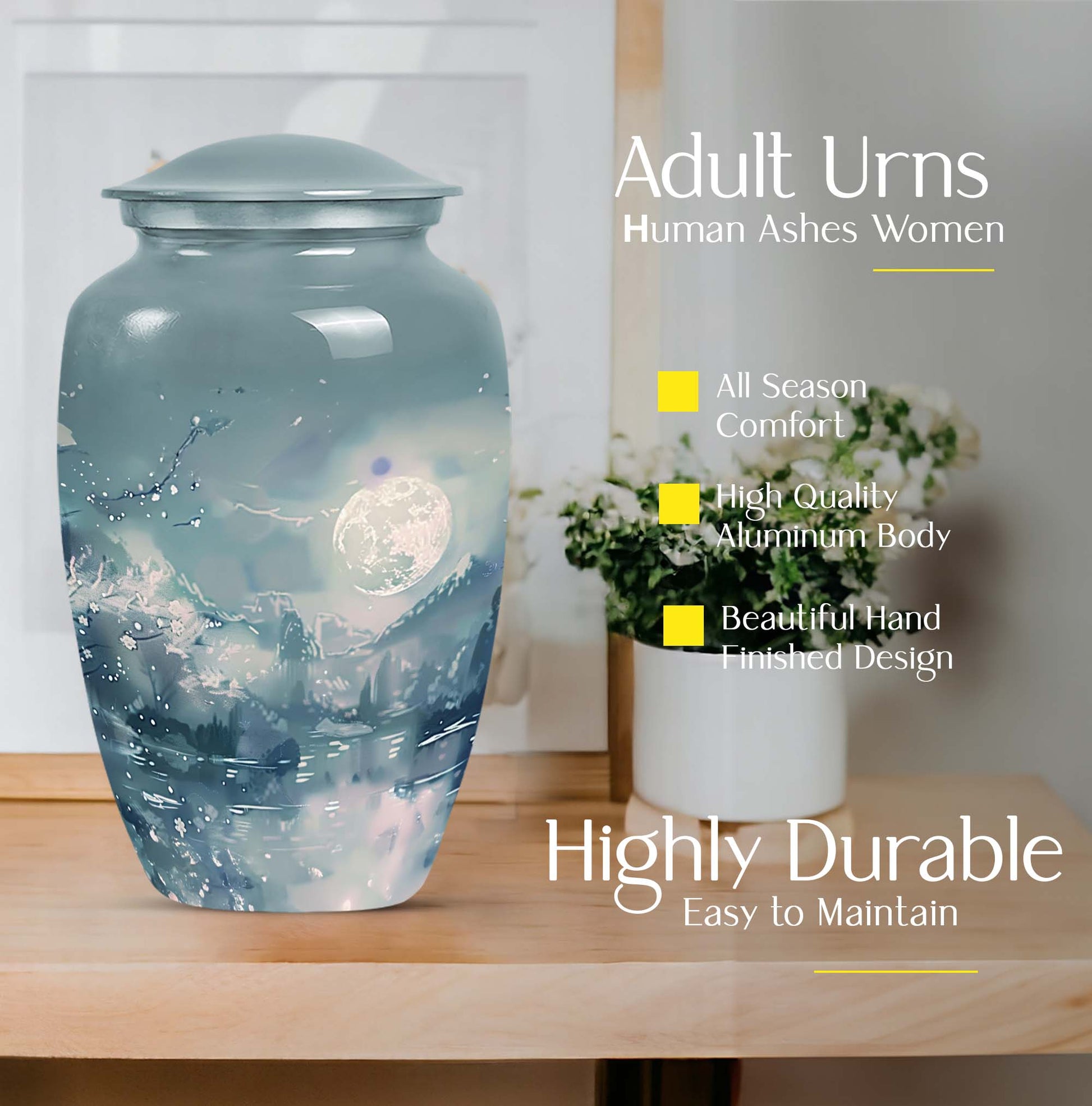 Illuminate the memory of your loved ones with our Lunar Urn, an exquisite choice among burial cremation urns tailored for women and men alike. This 10-inch, meticulously crafted large urn is presented in an abstract theme, reflecting a dignified and timeless tribute. Made from resilient and lightweight aluminium, the urn weighs a moderate 3.3 pounds making it convenient for positioning or relocation. Impressively, our Lunar Urn holds up to 200 cubic inches of ashes, suitable for adult use. Encased with your purchase is a complimentary velvet pouch, thus offering a tasteful, secure containment for the ashes. For a more intimate touch, buyers also have the option to personalize this keepsake with engraved names; a sentimental mark of remembrance. Whether you're considering cremation urns for men or women, this Lunar Urn is a vast option for those seeking a special memorial piece.