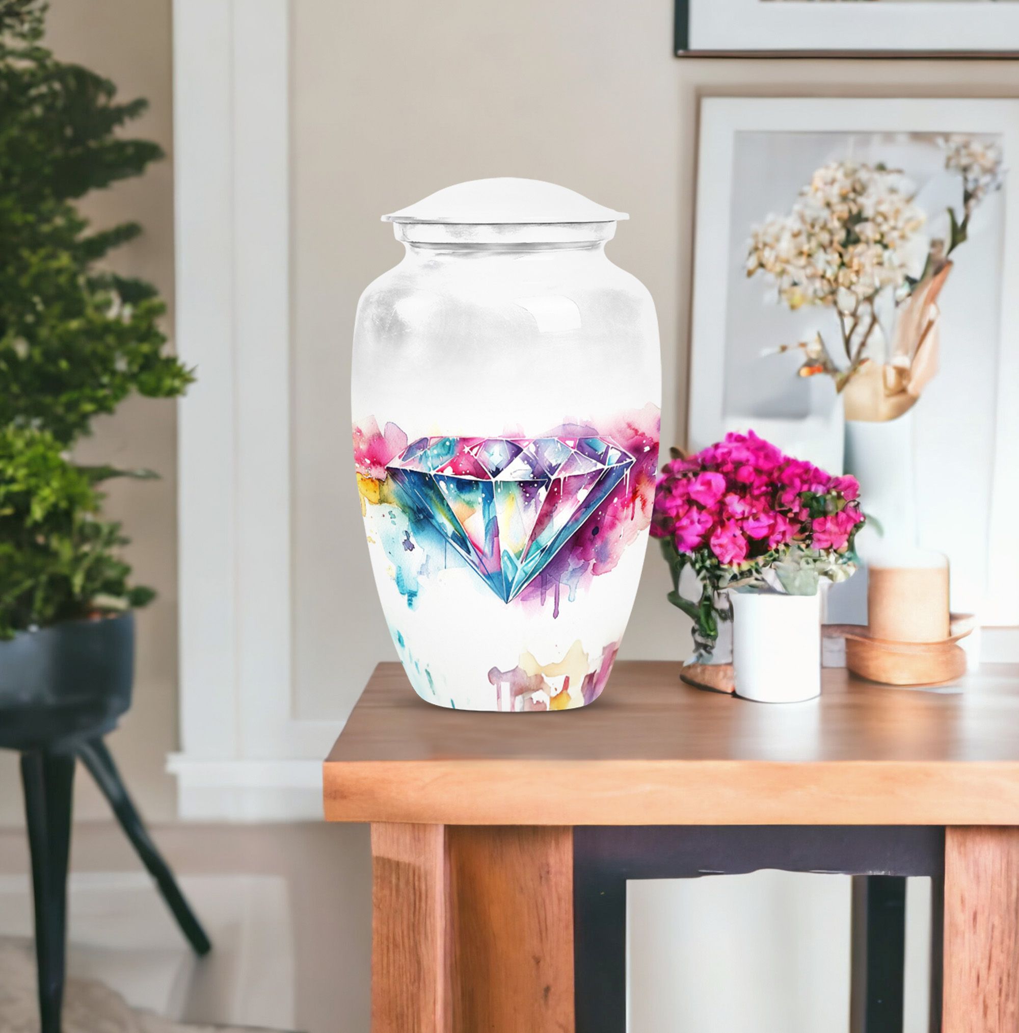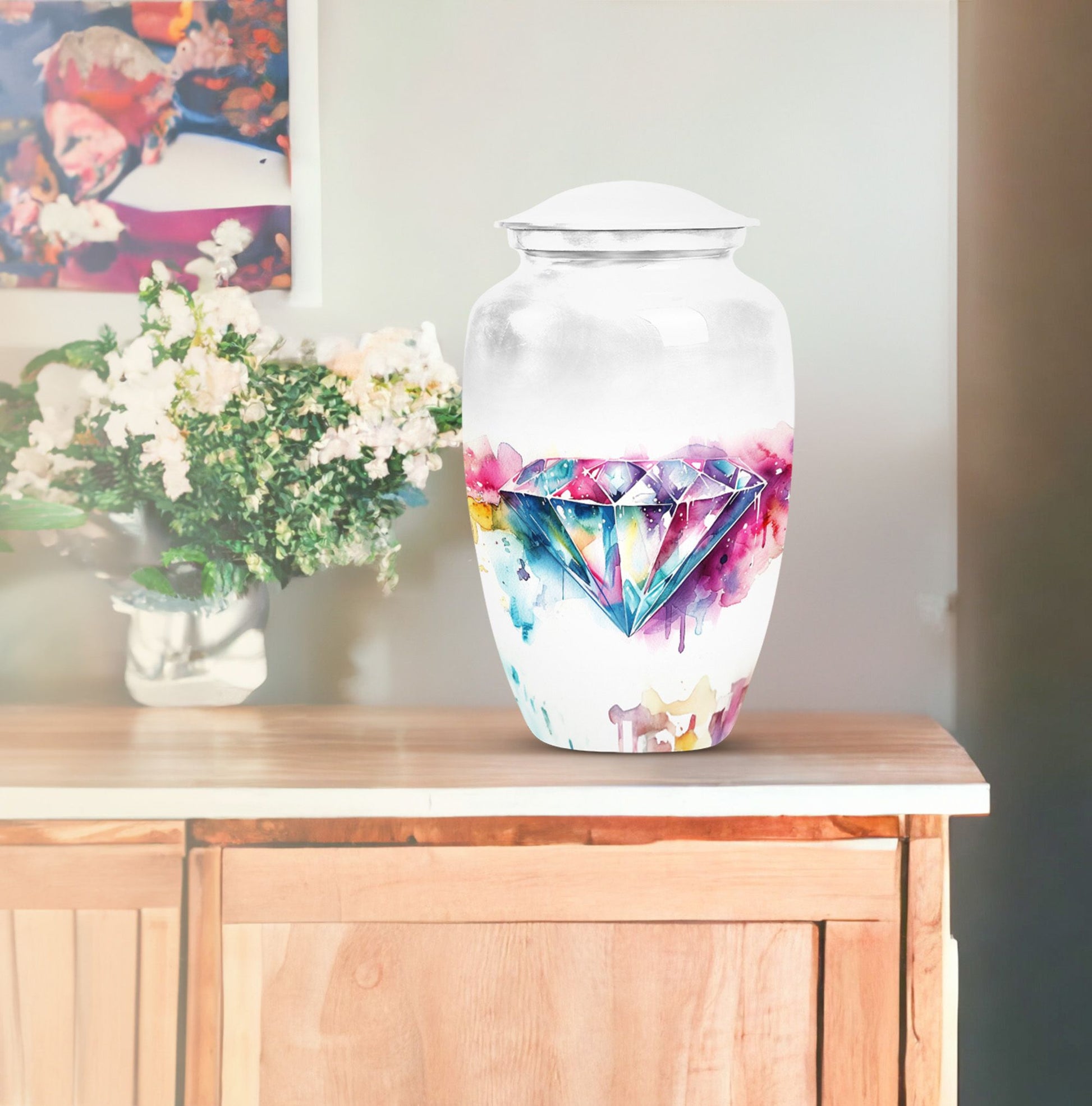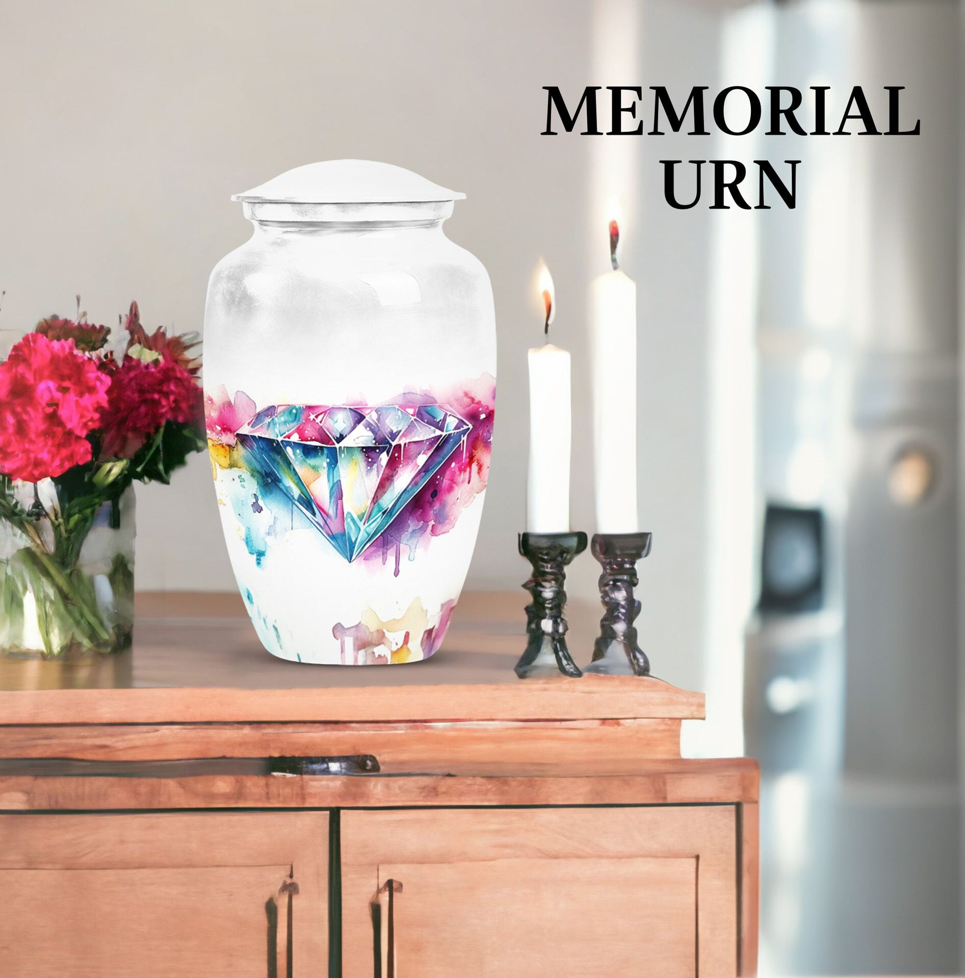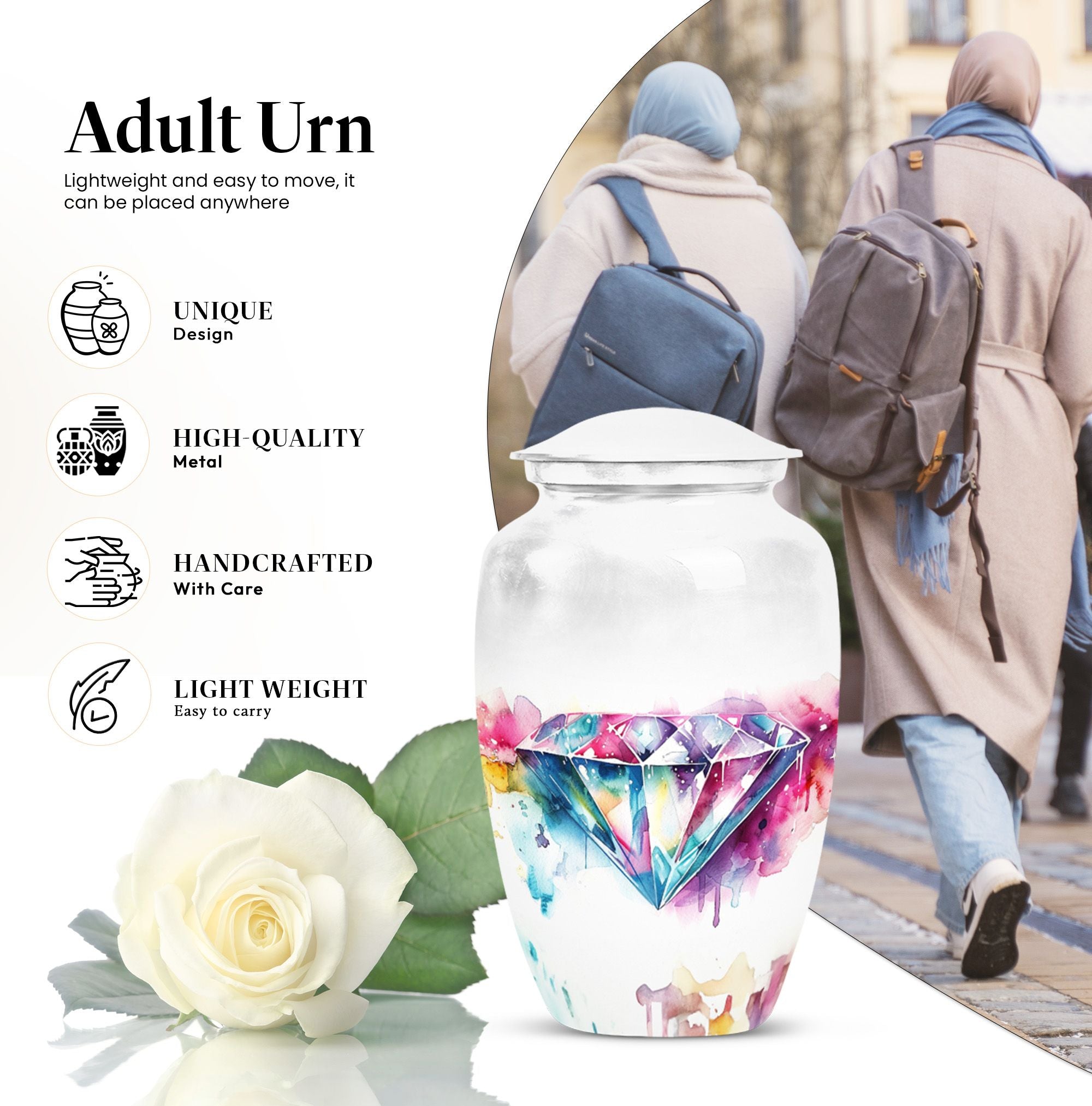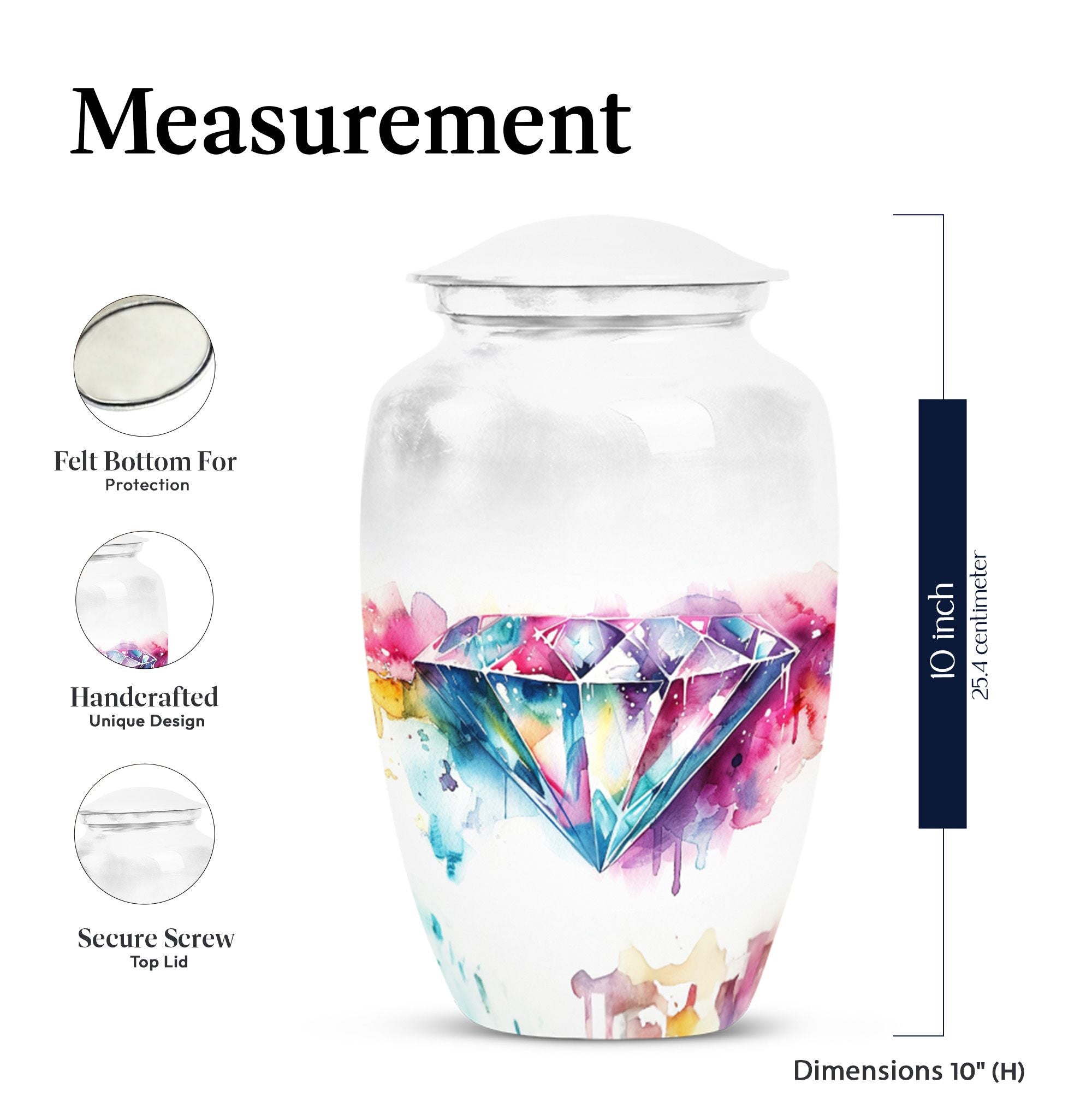 Introducing our beautiful diamond urn, a tribute to those we've loved and lost. This large, 10 Inch memorial urn for ashes is designed exclusively to hold the treasured memories of an adult male or female. Crafted from robust aluminium, this funeral urn boasts an abstract theme, emanating a sense of serenity and solemnity. With a weight of 3.3 pounds and a capacity of 200 cubic inches, this urn ensures a substantial and dignified final resting place. The package includes a velvet pouch for secure containment of ashes. To enrich your keepsake experience, we offer customization - personalize your memorial urn with engraved names for a heartfelt touch. Gentle on the eye and comforting to the touch, our urns for human ashes adult large size serves to be more than a decor item, it becomes a cherished tribute that suits any home setting. Please note, the urn design is 'Classic' - echoing an elegant simplicity that unifies visual satisfaction with emotional tranquility.