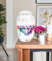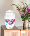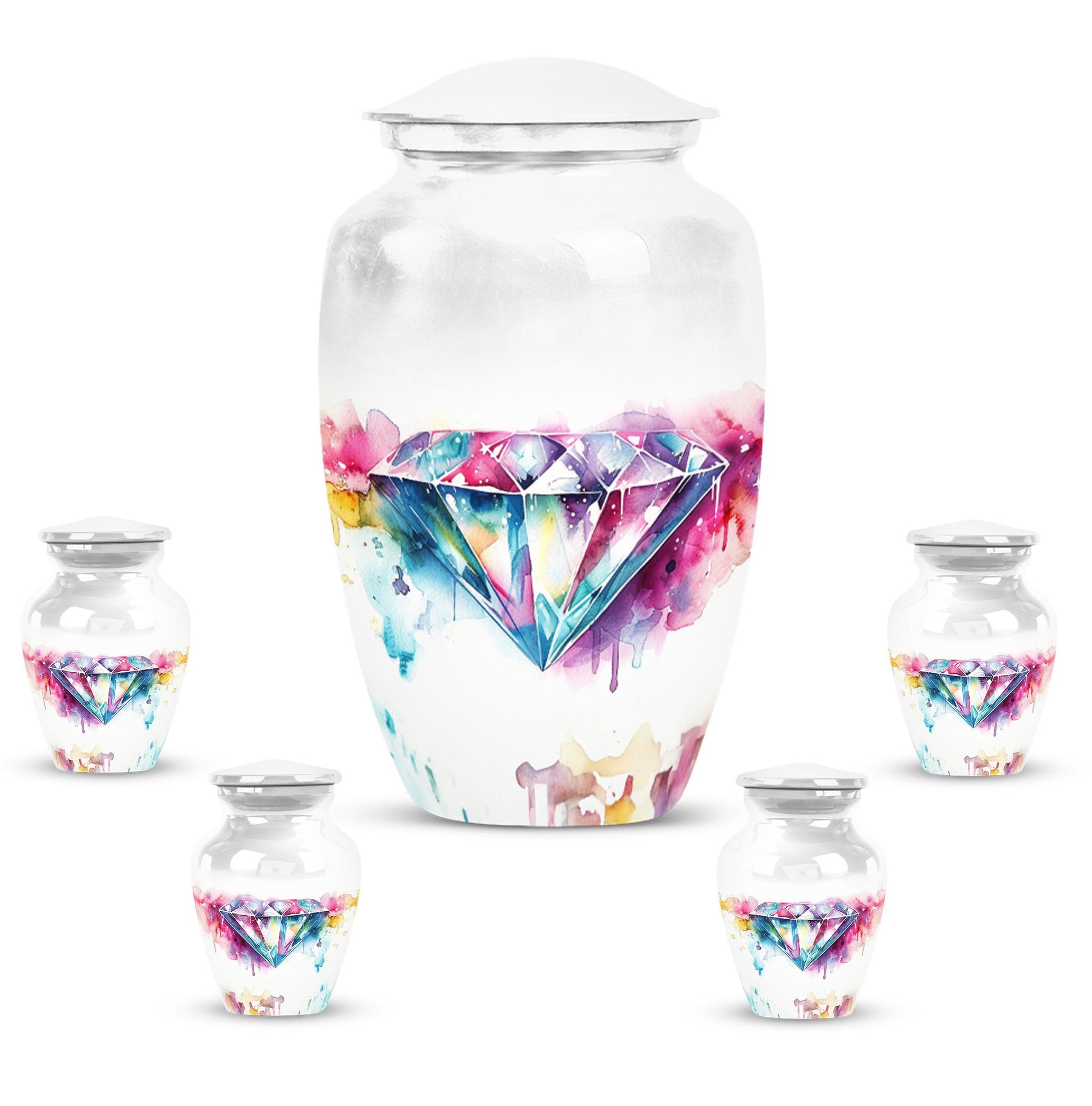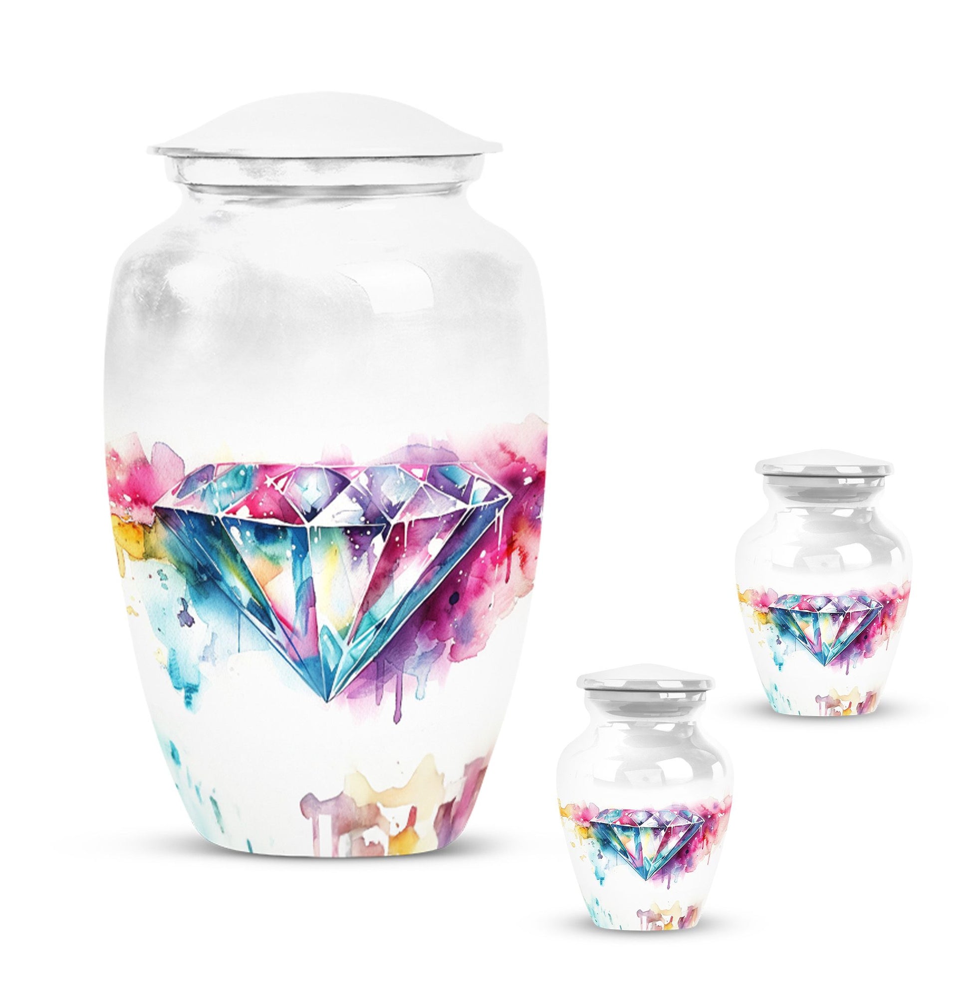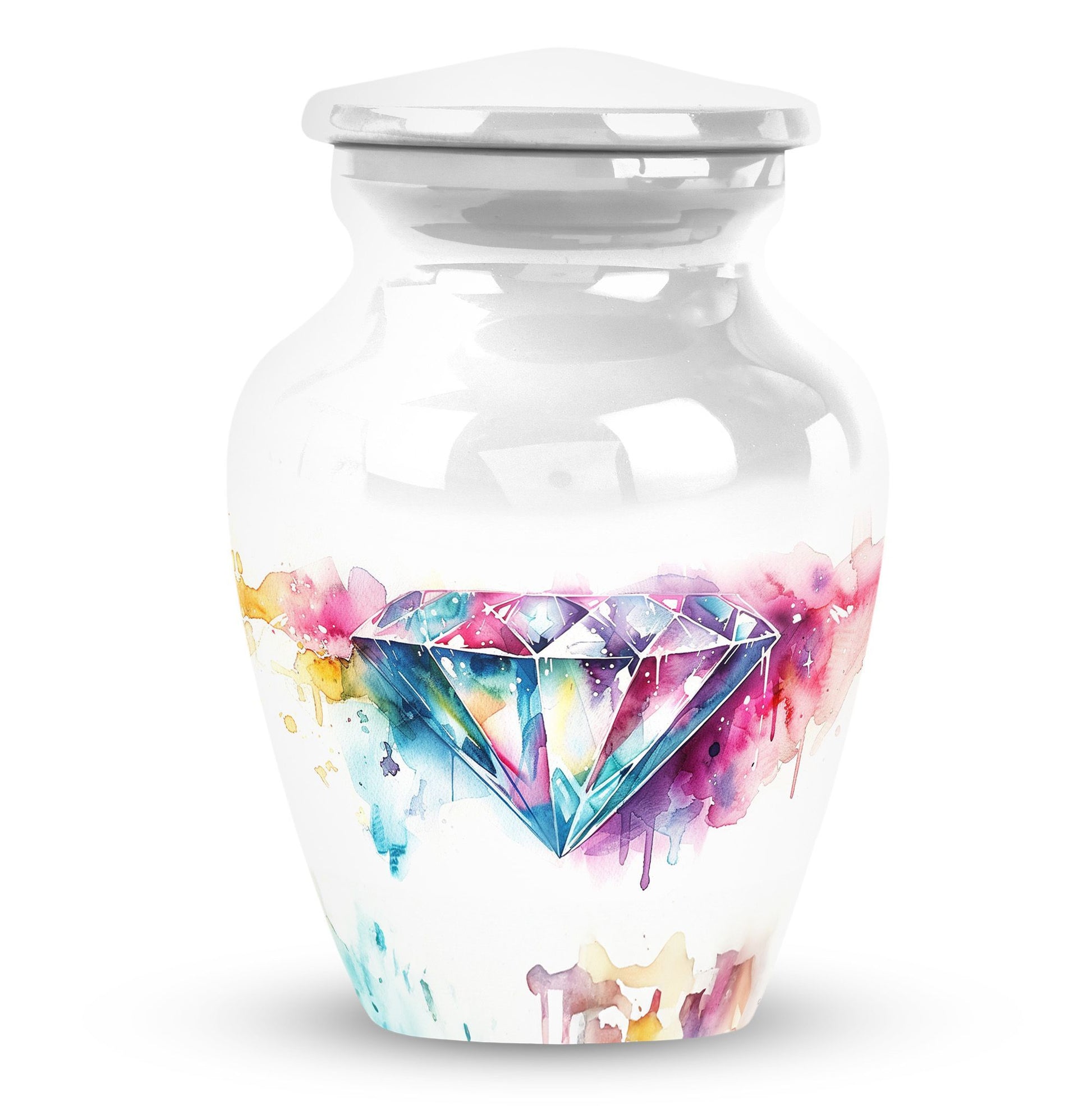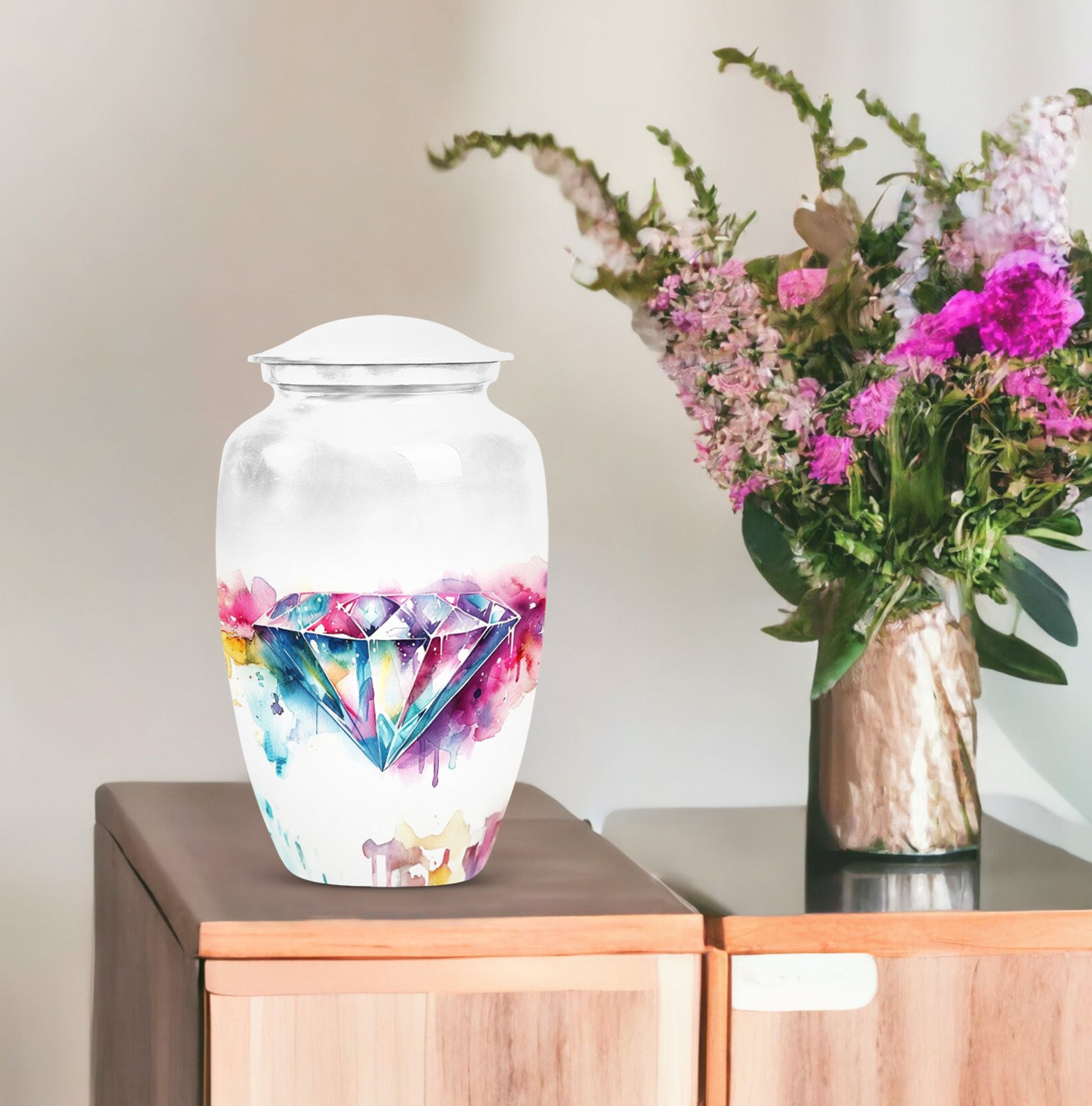 Introducing our beautiful diamond urn, a tribute to those we've loved and lost. This large, 10 Inch memorial urn for ashes is designed exclusively to hold the treasured memories of an adult male or female. Crafted from robust aluminium, this funeral urn boasts an abstract theme, emanating a sense of serenity and solemnity. With a weight of 3.3 pounds and a capacity of 200 cubic inches, this urn ensures a substantial and dignified final resting place. The package includes a velvet pouch for secure containment of ashes. To enrich your keepsake experience, we offer customization - personalize your memorial urn with engraved names for a heartfelt touch. Gentle on the eye and comforting to the touch, our urns for human ashes adult large size serves to be more than a decor item, it becomes a cherished tribute that suits any home setting. Please note, the urn design is 'Classic' - echoing an elegant simplicity that unifies visual satisfaction with emotional tranquility.