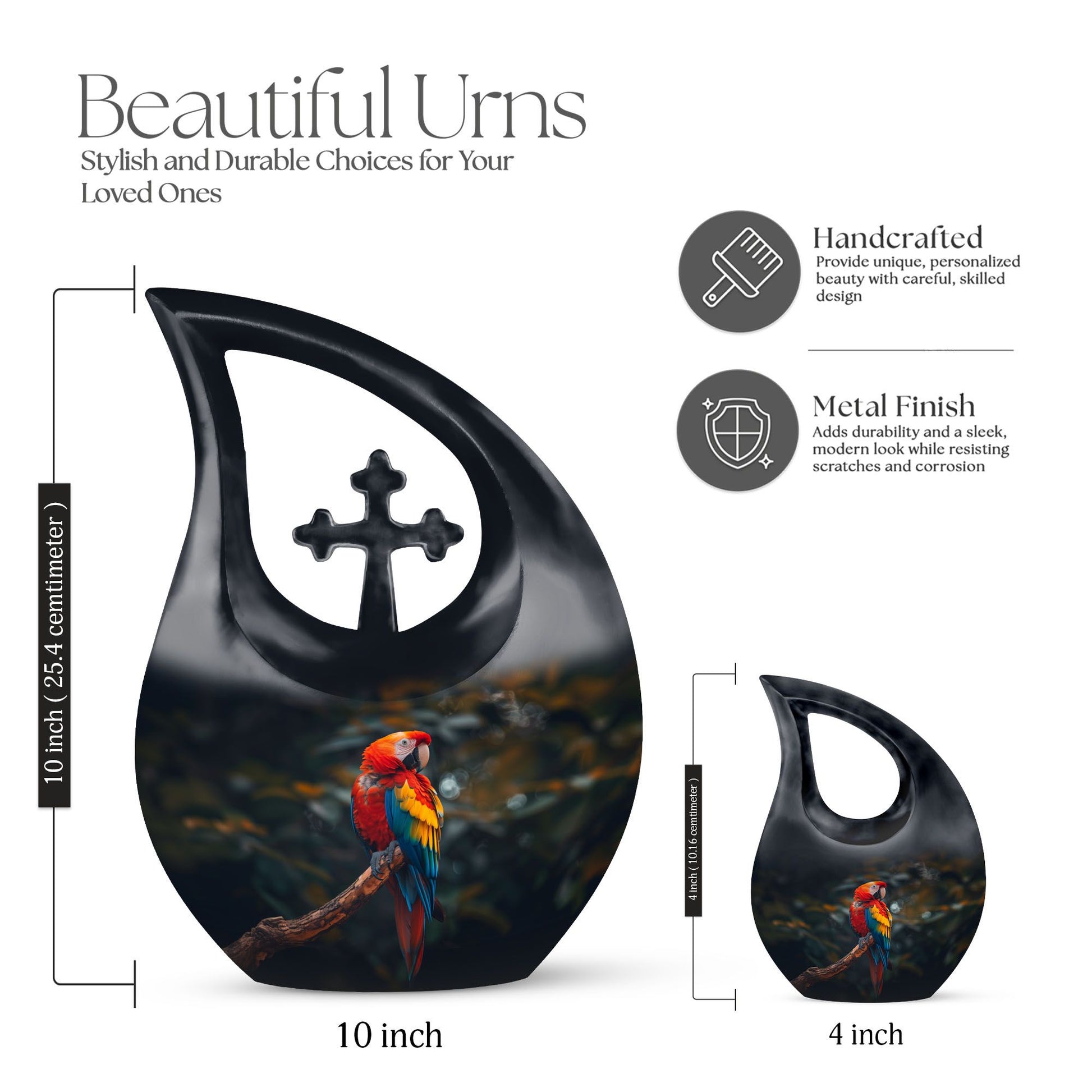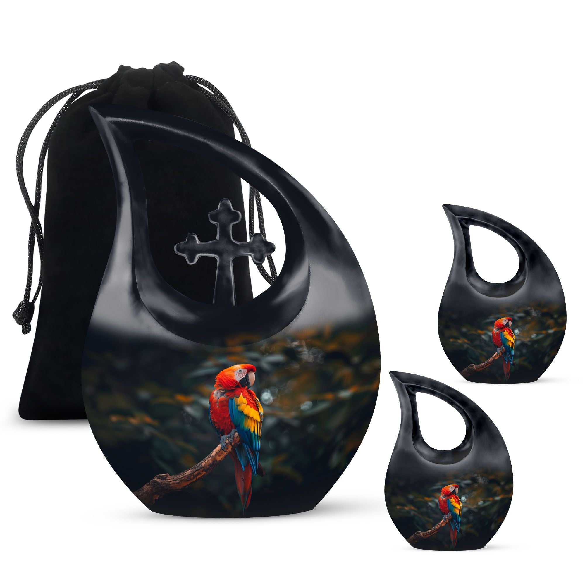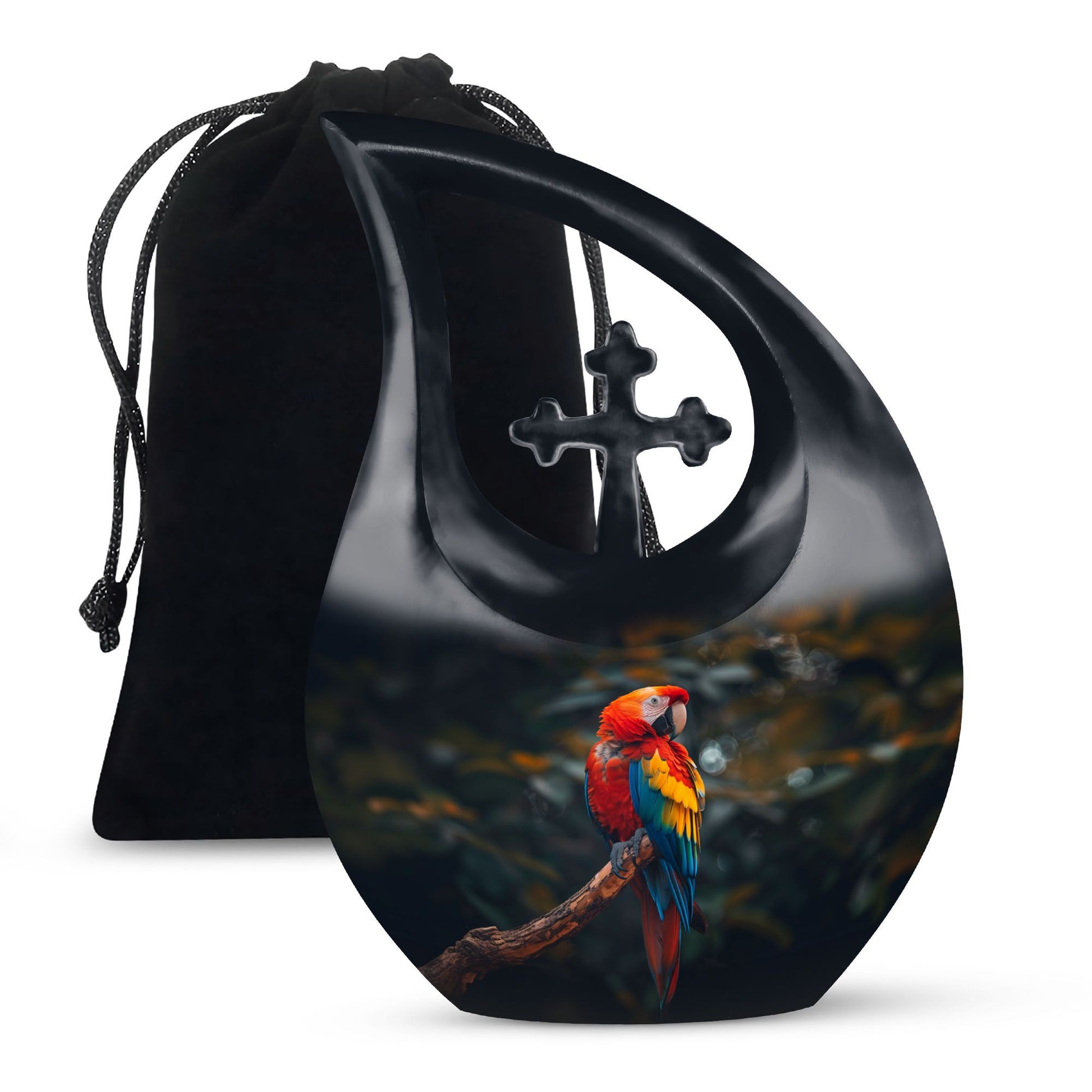 Honor the memory and life of your loved ones with our stunning Macaw Parrot Urn. Designed as a beautiful tribute, this cremation box is perfect for adult commemorations. Standing at 10 inches in height, the urn adds a subtle, comforting presence in your home or crematorium. Made from robust aluminum, the urn exhibits a remarkable durability and comes with a weight of 3.3 pounds. It has a large capacity, consisting of 200 cubic inches, ideal for preserving significant amounts of ashes. The cross drop theme adds a touch of reverence, bringing a serene, peaceful atmosphere. We also offer the option to personalize it with engraved names. Furthermore, this package includes a velvet pouch for containment of ashes, providing an elegant solution for storage. Augment your memorial ceremonies with our Macaw Parrot large urns, a symbol of eternal love and respect. In search for 'memorial urns,' 'unique urns for dad,' or 'large urns for ashes?' Look no further. Our Macaw Parrot Urn is the ideal solution, combining functionality and sentimentality in perfect harmony.