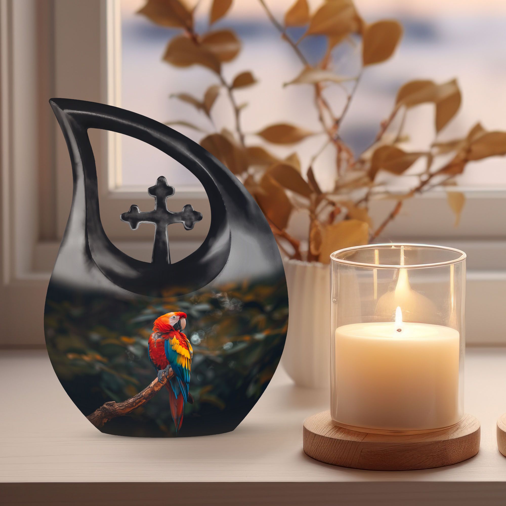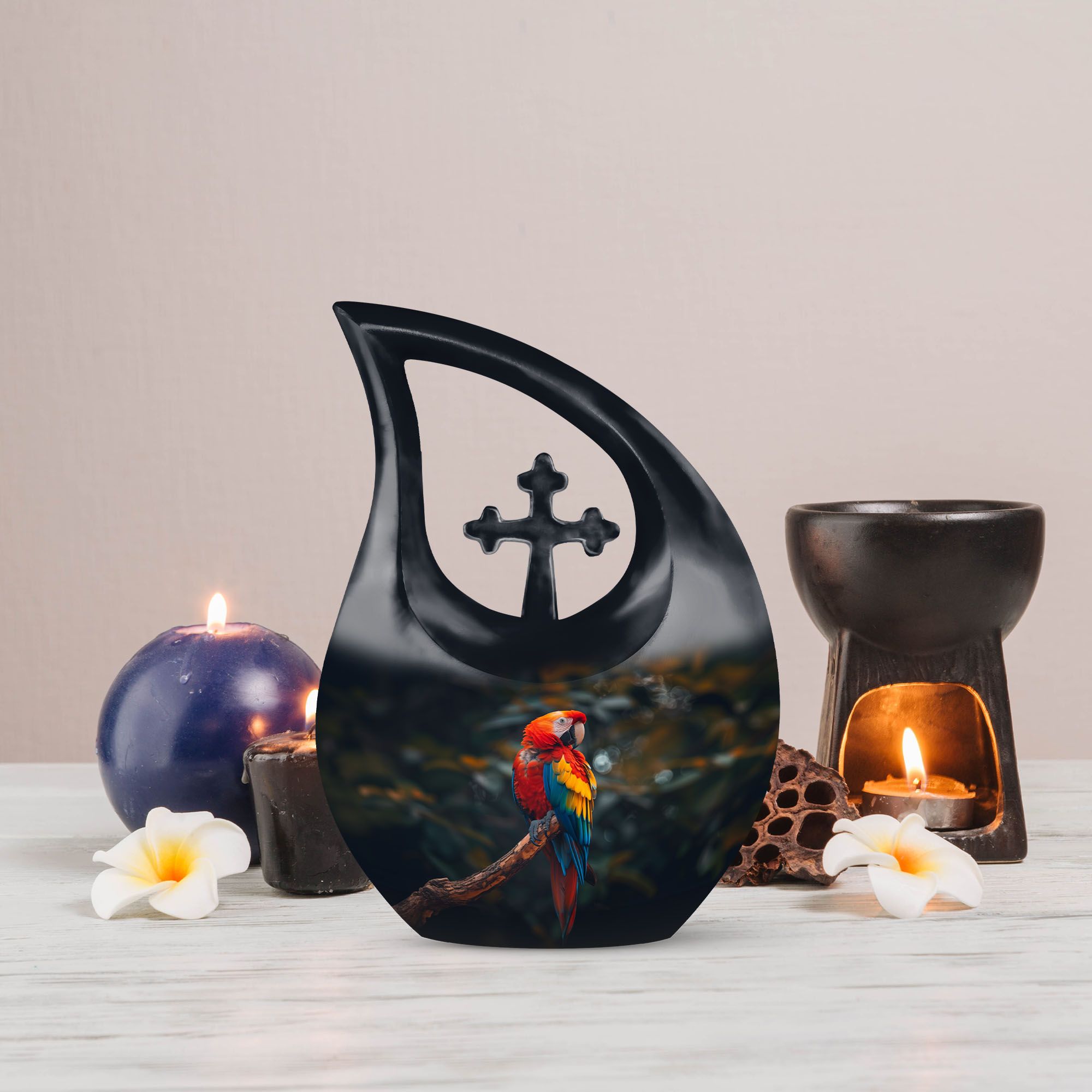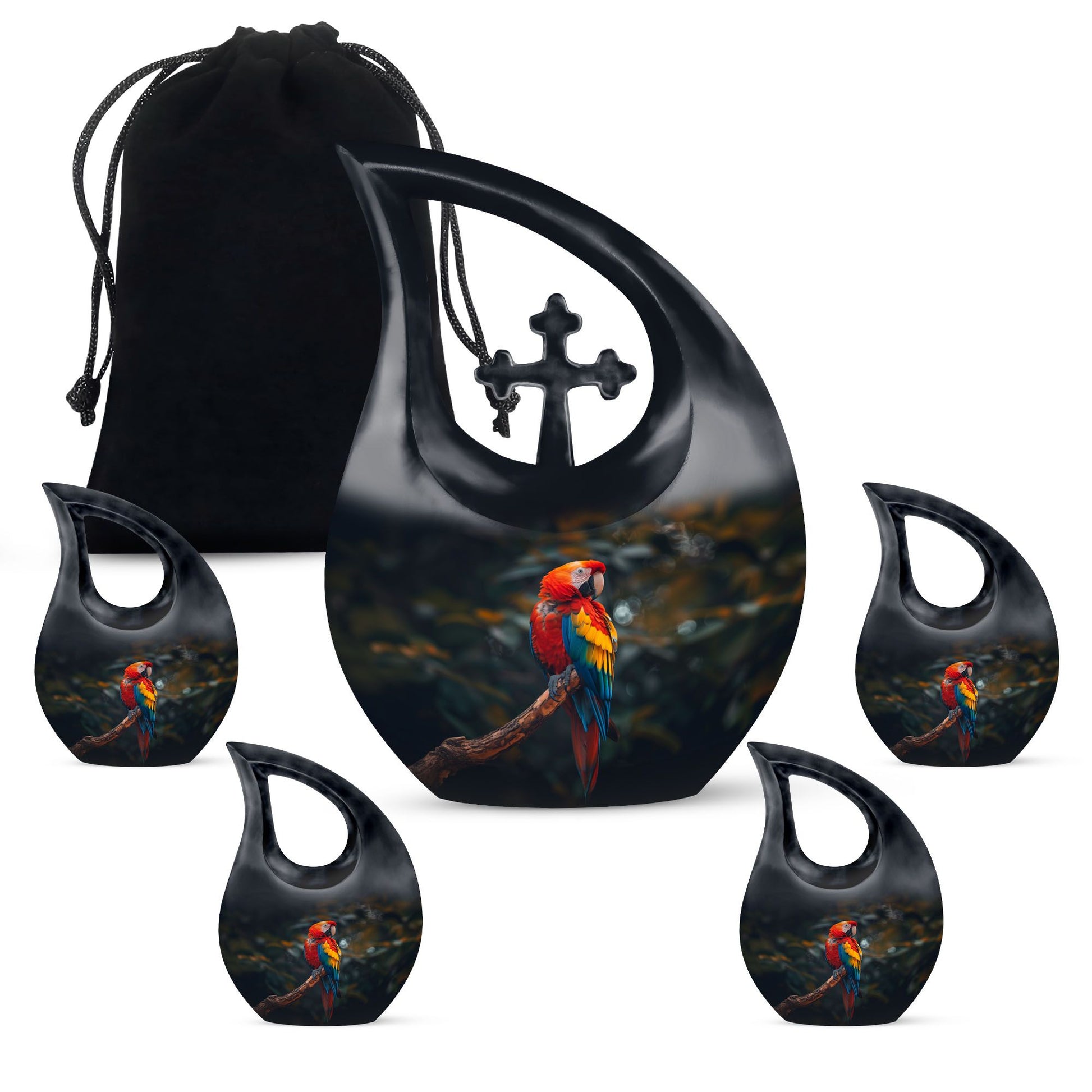 Honor the memory and life of your loved ones with our stunning Macaw Parrot Urn. Designed as a beautiful tribute, this cremation box is perfect for adult commemorations. Standing at 10 inches in height, the urn adds a subtle, comforting presence in your home or crematorium. Made from robust aluminum, the urn exhibits a remarkable durability and comes with a weight of 3.3 pounds. It has a large capacity, consisting of 200 cubic inches, ideal for preserving significant amounts of ashes. The cross drop theme adds a touch of reverence, bringing a serene, peaceful atmosphere. We also offer the option to personalize it with engraved names. Furthermore, this package includes a velvet pouch for containment of ashes, providing an elegant solution for storage. Augment your memorial ceremonies with our Macaw Parrot large urns, a symbol of eternal love and respect. In search for 'memorial urns,' 'unique urns for dad,' or 'large urns for ashes?' Look no further. Our Macaw Parrot Urn is the ideal solution, combining functionality and sentimentality in perfect harmony.